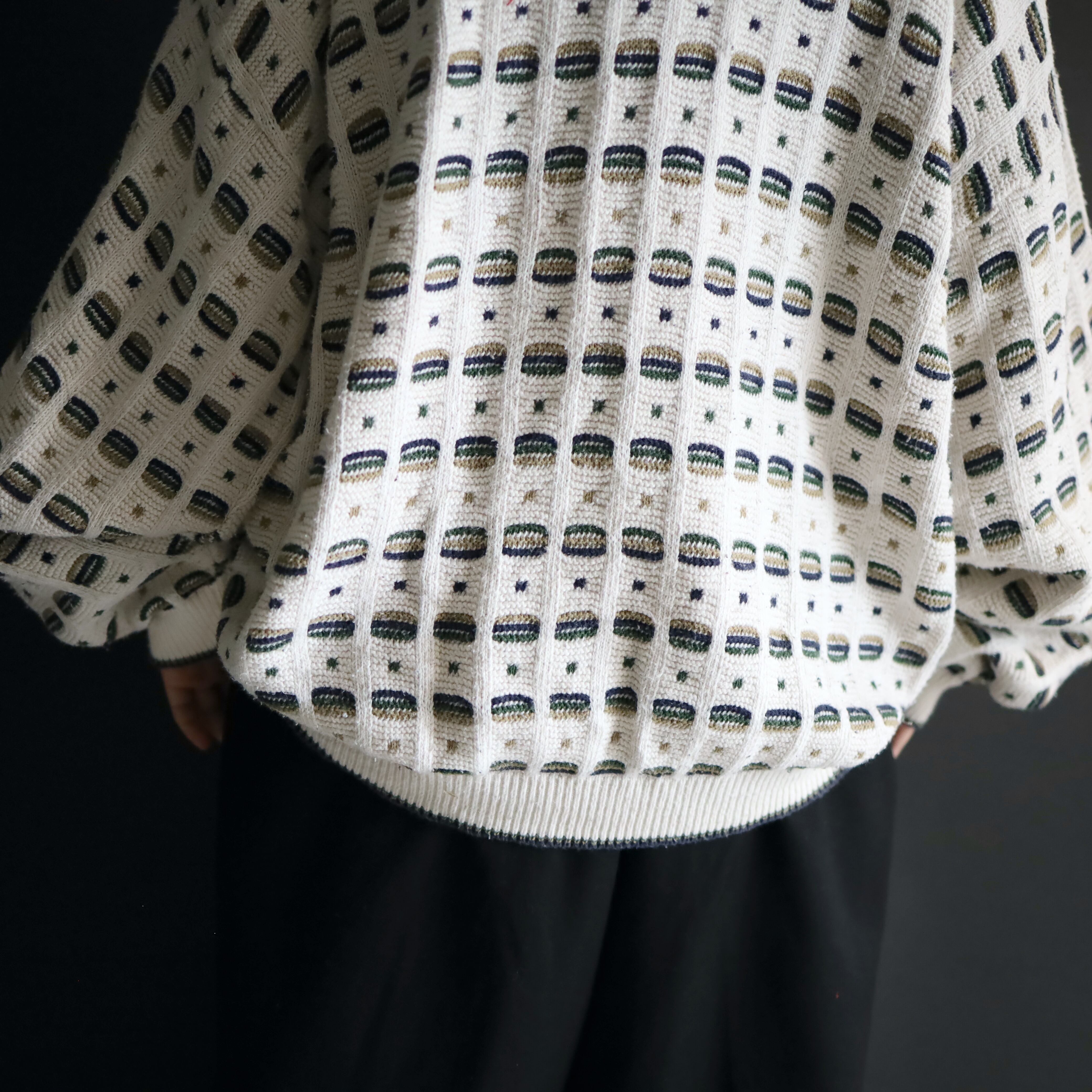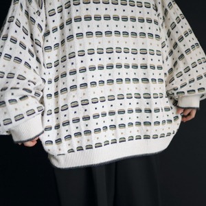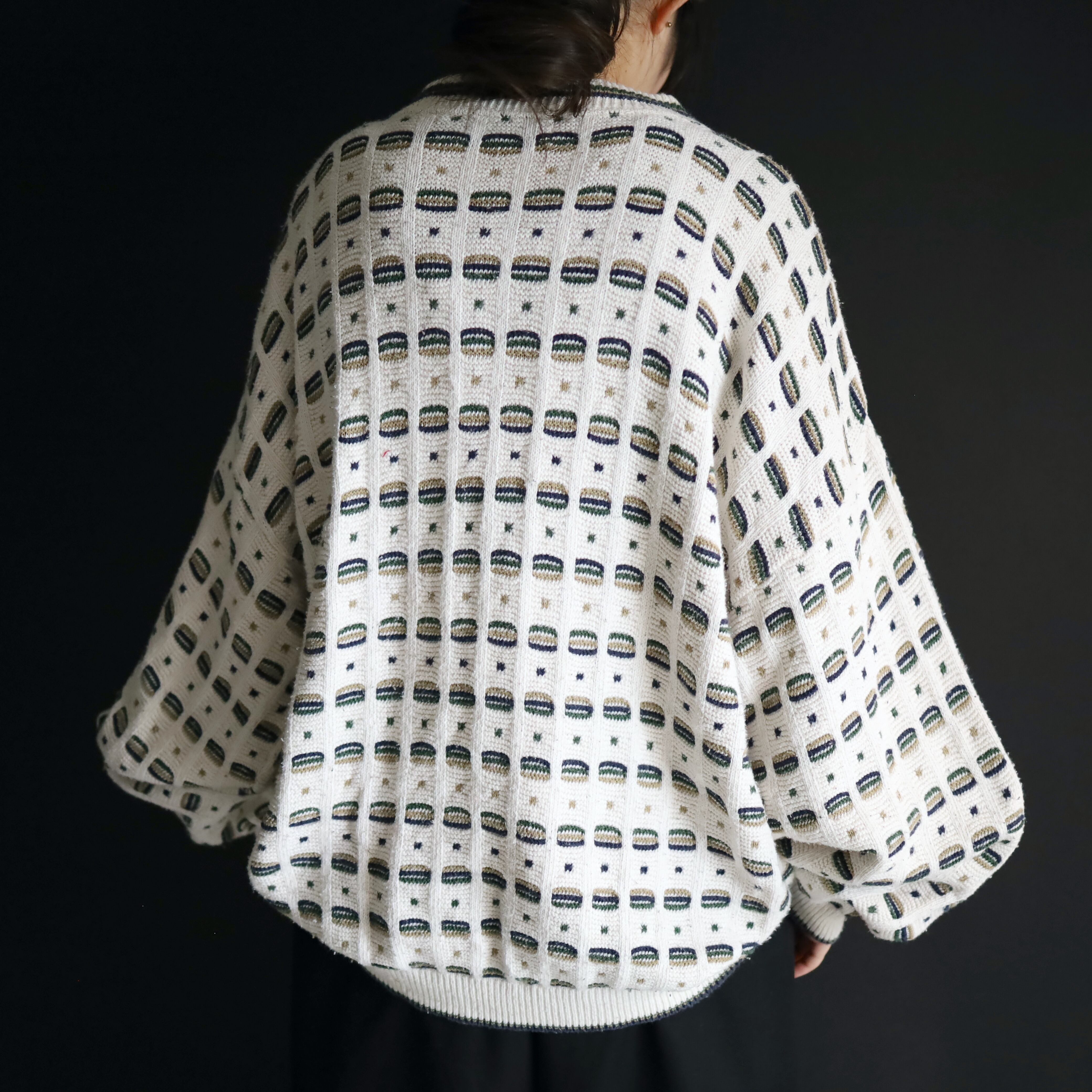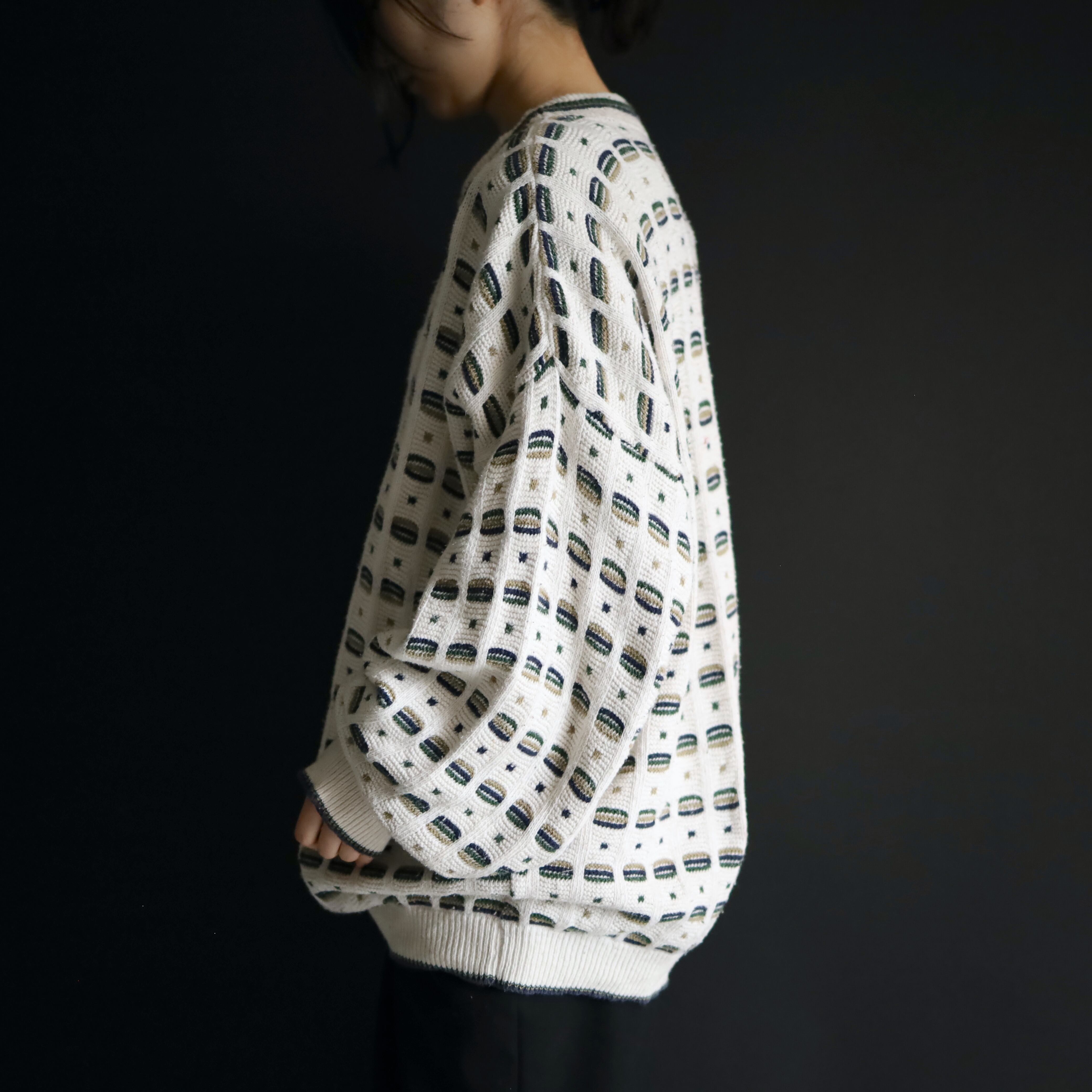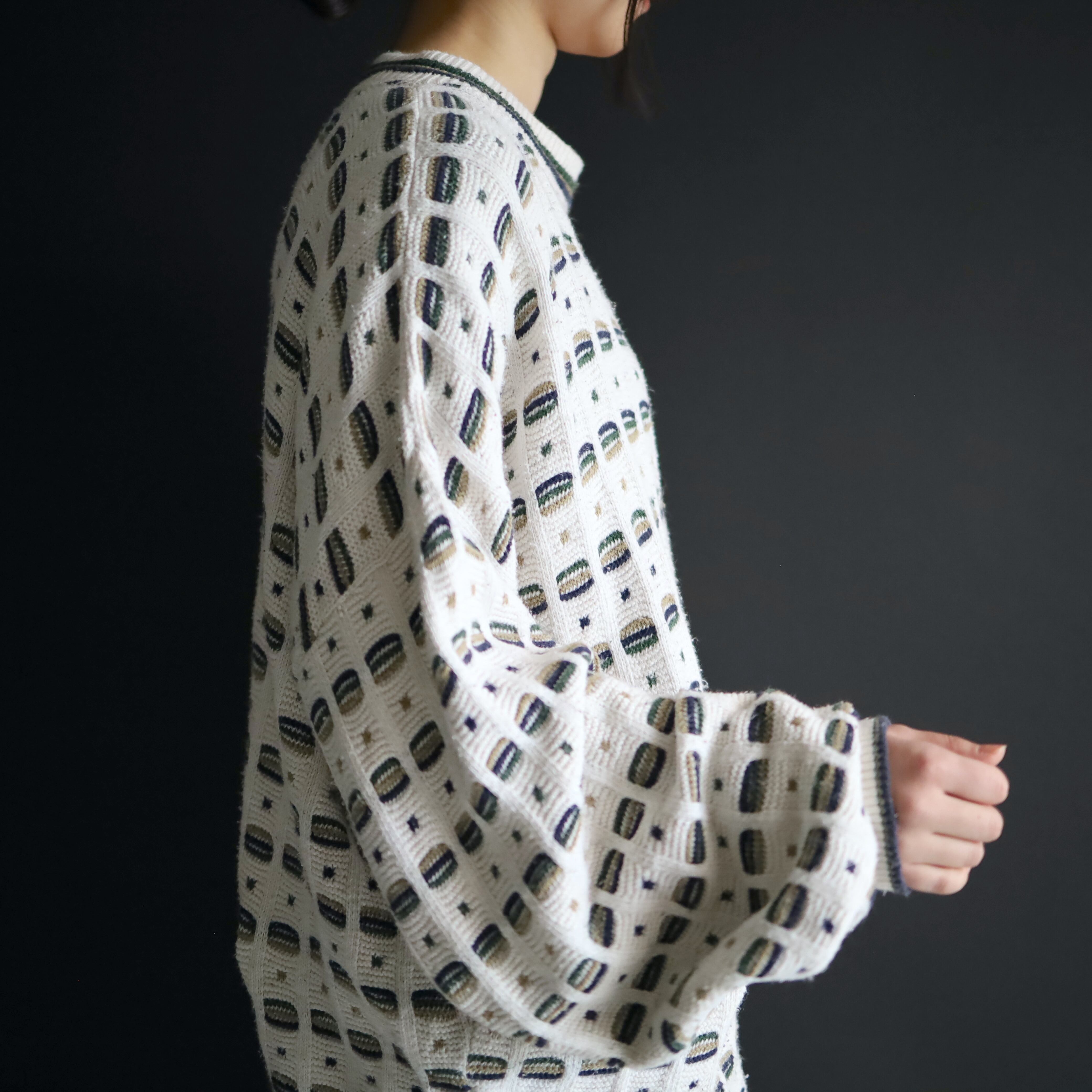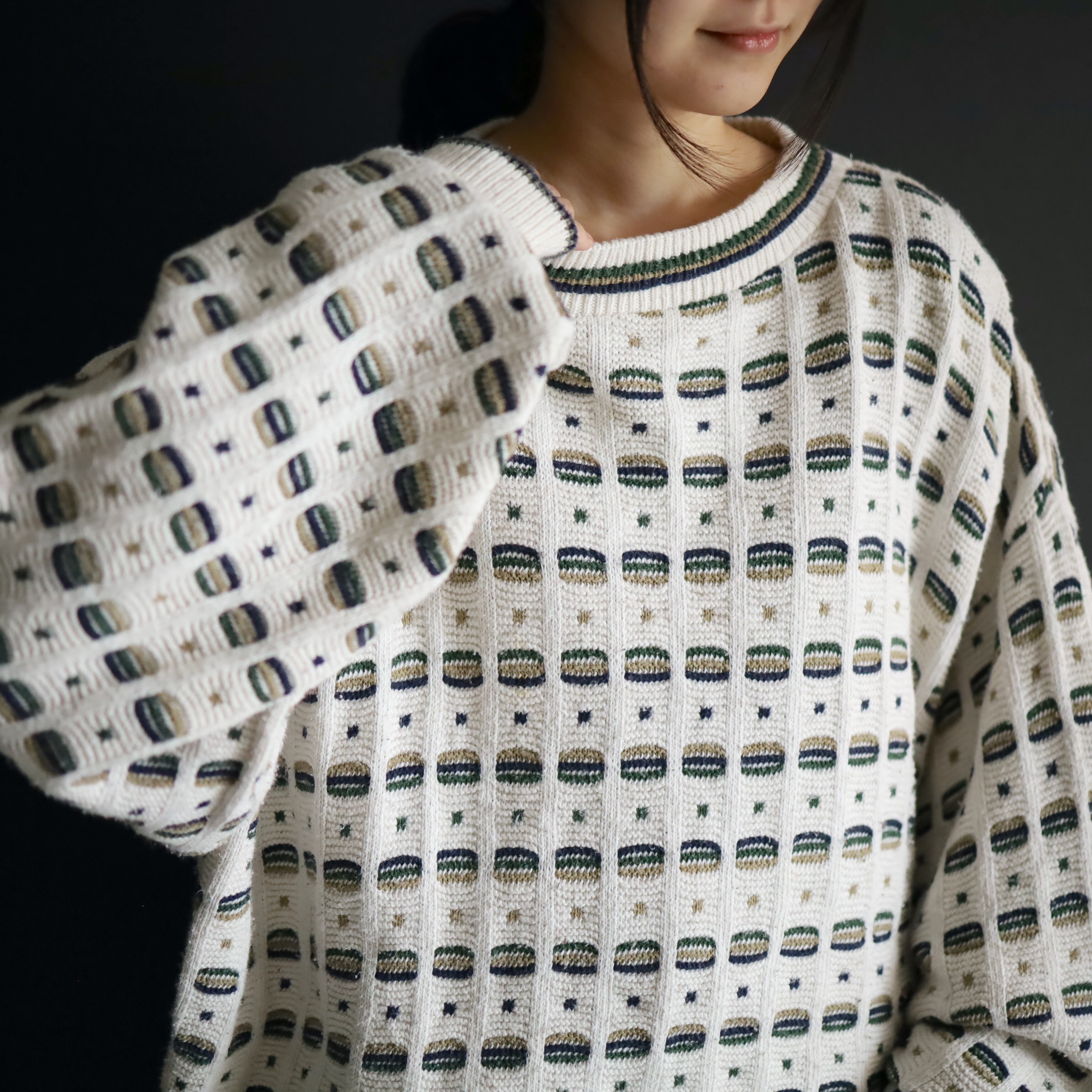 柔らかさのある風合いのホワイトカラーをベースに,規則的に編み込まれたカーキ,ネイビー,ベージュの柄.