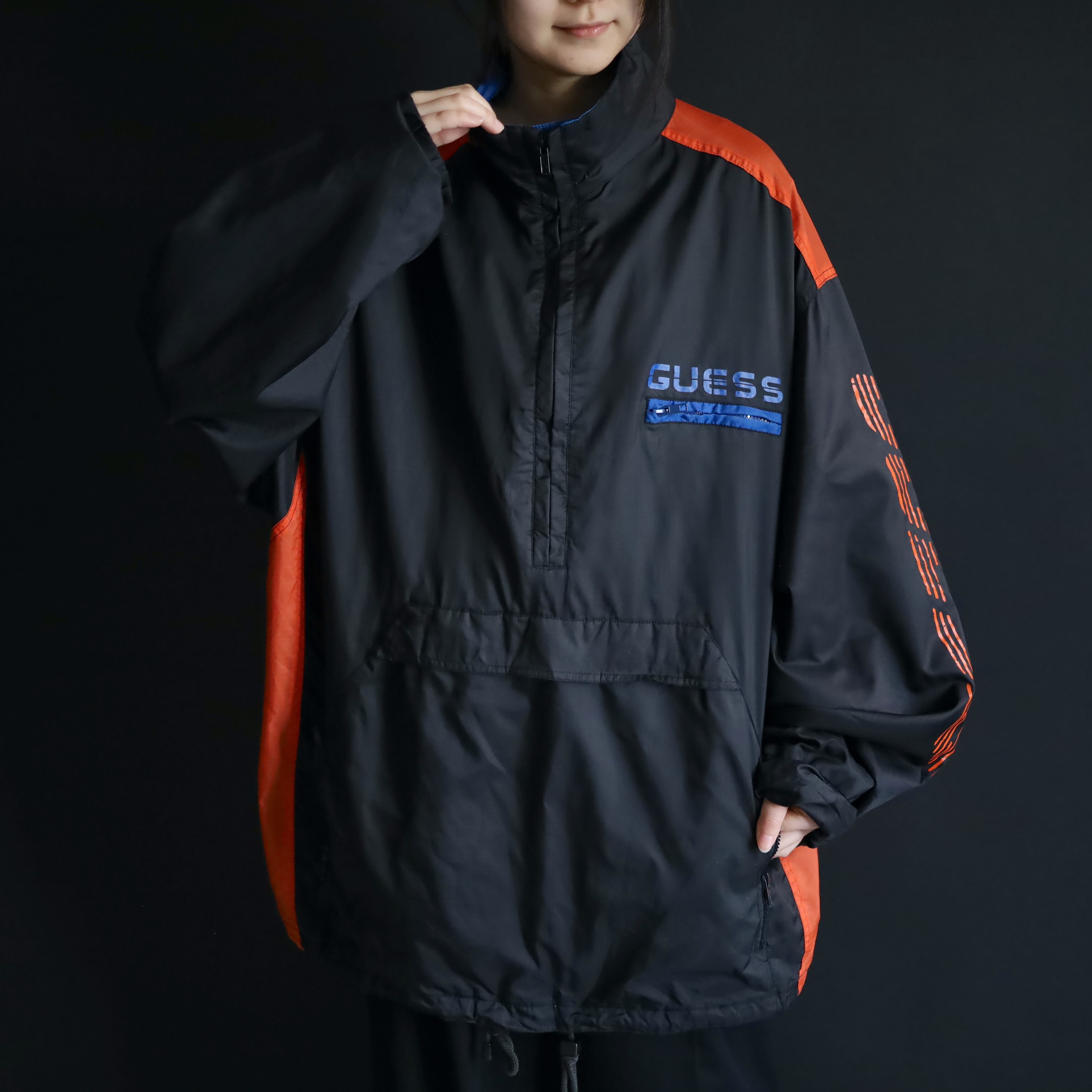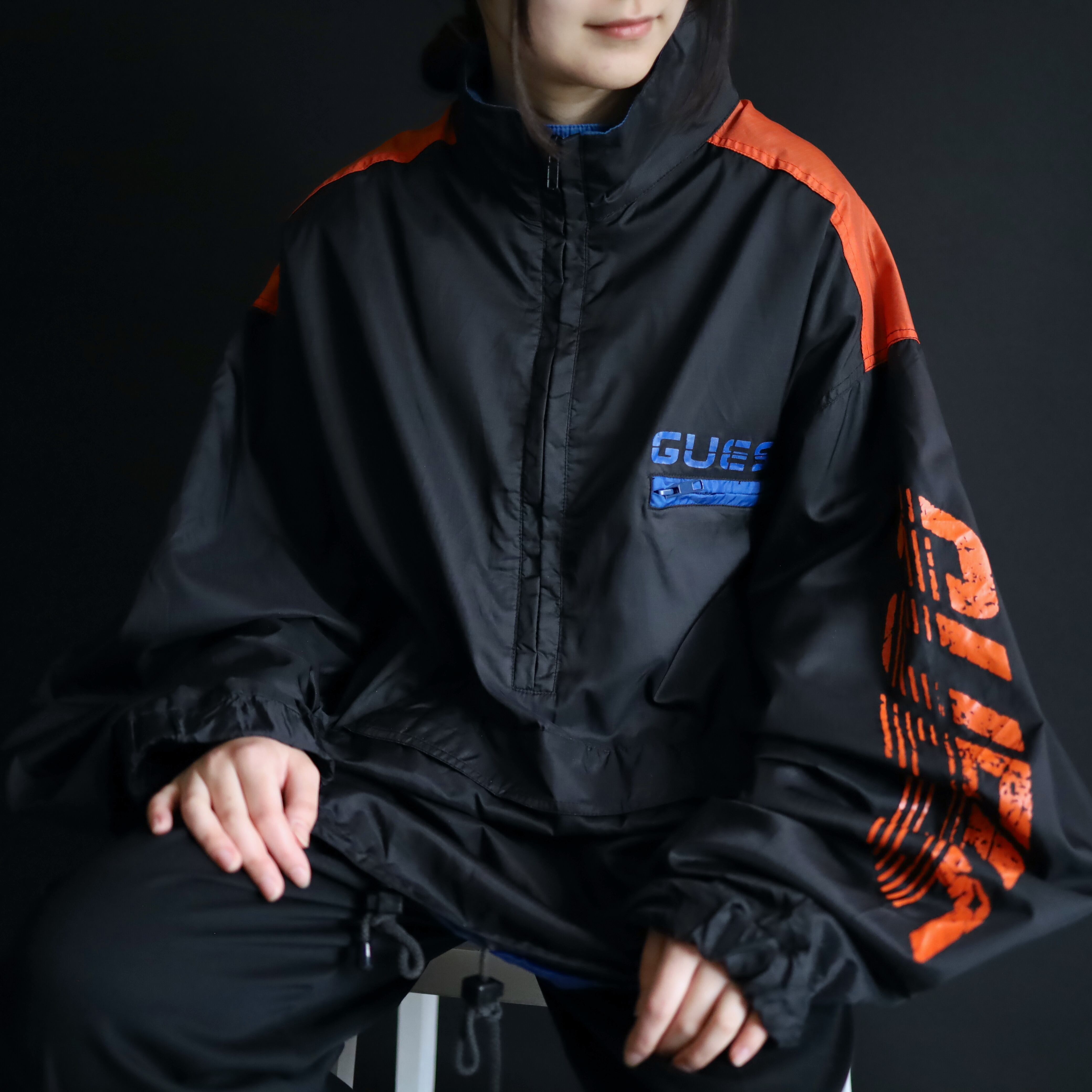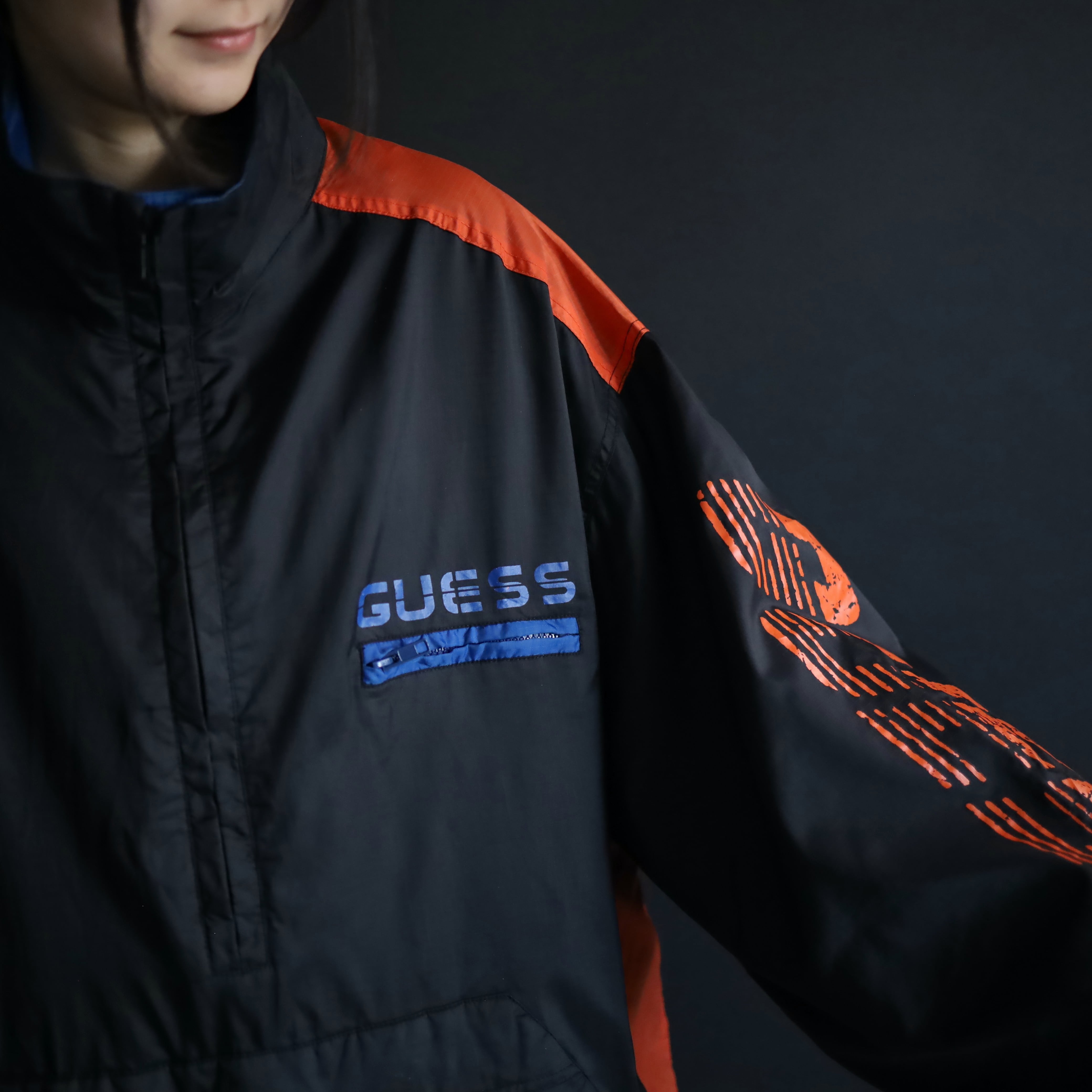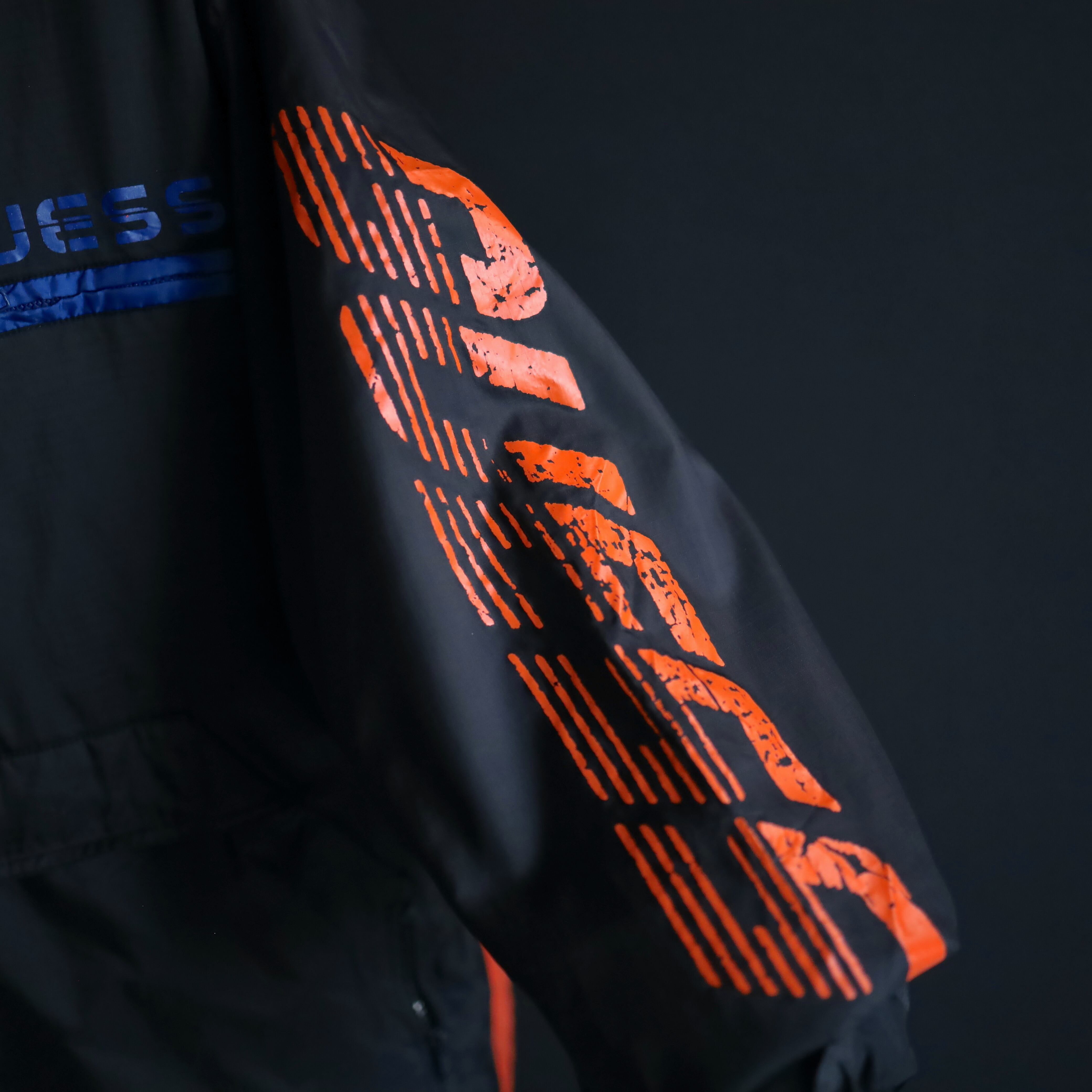 胸元にはブルーカラー,左袖にはオレンジカラーで,それぞれGUESSのブランド名プリントが施され,ストリート感溢れる一枚に仕上がってます.
