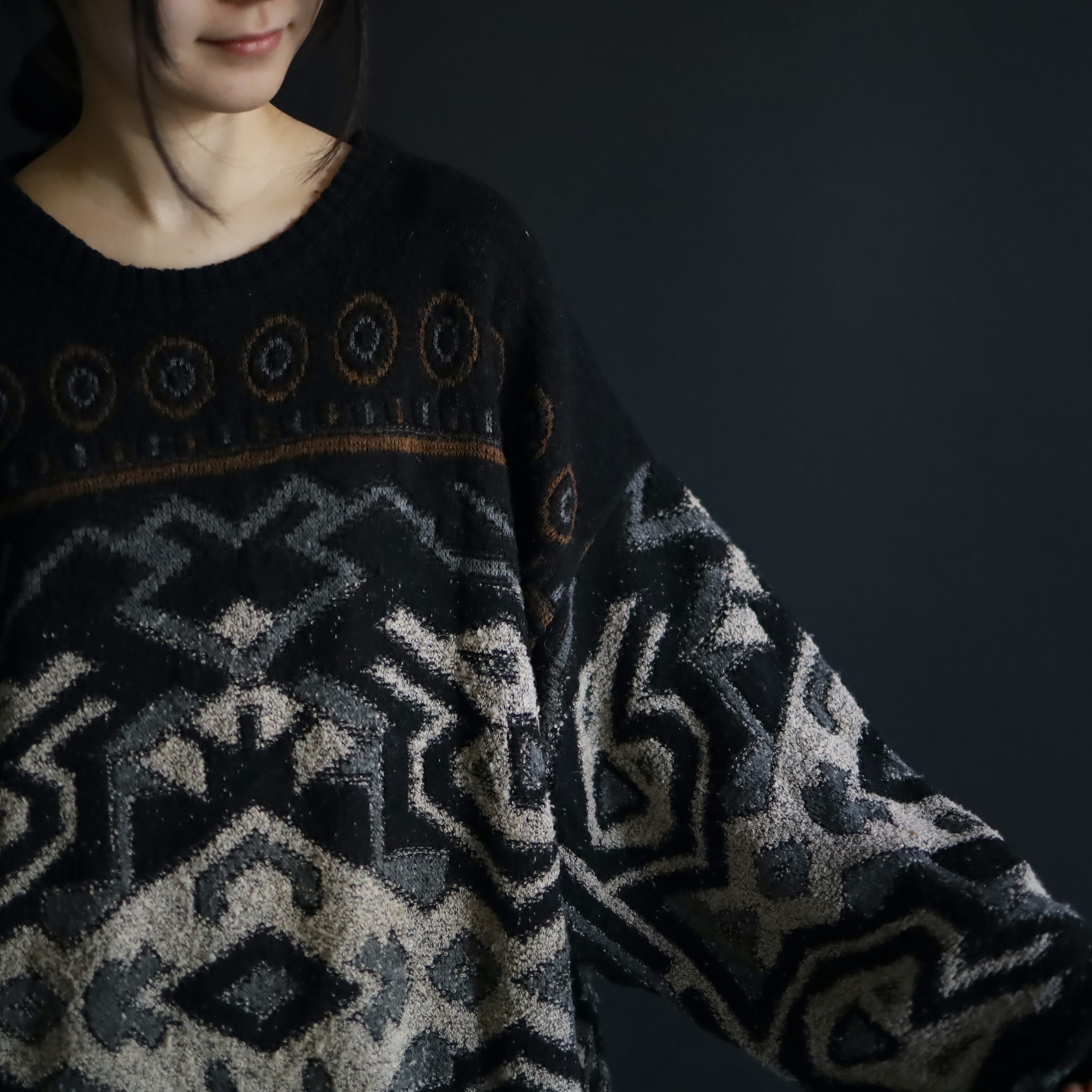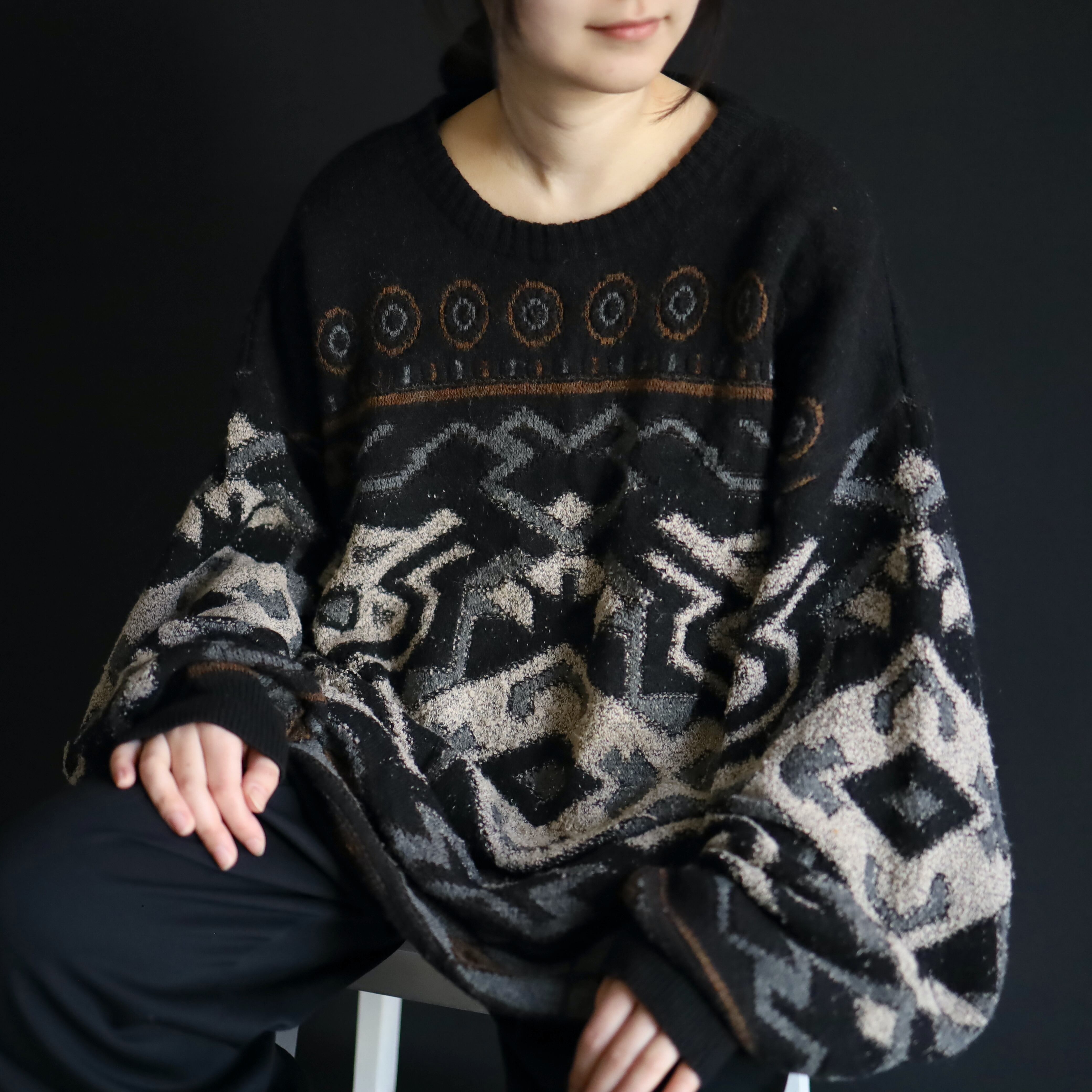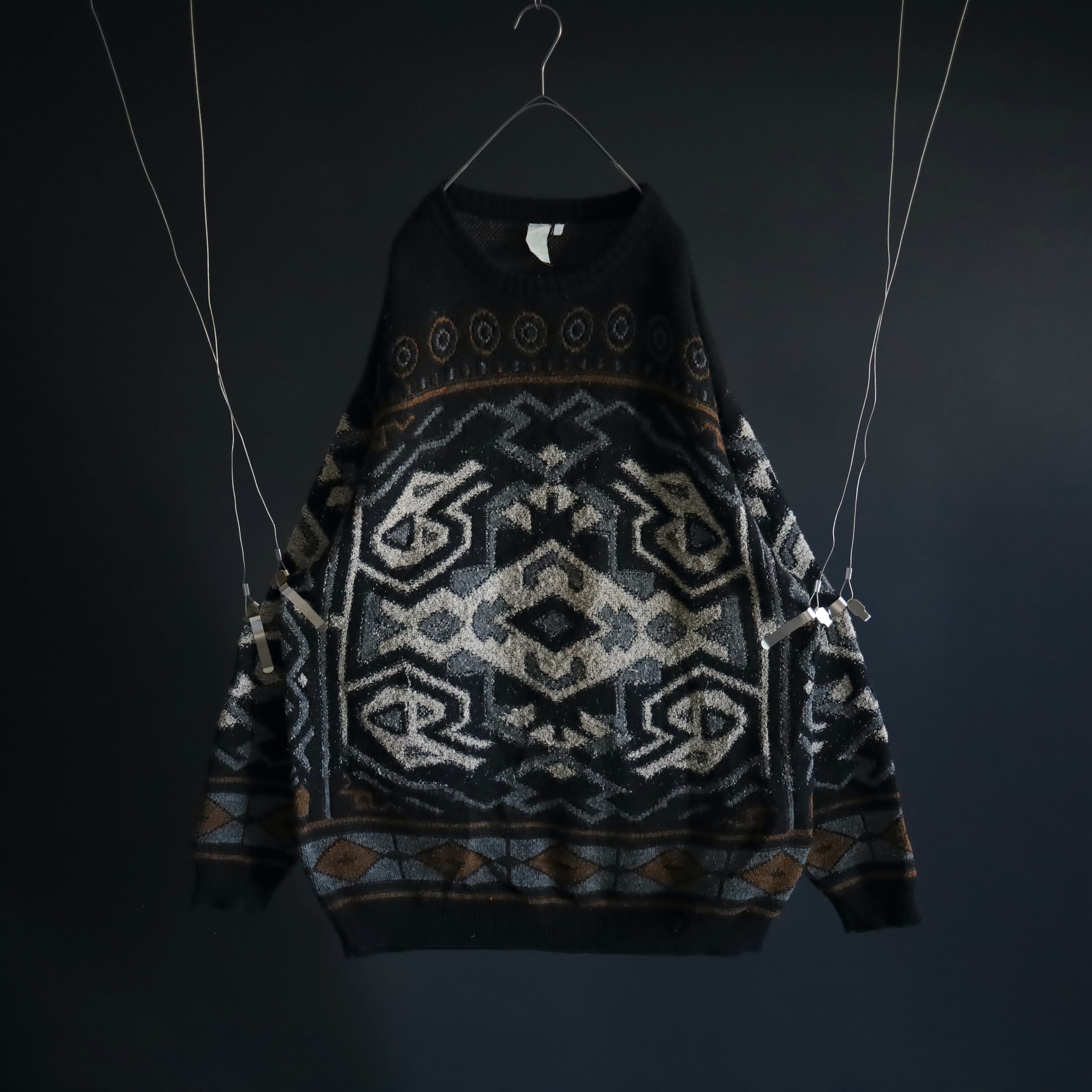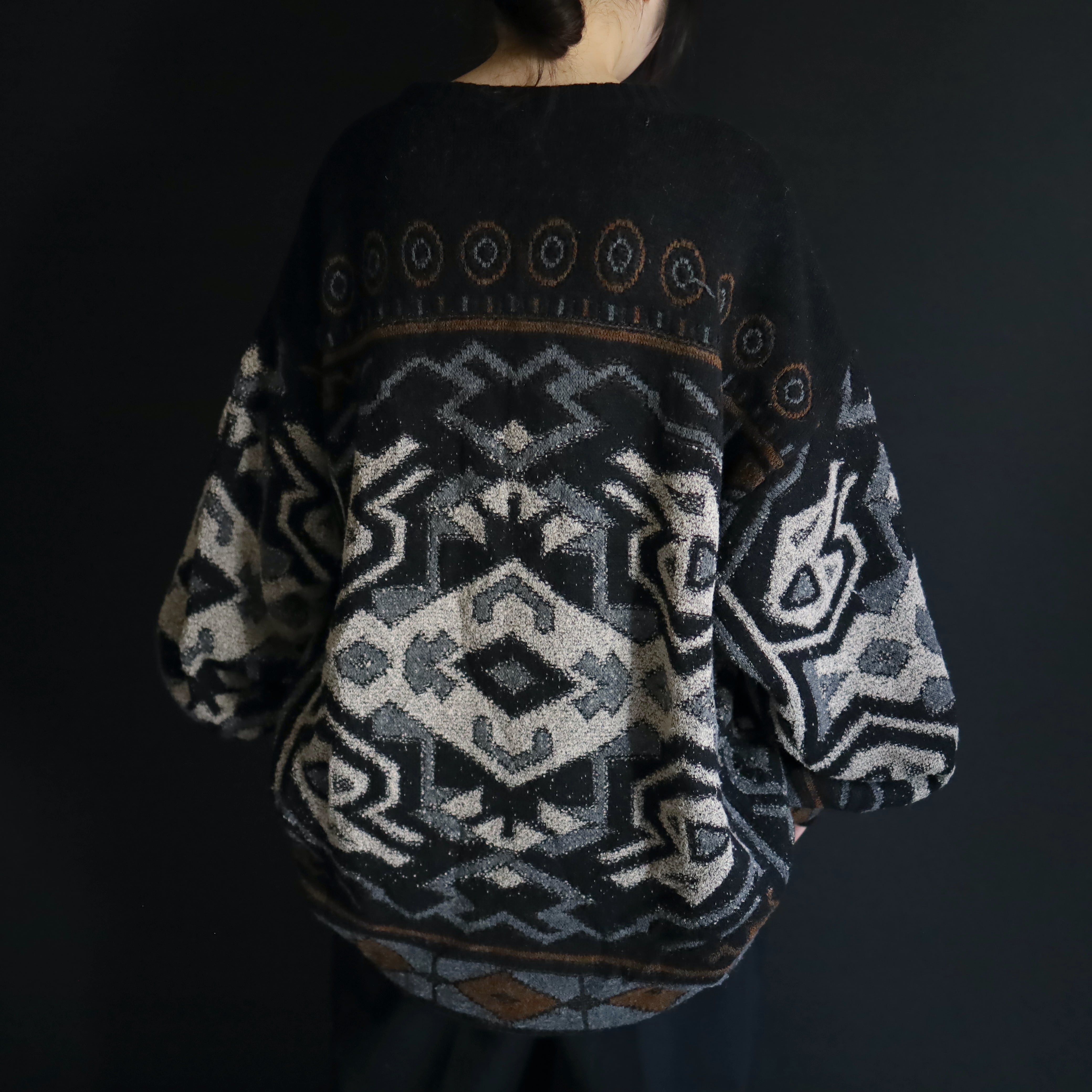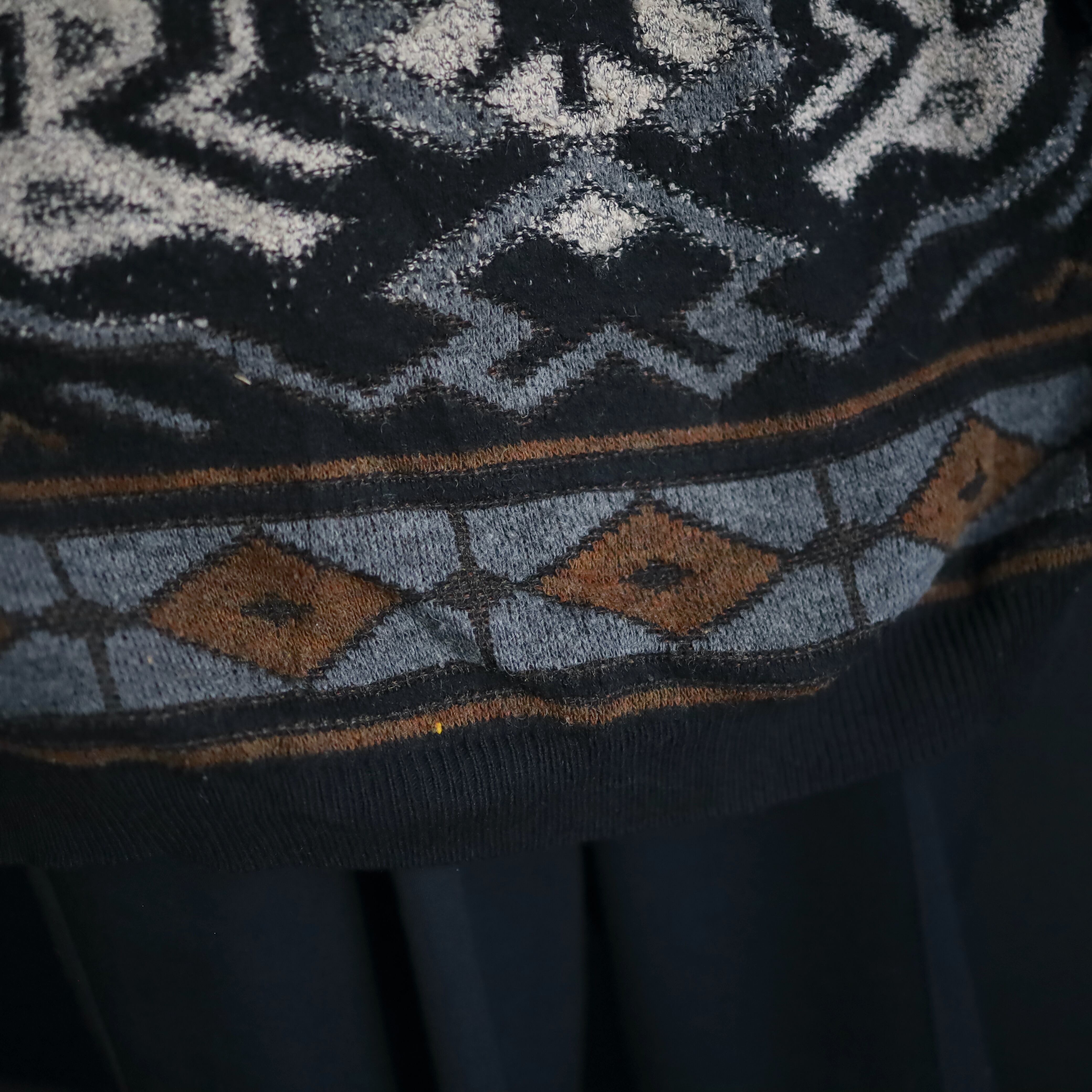 ブラックカラーベースのボディに,グレー,グレージュ,ブラウンを編み込んだ一枚.