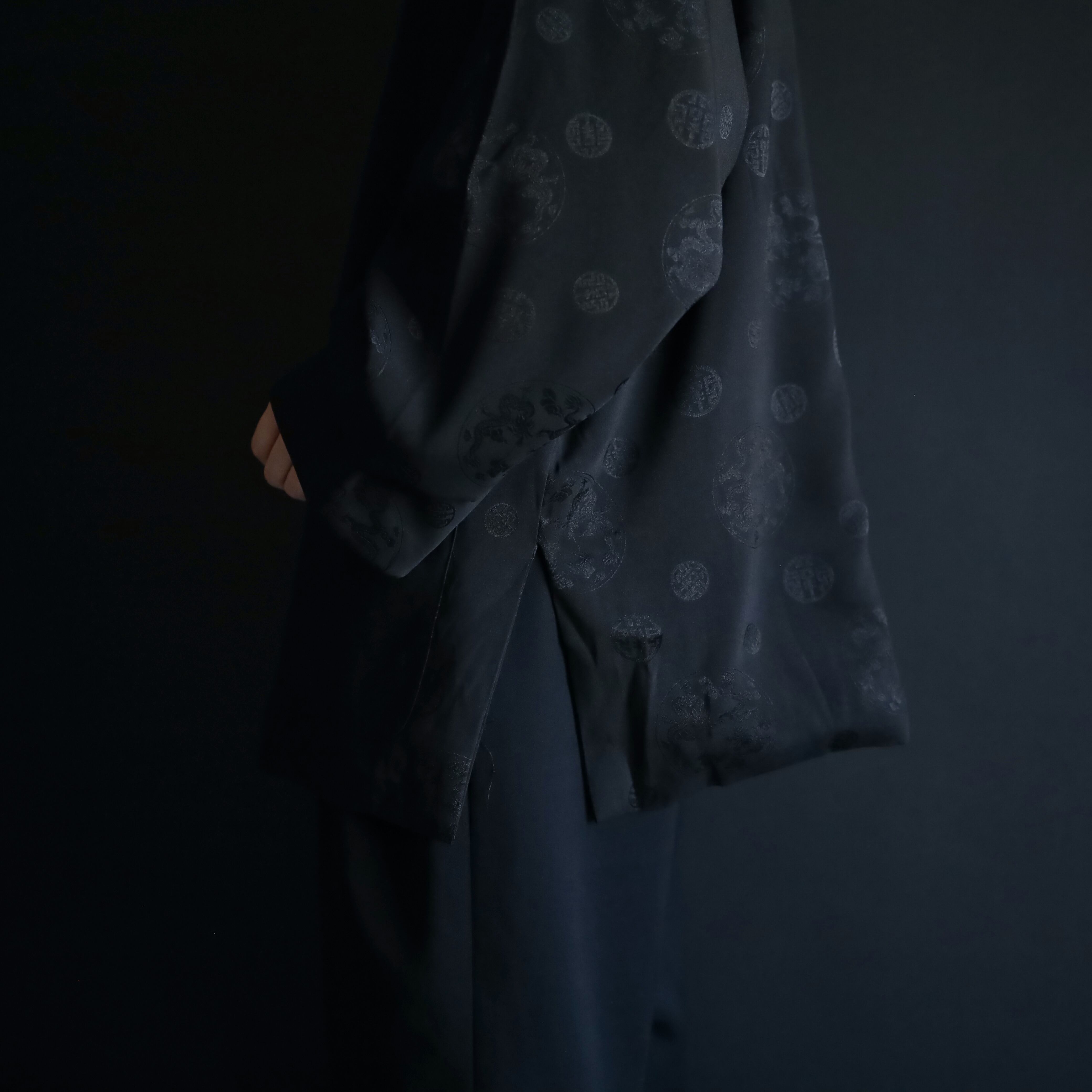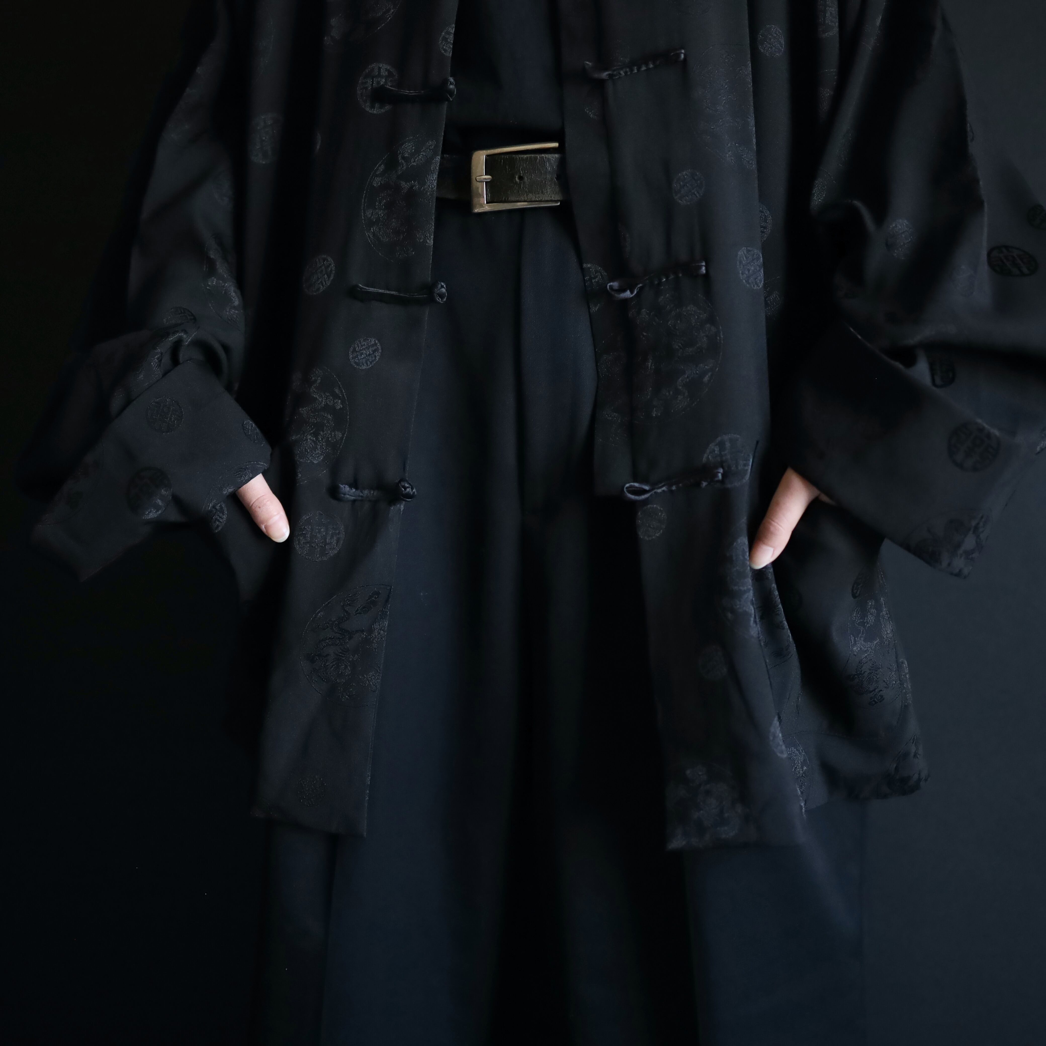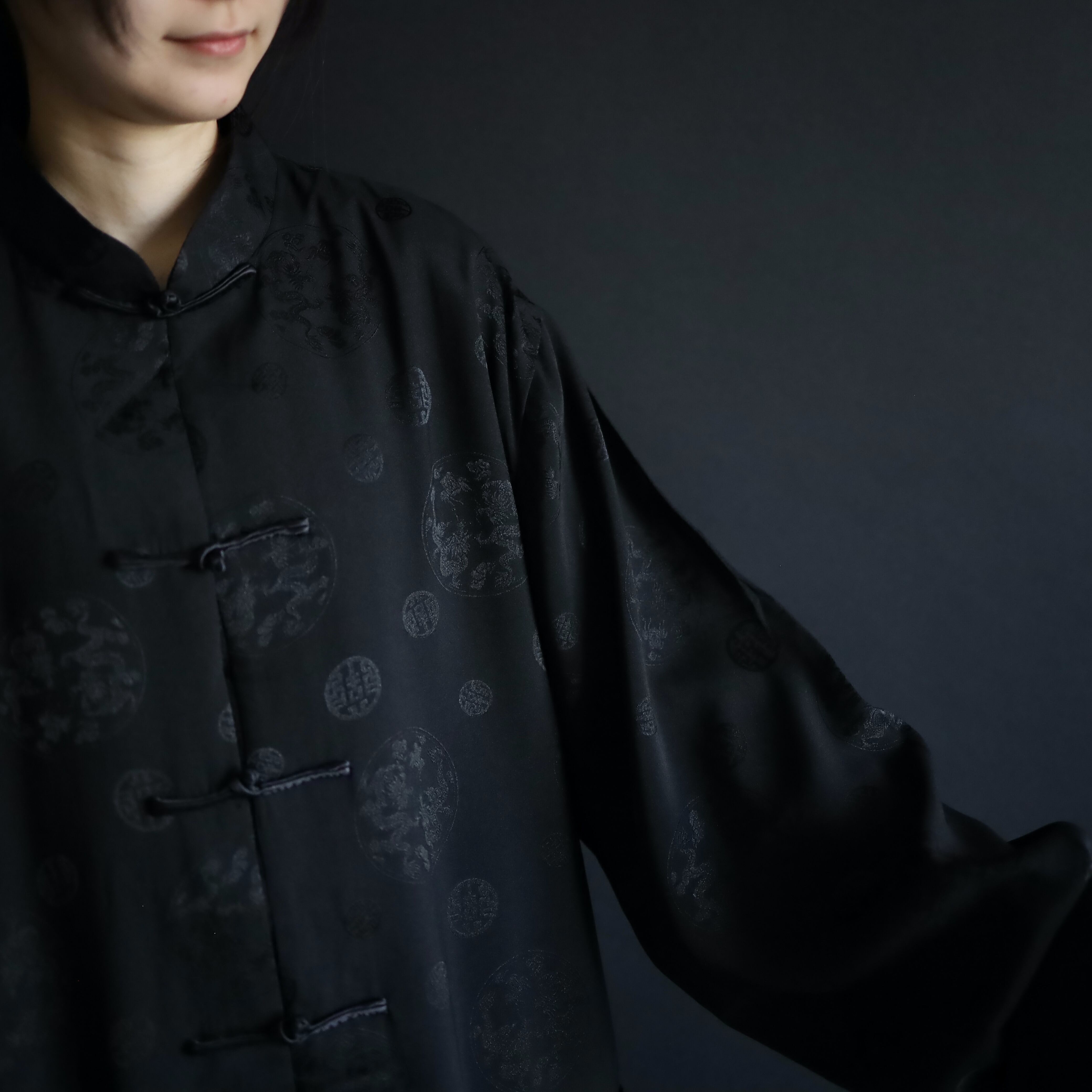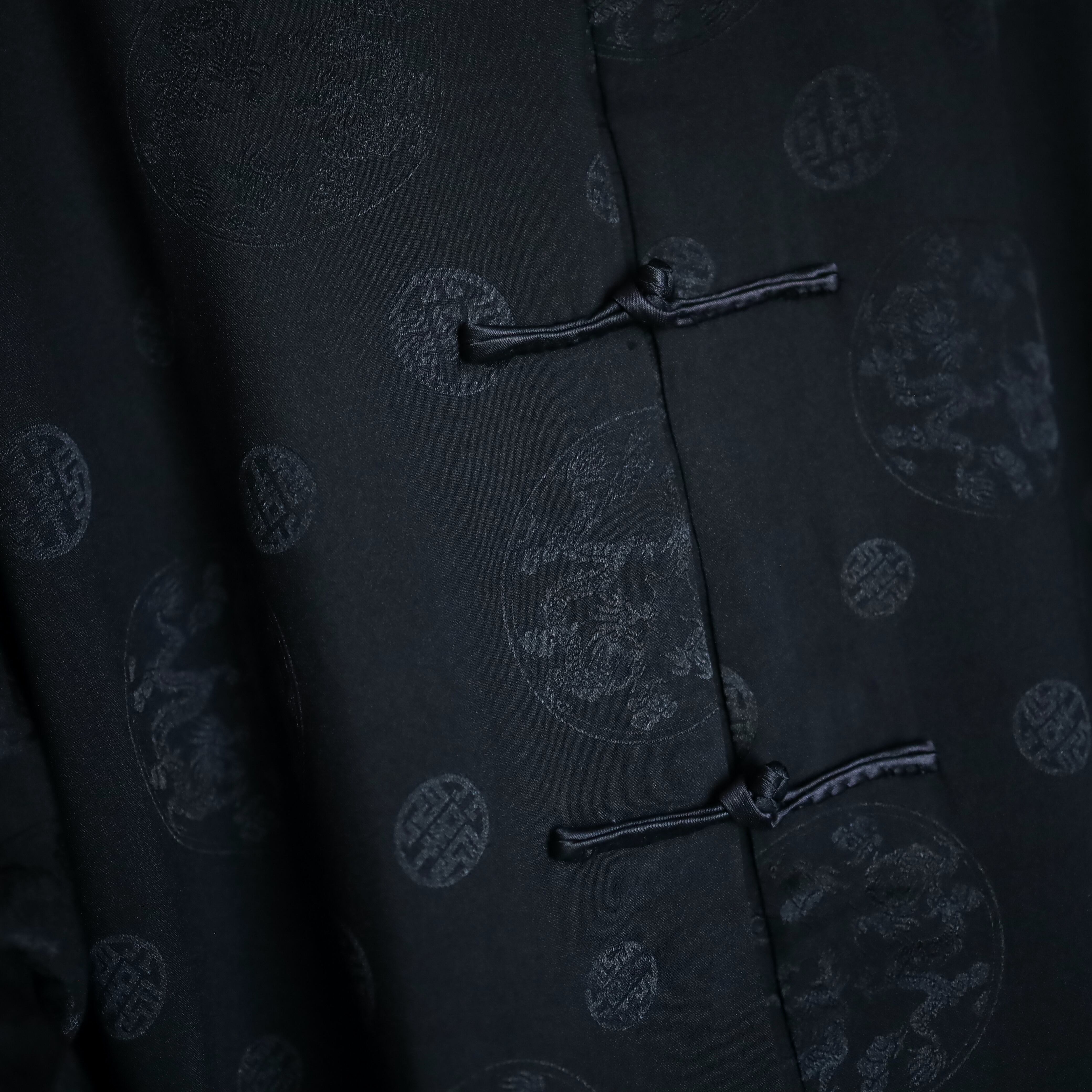 ブラックカラーのボディの上に,ブラックカラーで龍のプリントデザイン.