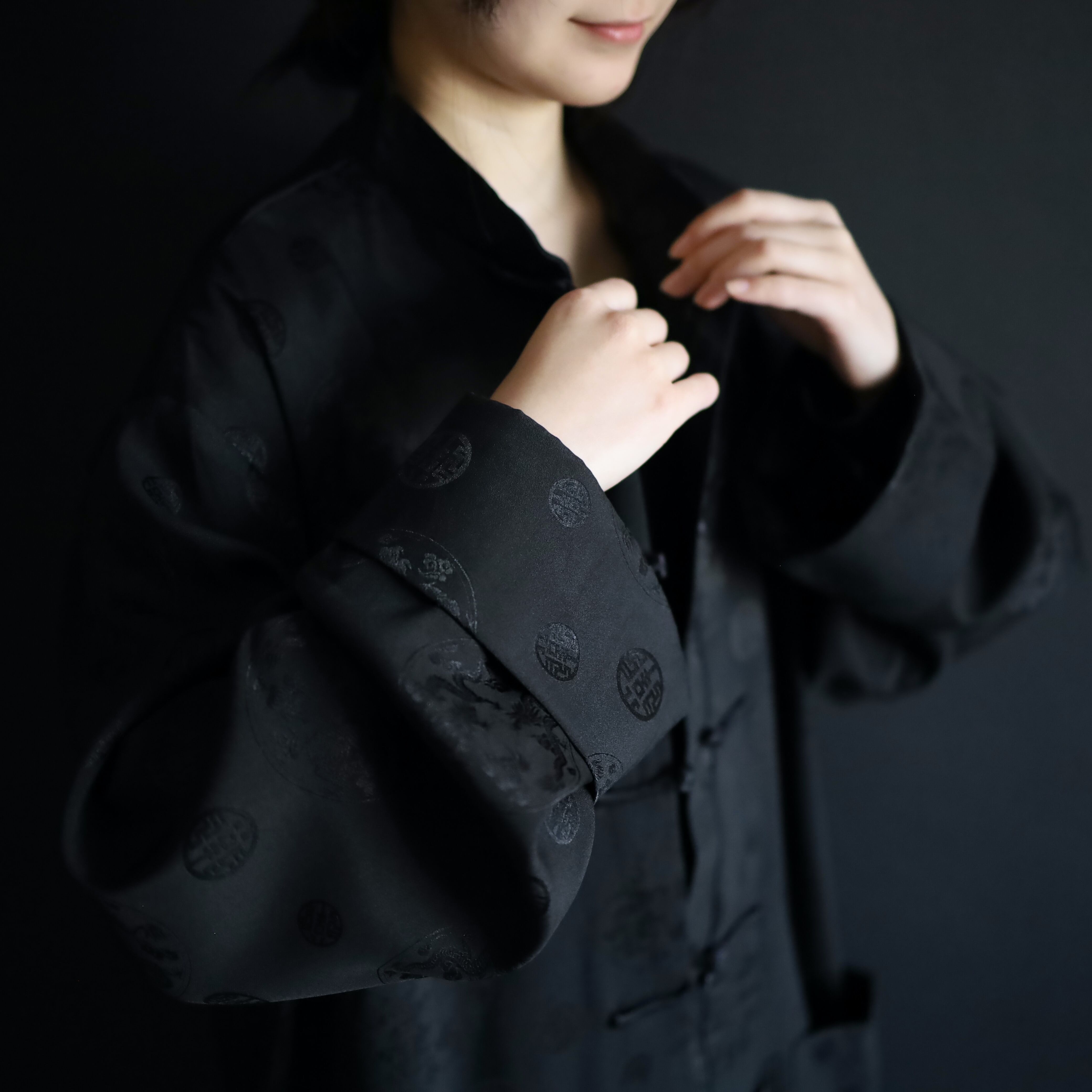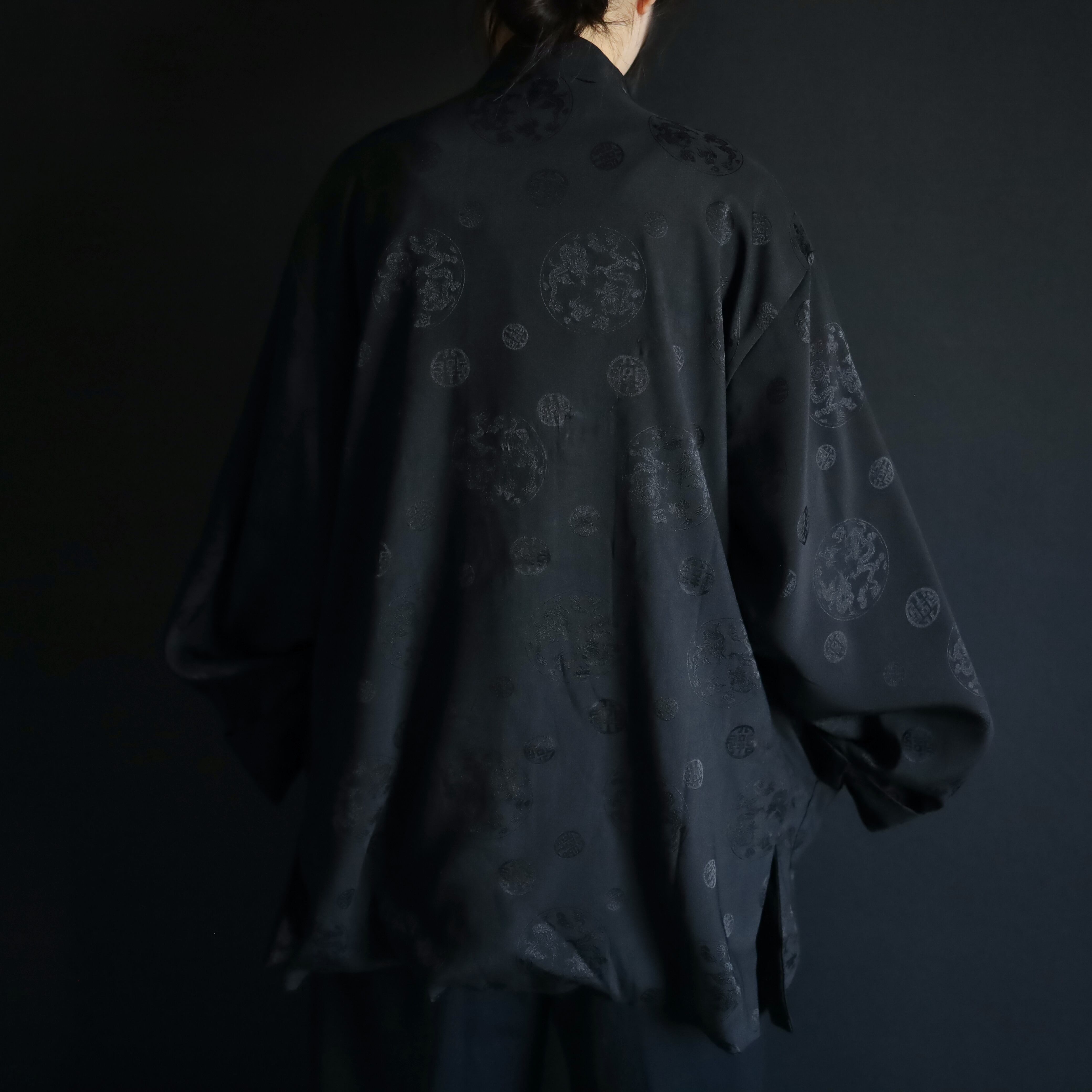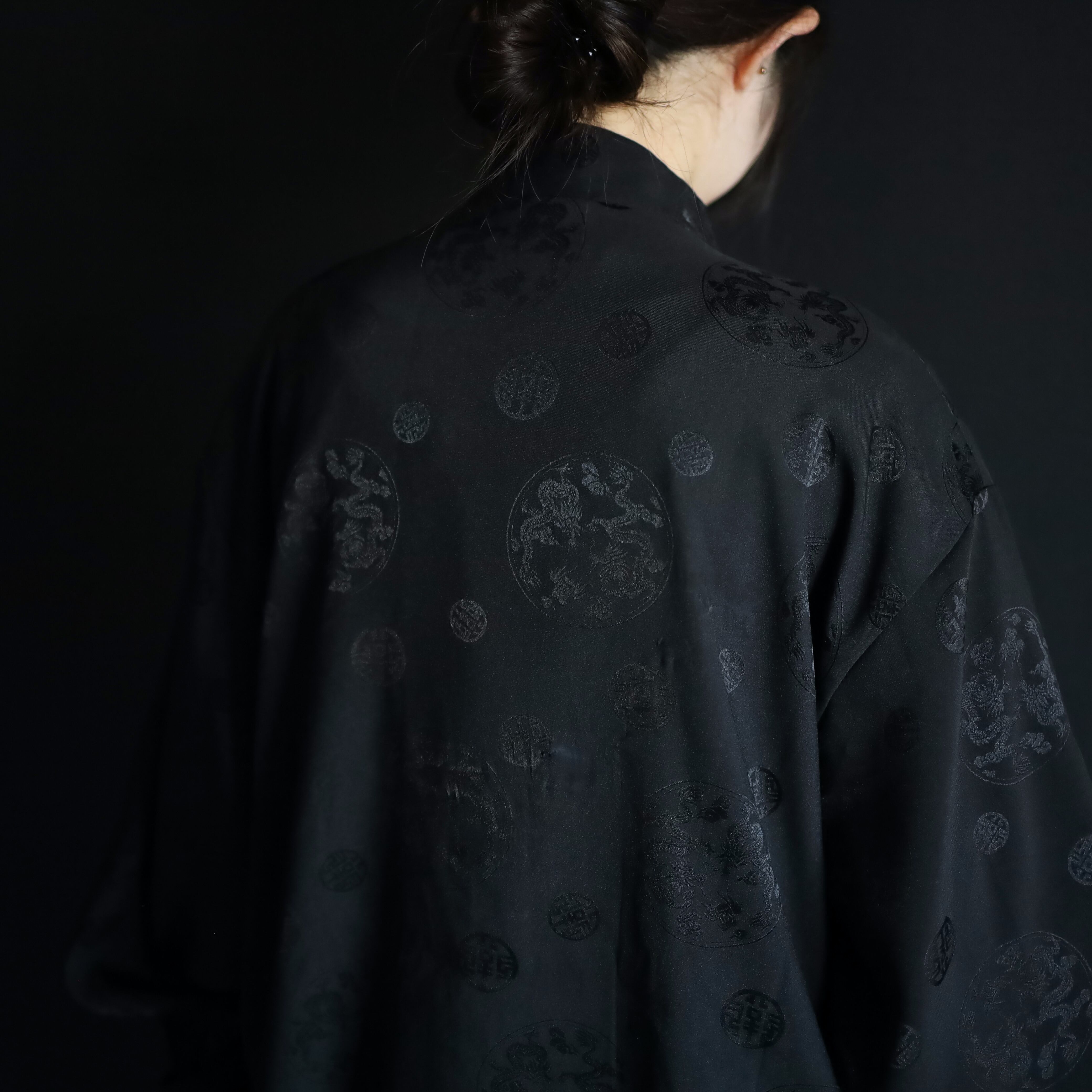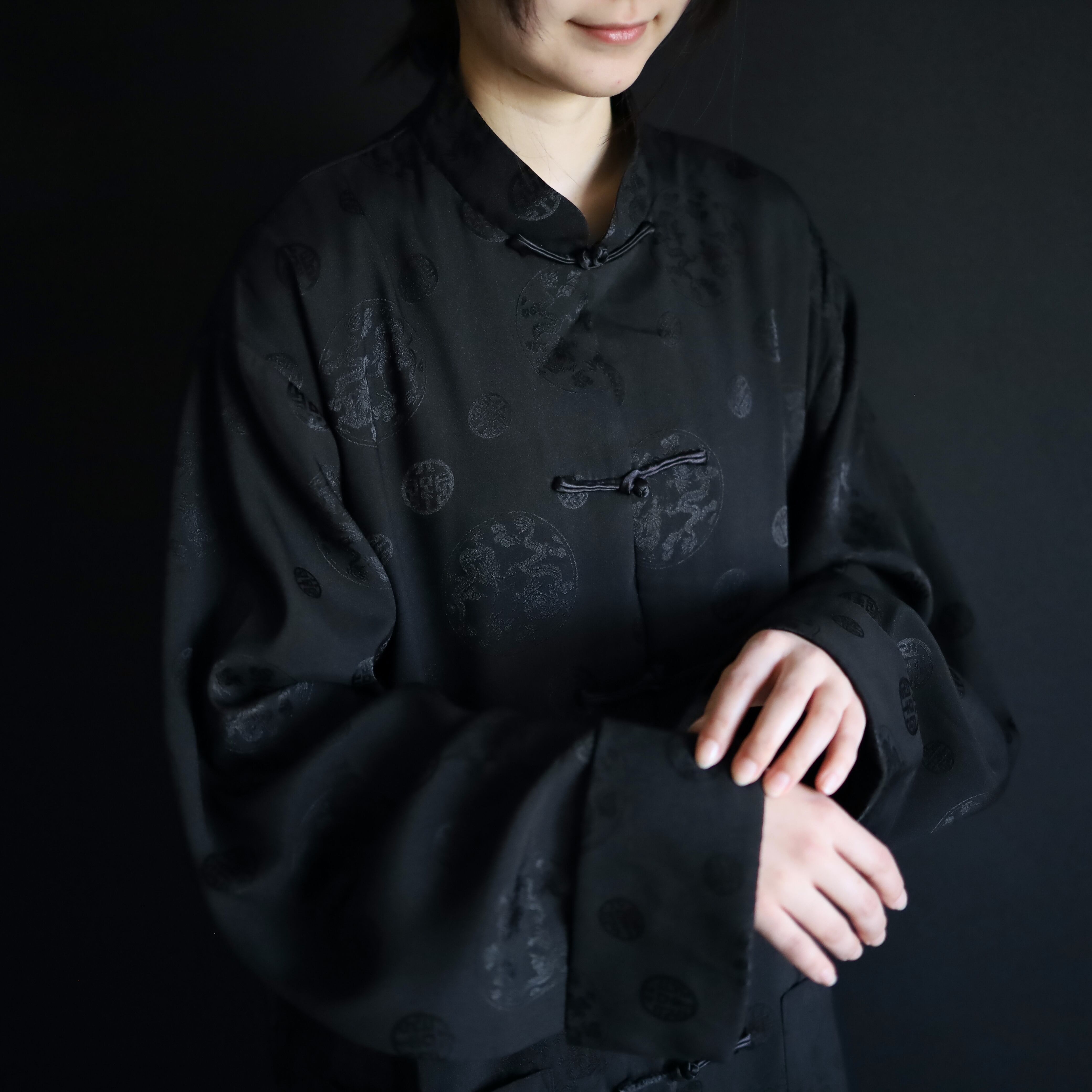ブラックカラーのボディの上に,ブラックカラーで龍のプリントデザイン.