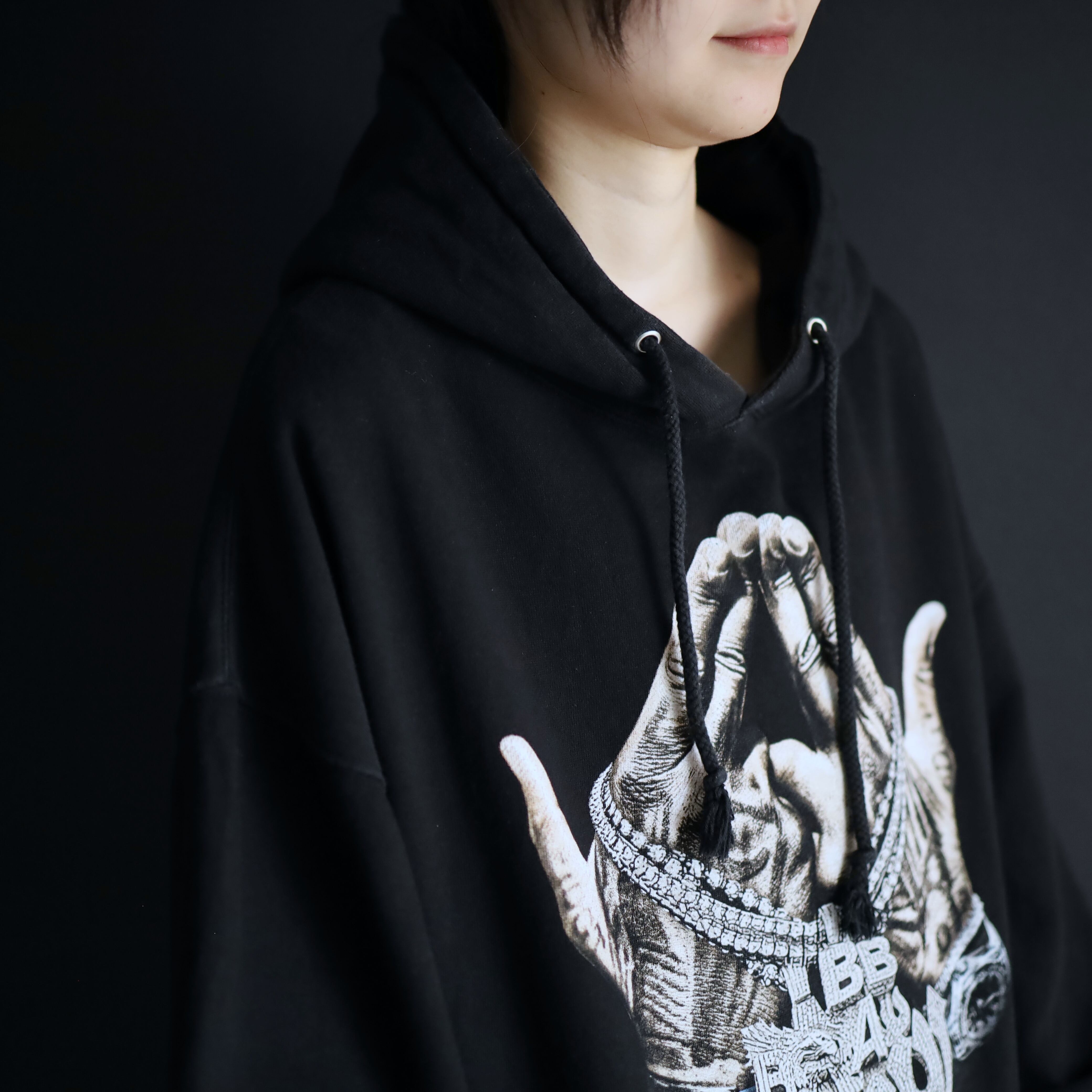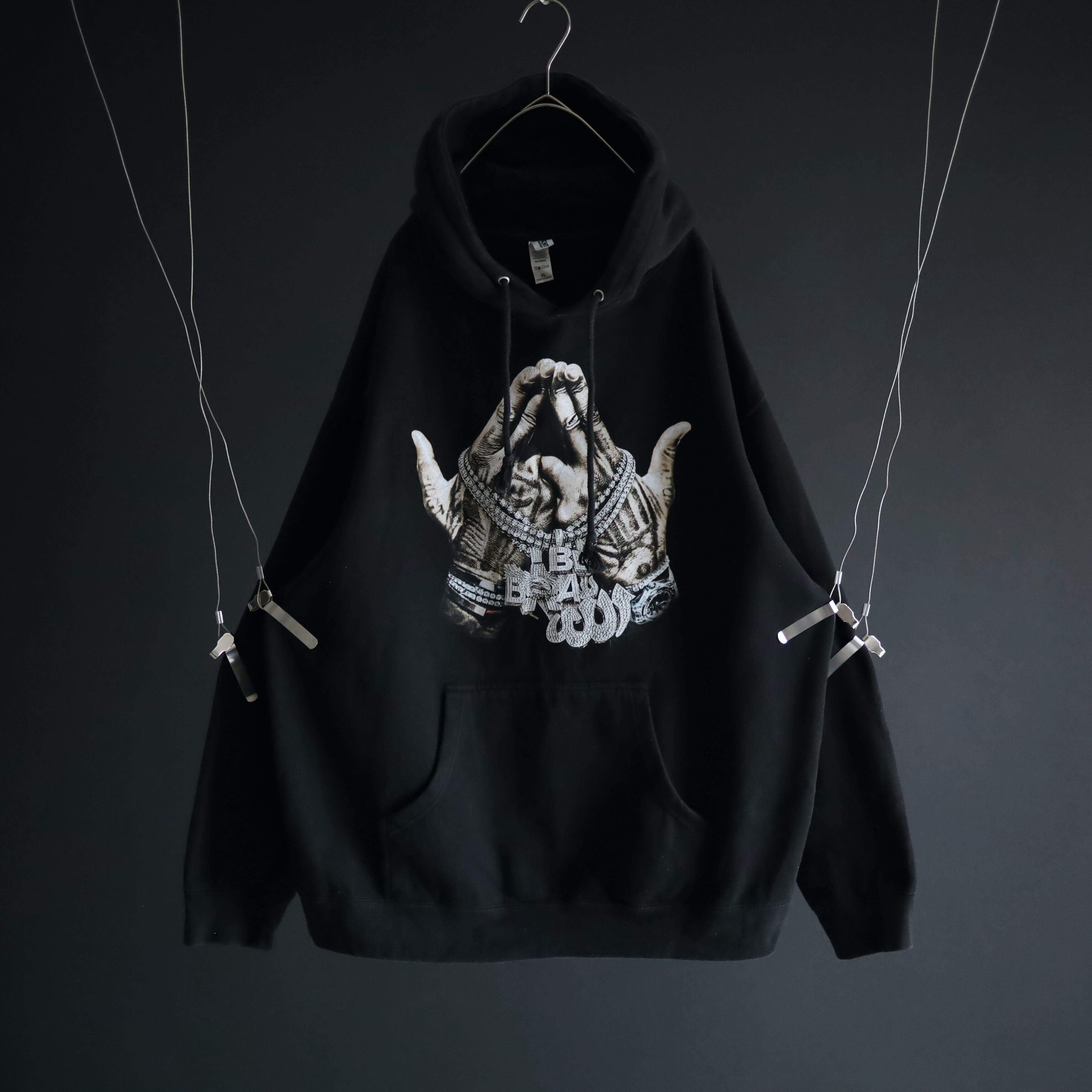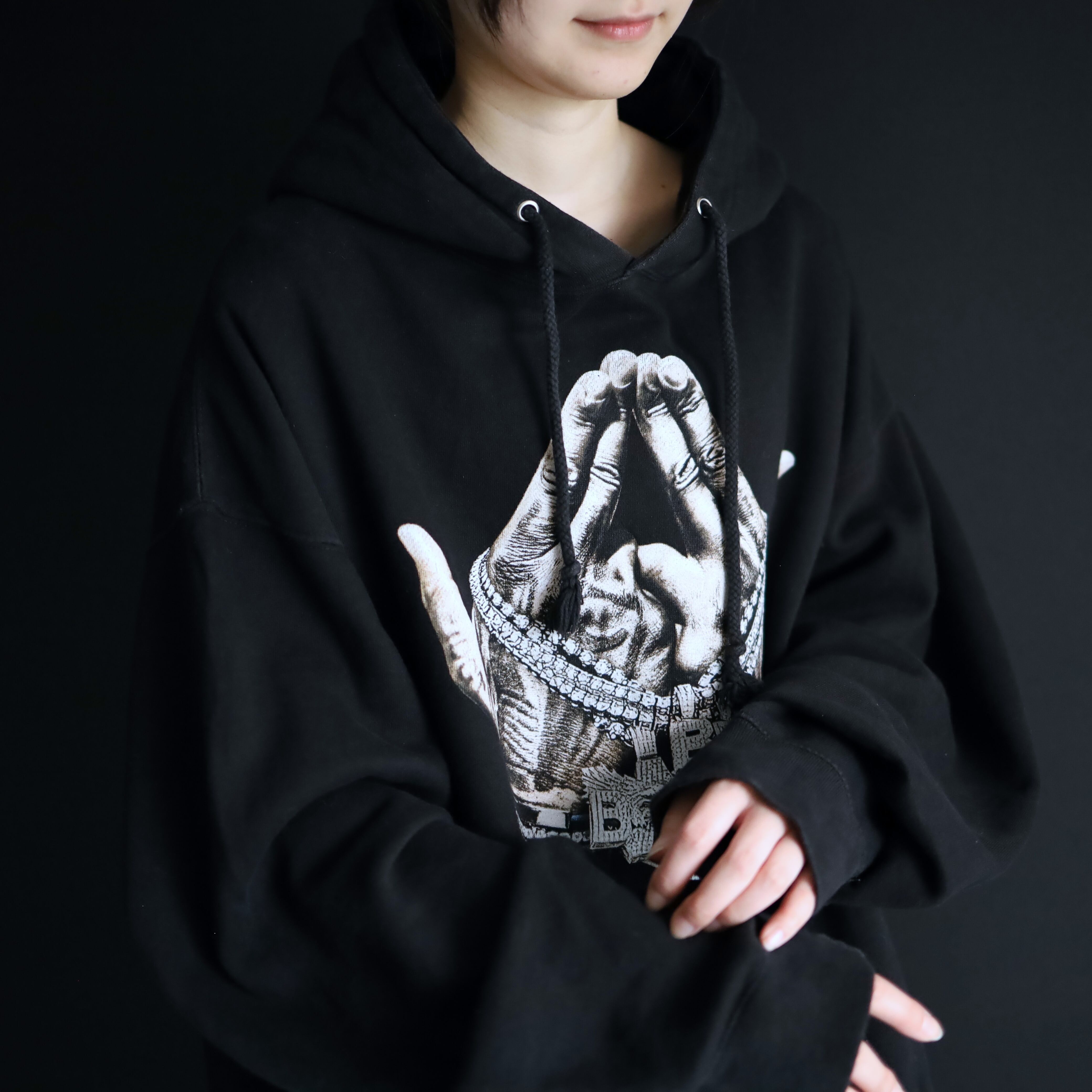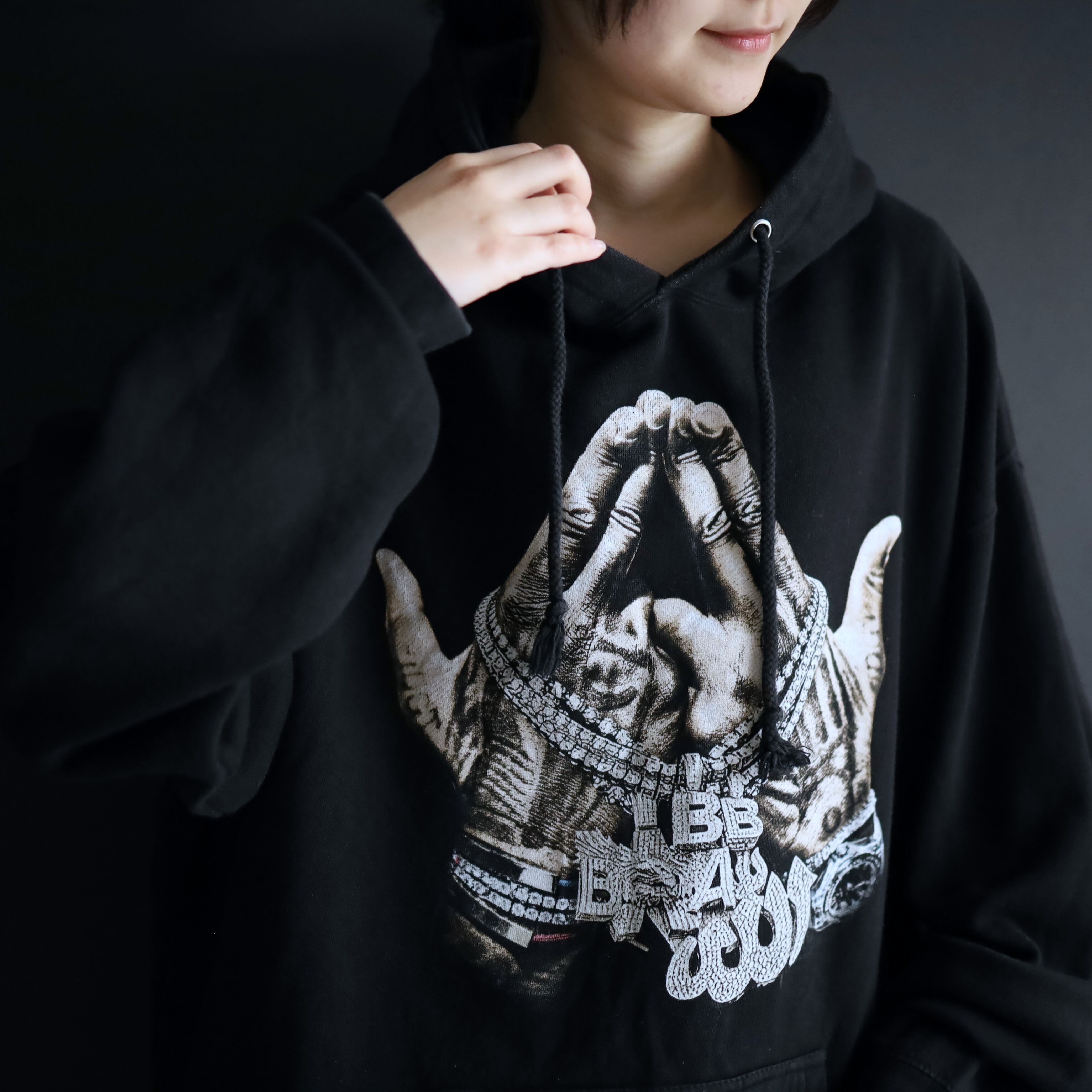 フロントに大きく,両の小指薬指を組んだ,アクセサリージャラジャラの手首から先のプリント.