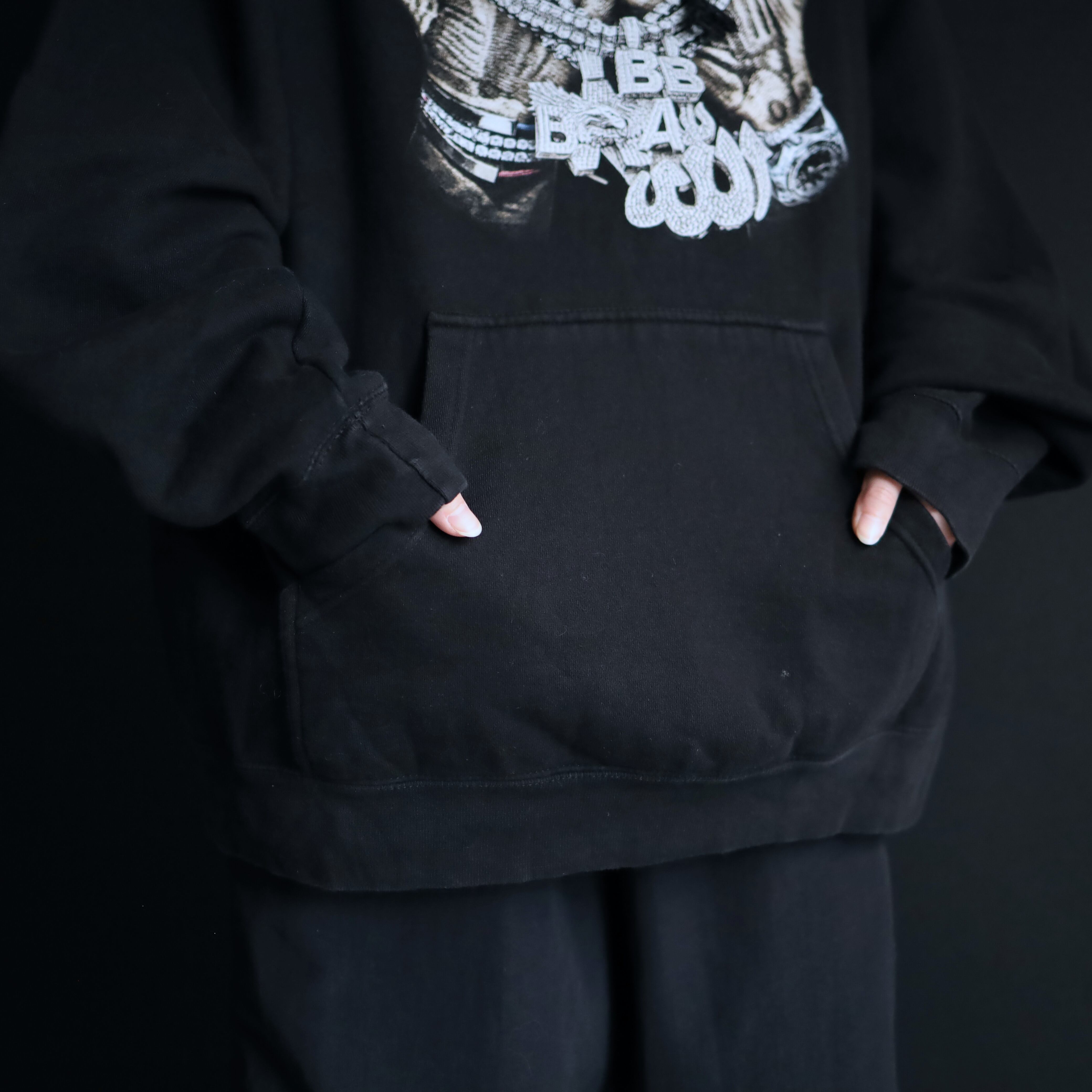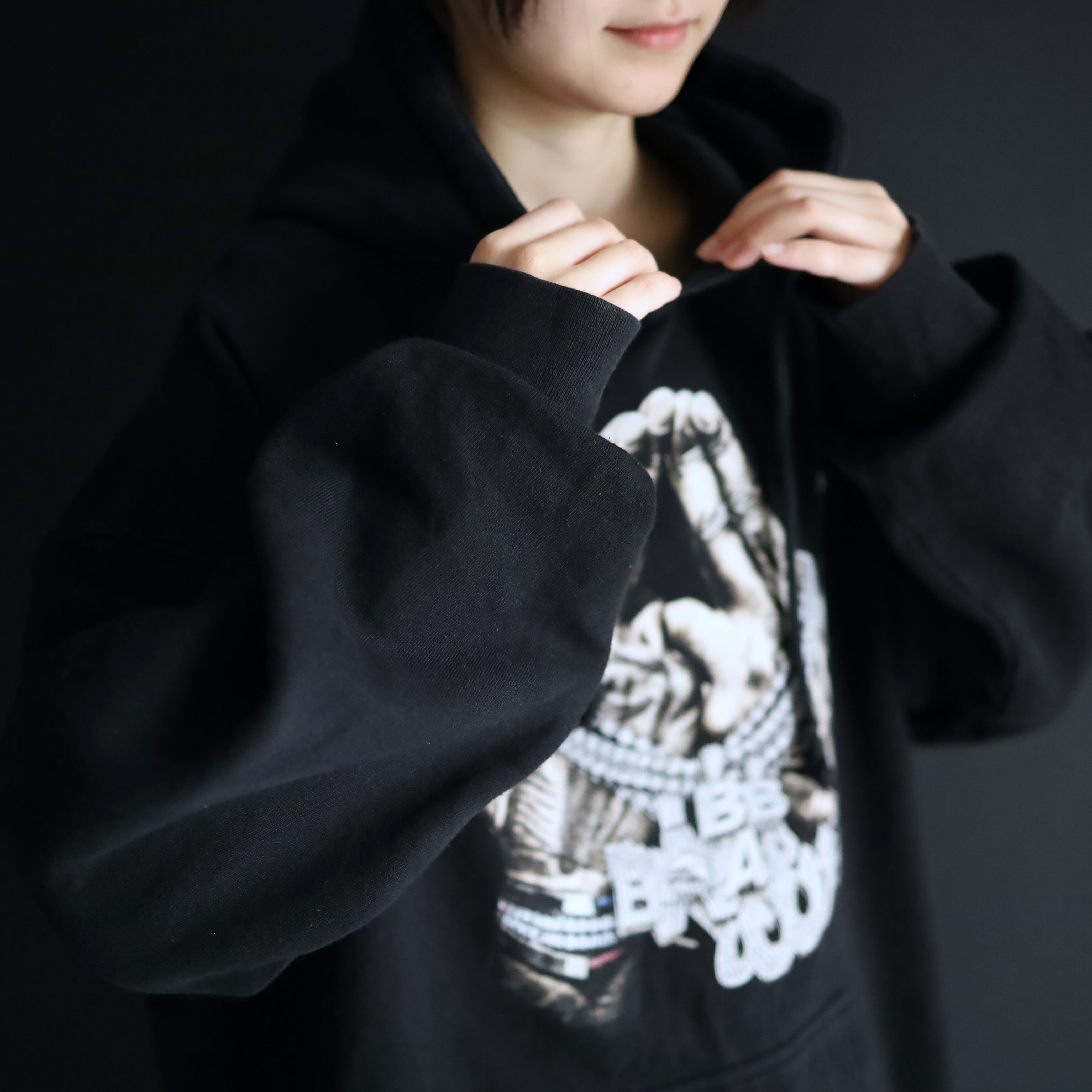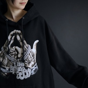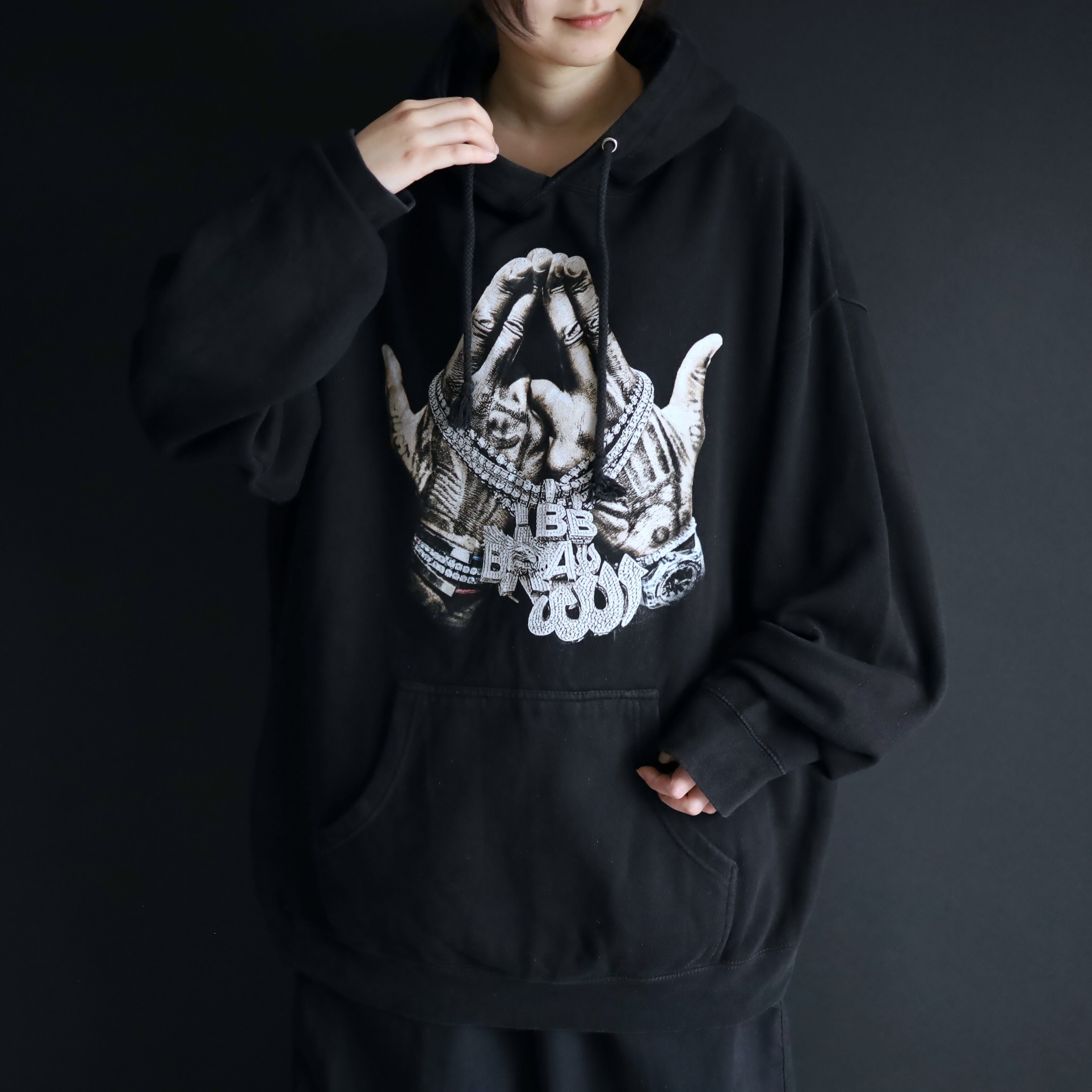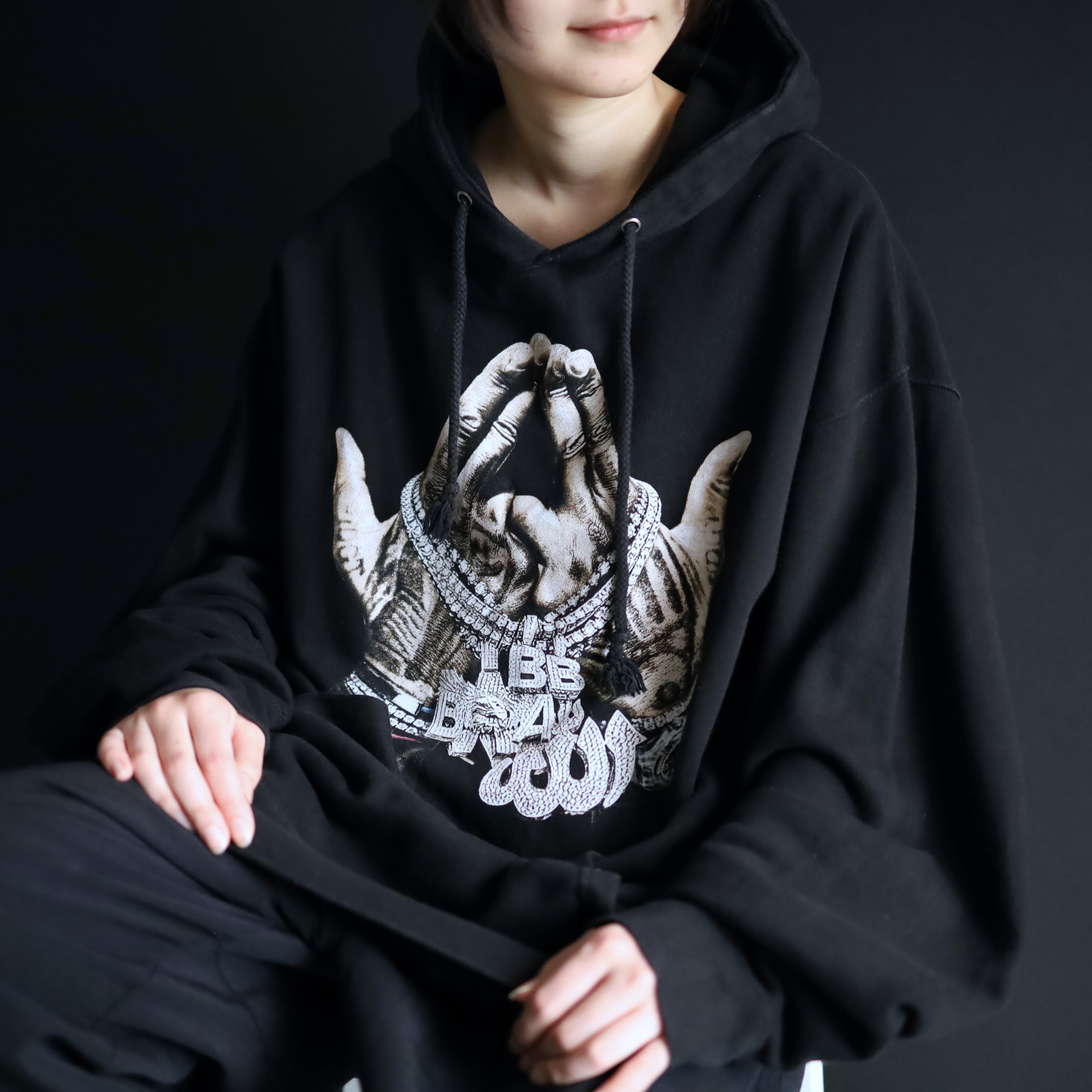 フロントに大きく,両の小指薬指を組んだ,アクセサリージャラジャラの手首から先のプリント.
