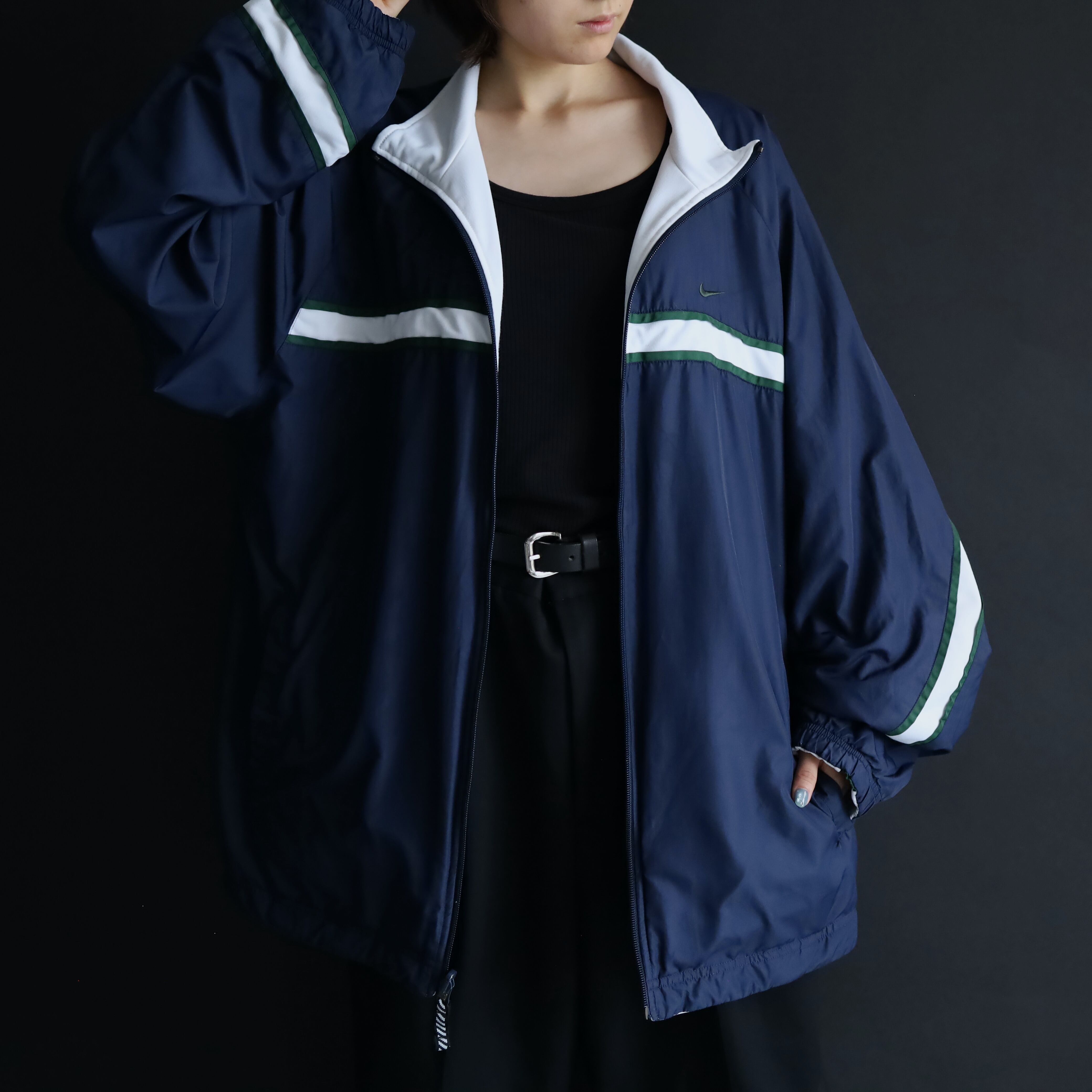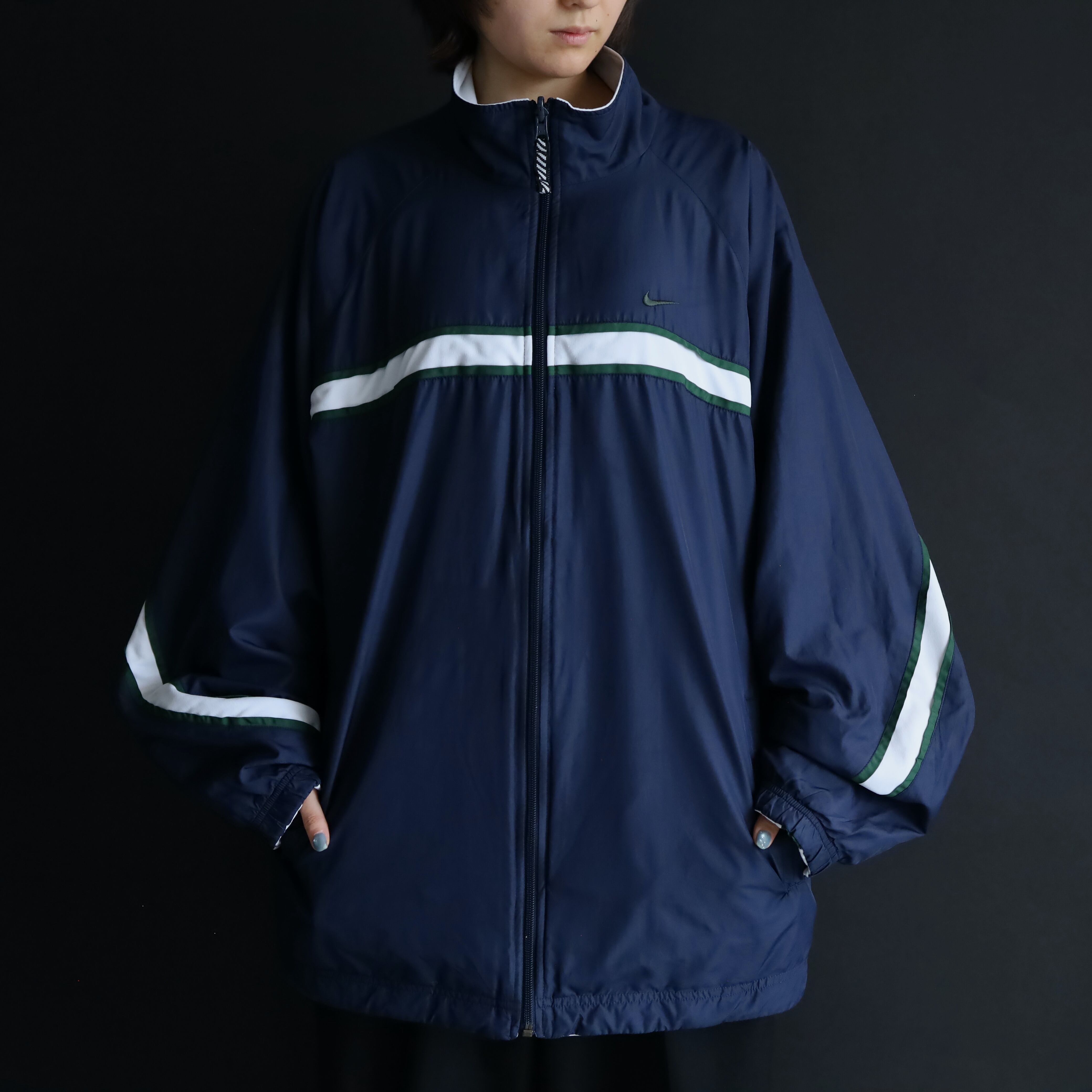 B面はネイビーベースにホワイト,グリーンラインの,ハリツヤのあるポリエステル生地のブルゾンタイプ.