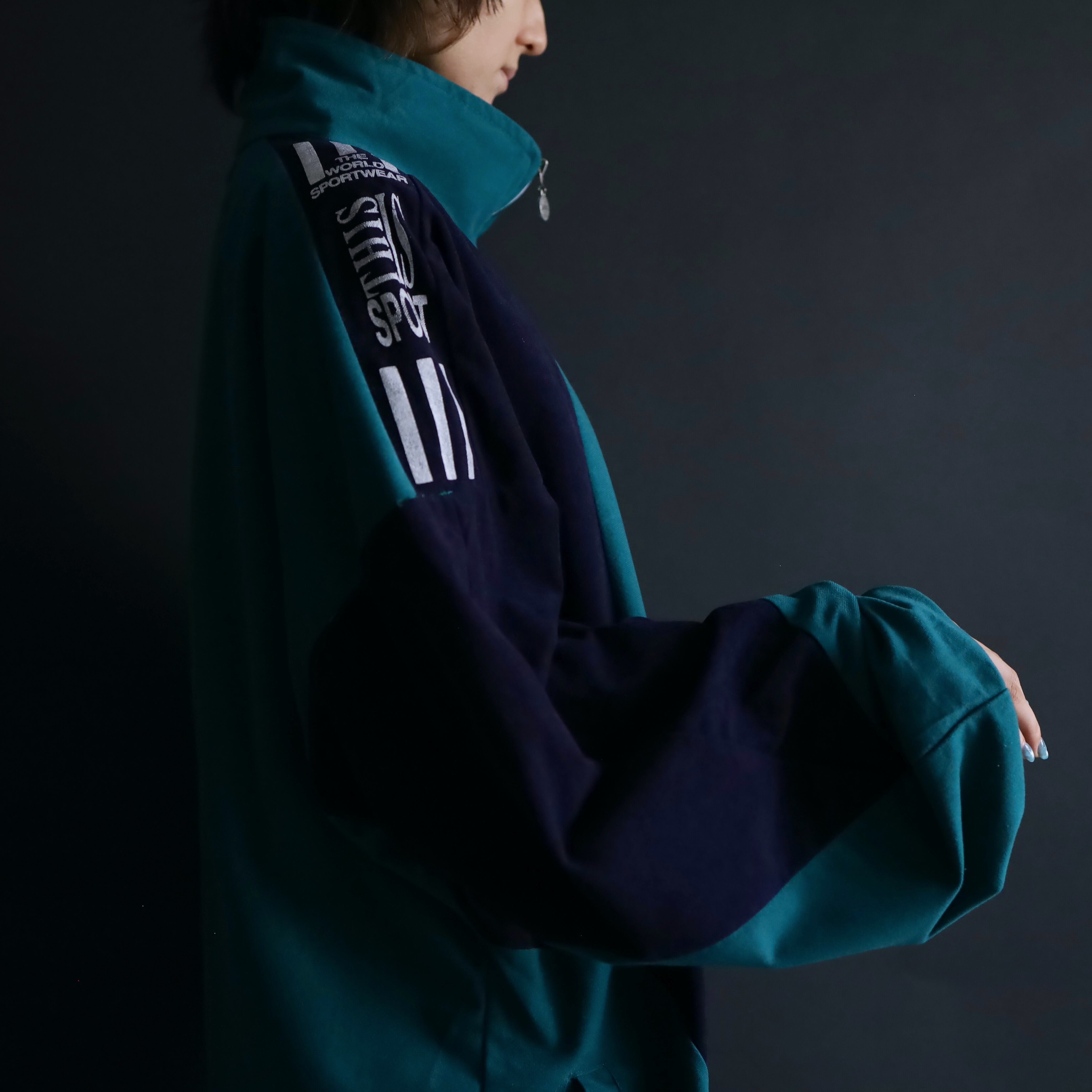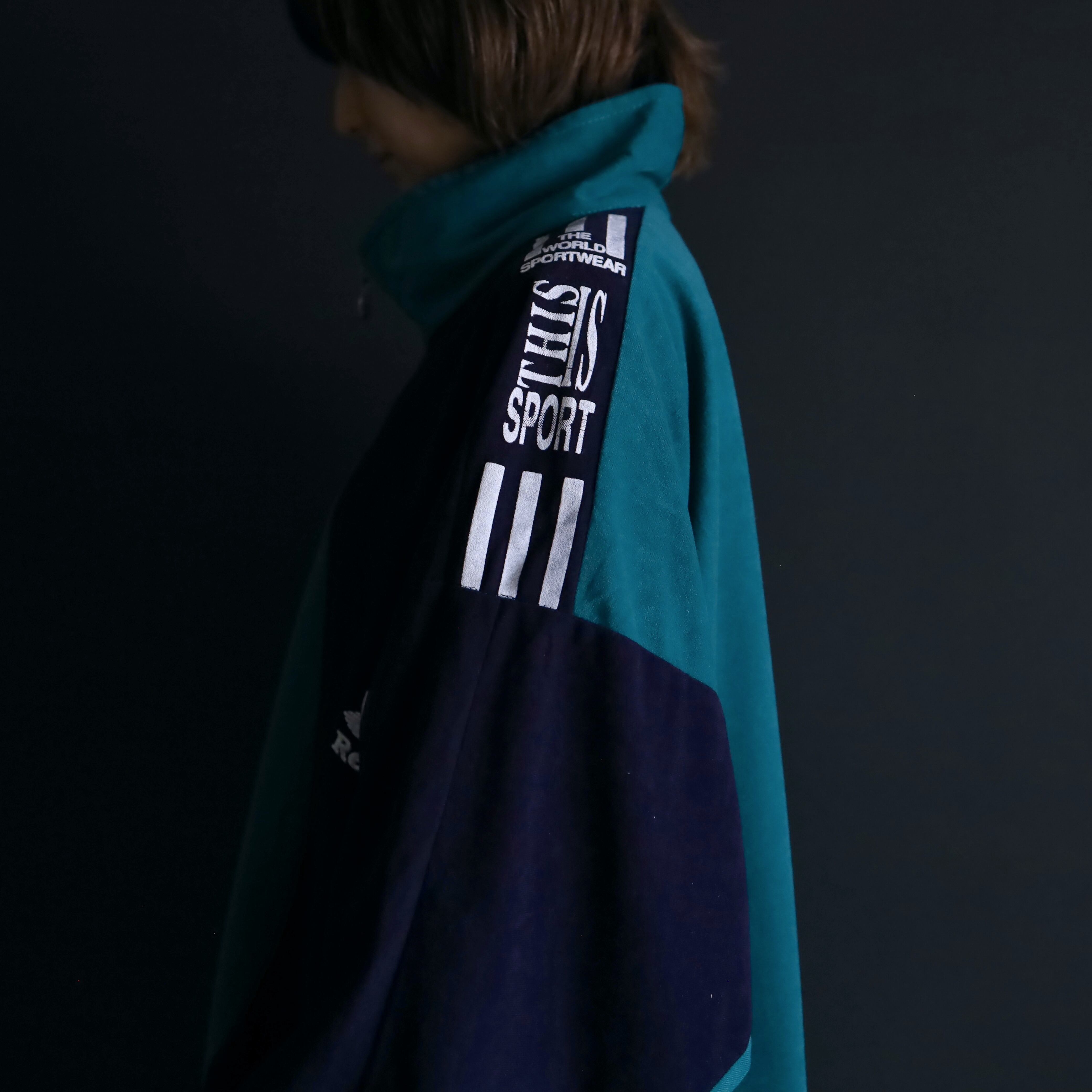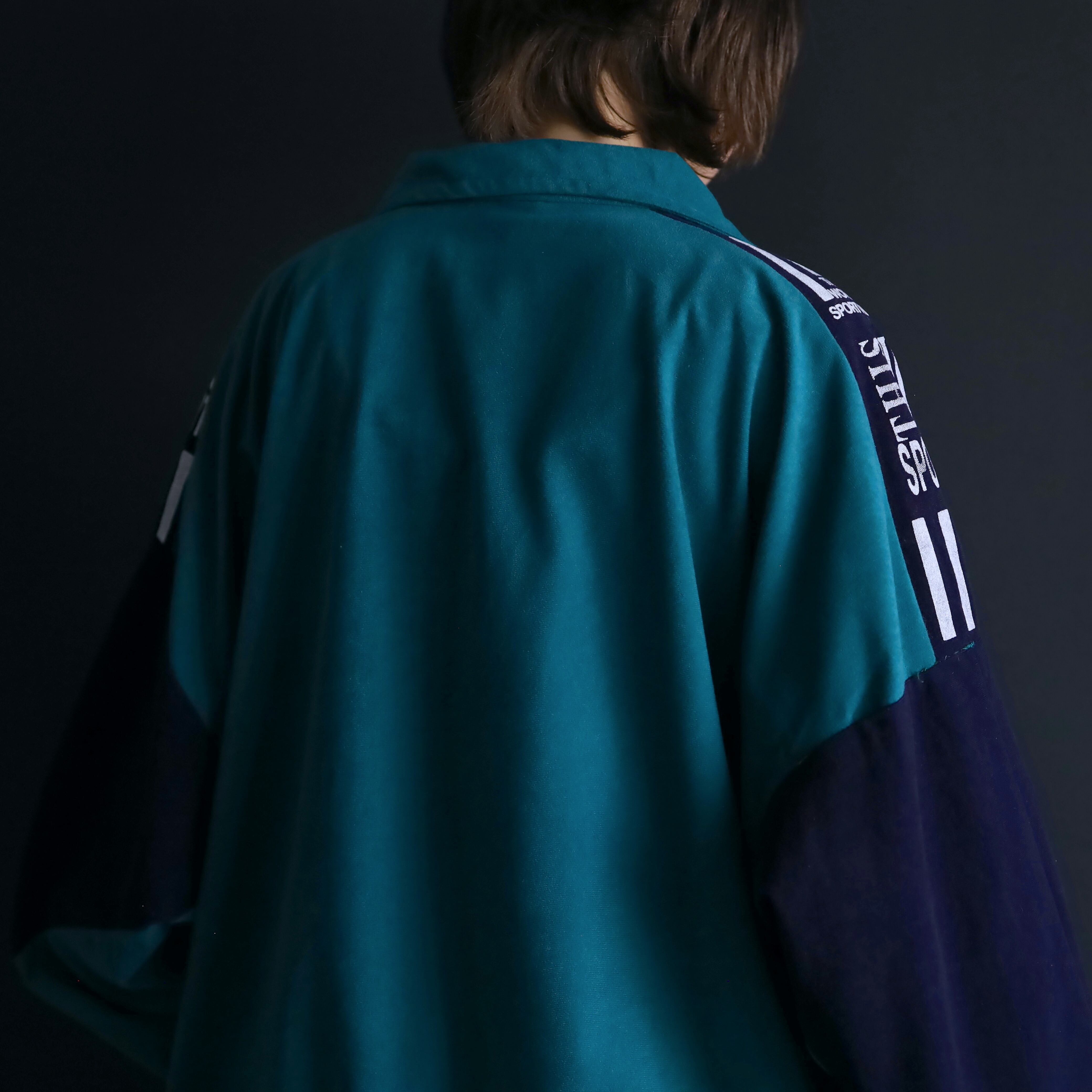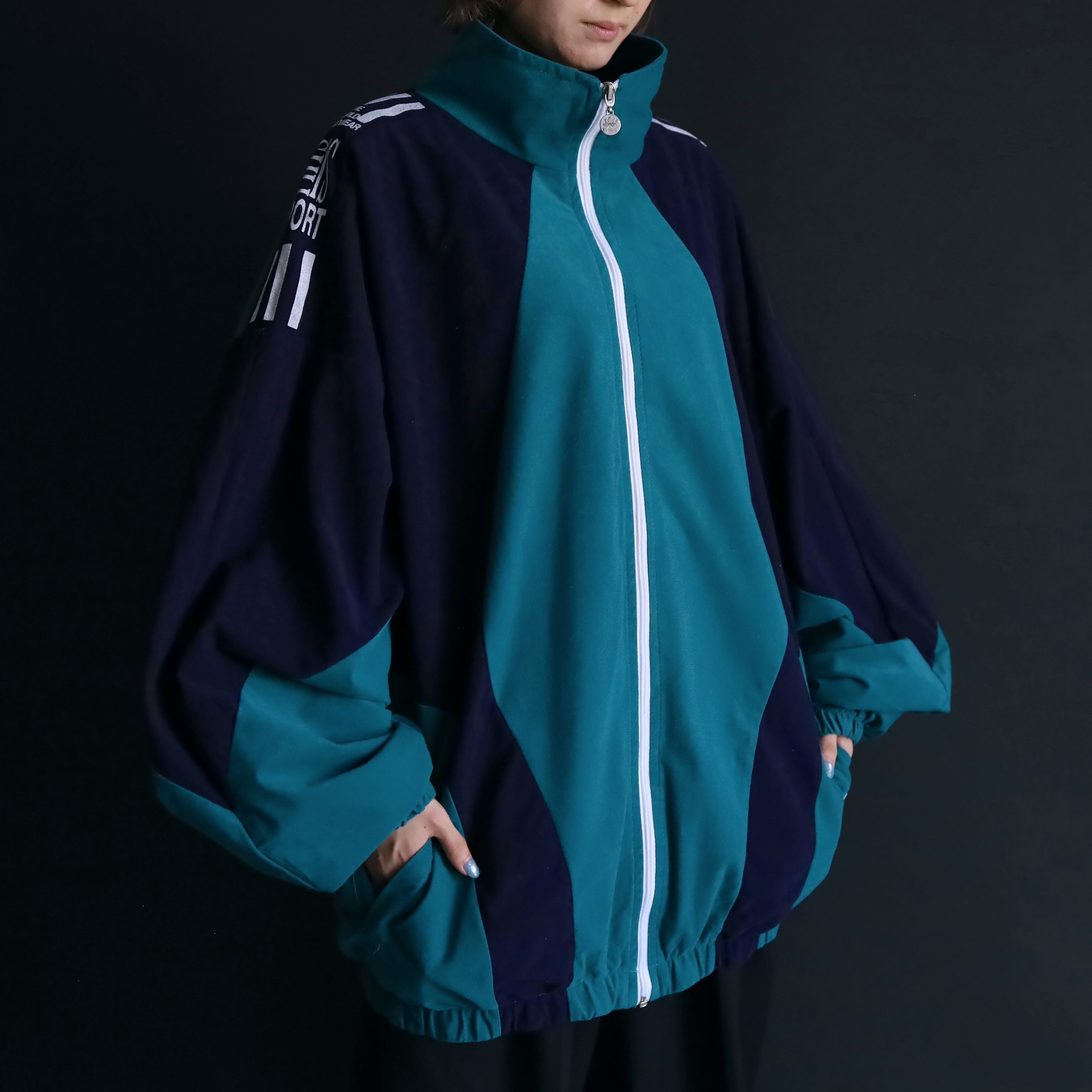 ターコイズグリーン×ネイビーのバイカラー切替に加えて,肩や胸にホワイトでラインやロゴの入ったデザイン.