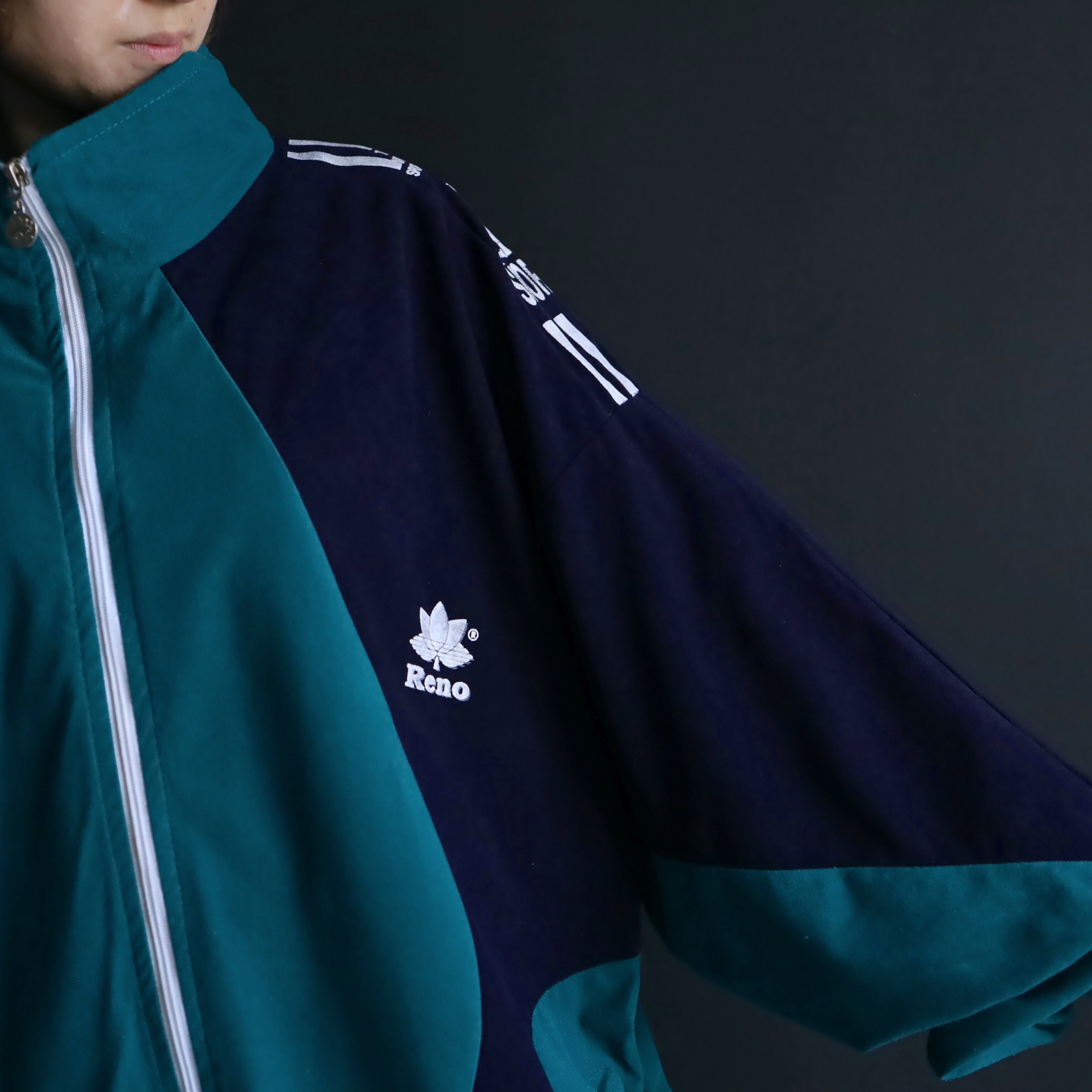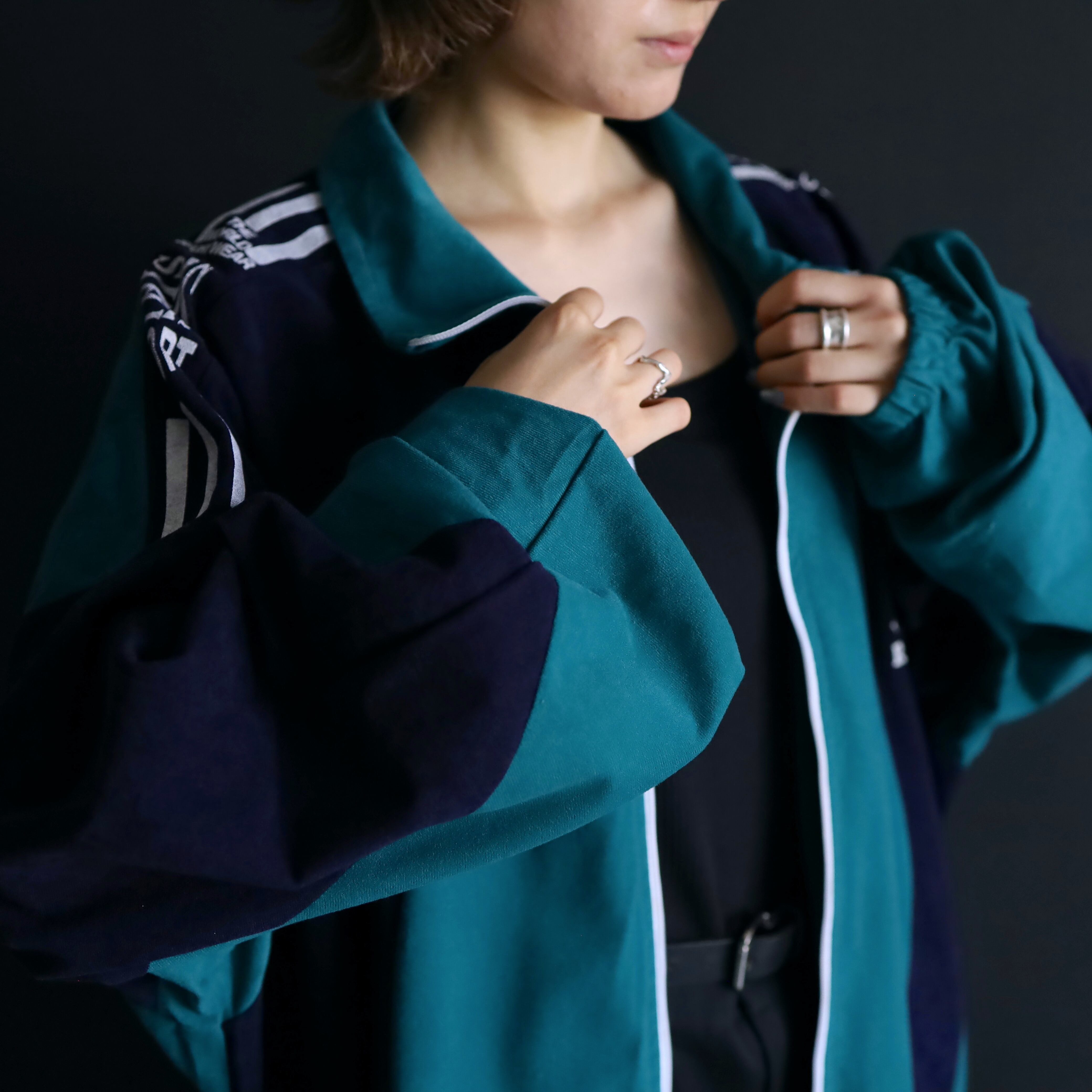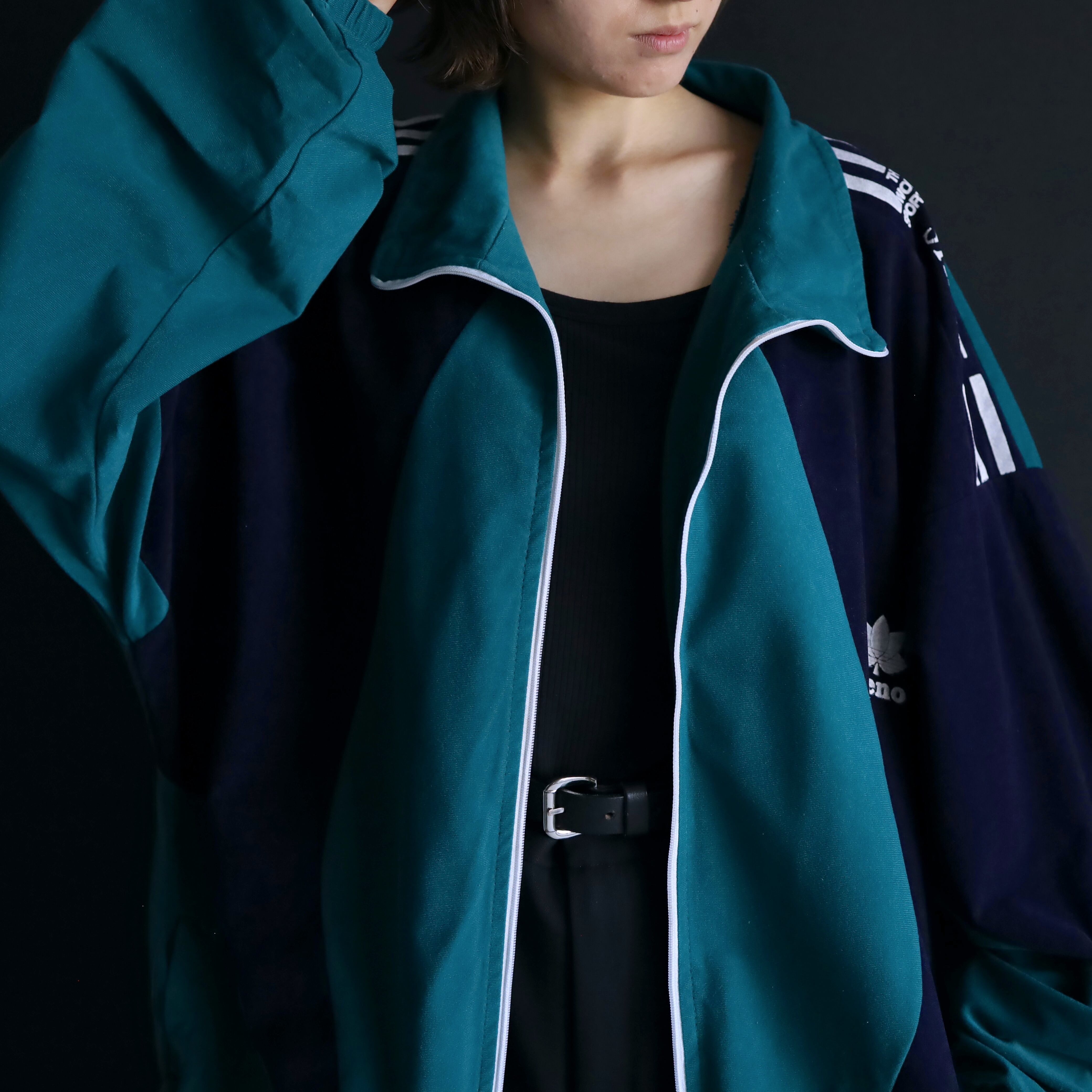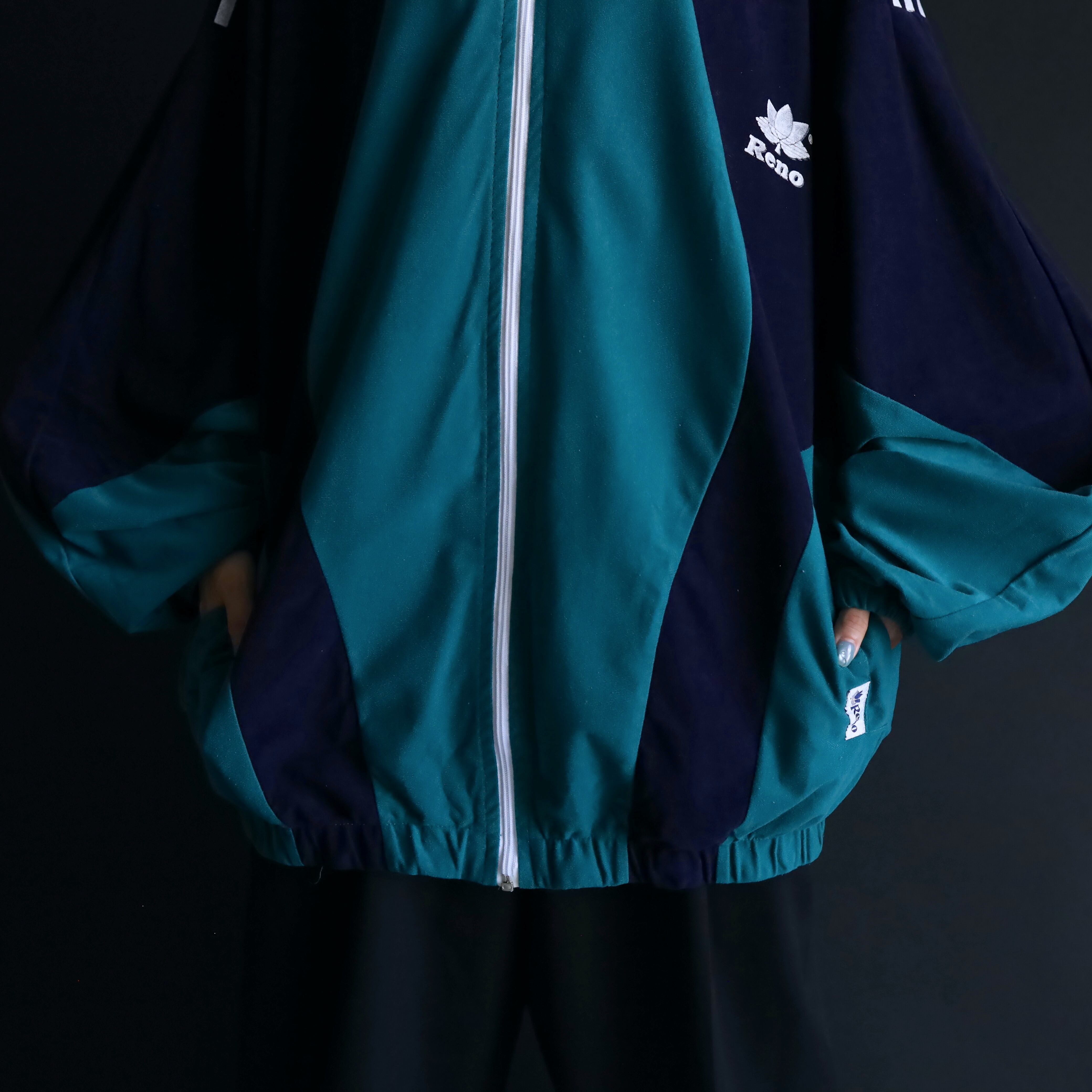 ターコイズグリーン×ネイビーのバイカラー切替に加えて,肩や胸にホワイトでラインやロゴの入ったデザイン.