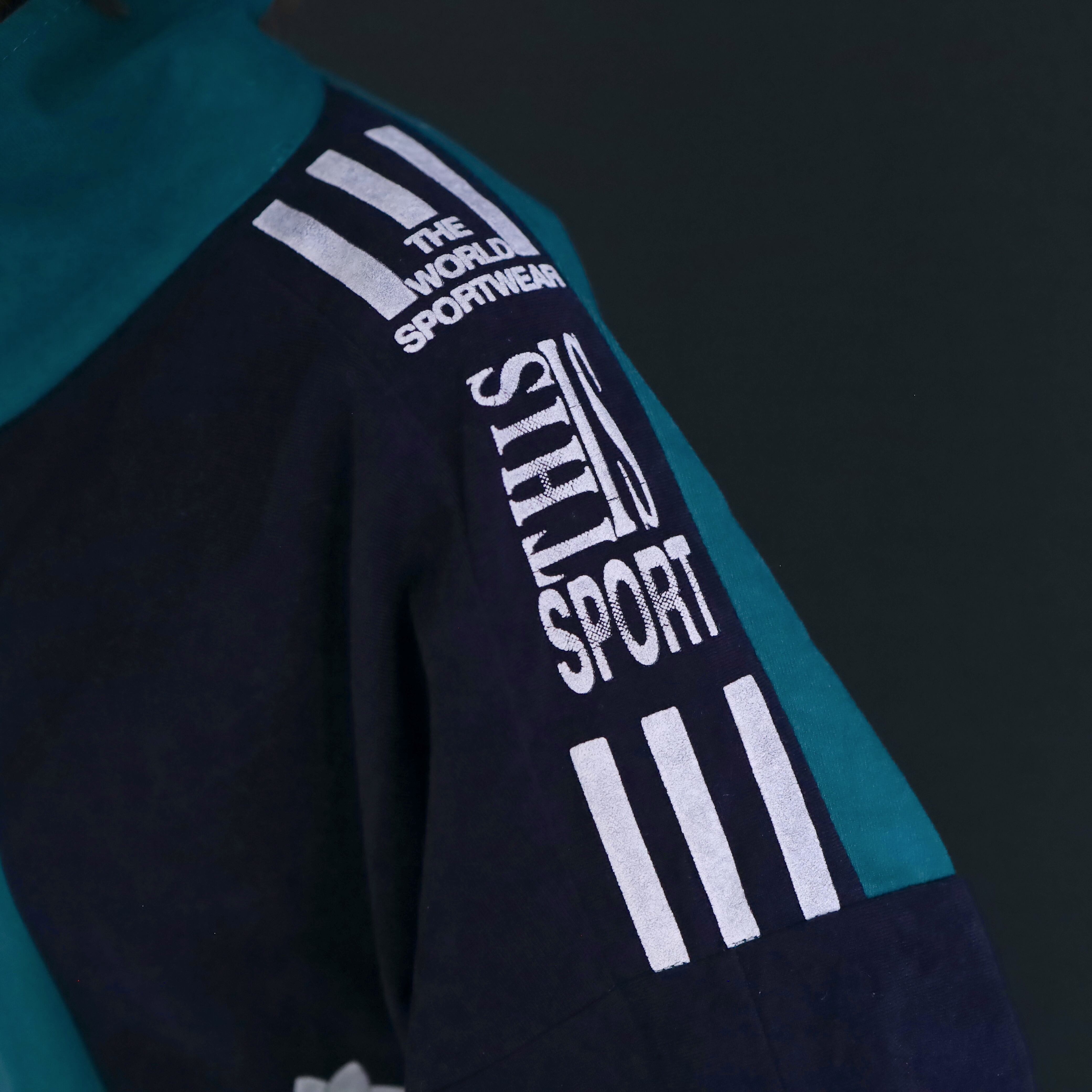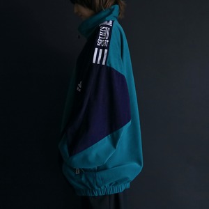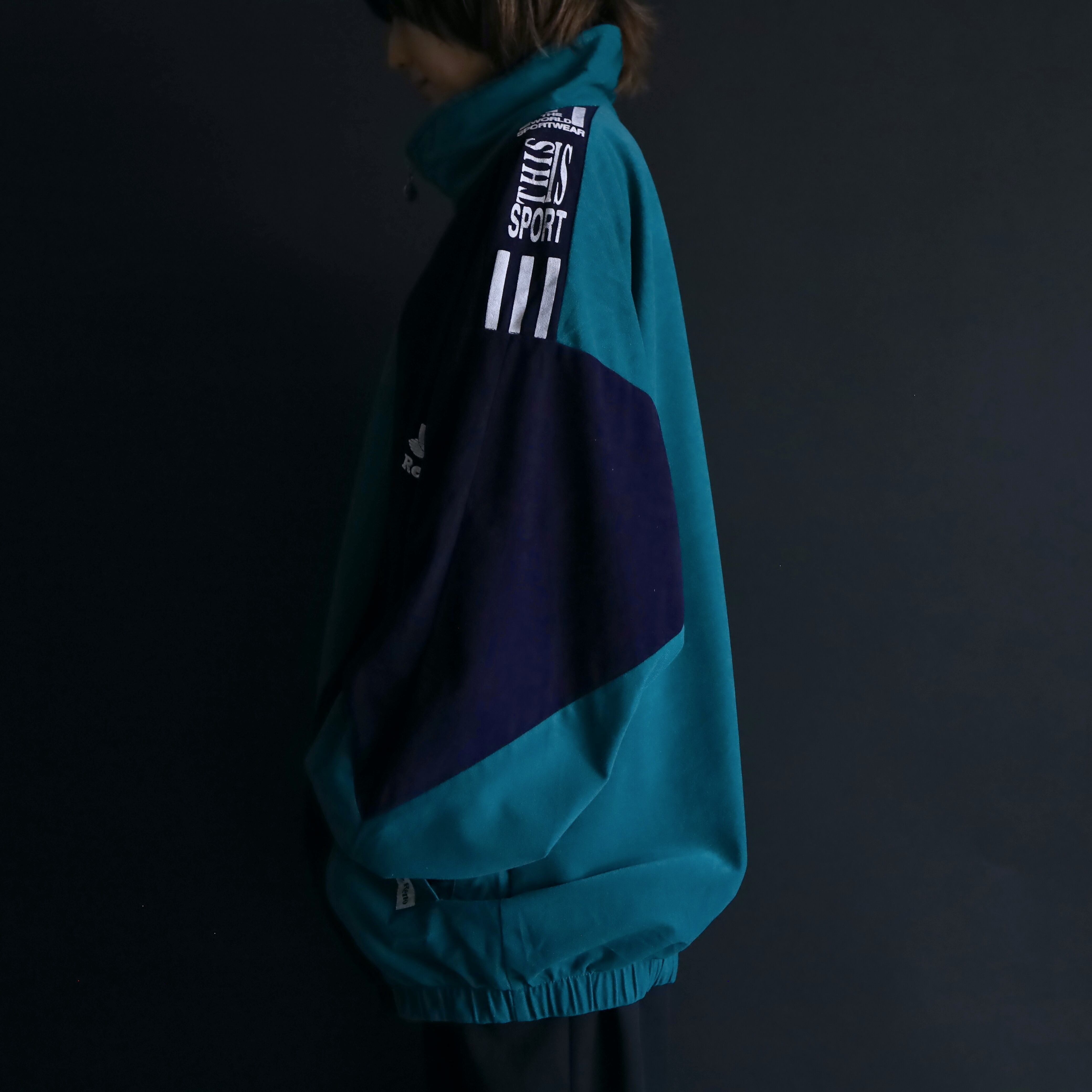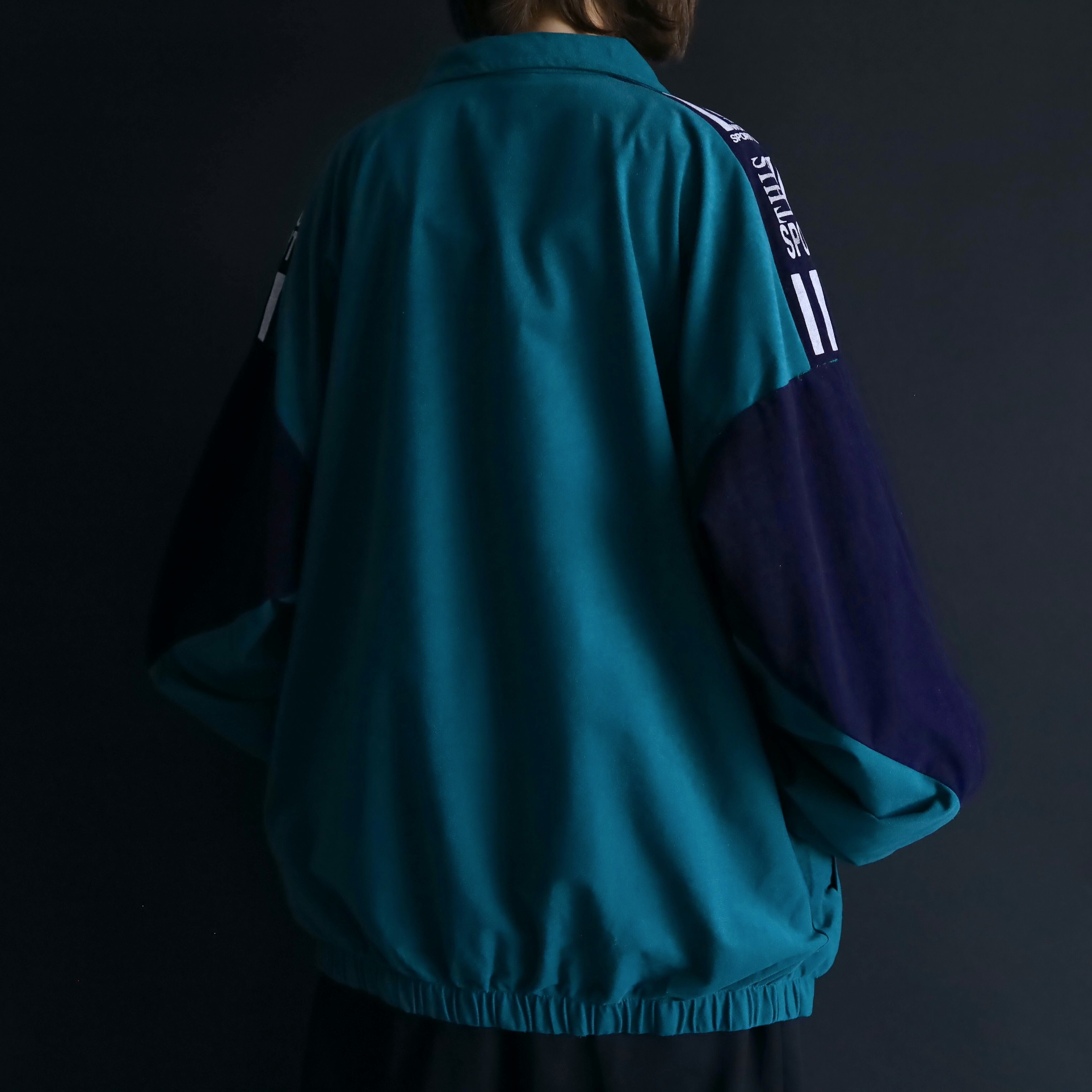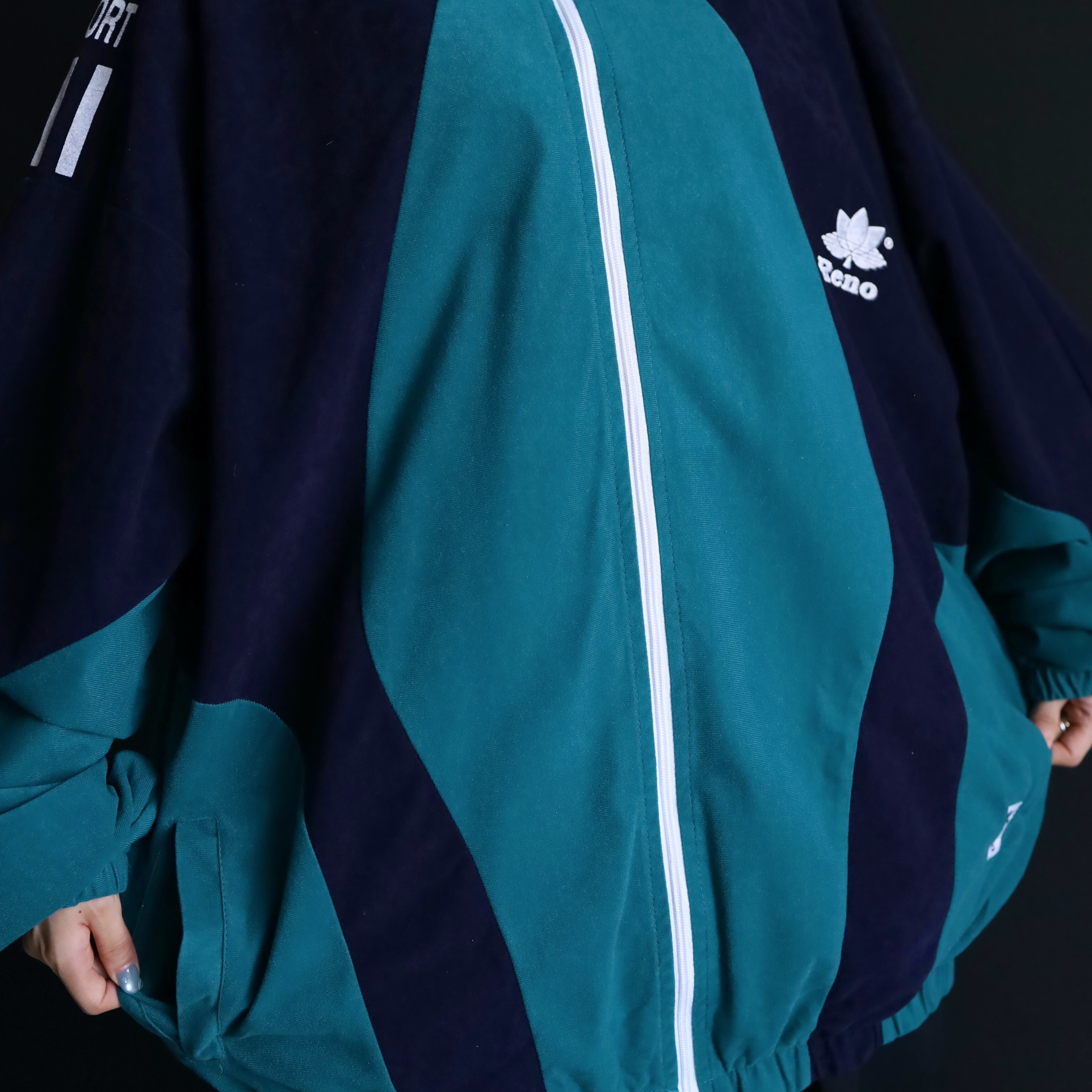 ターコイズグリーン×ネイビーのバイカラー切替に加えて,肩や胸にホワイトでラインやロゴの入ったデザイン.