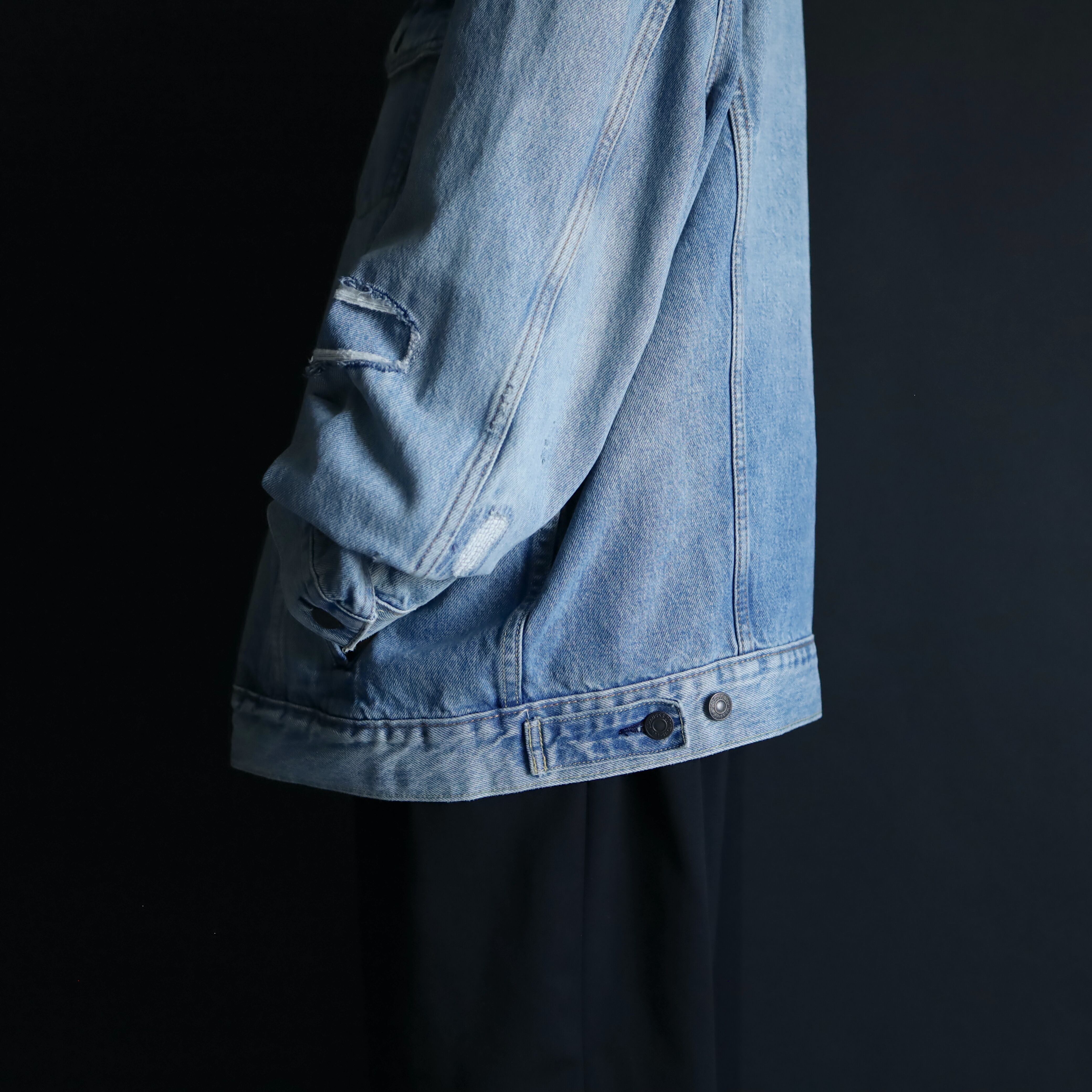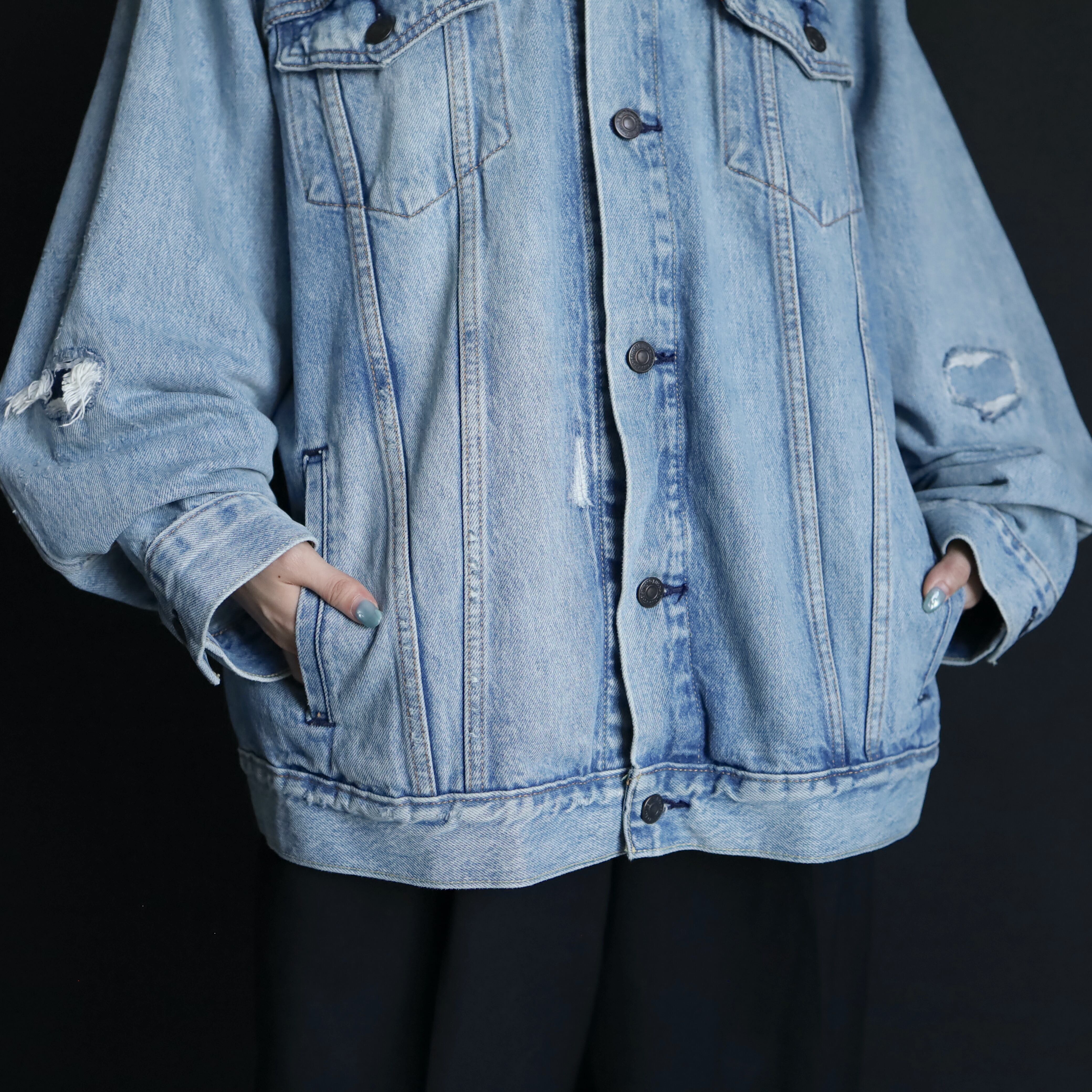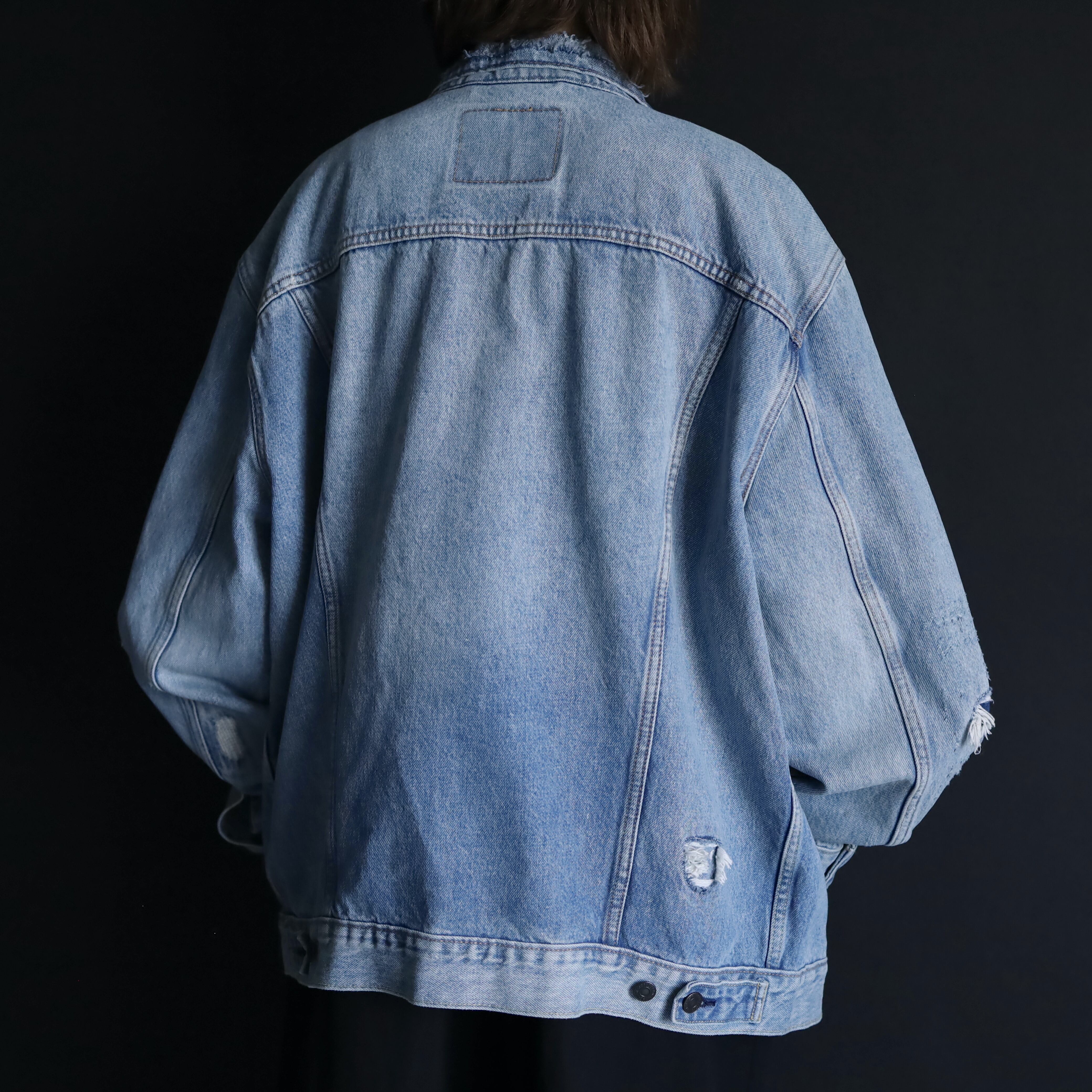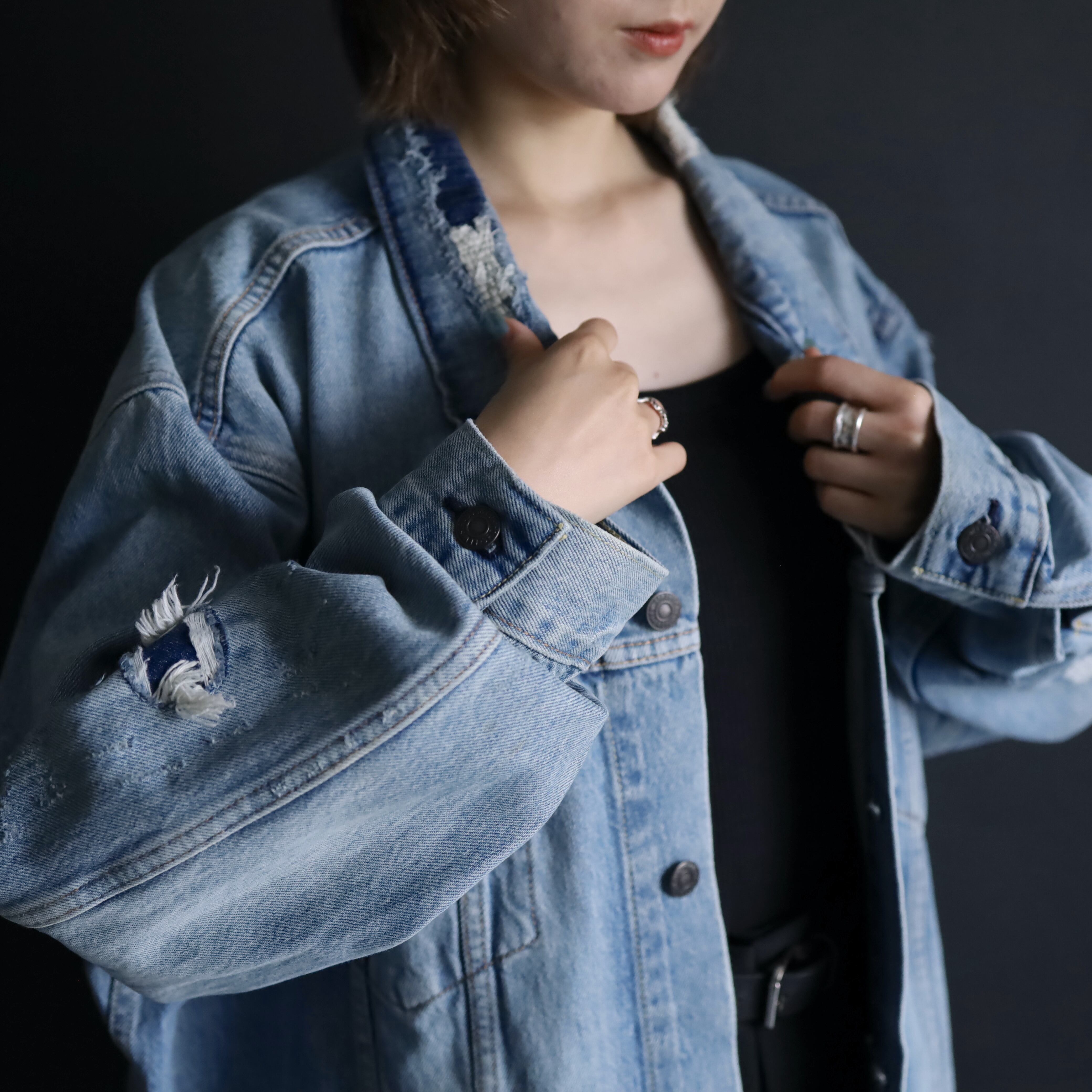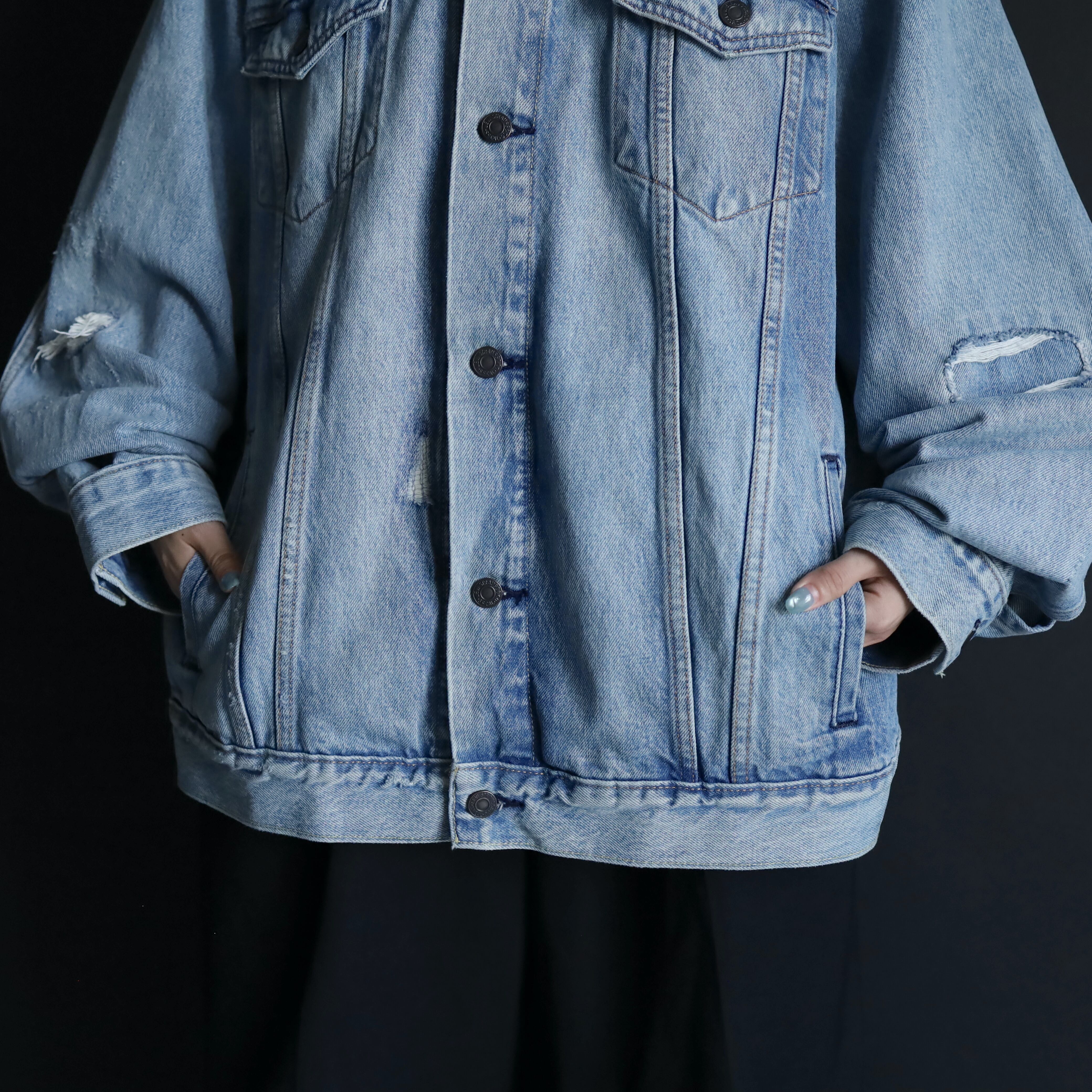 クラッシュ&リペア加工のビッグデニムジャケット.
