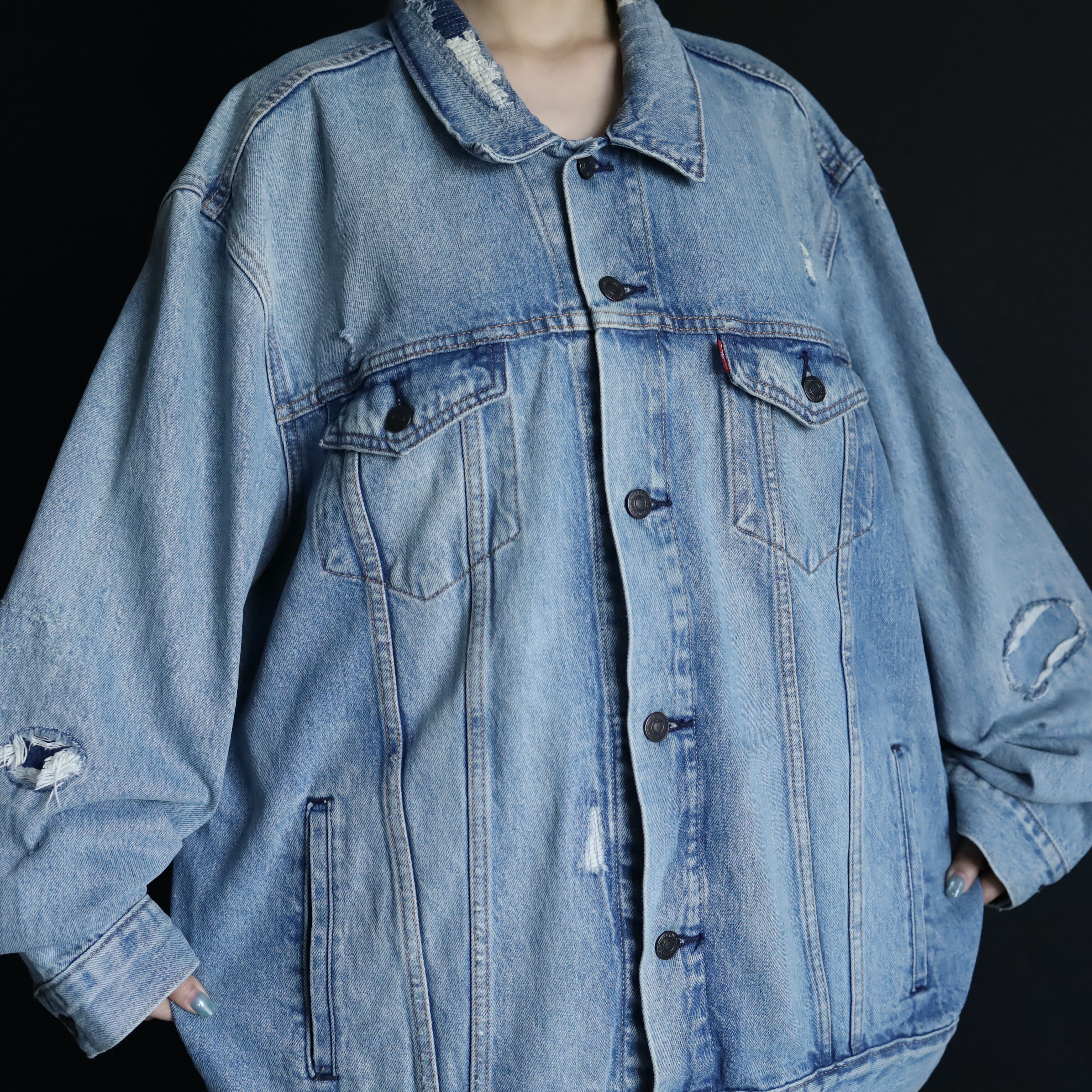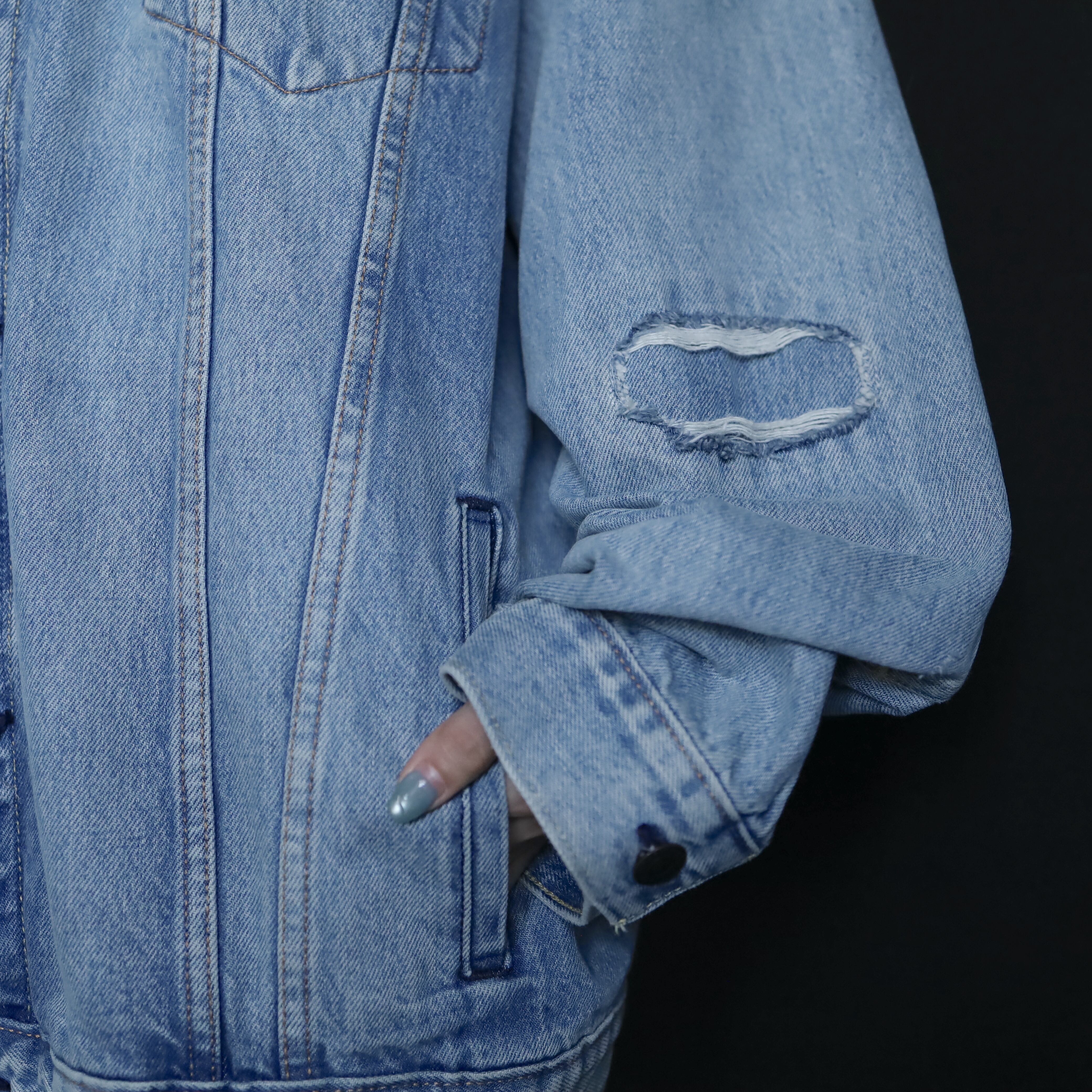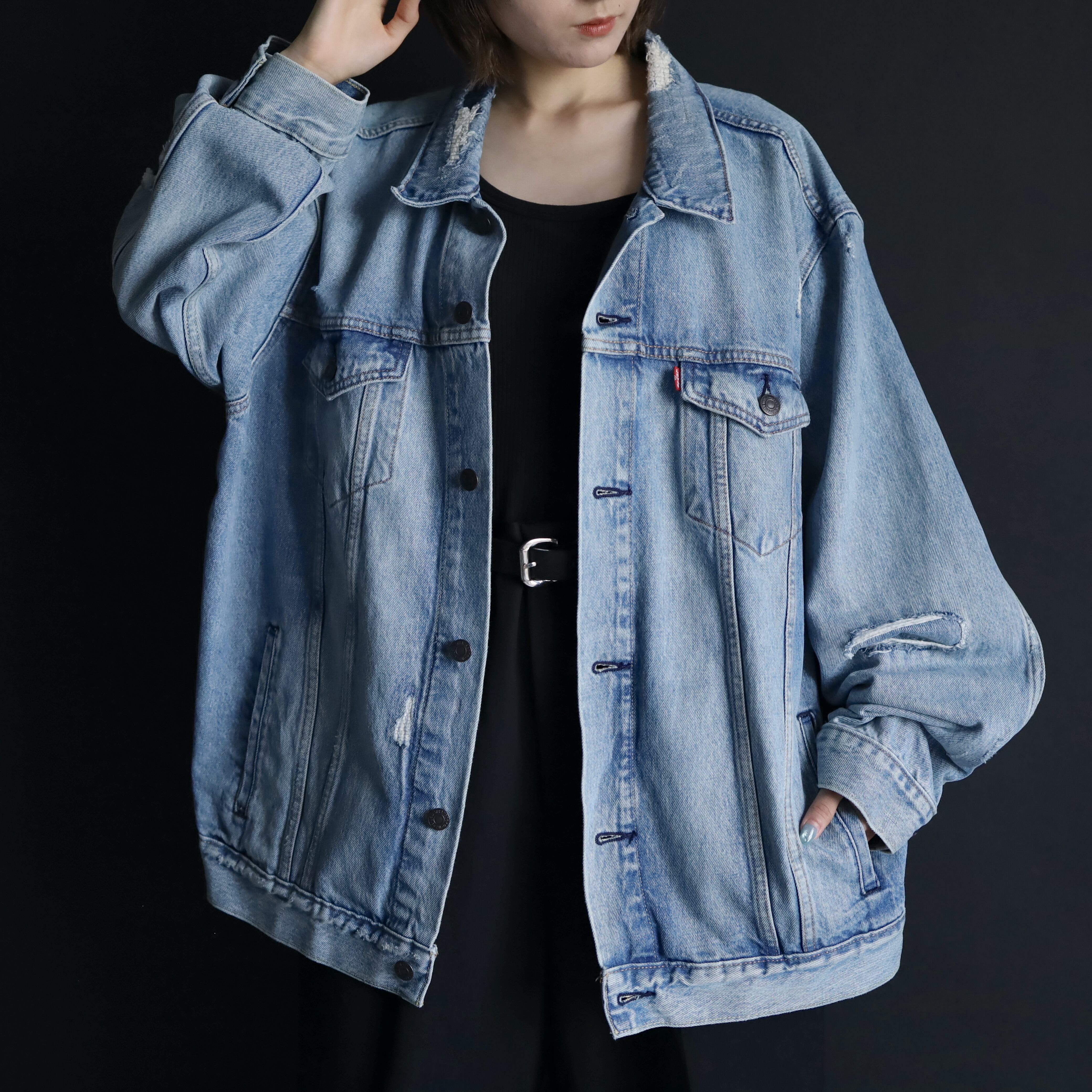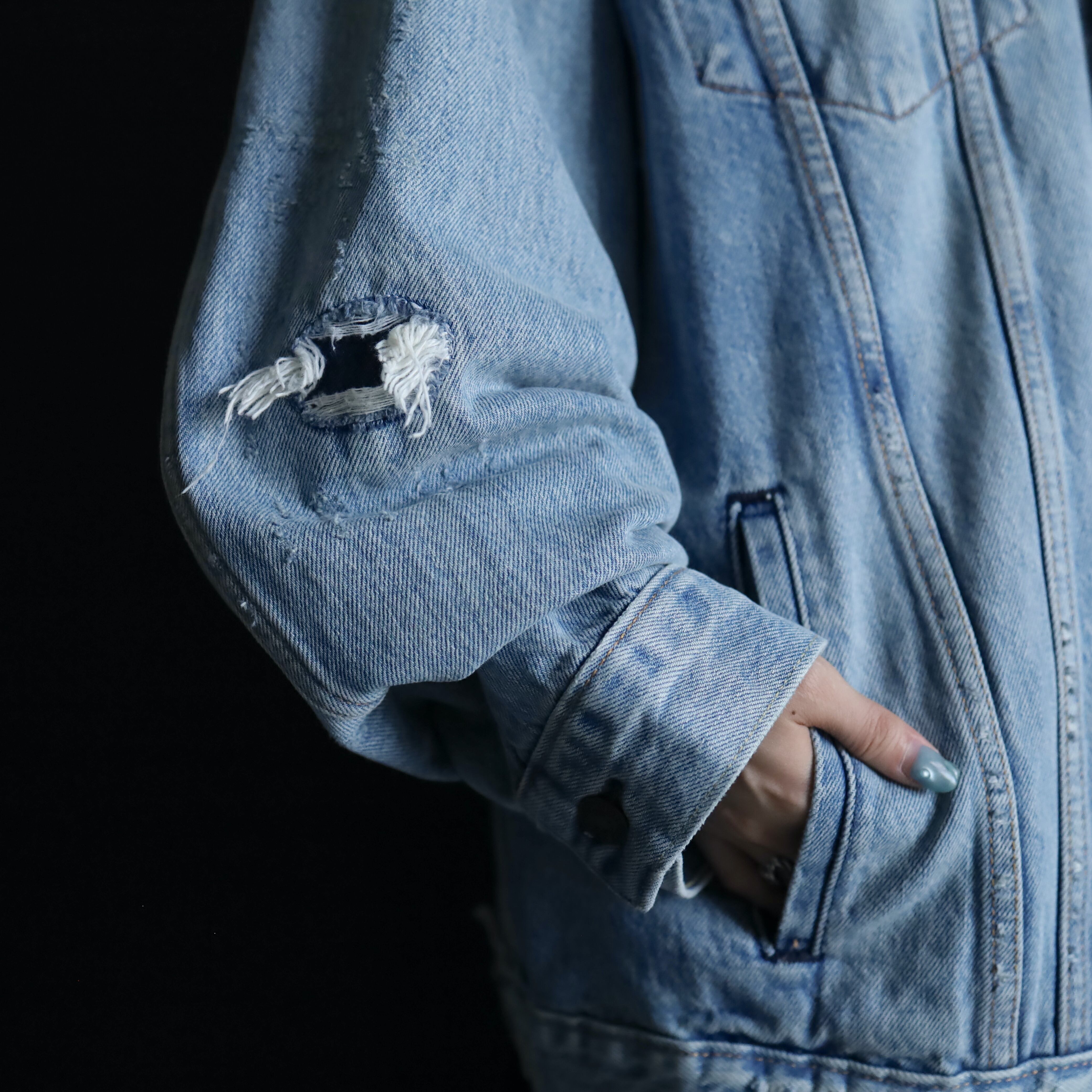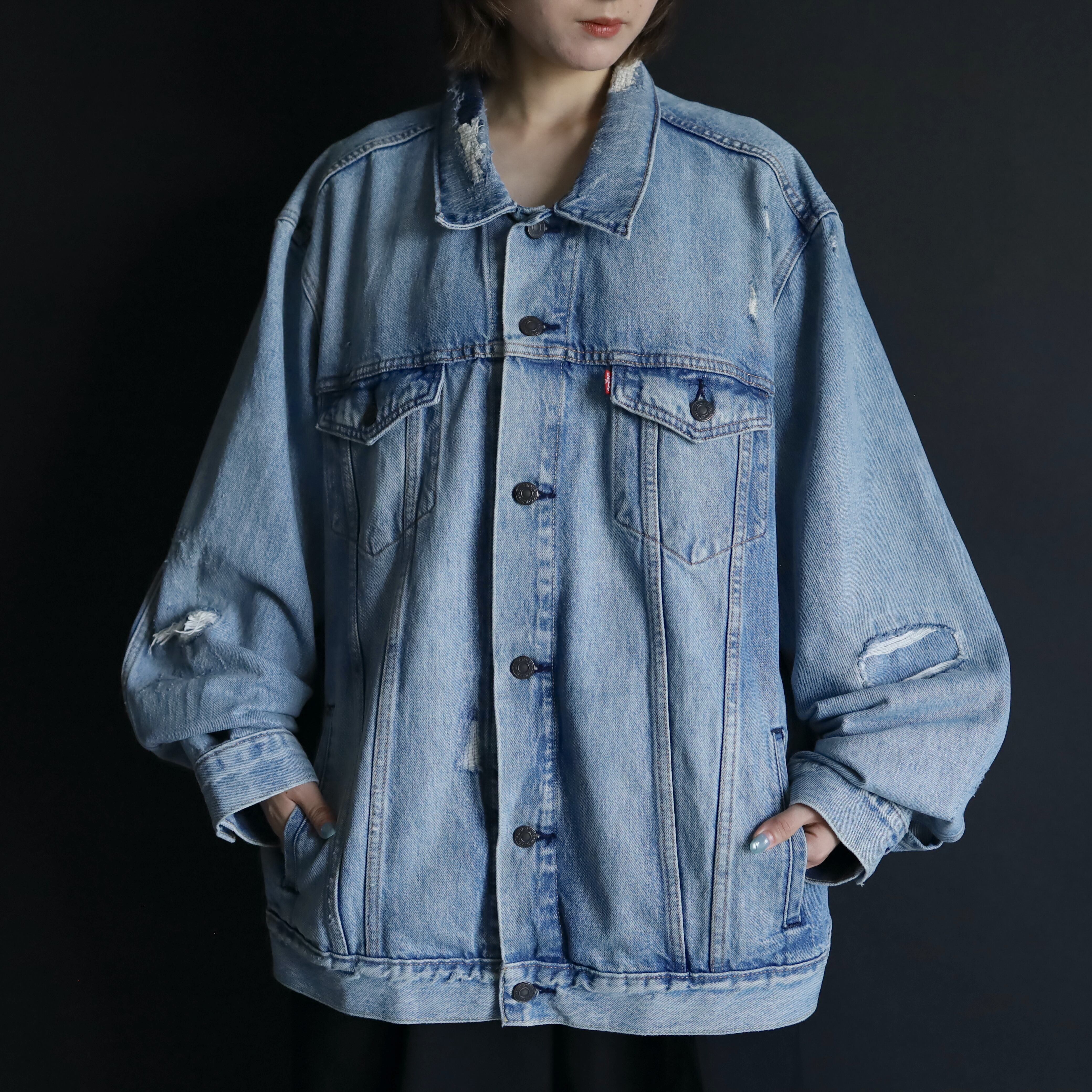 クラッシュ&リペア加工のビッグデニムジャケット.