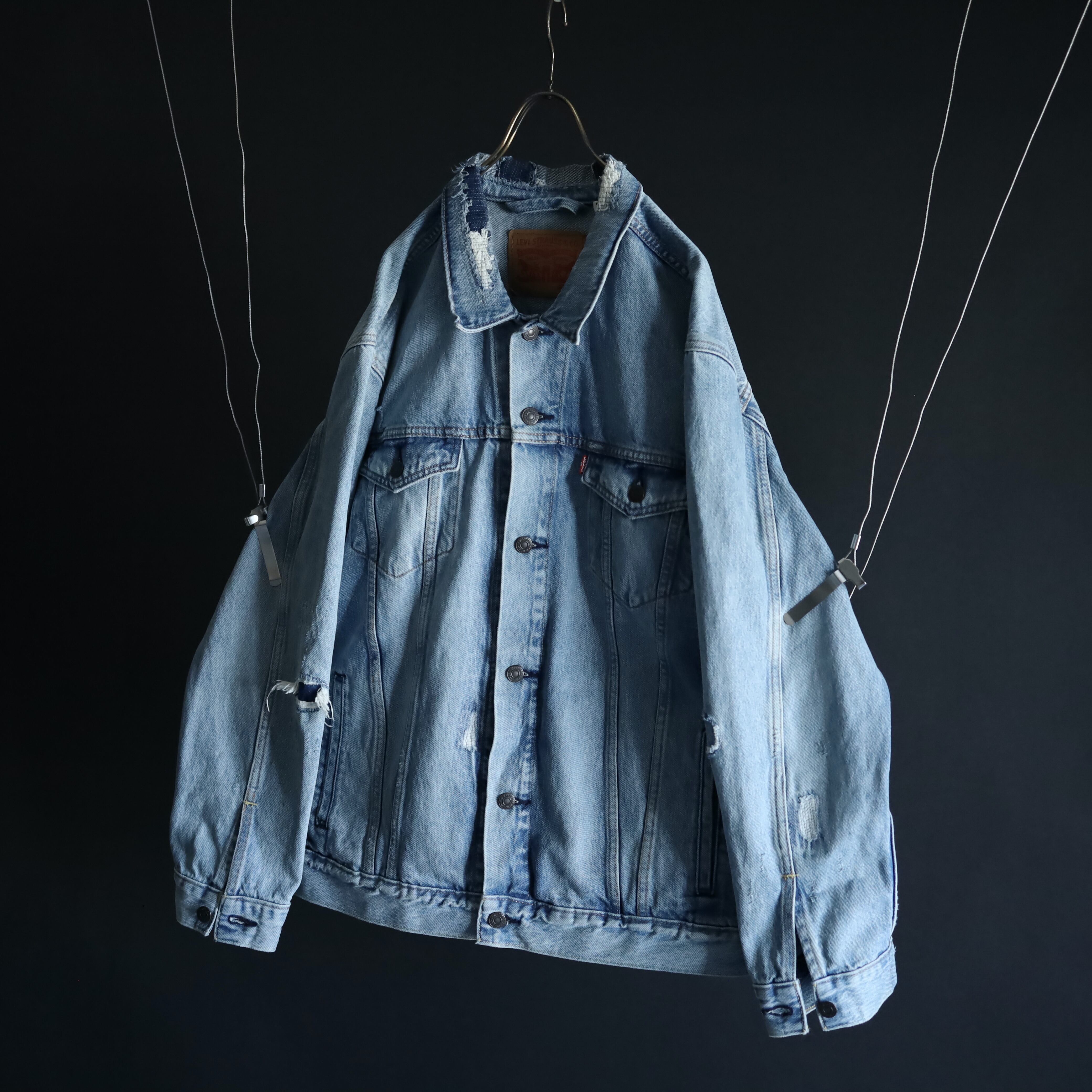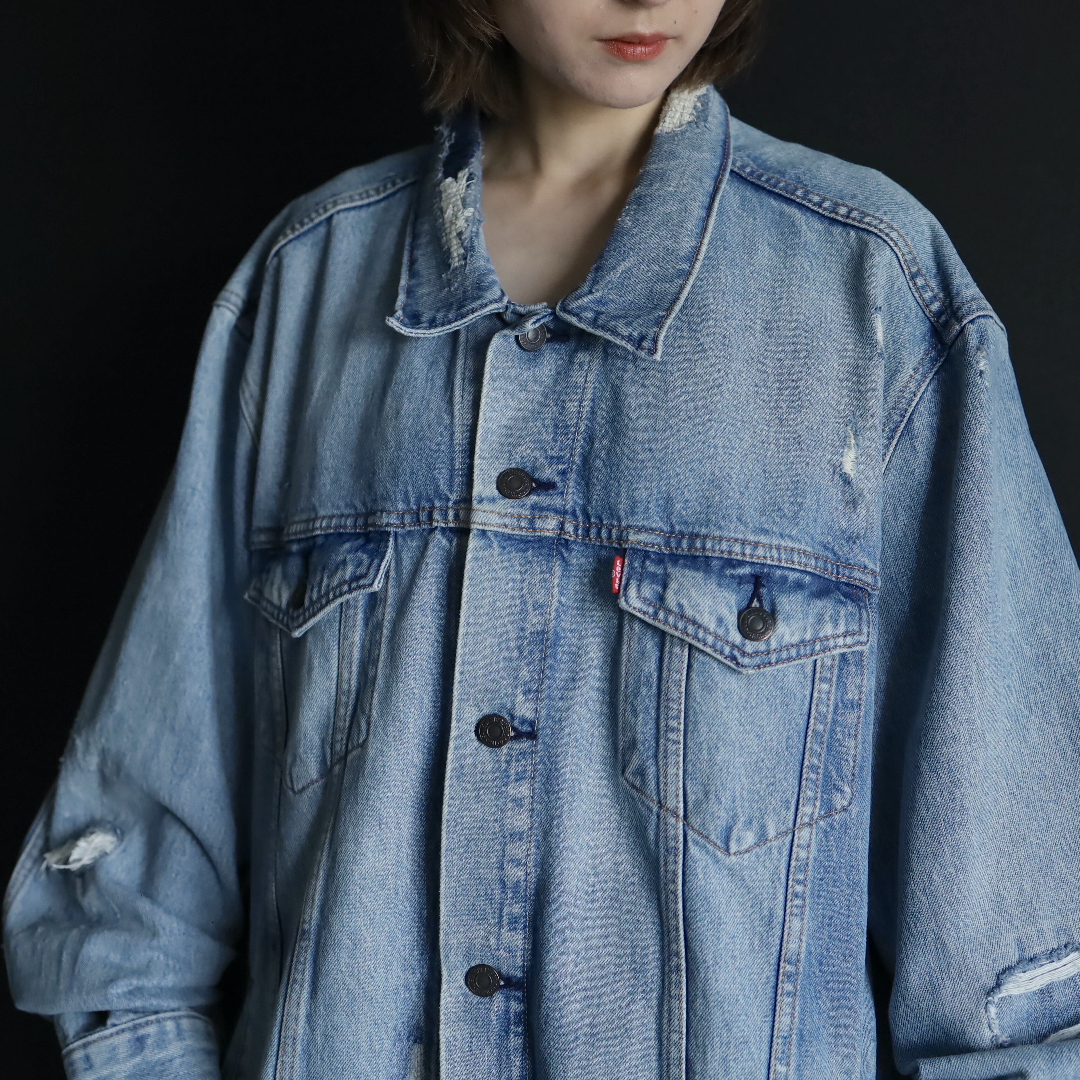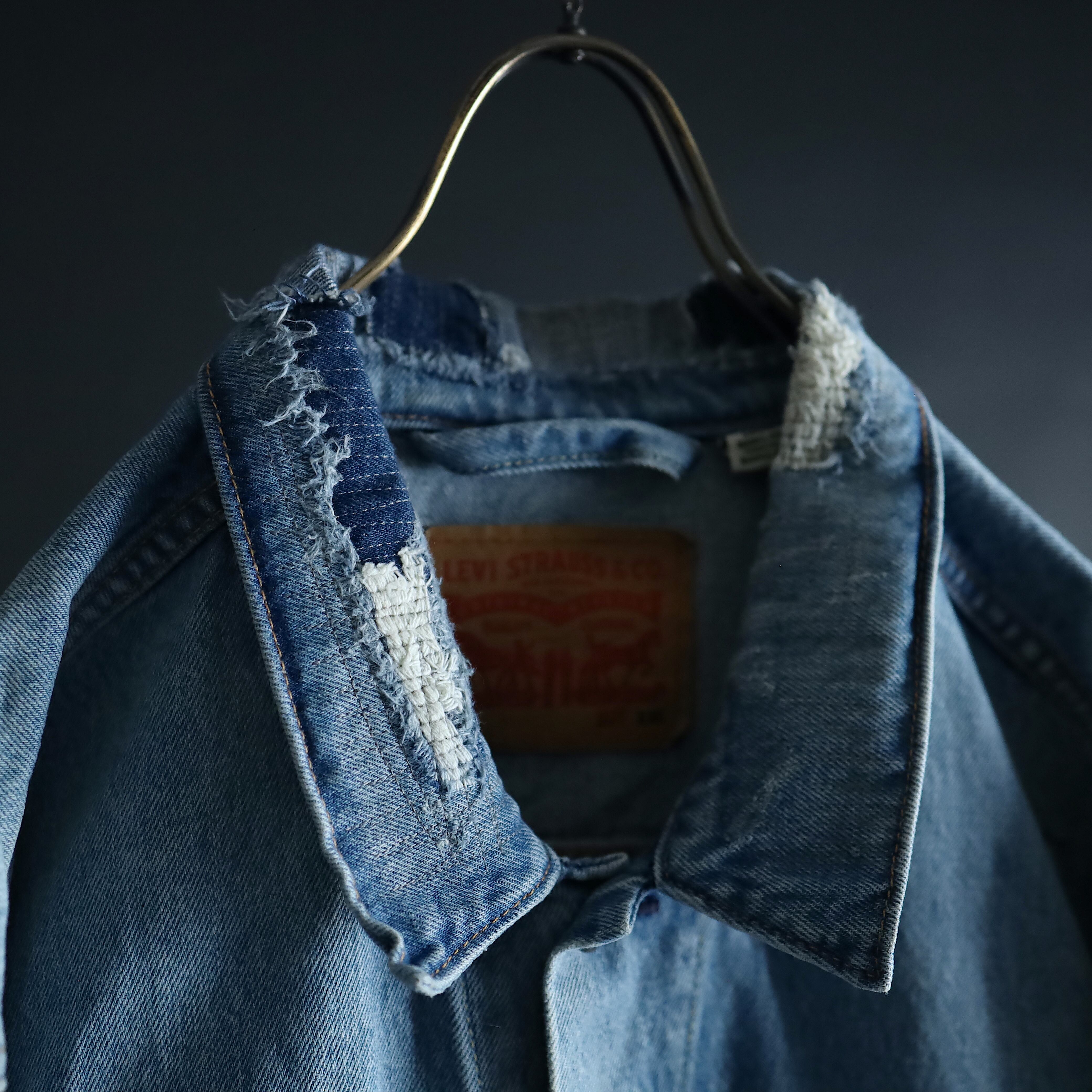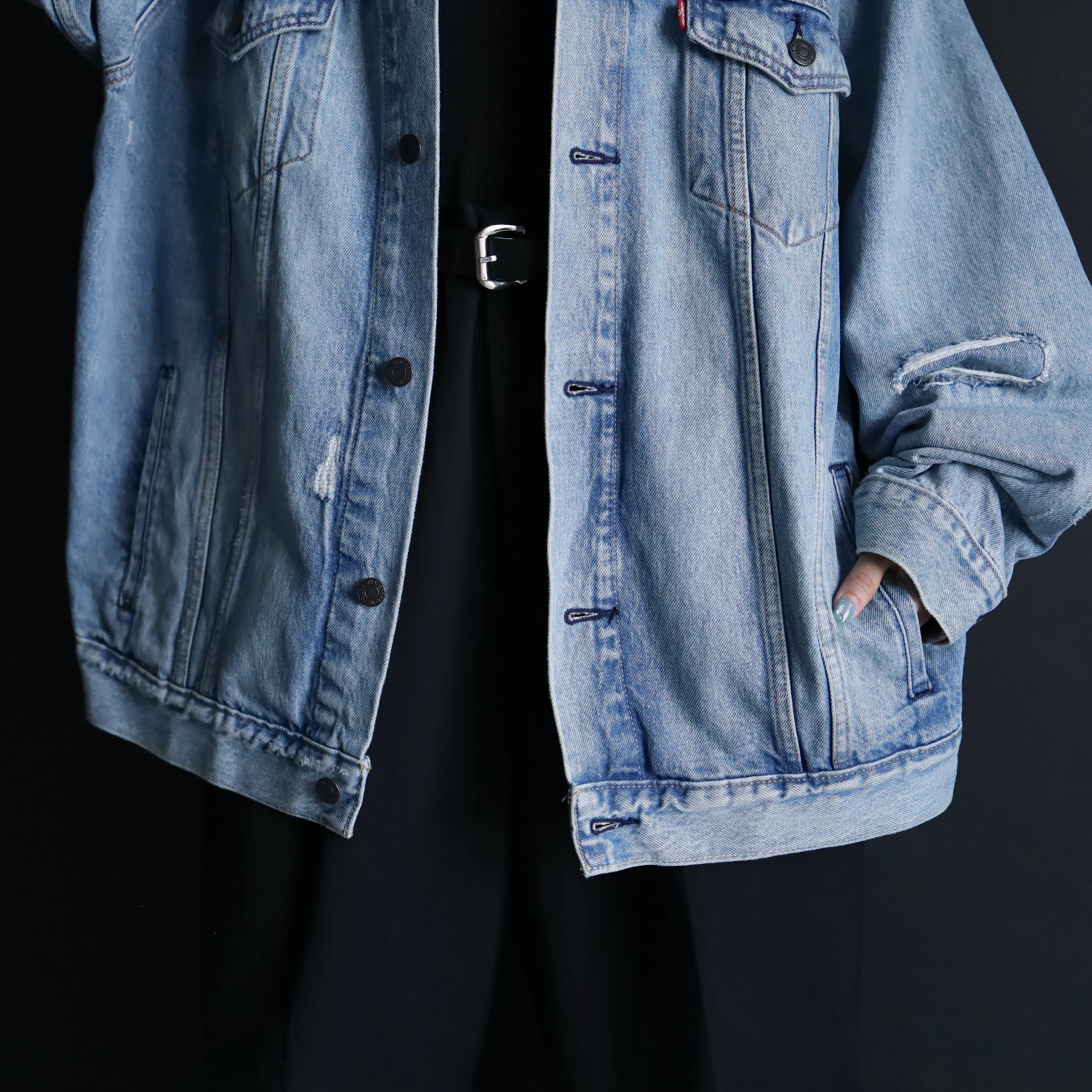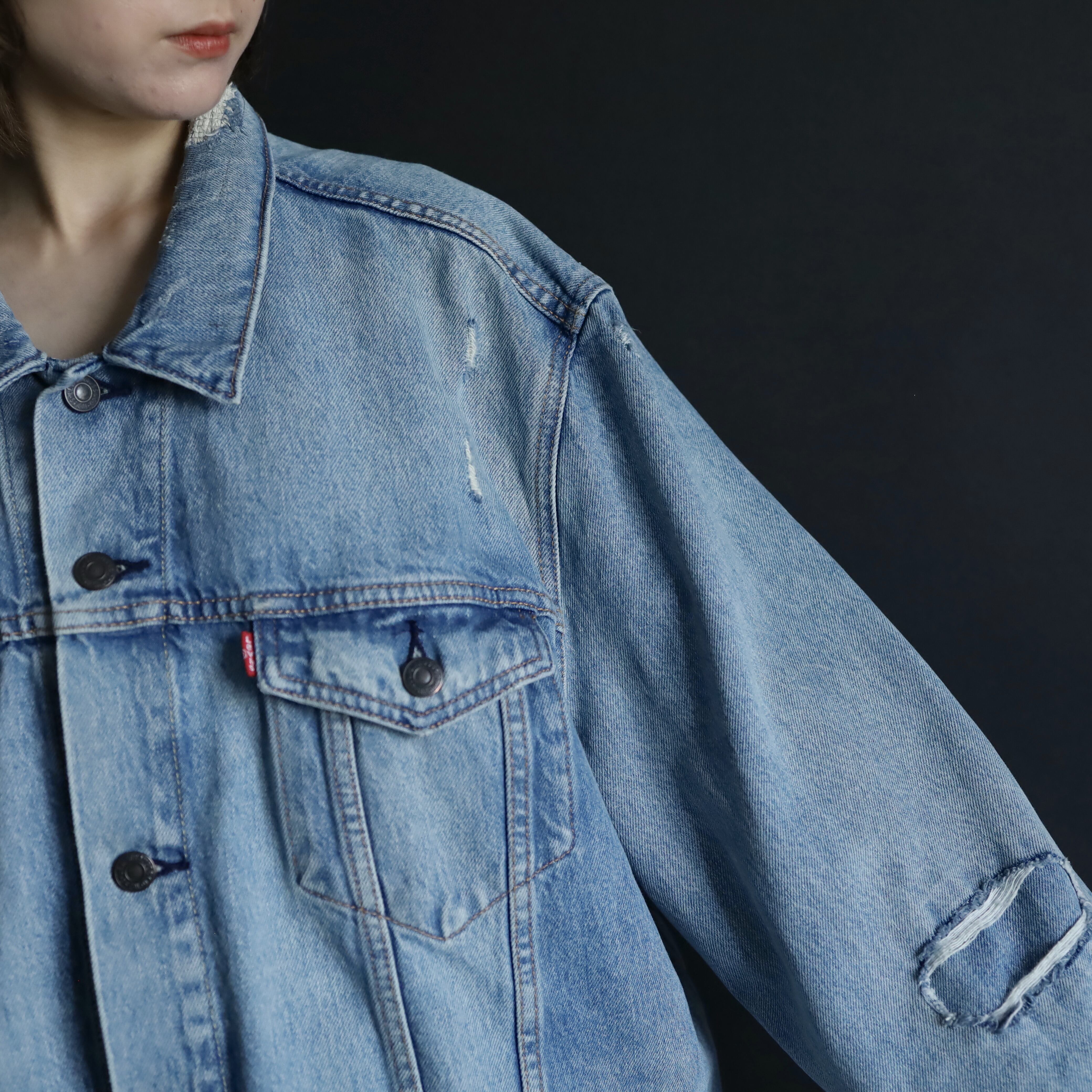 クラッシュ&リペア加工のビッグデニムジャケット.