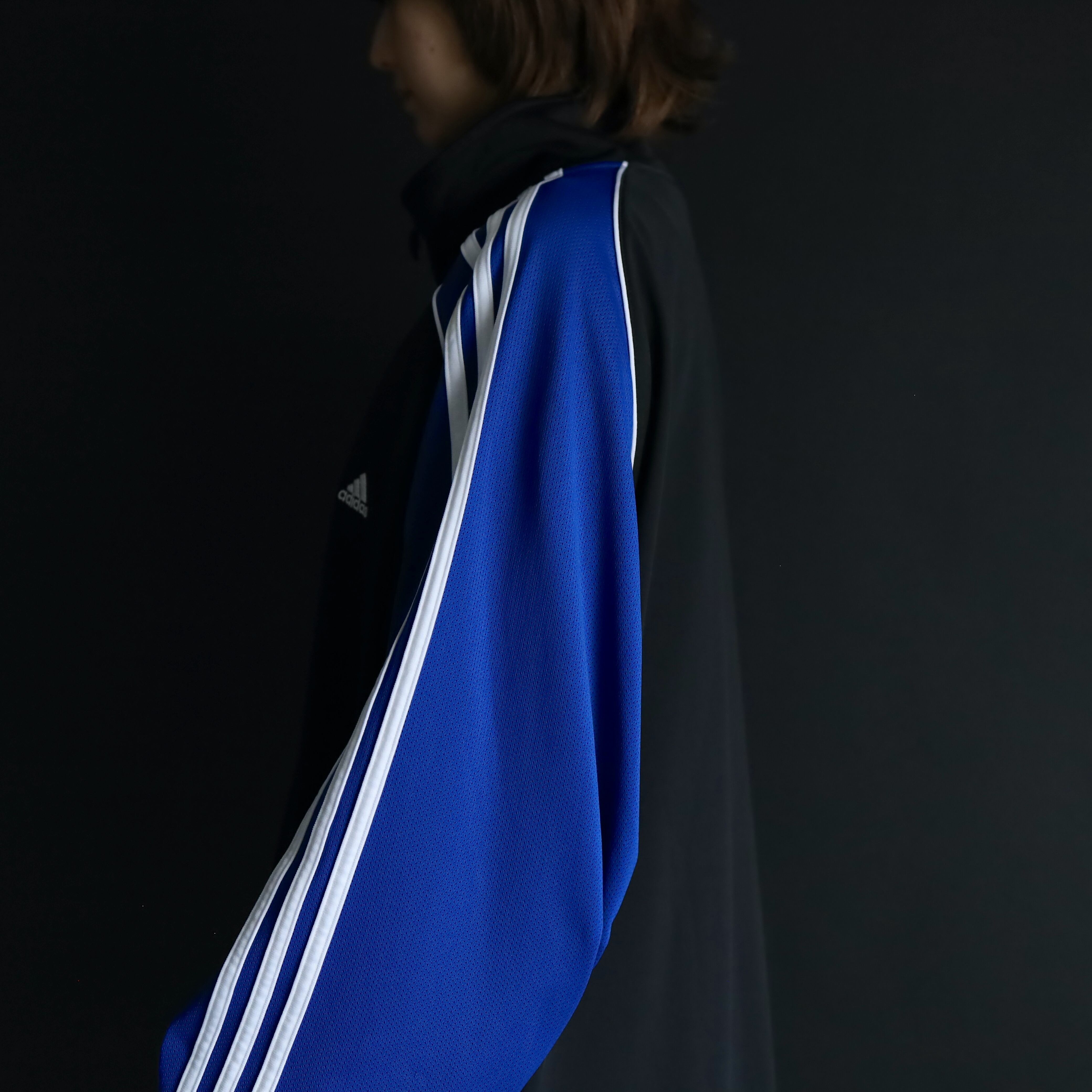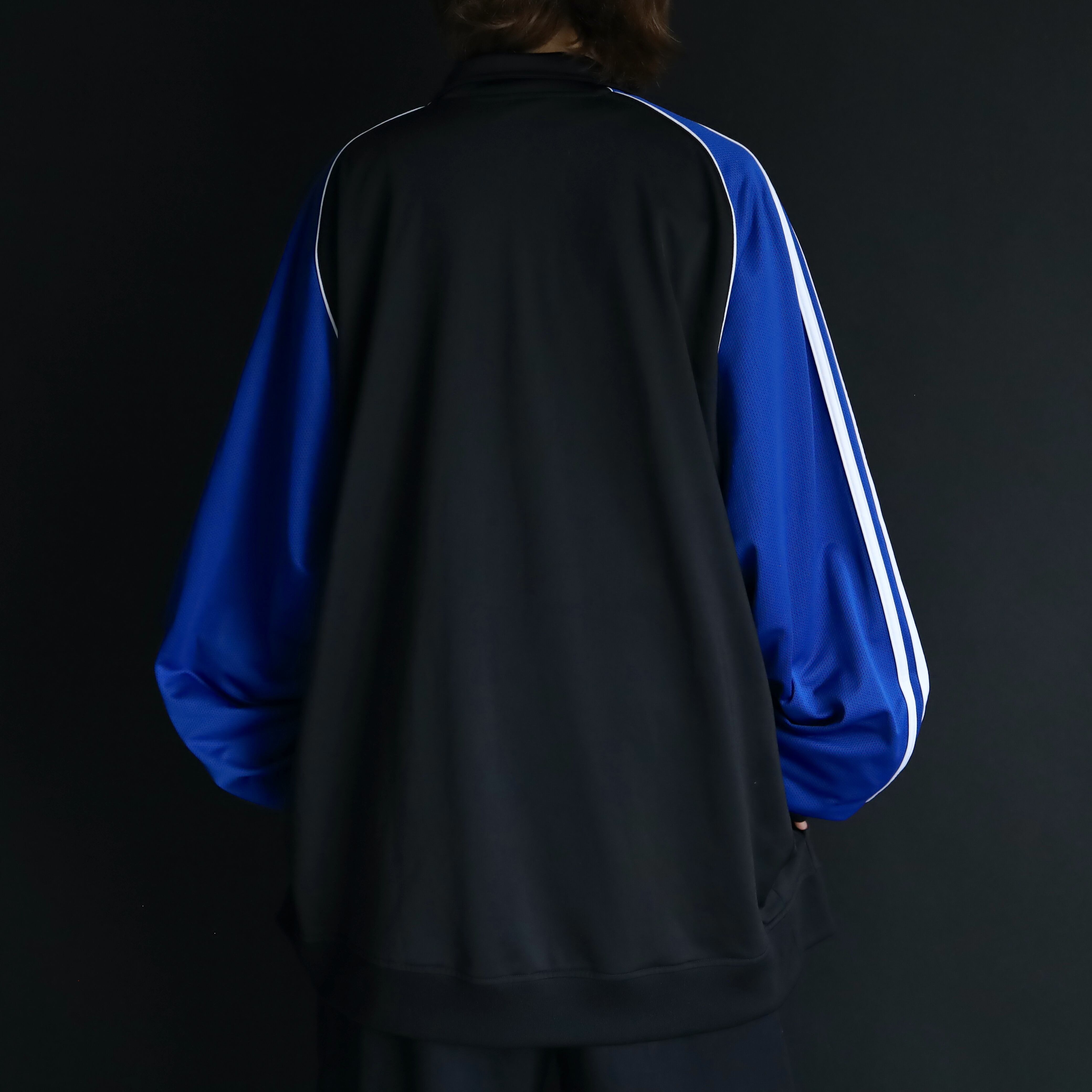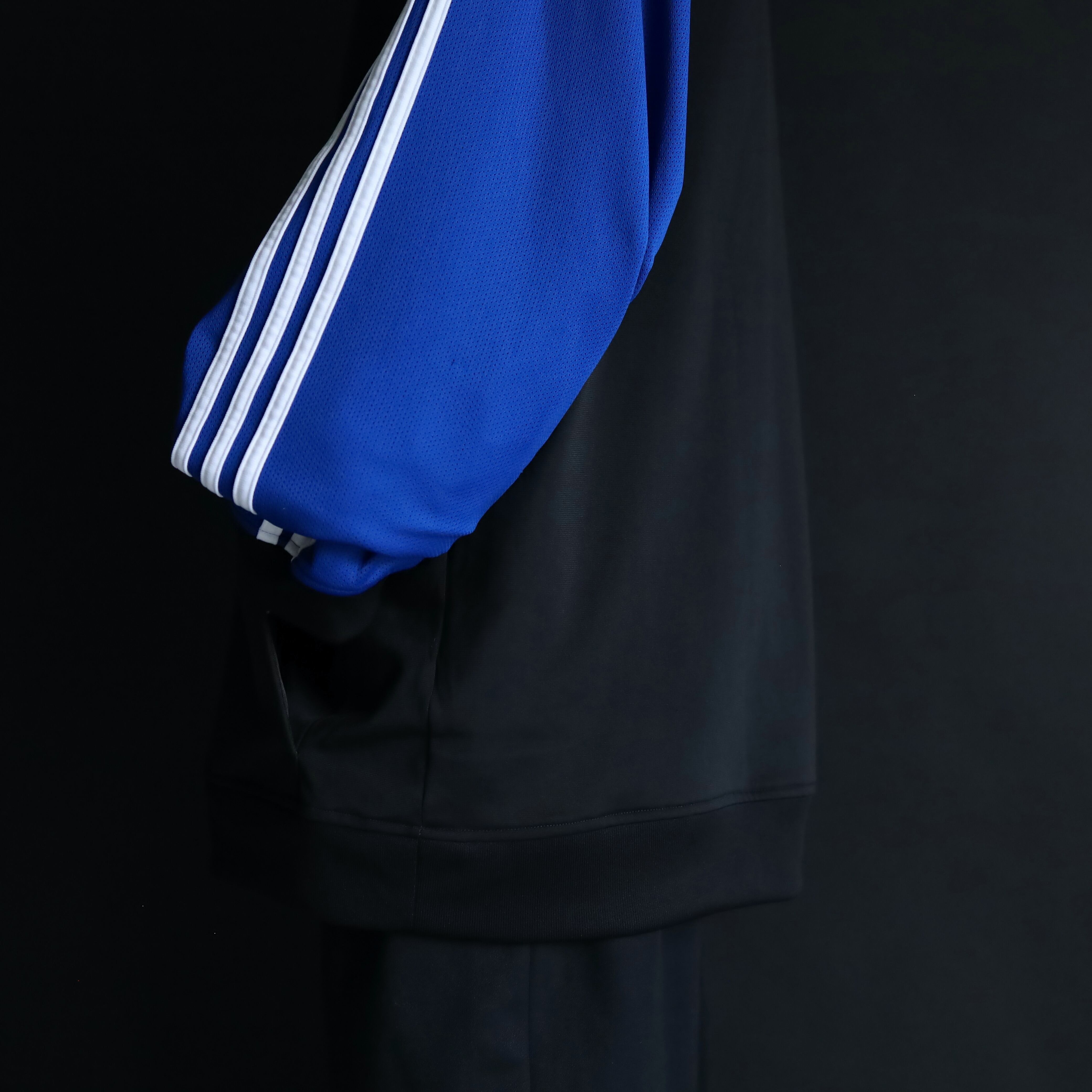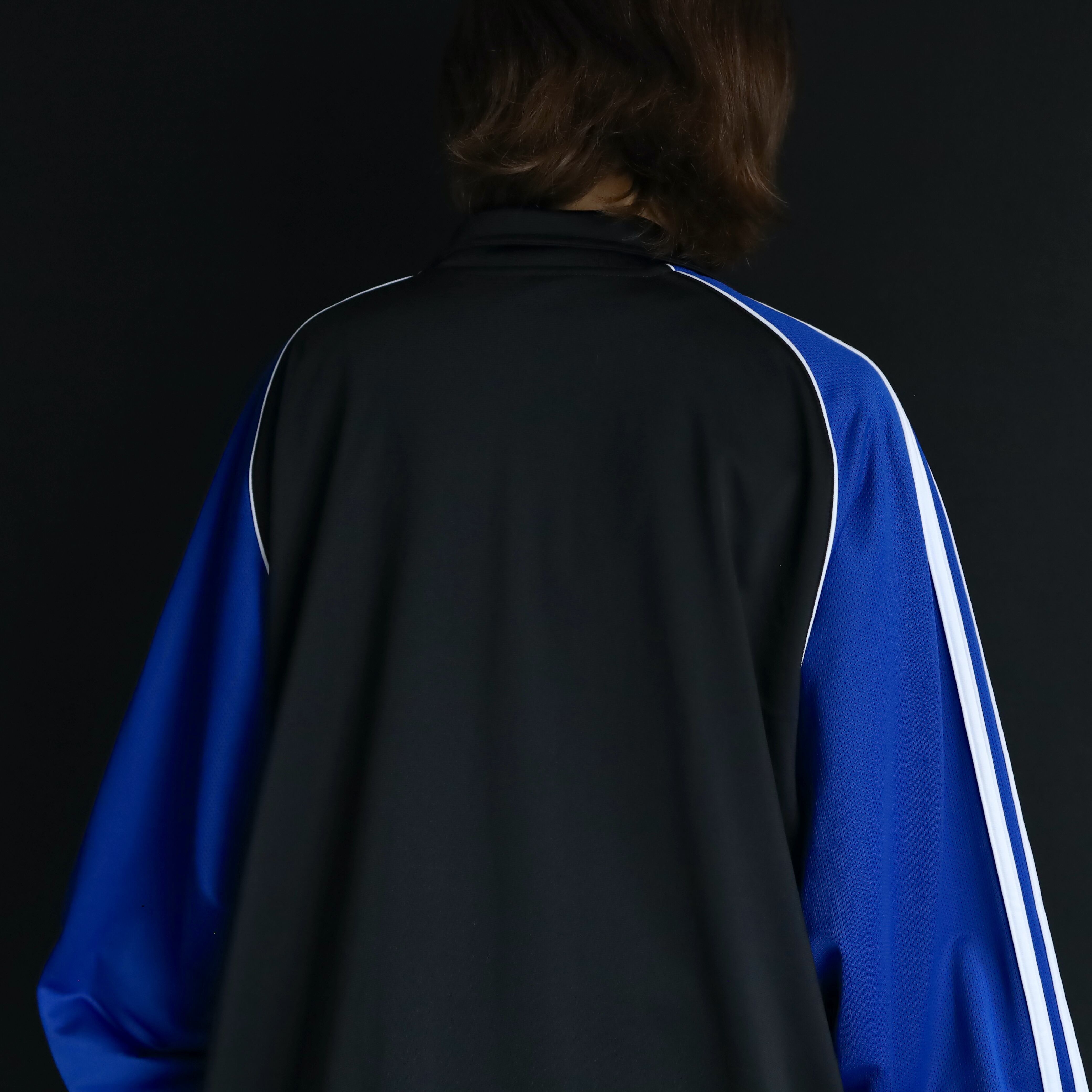 ブラックカラーの身頃に,ブルーカラーの袖切替.