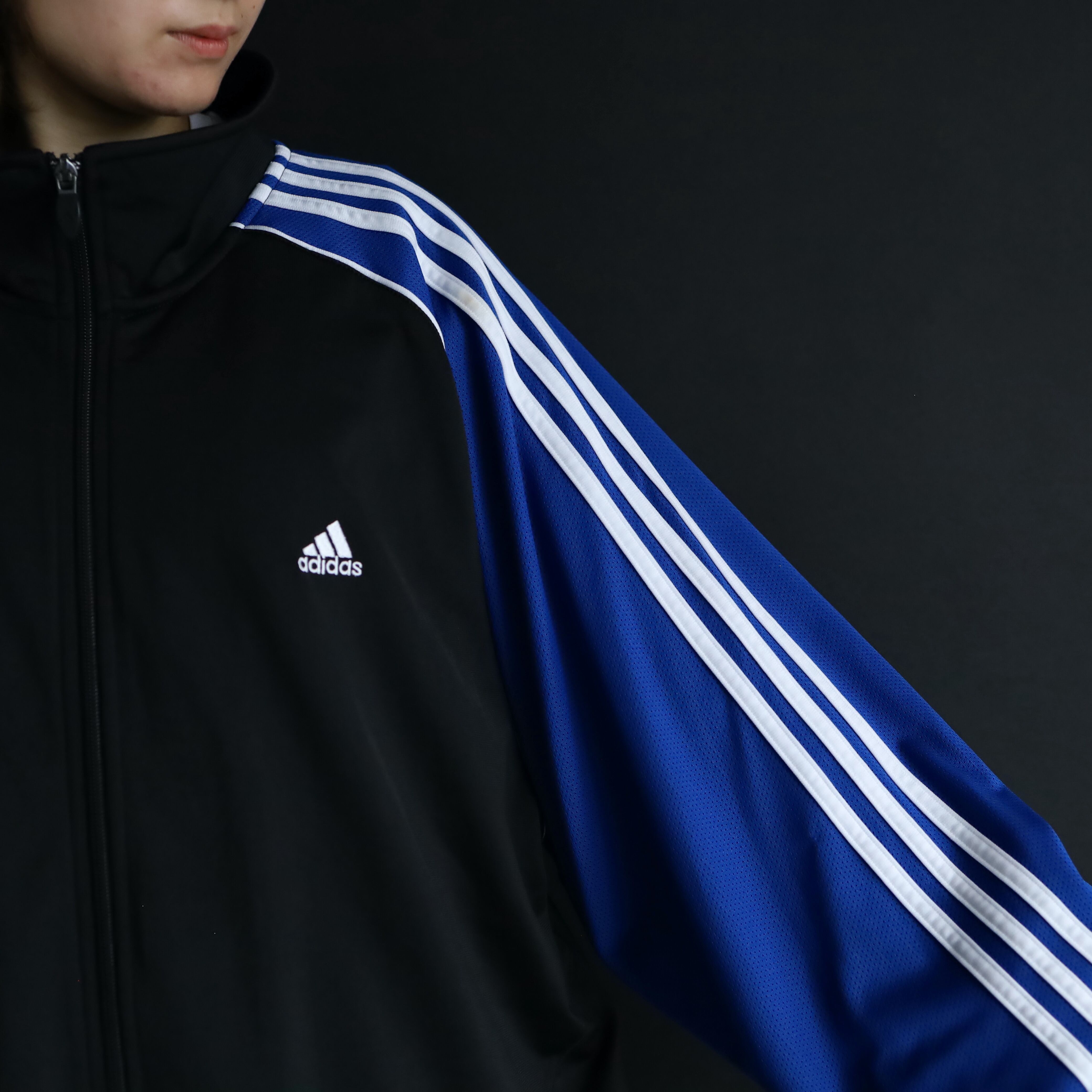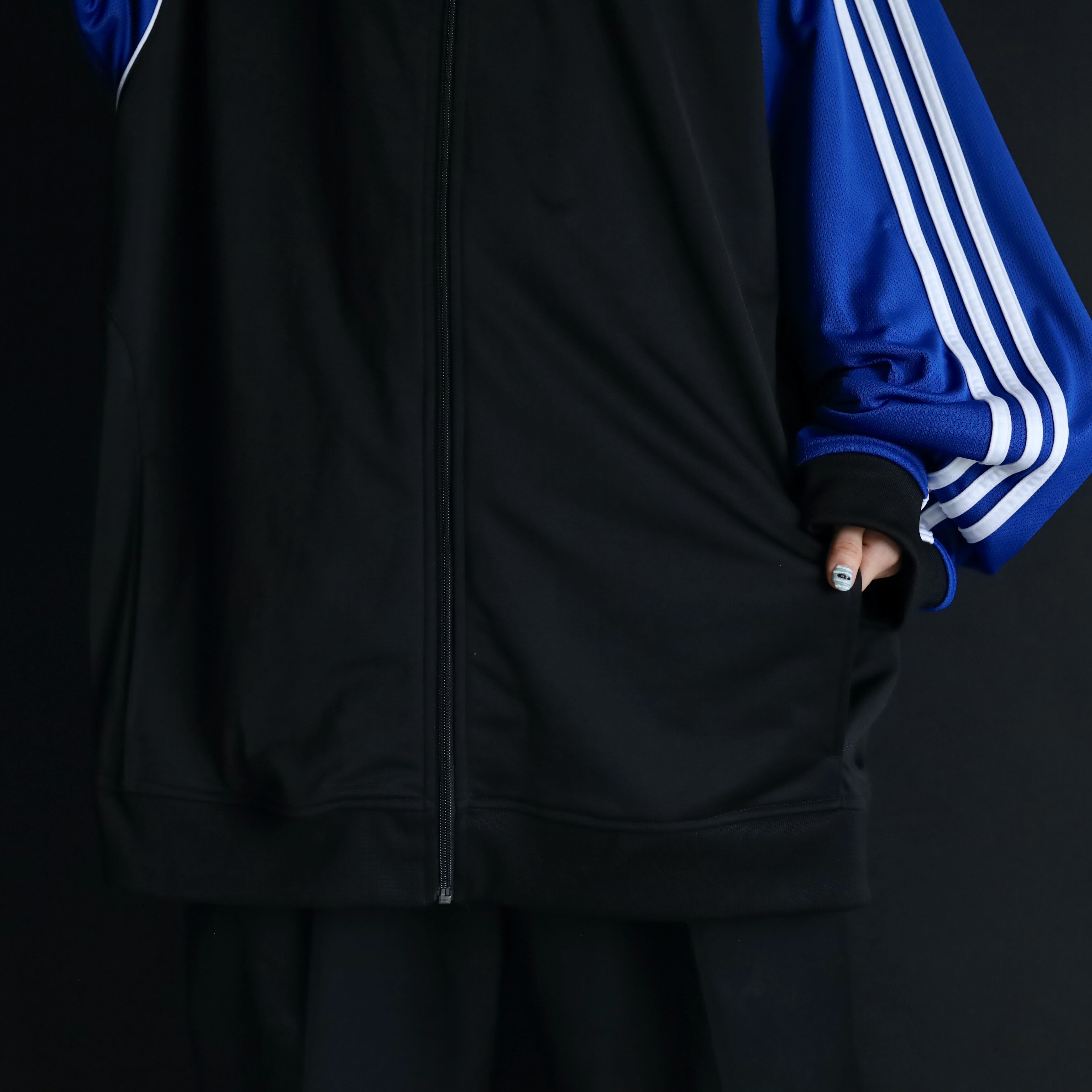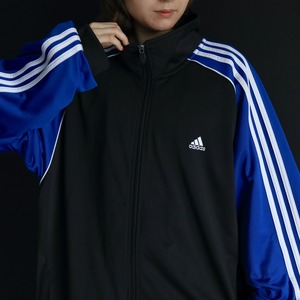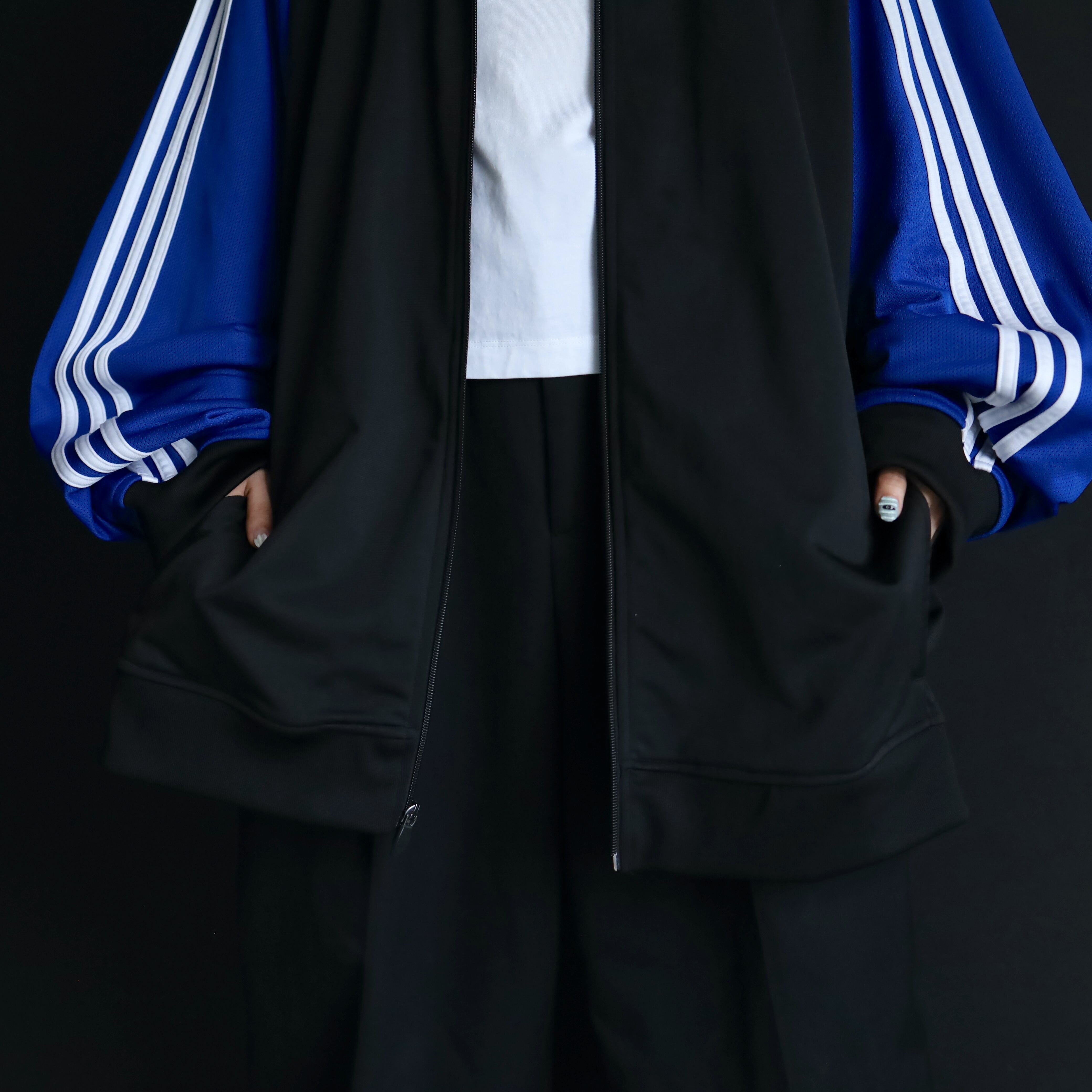 トラックジャケットの中では比較的袖が広め,また,裾のリブで引き締まるタイプではないため,緩やかなAラインを描いてくれる一枚です.