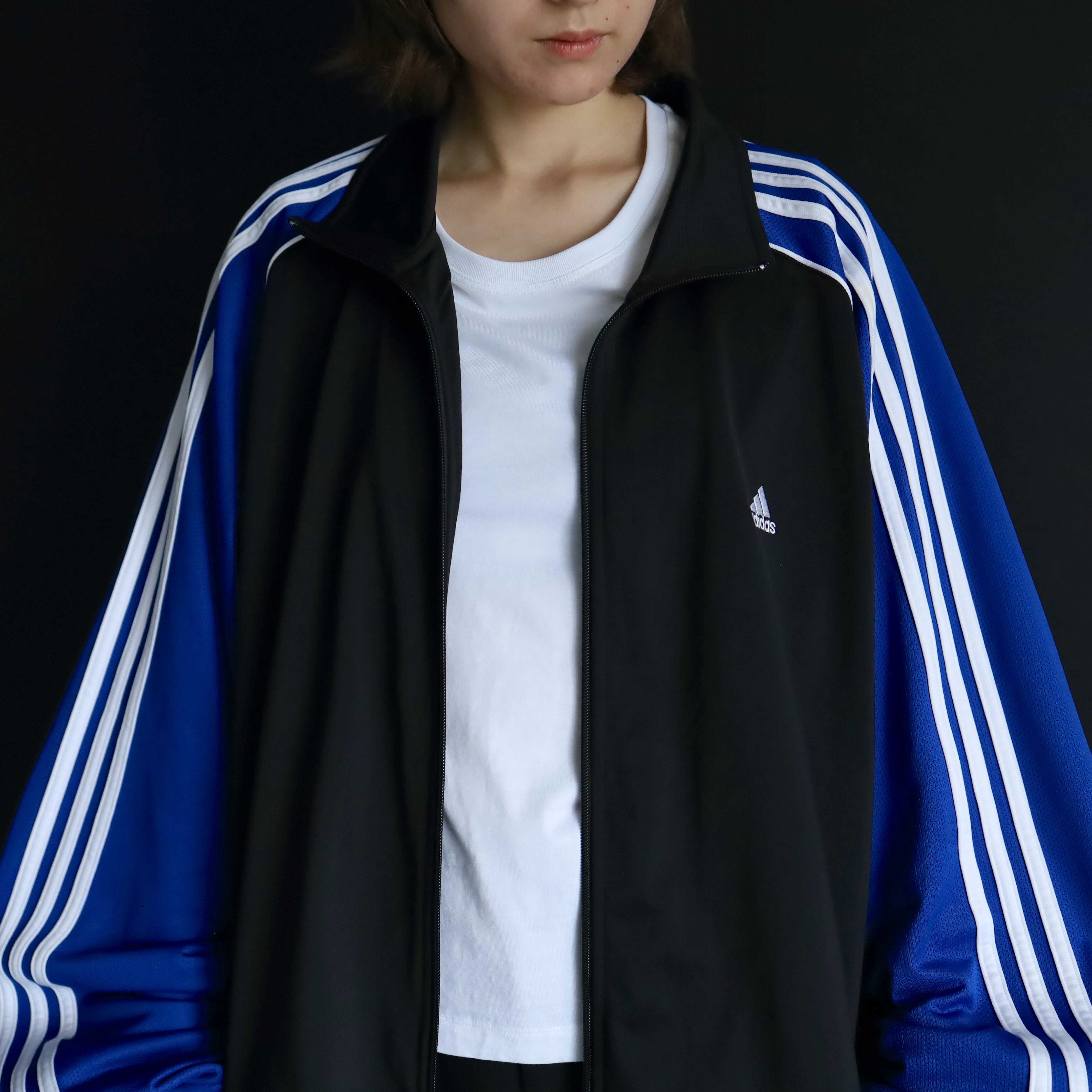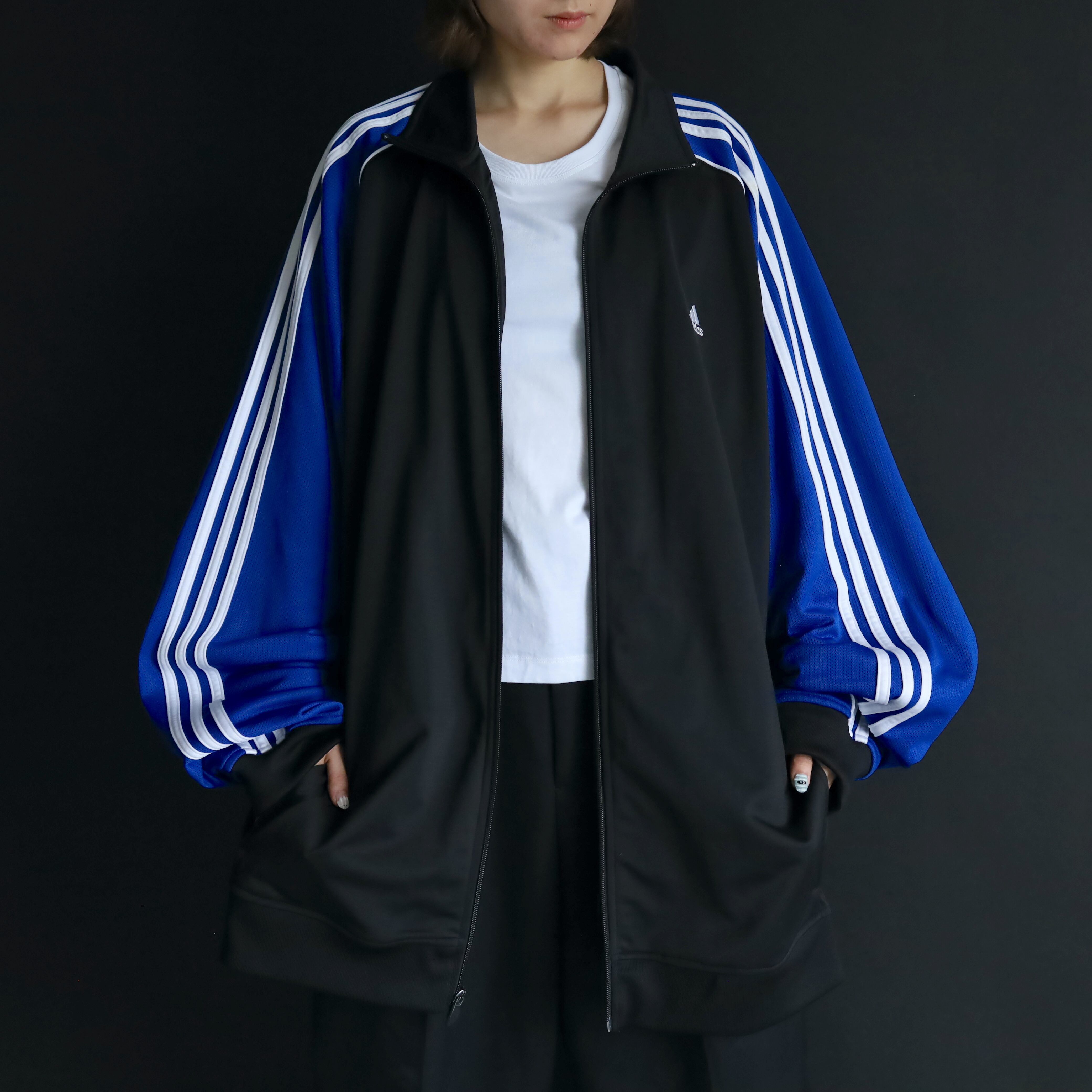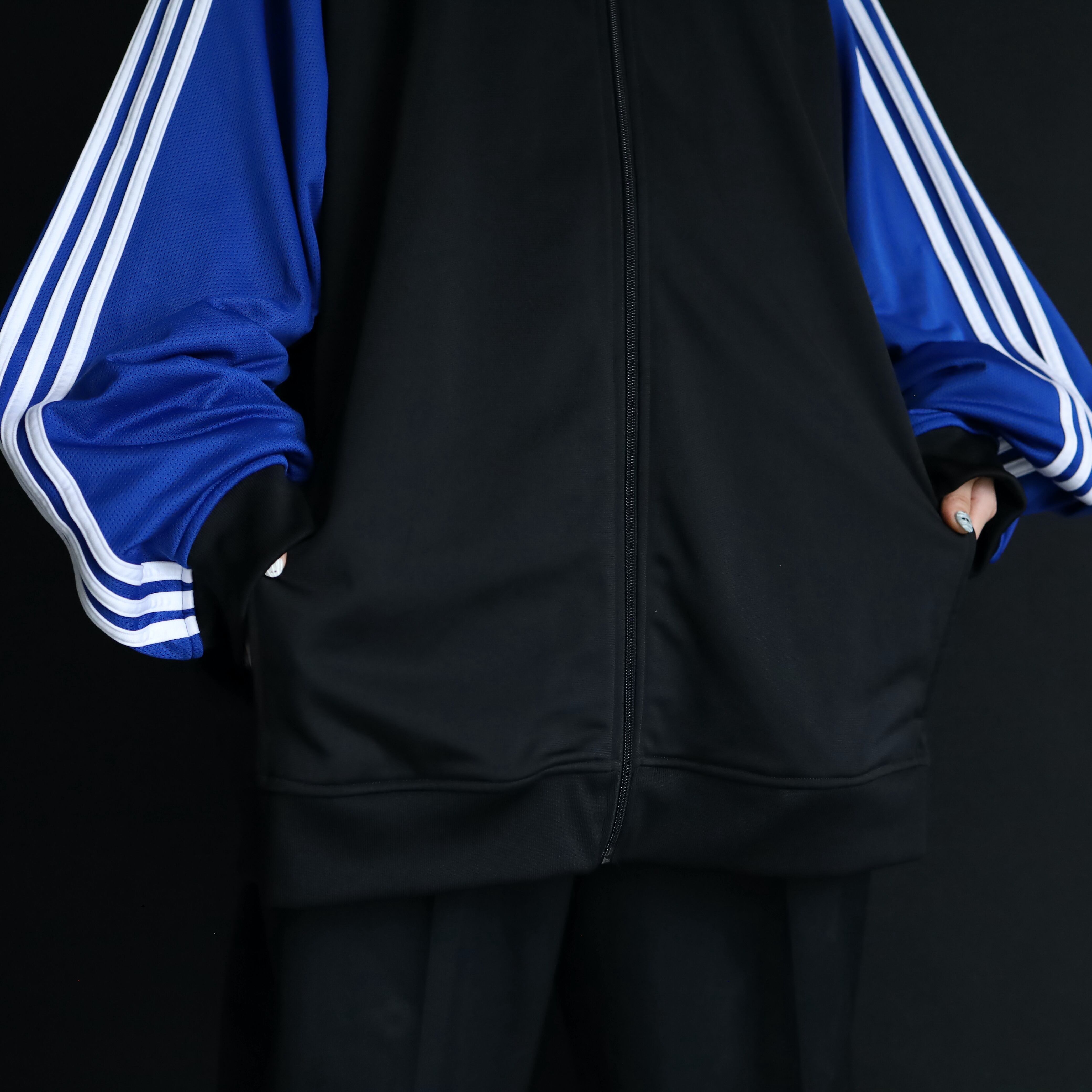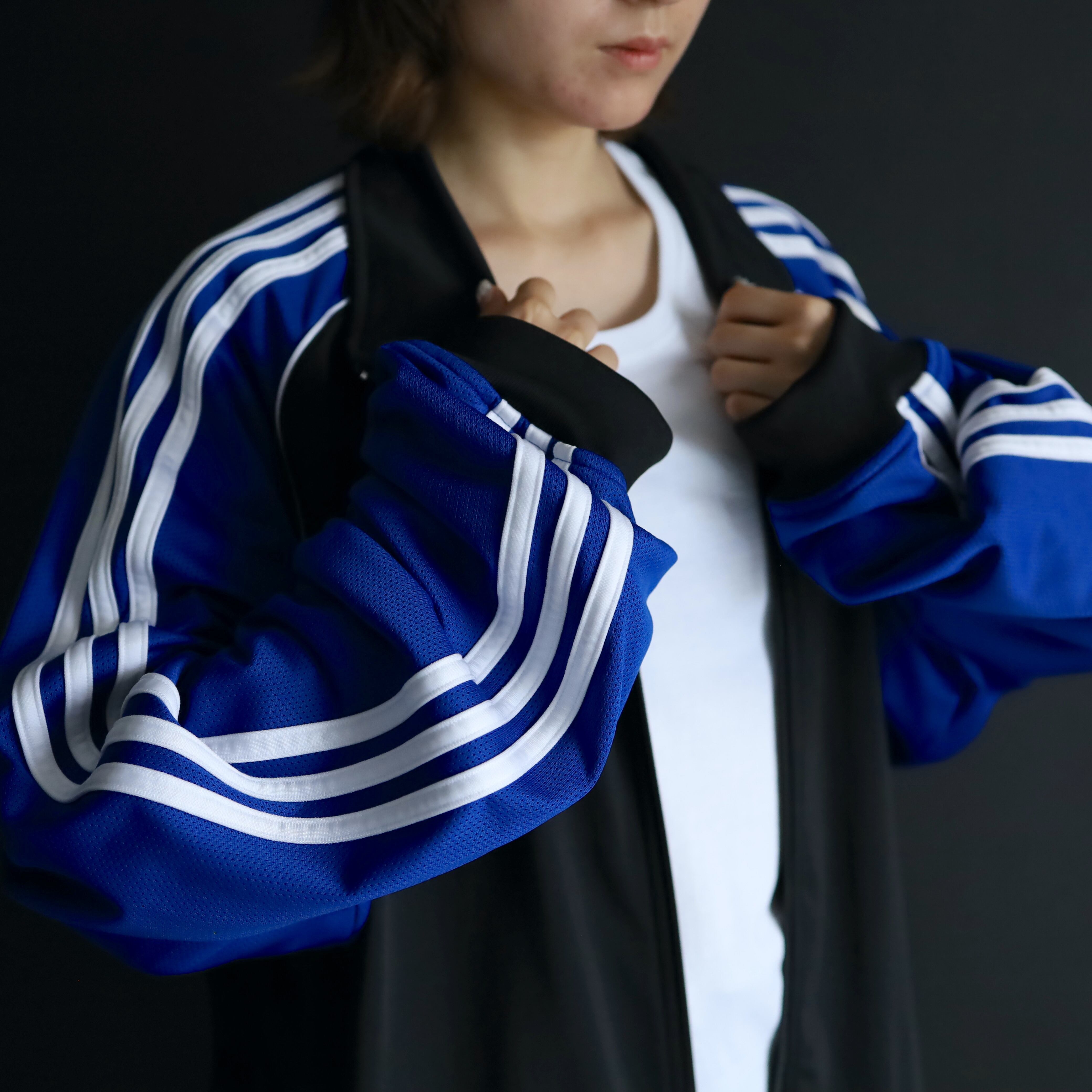 トラックジャケットの中では比較的袖が広め,また,裾のリブで引き締まるタイプではないため,緩やかなAラインを描いてくれる一枚です.