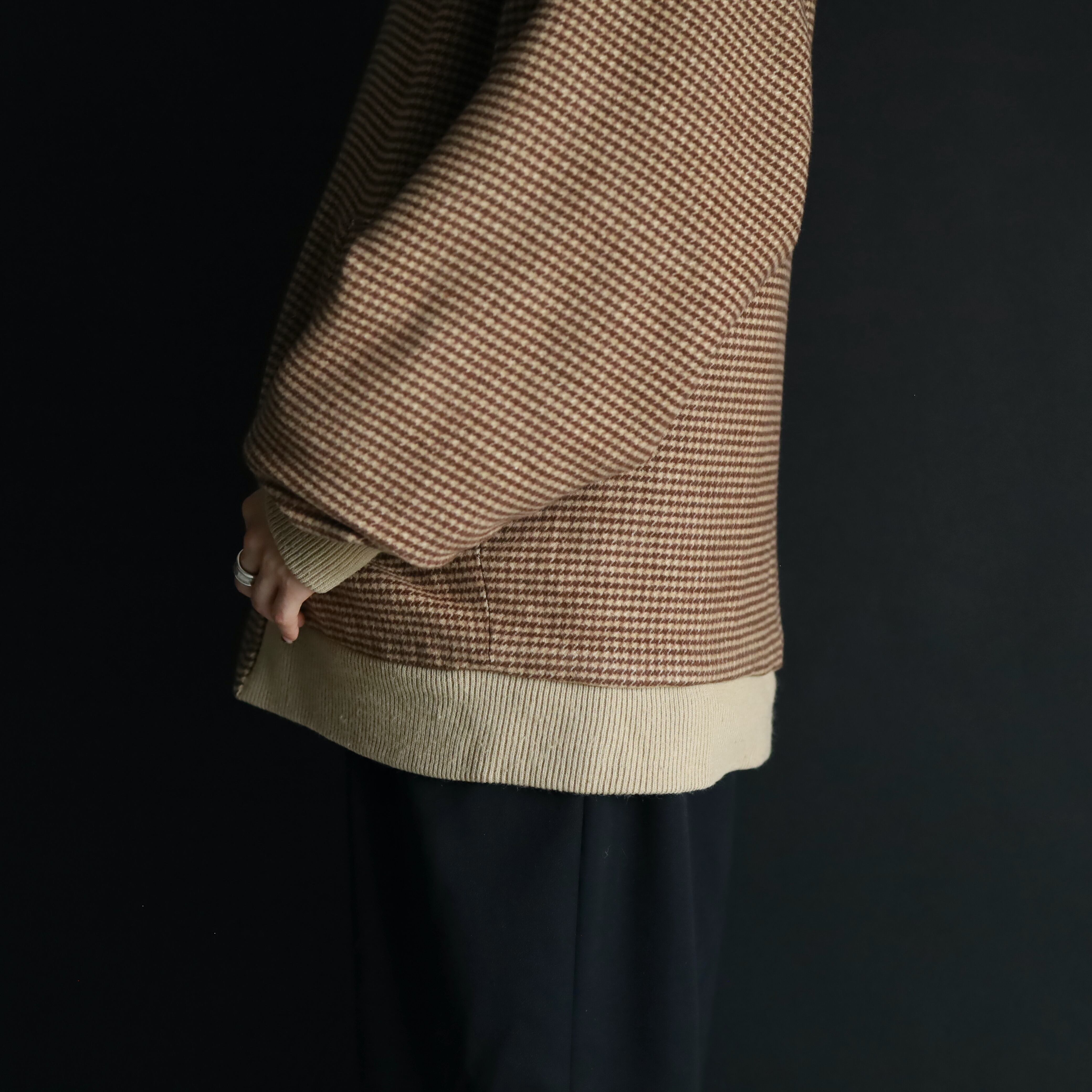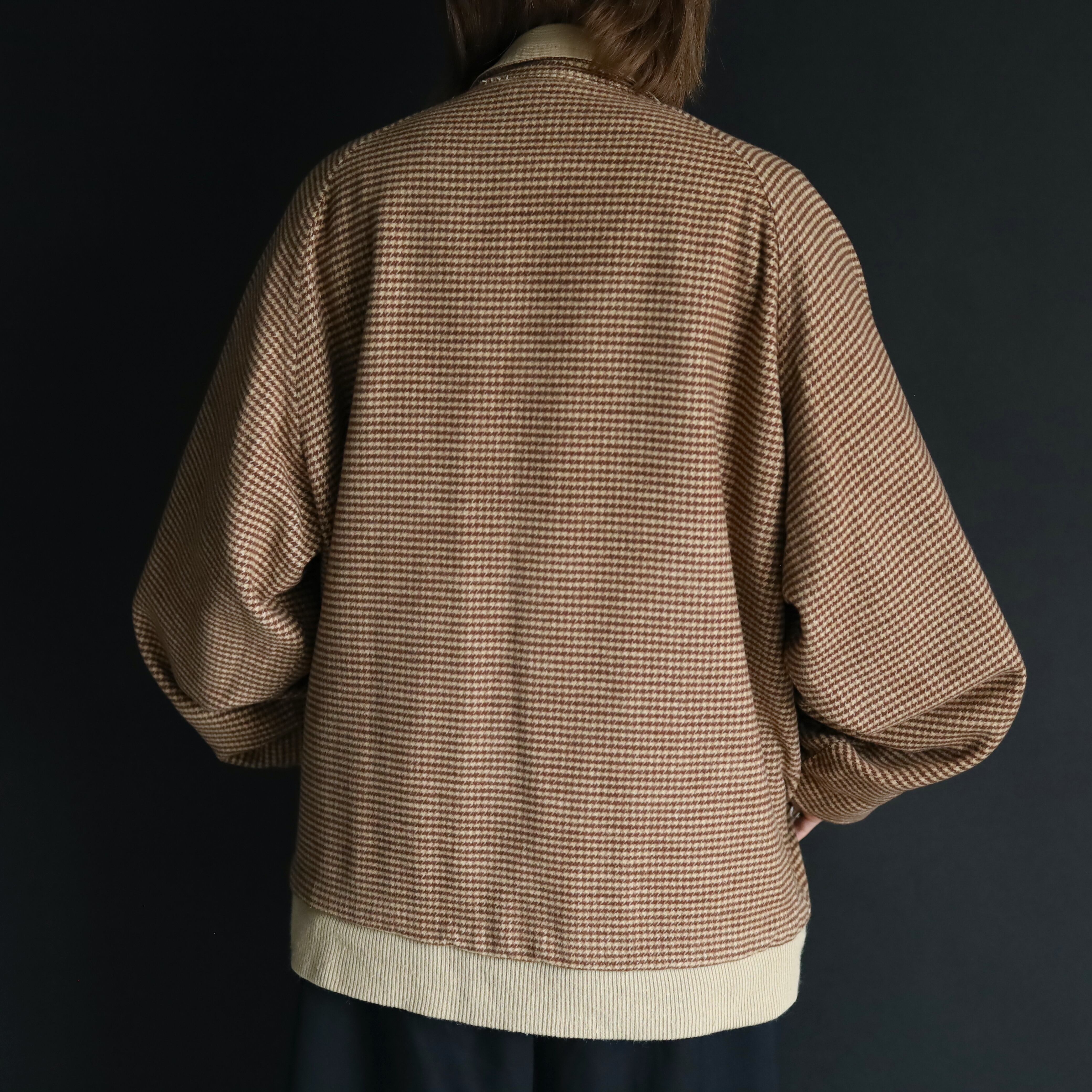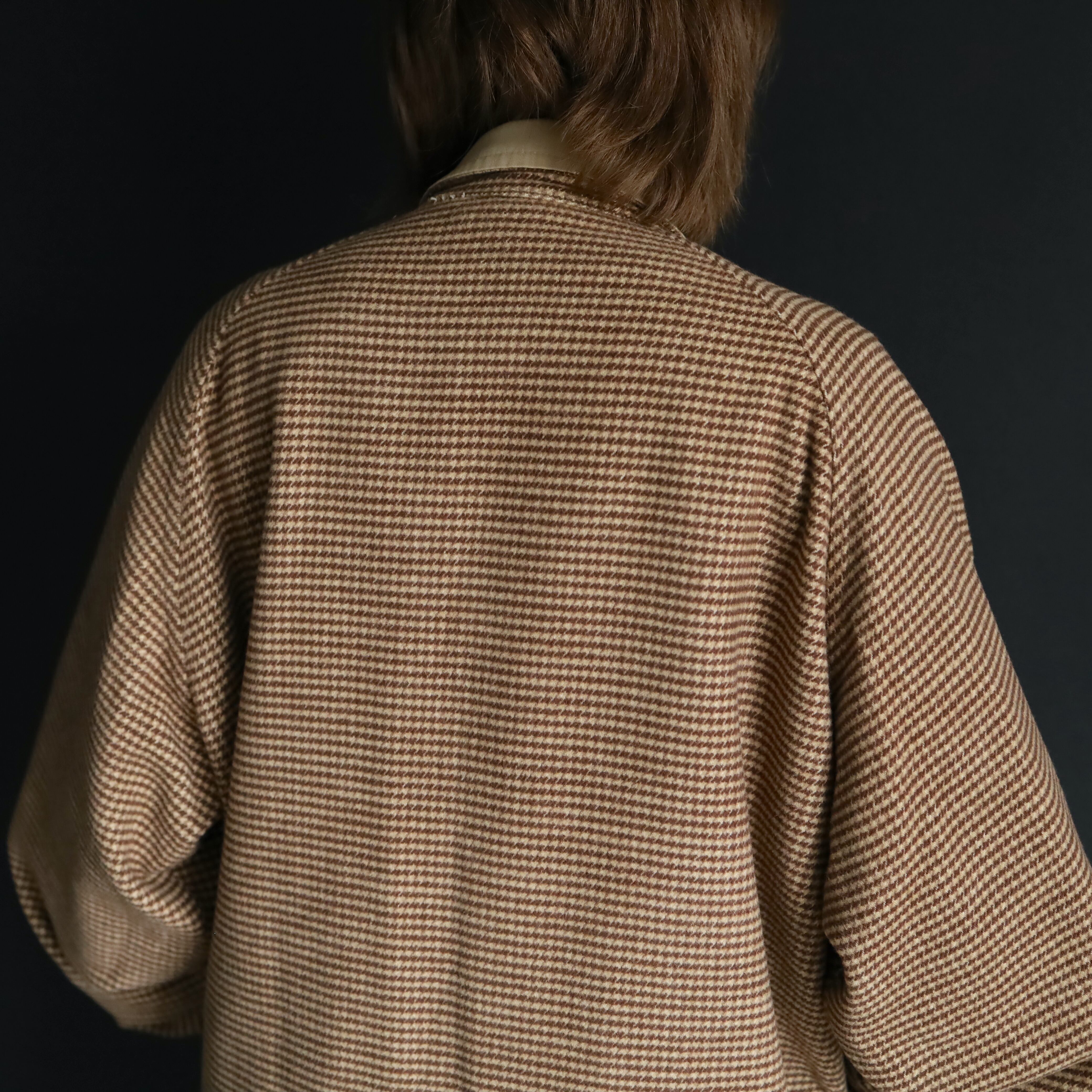 A面はコットン×アクリルのふんわり起毛した生地感で,ブラウン,ベージュの千鳥格子デザイン.