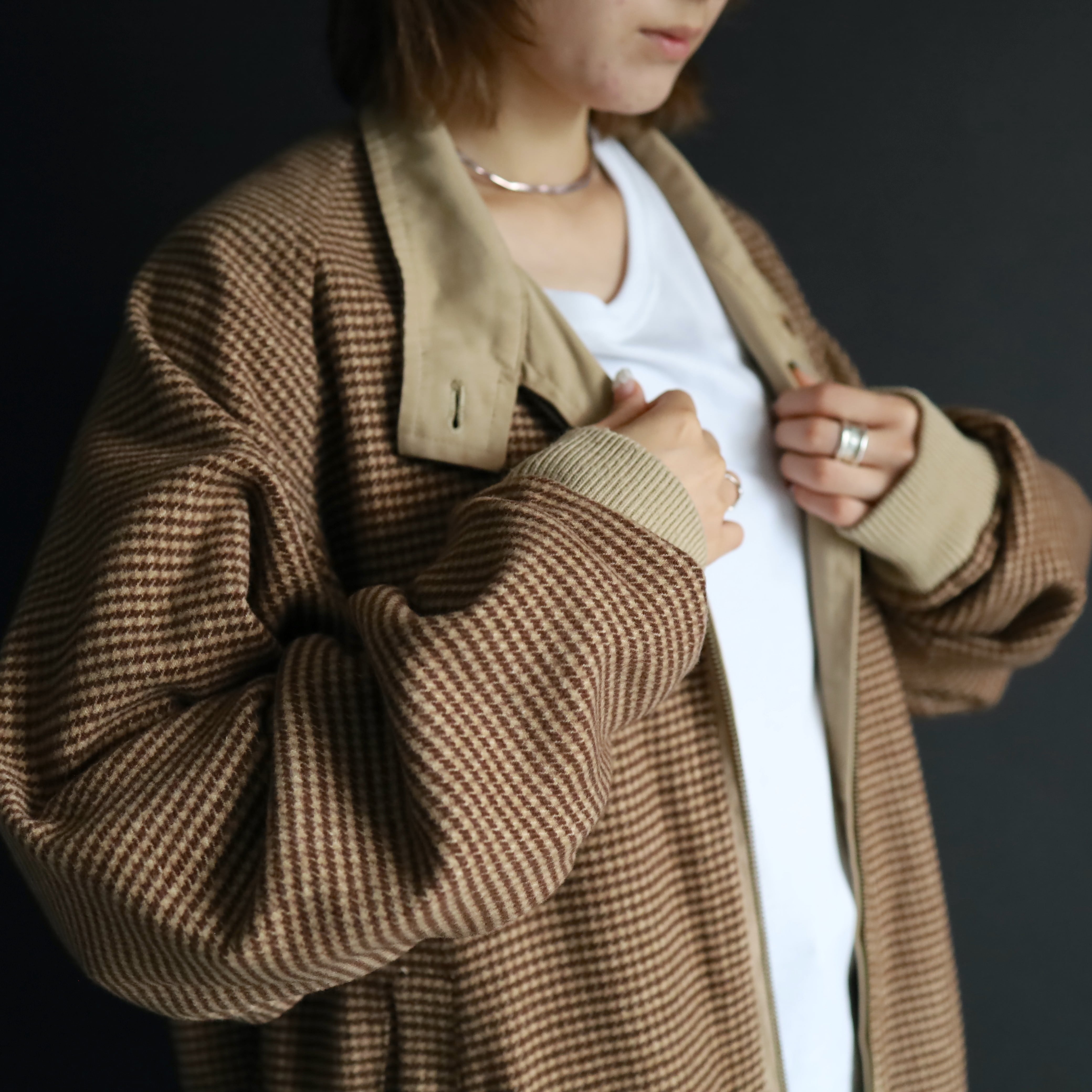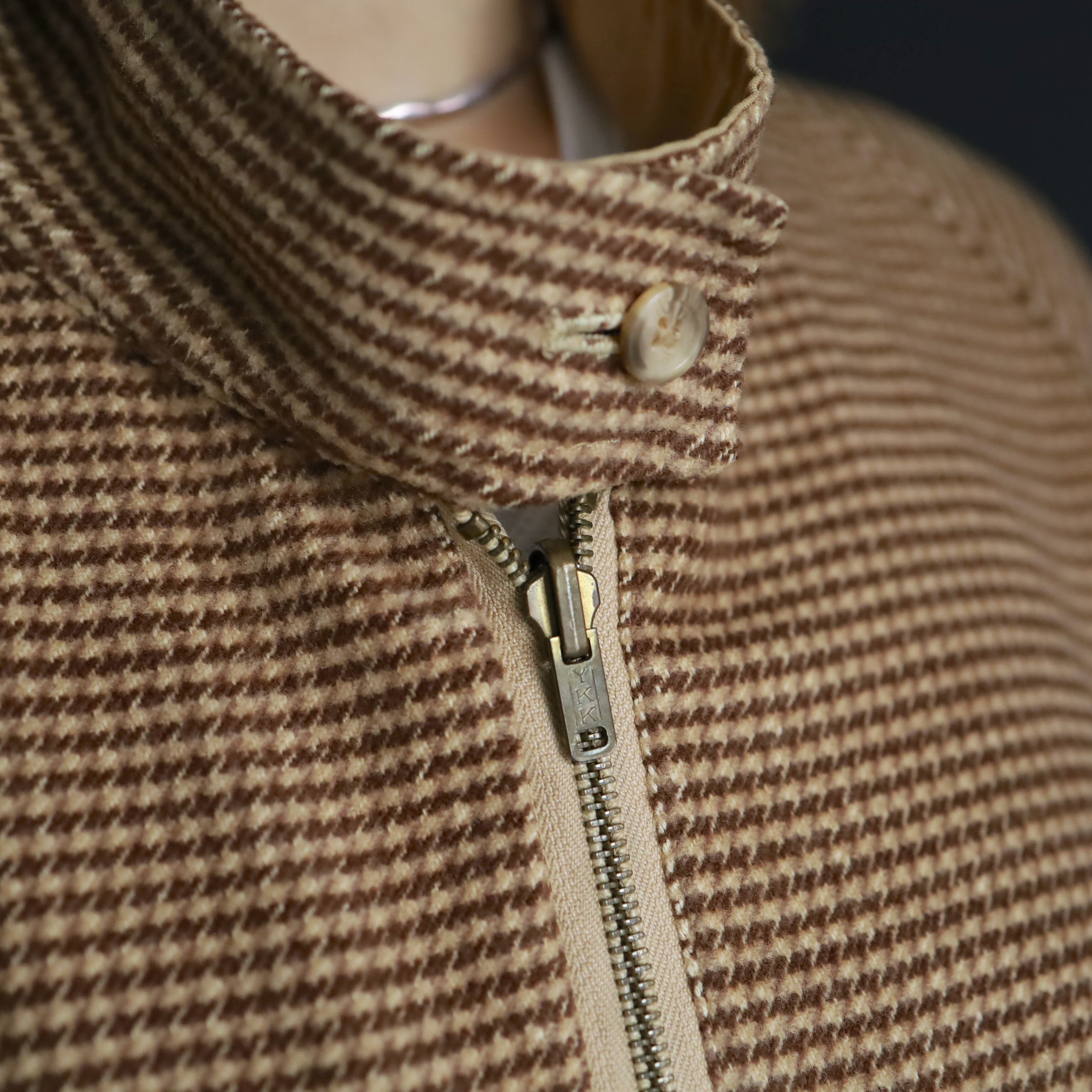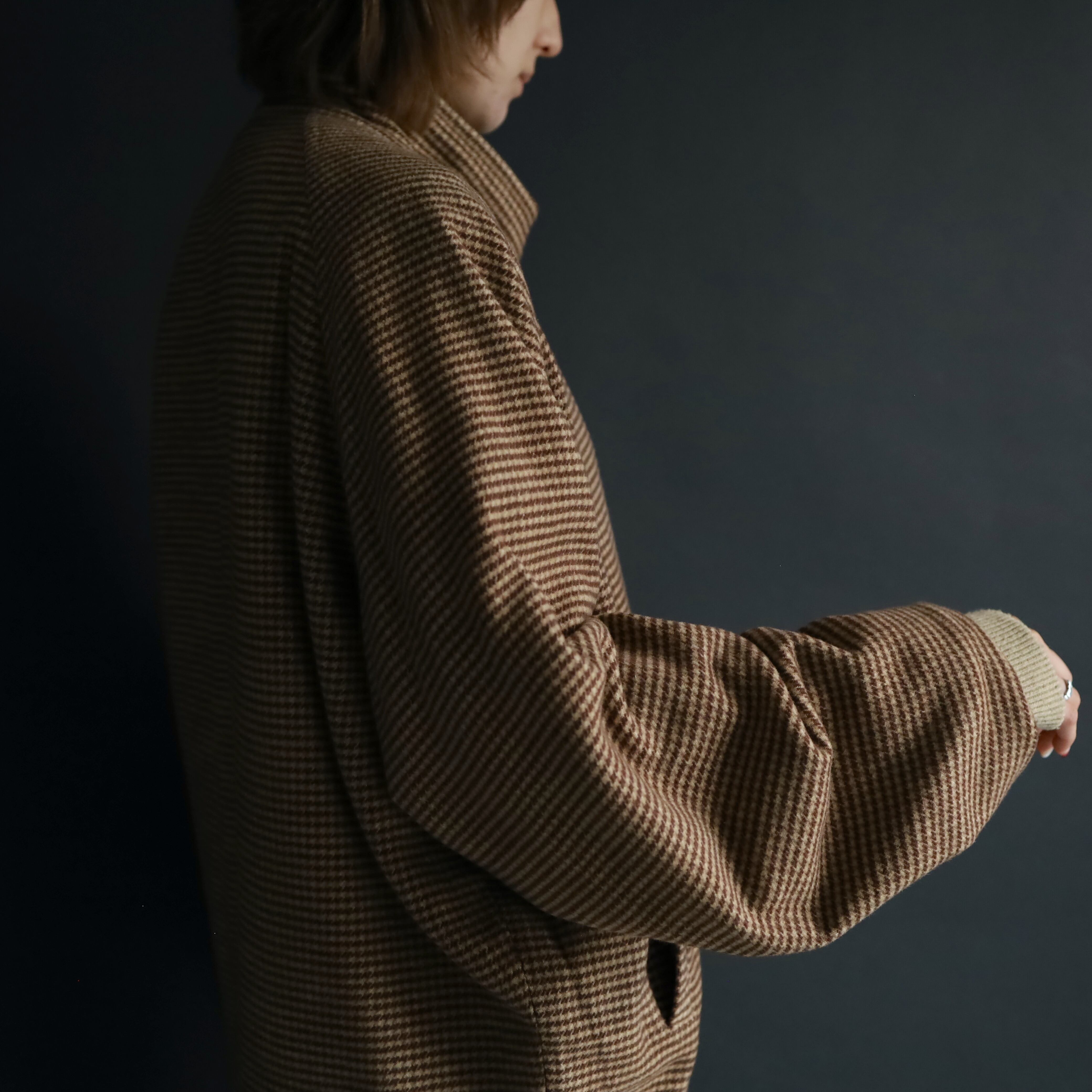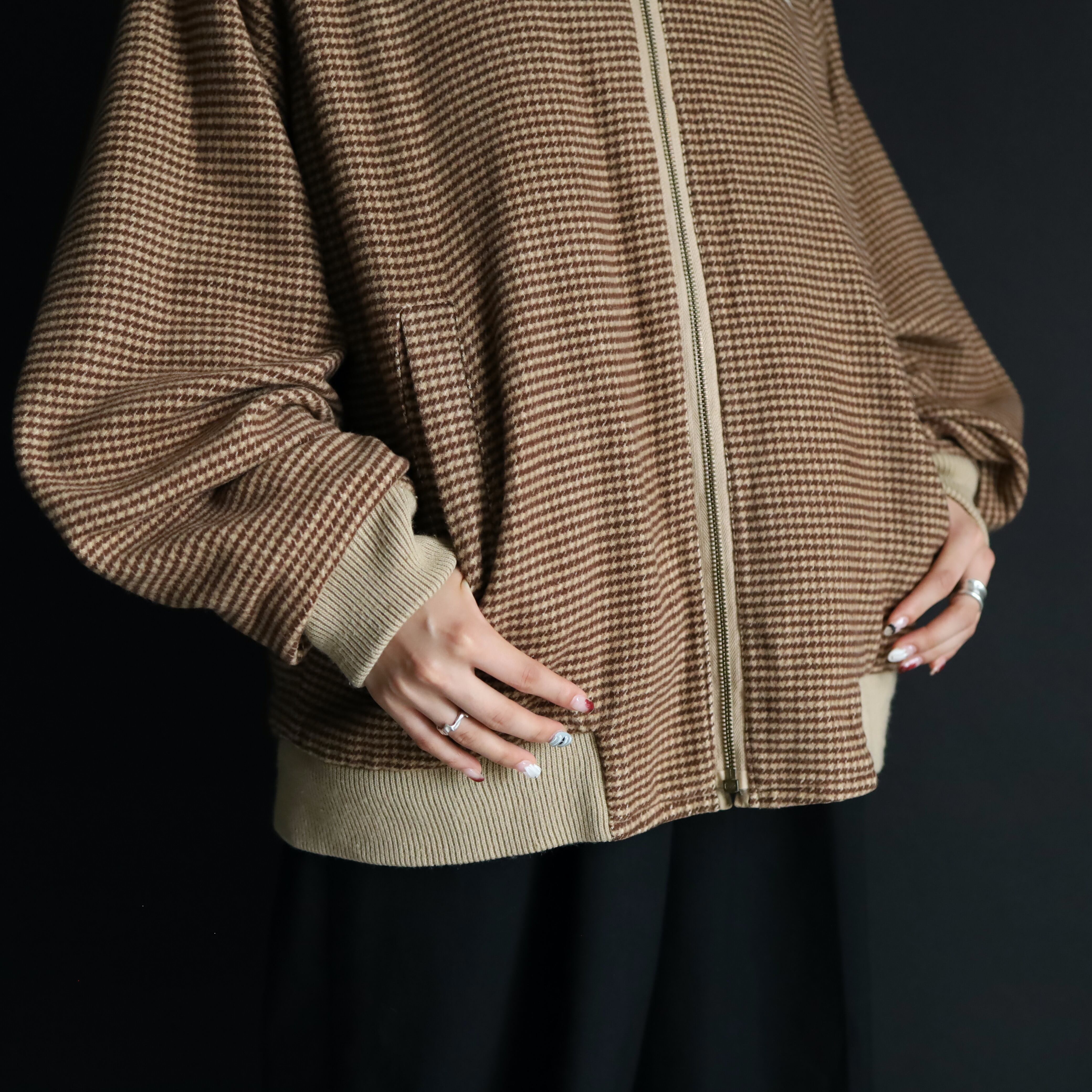 A面はコットン×アクリルのふんわり起毛した生地感で,ブラウン,ベージュの千鳥格子デザイン.