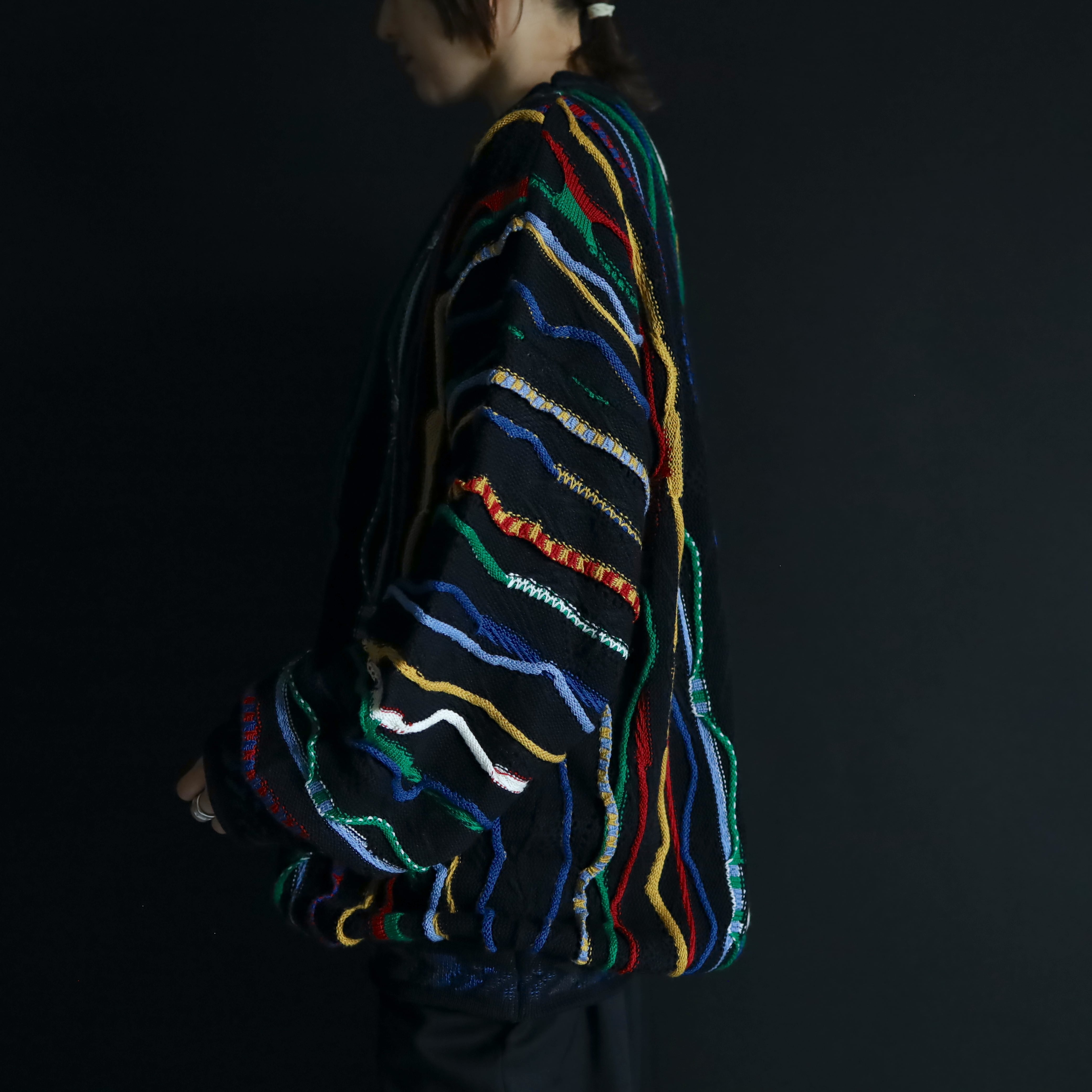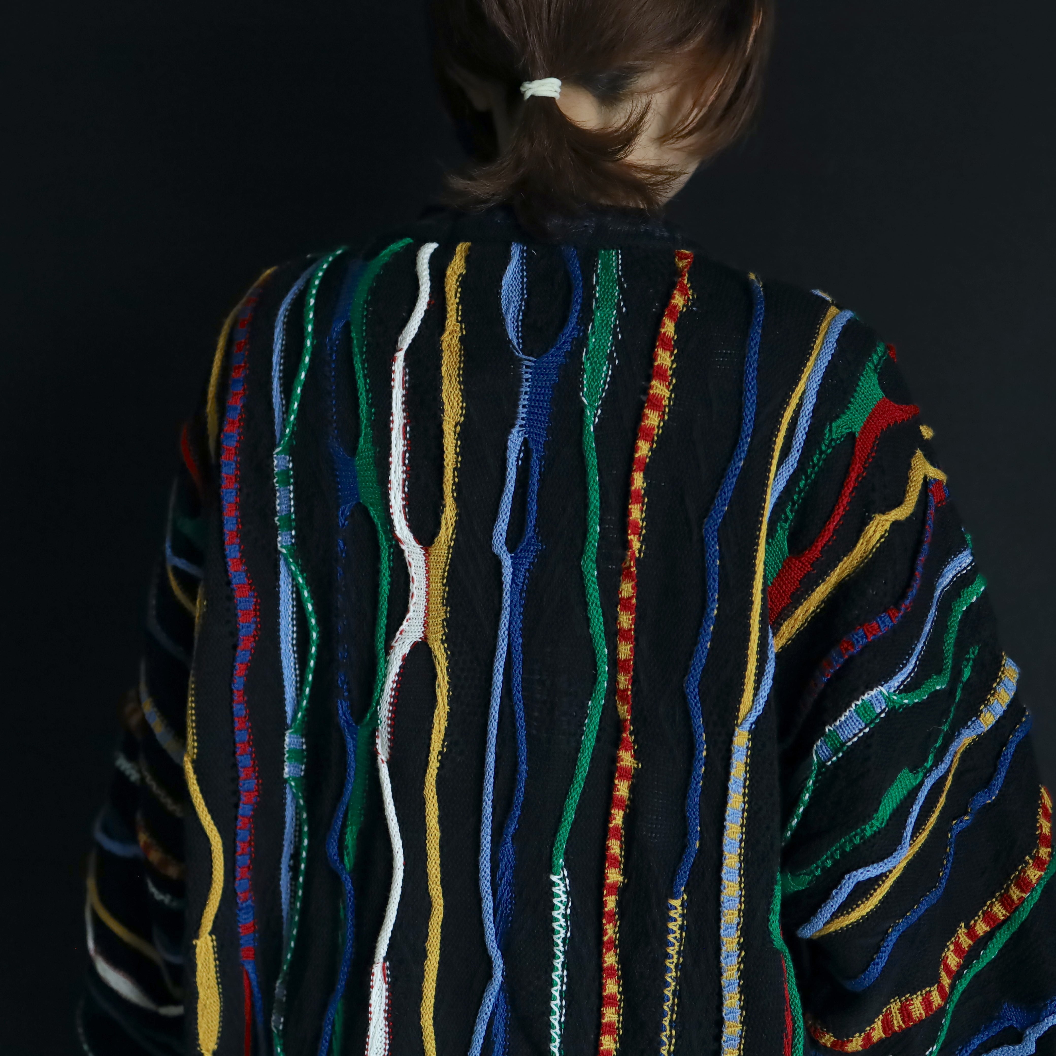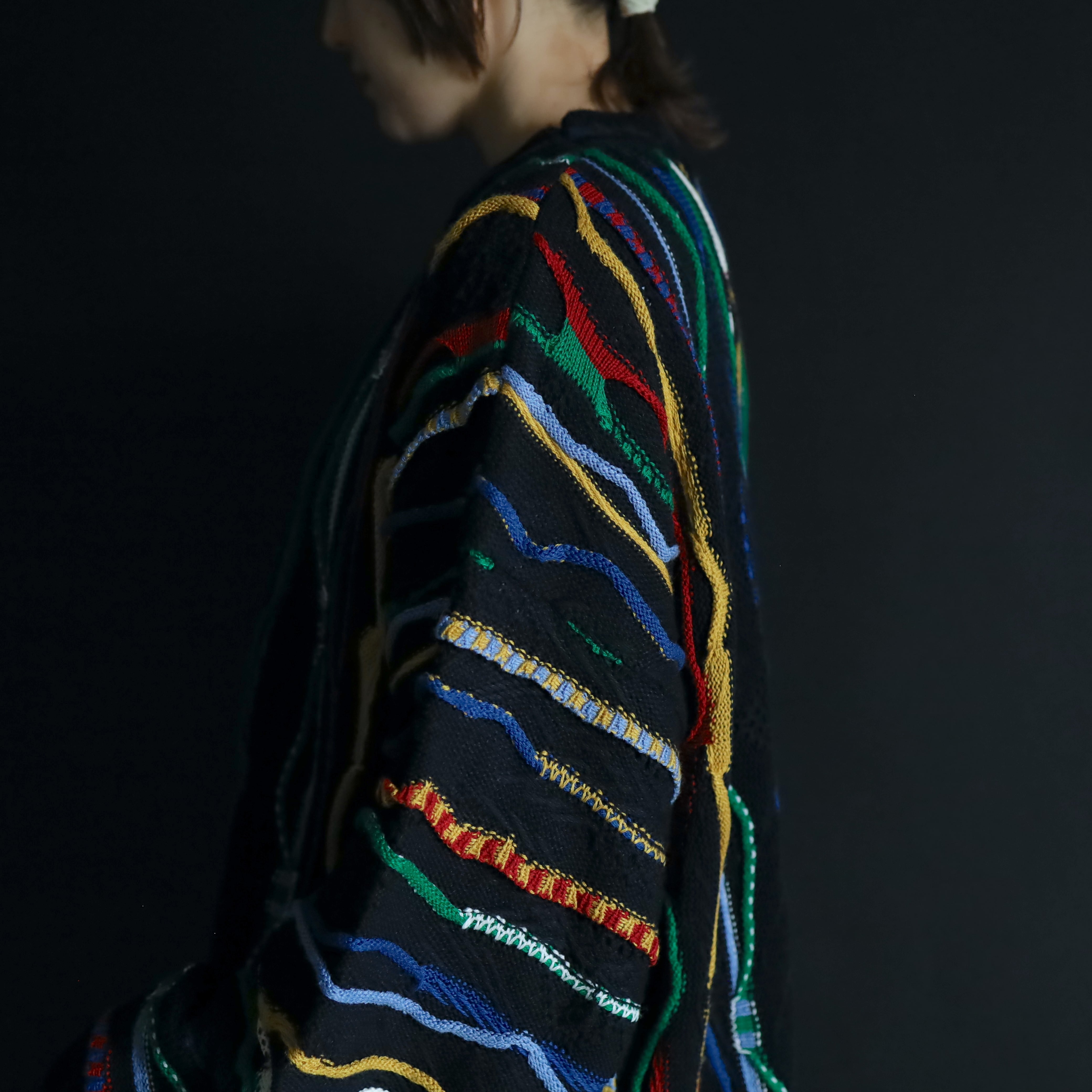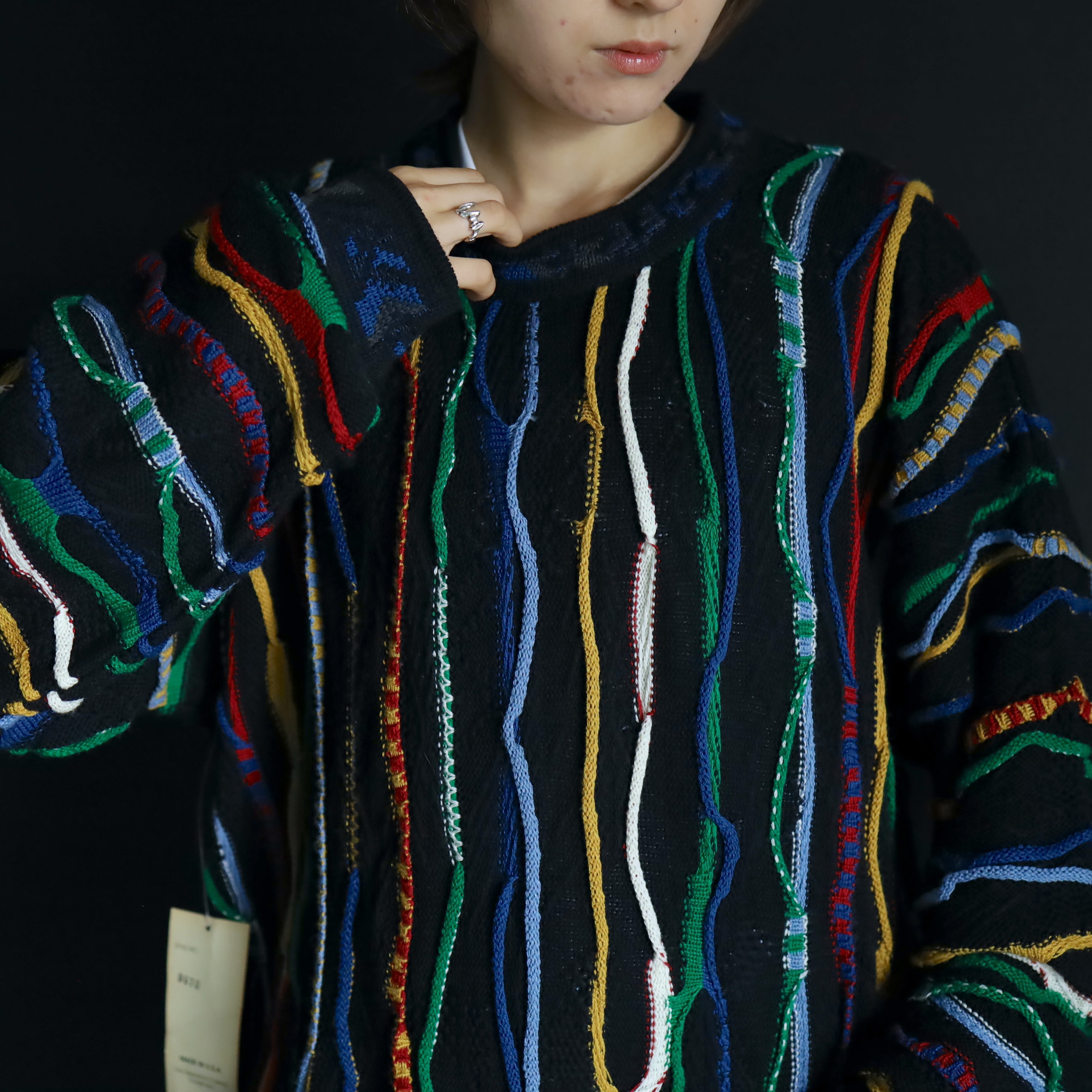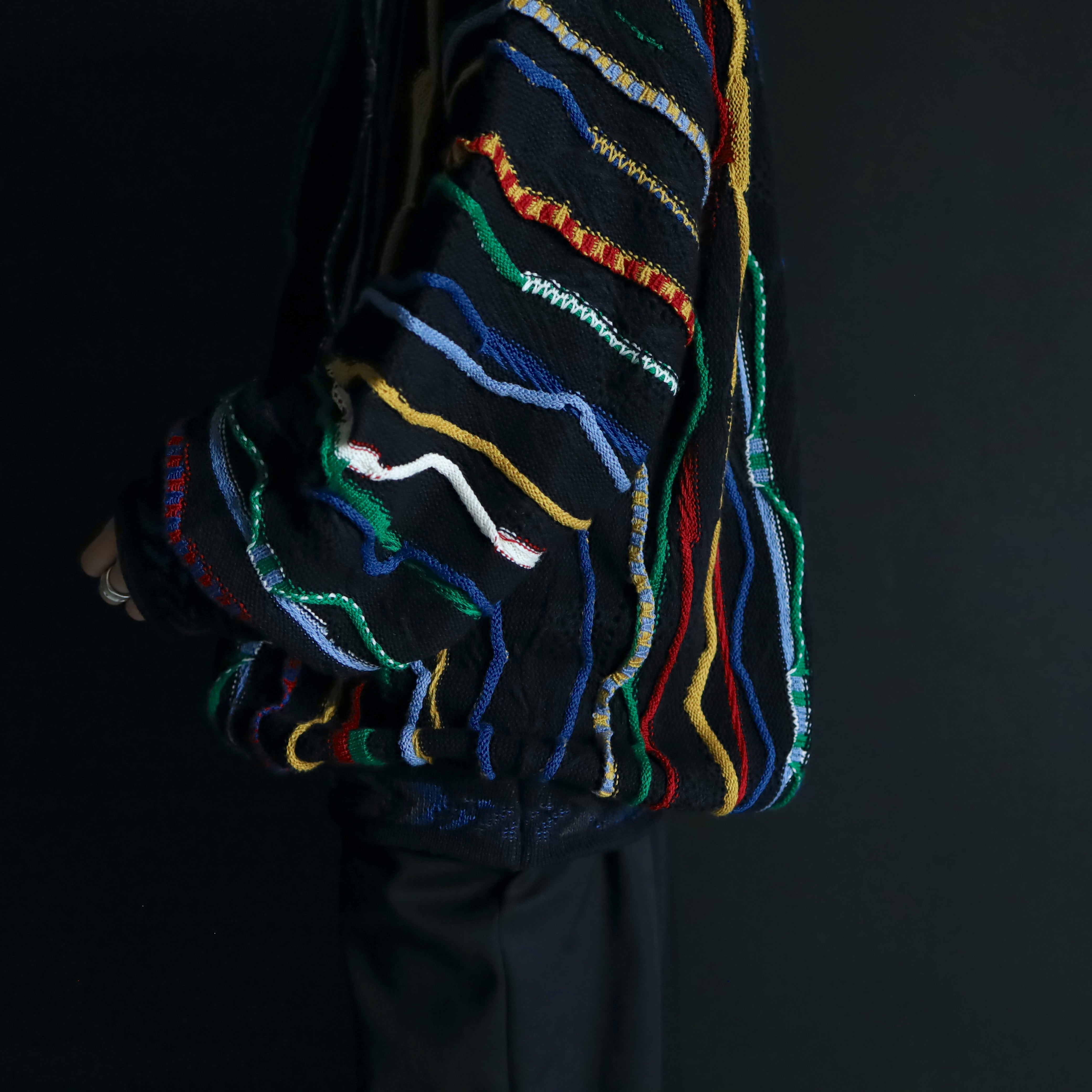 3Dニットの肝である立体的な畝は,レッド,ブルー,イエロー,グリーン,ホワイトなど,マルチカラーで不規則に構成されています.