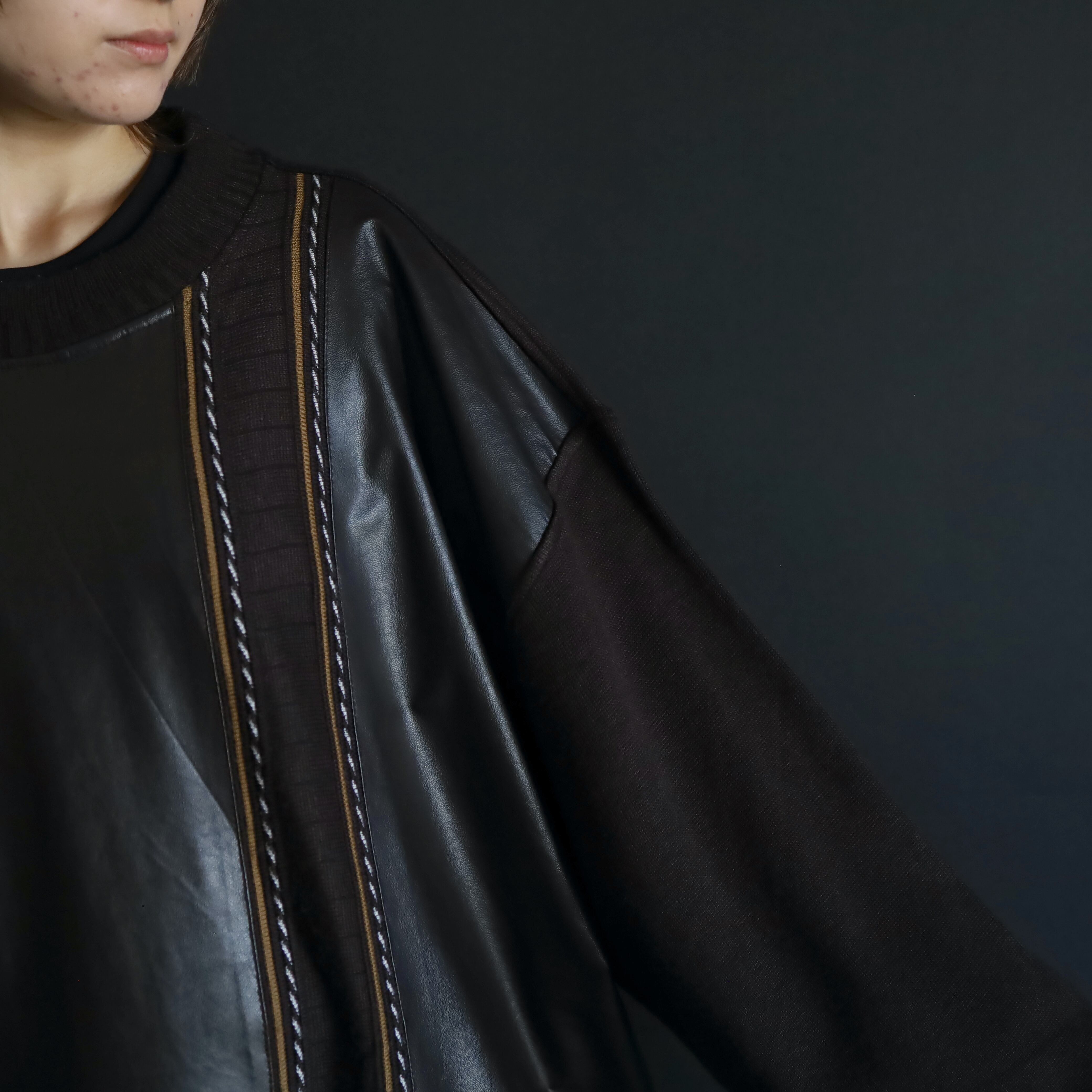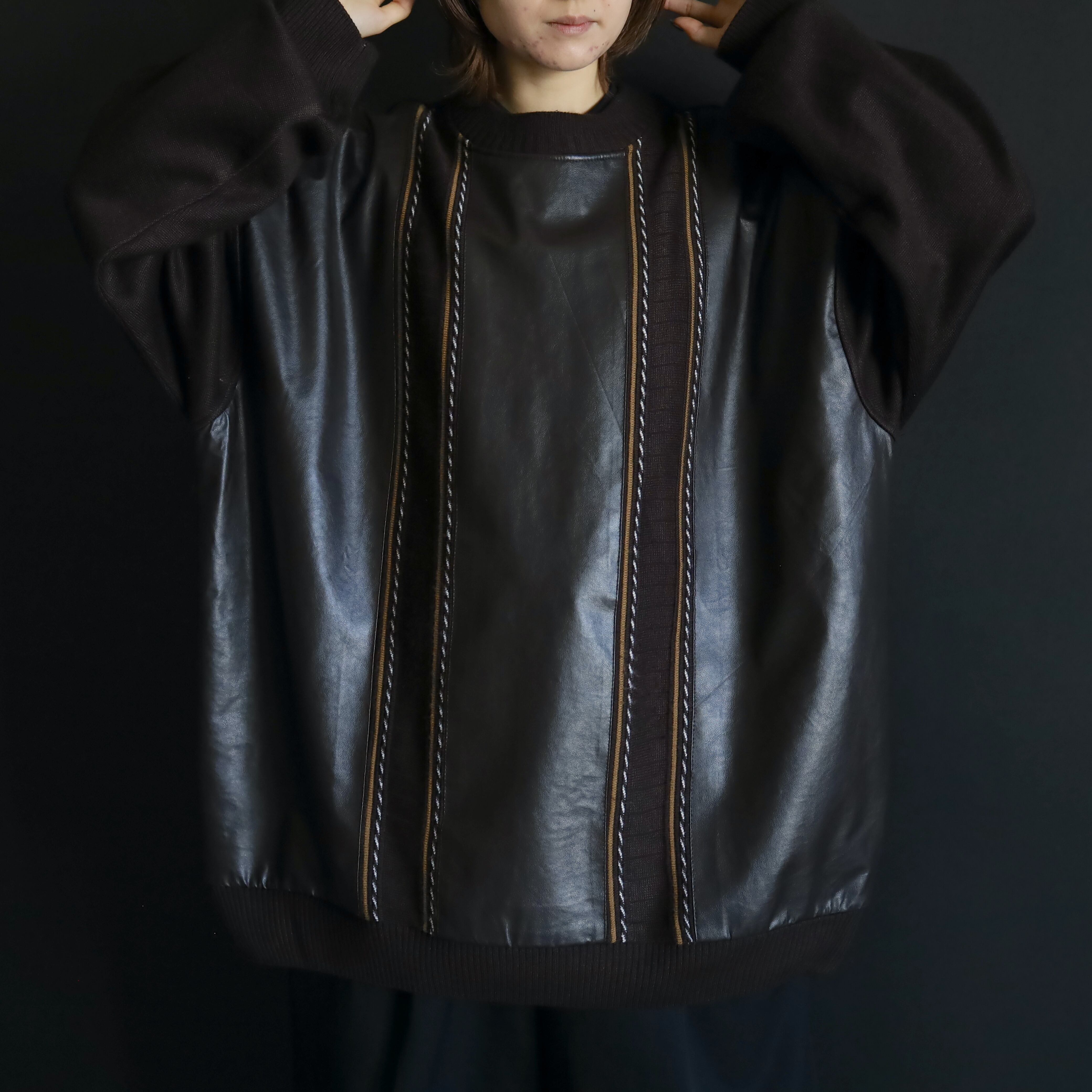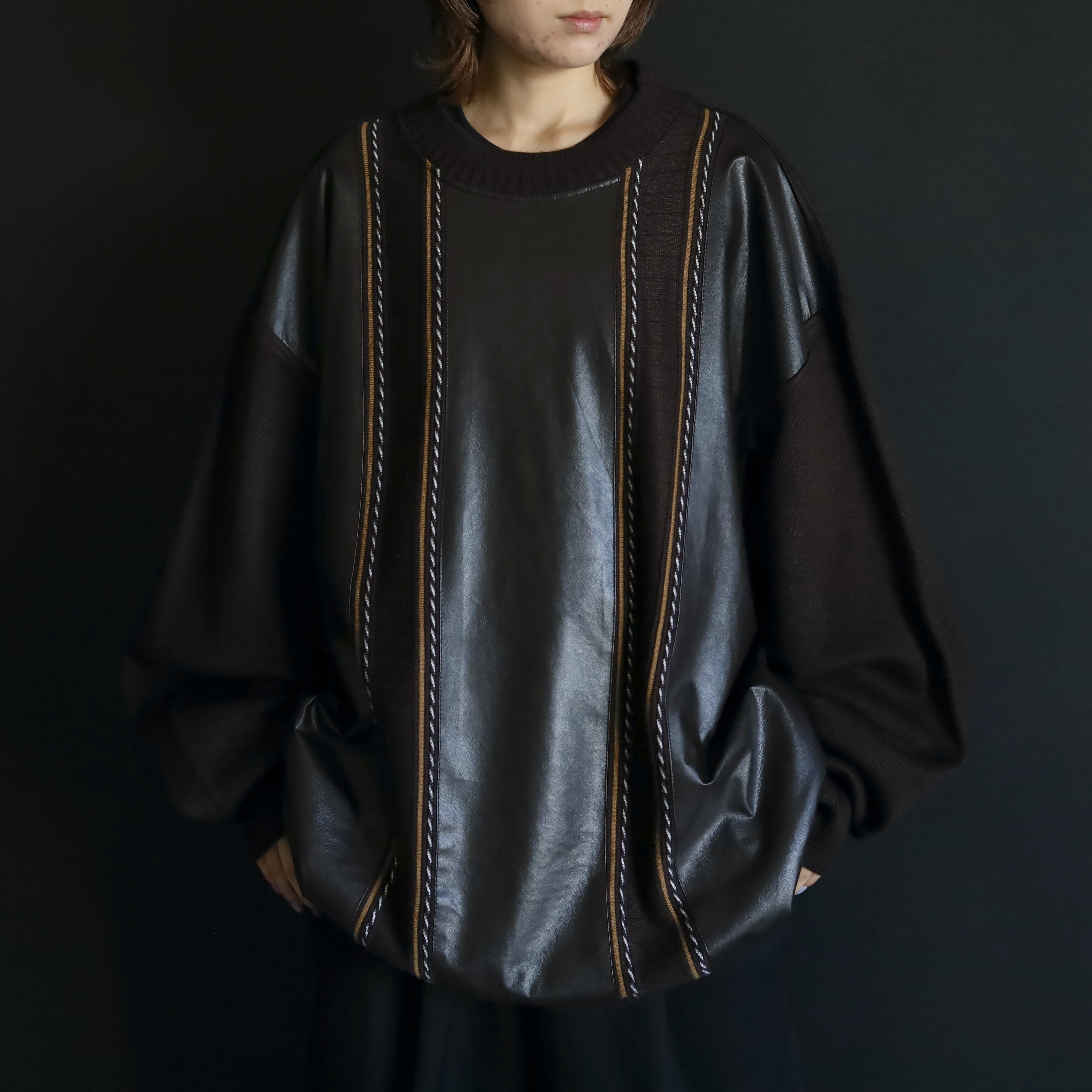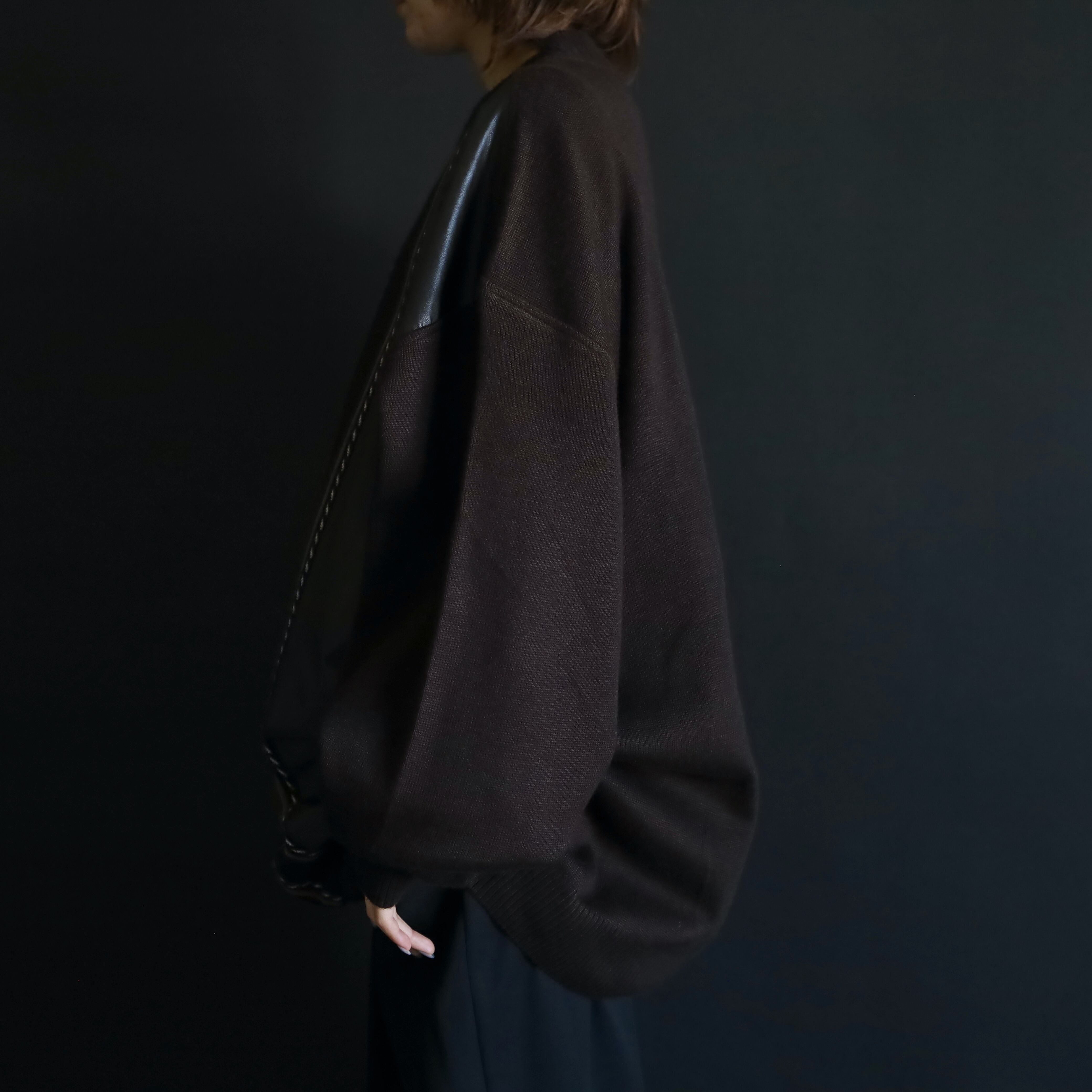 チョコレートブラウンのハイゲージニットをベースに,フロントもチョコレートブラウンのフェイクレザー切替.