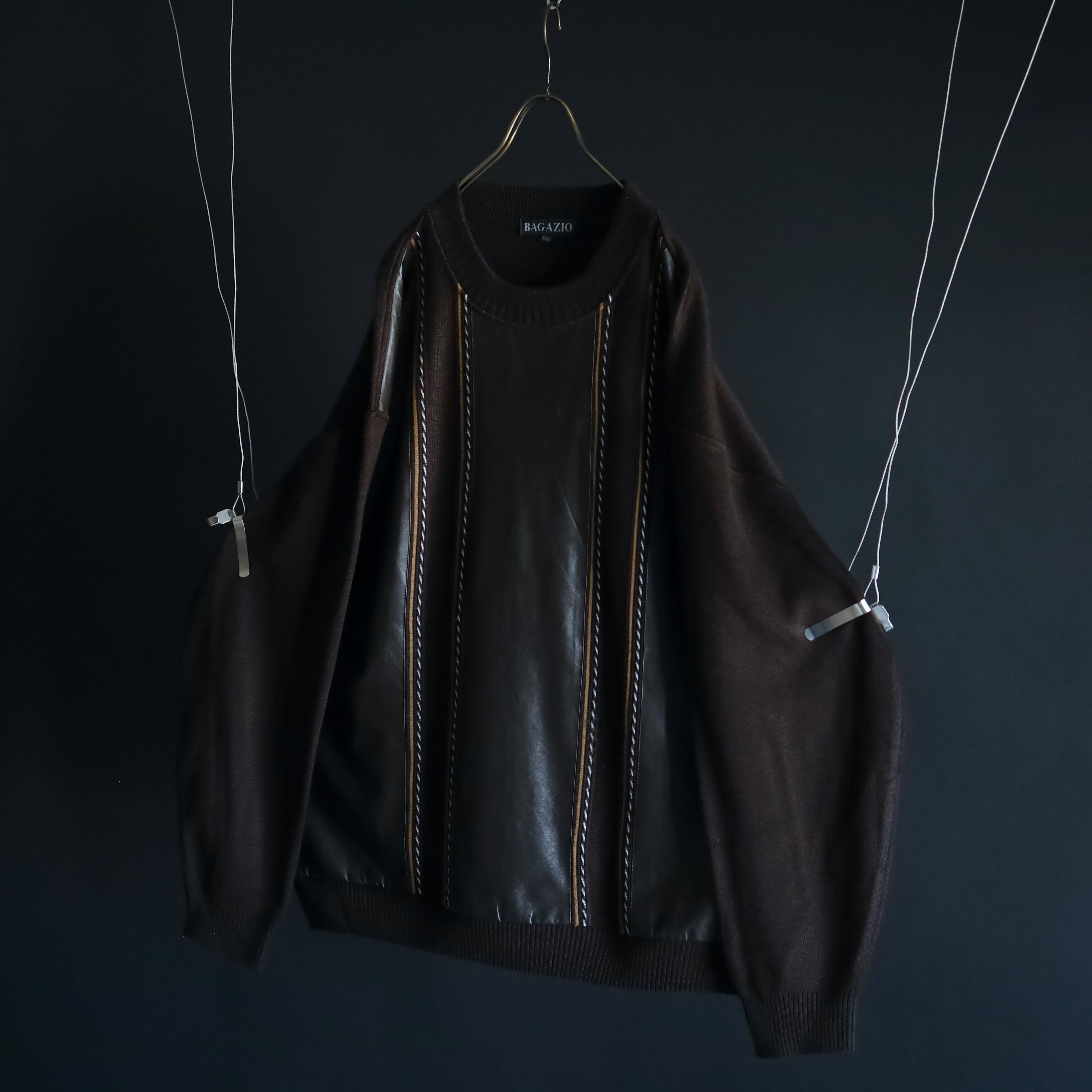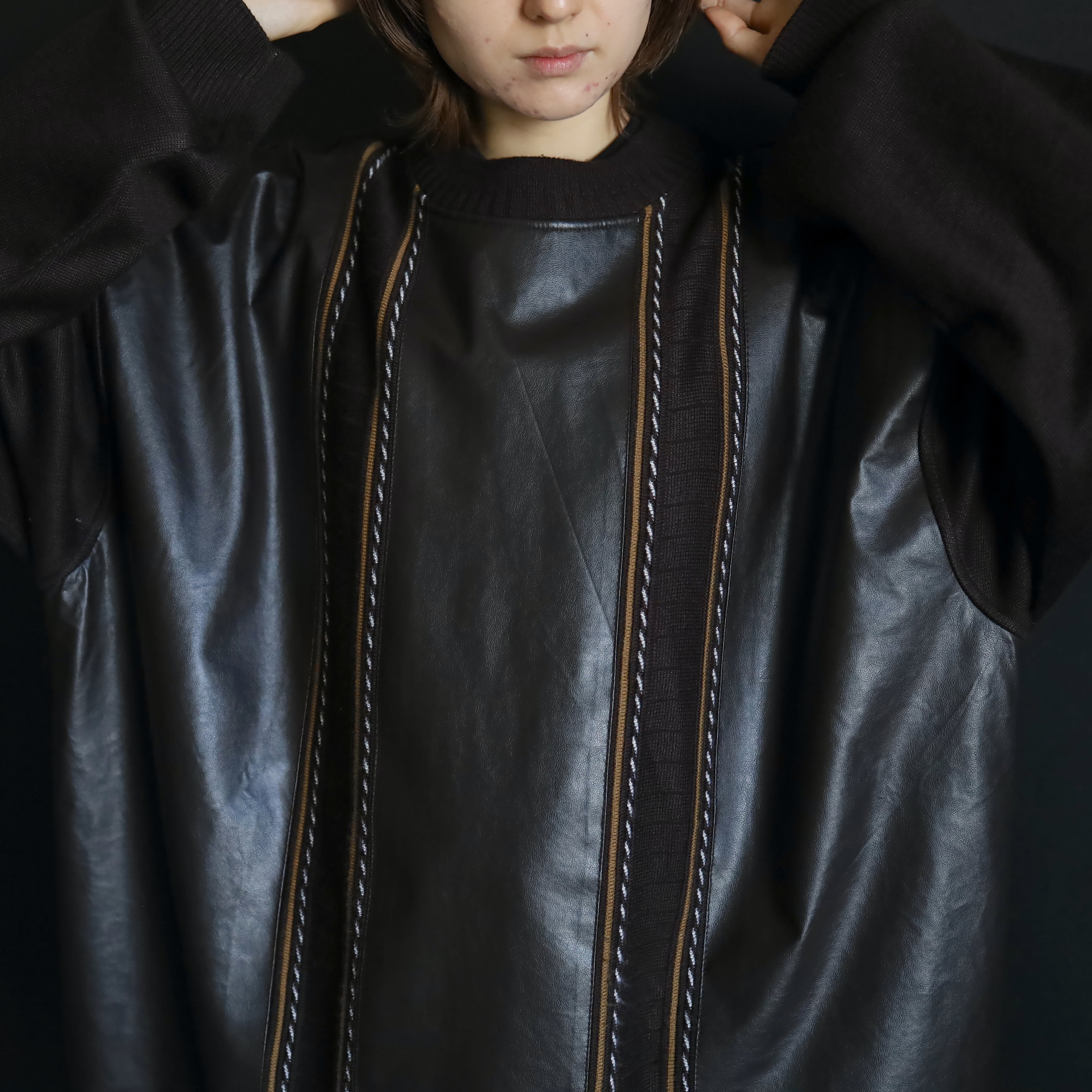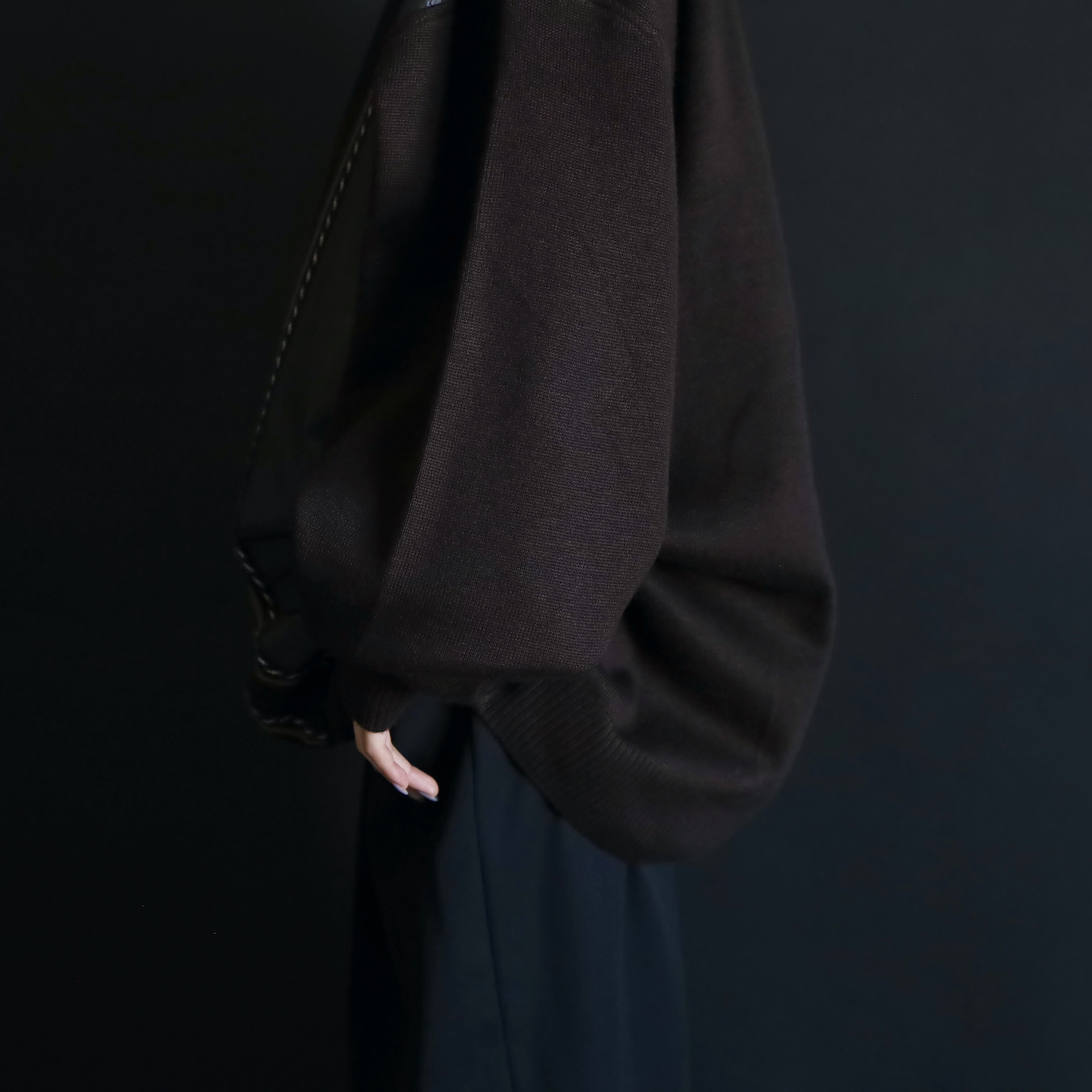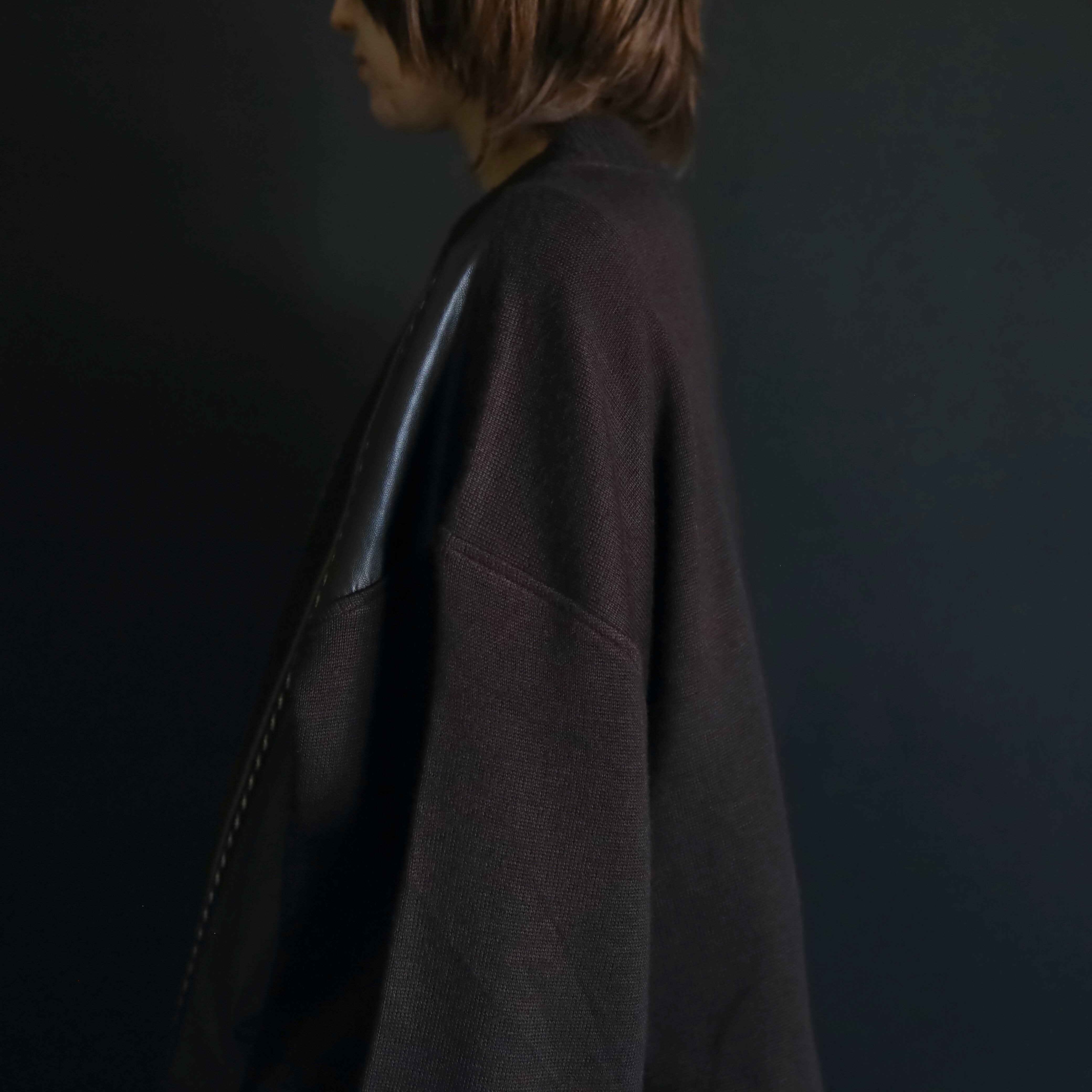 チョコレートブラウンのハイゲージニットをベースに,フロントもチョコレートブラウンのフェイクレザー切替.