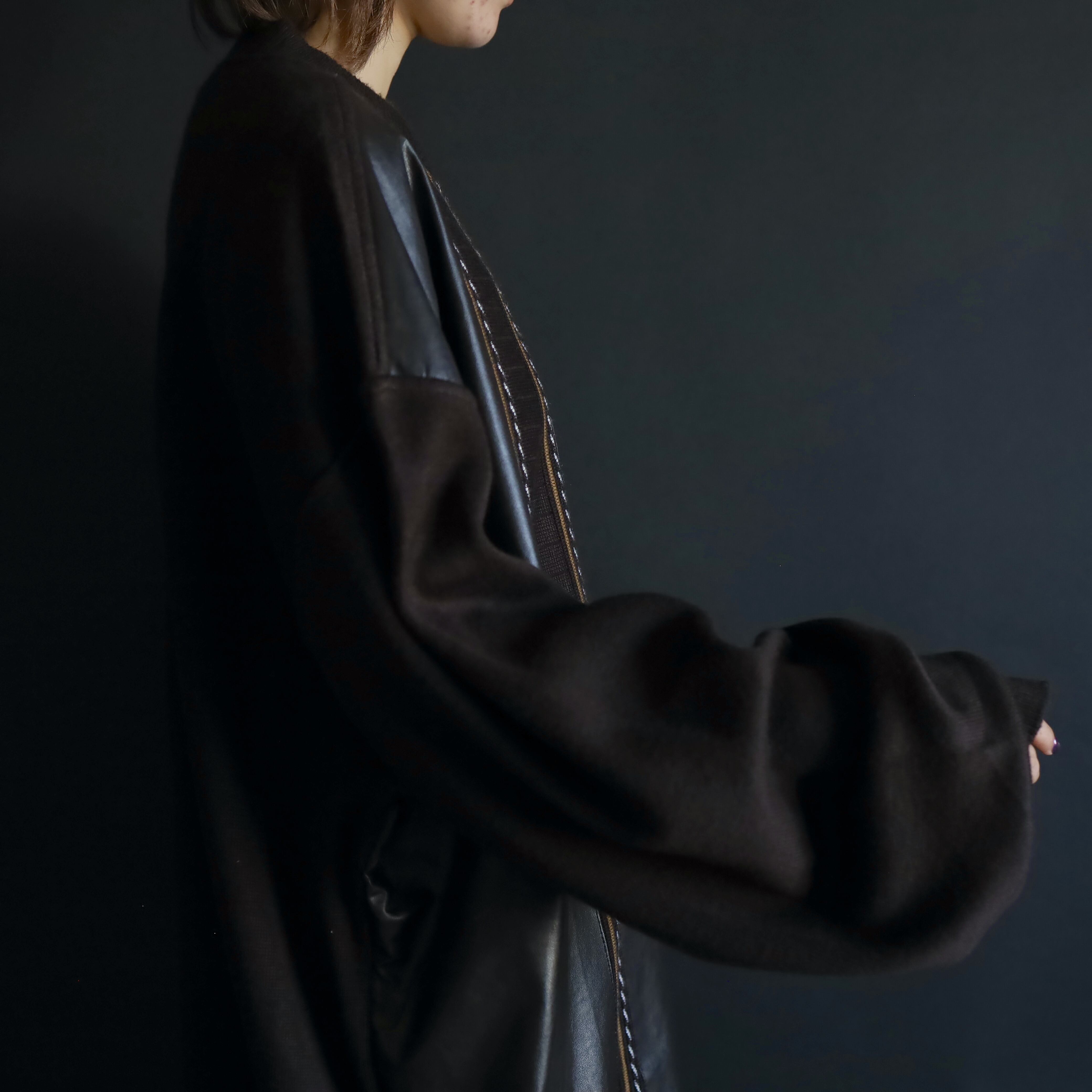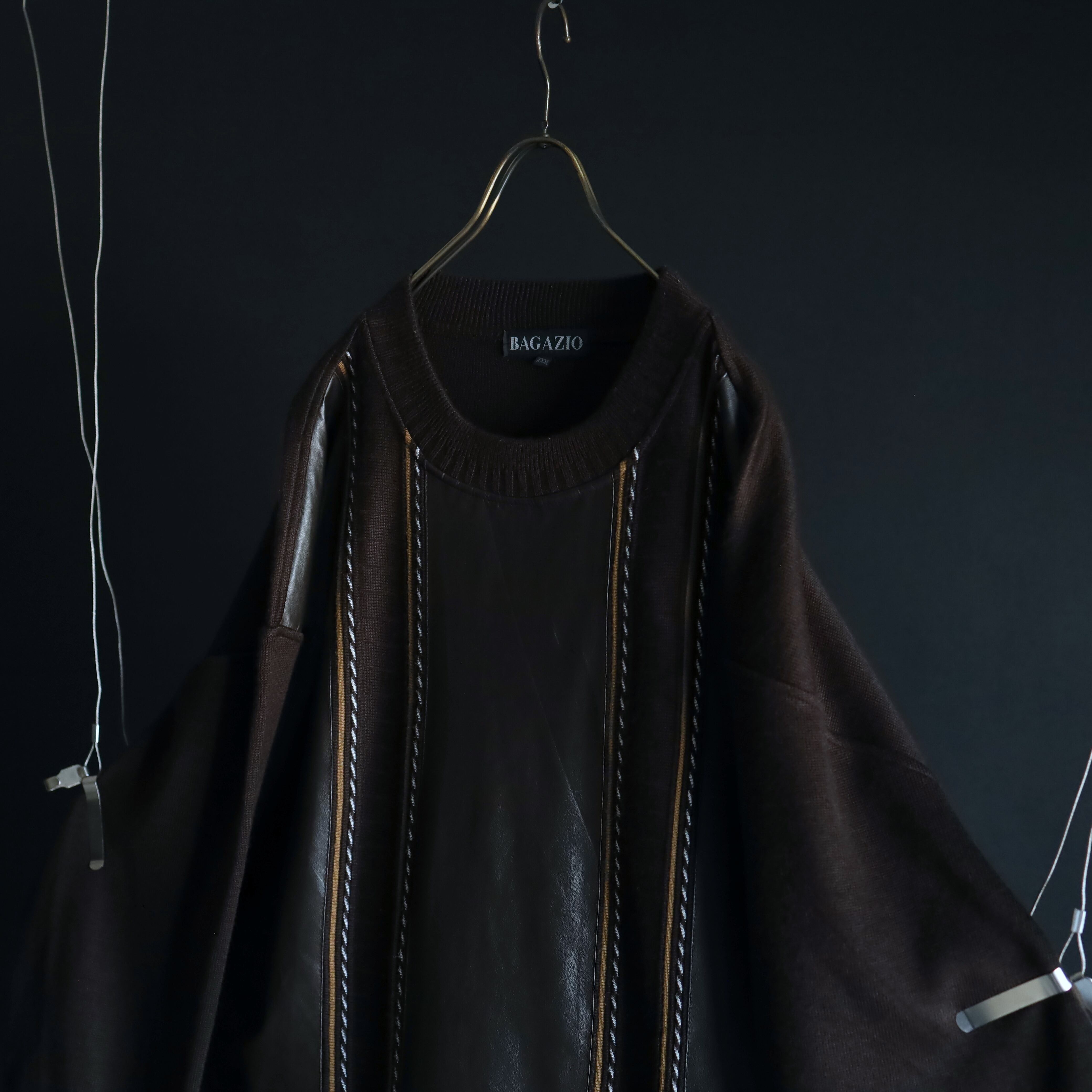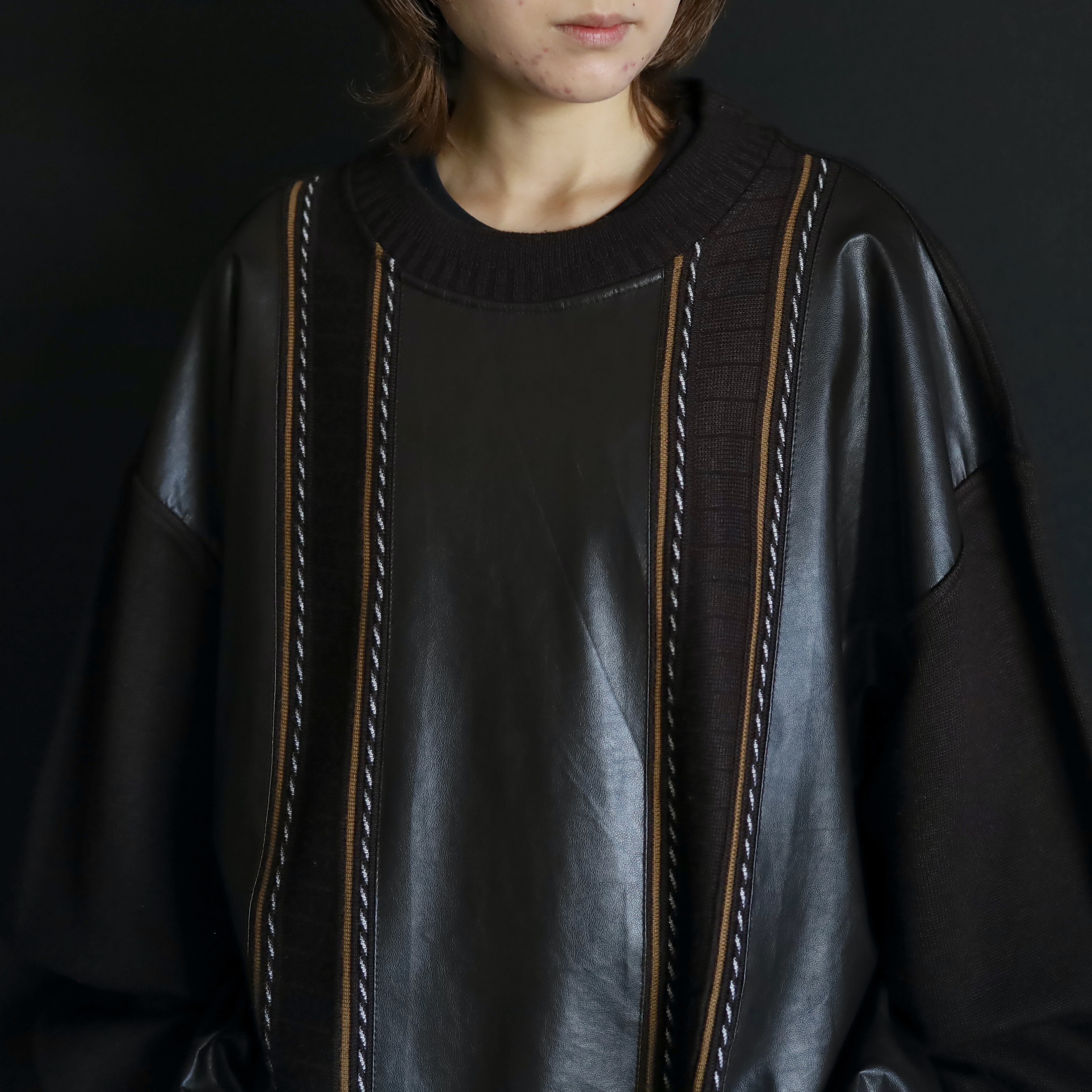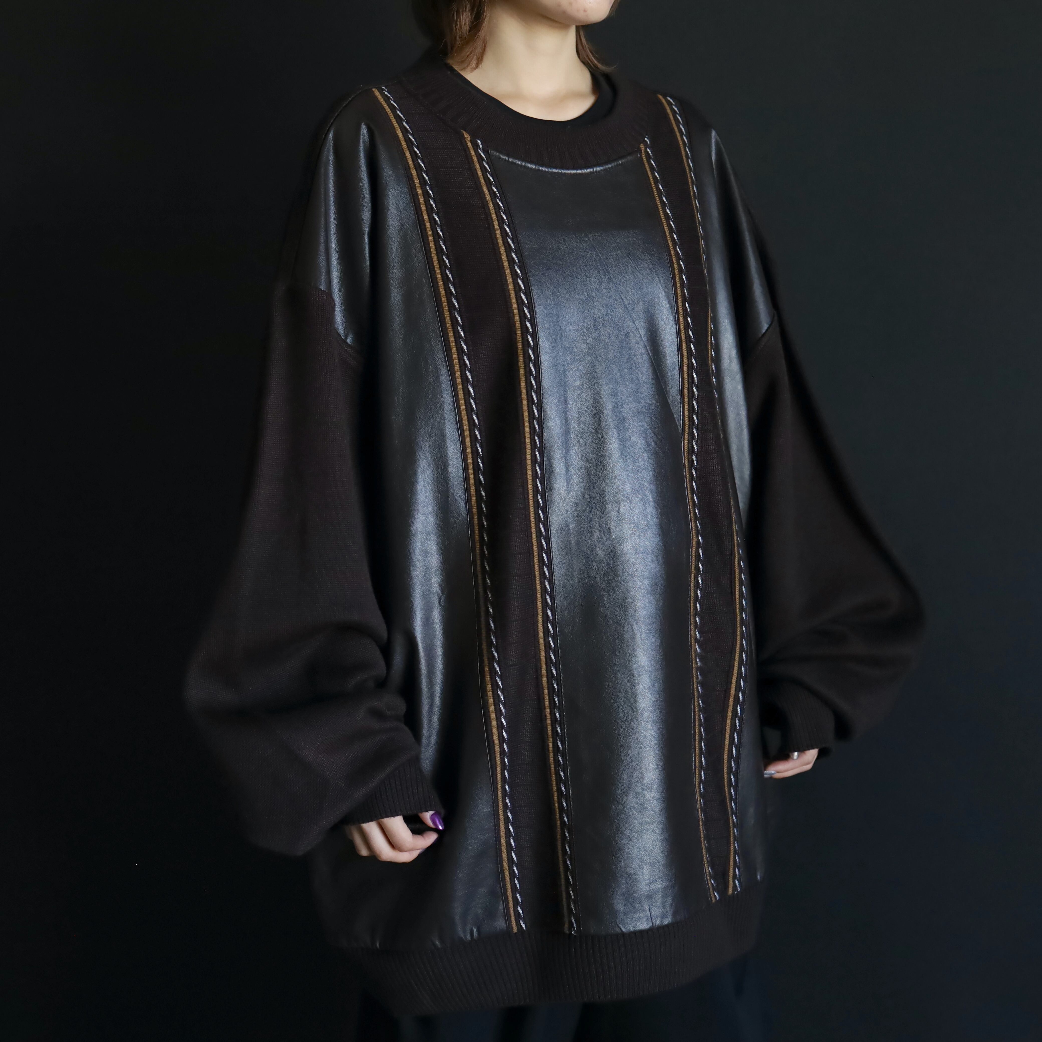チョコレートブラウンのハイゲージニットをベースに,フロントもチョコレートブラウンのフェイクレザー切替.