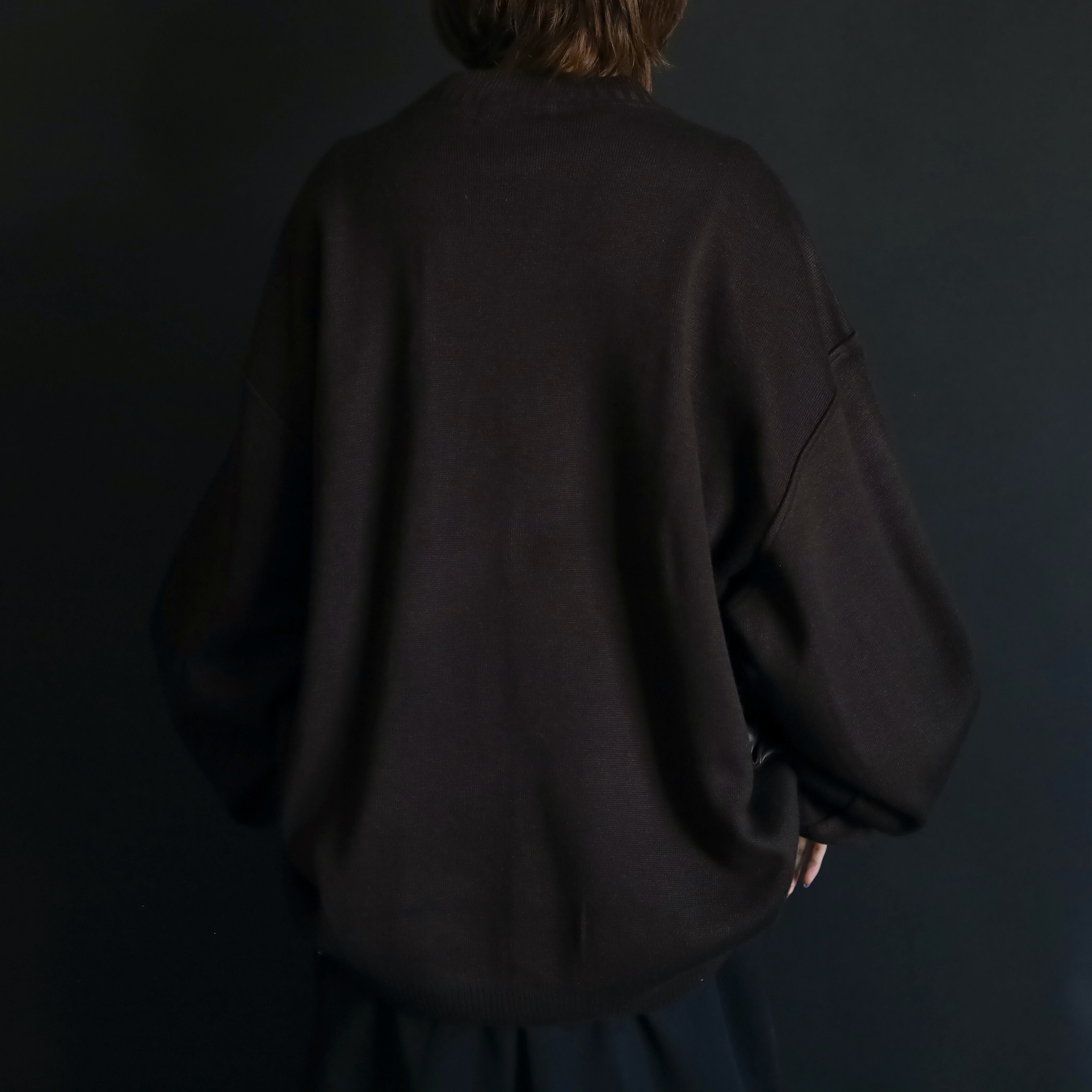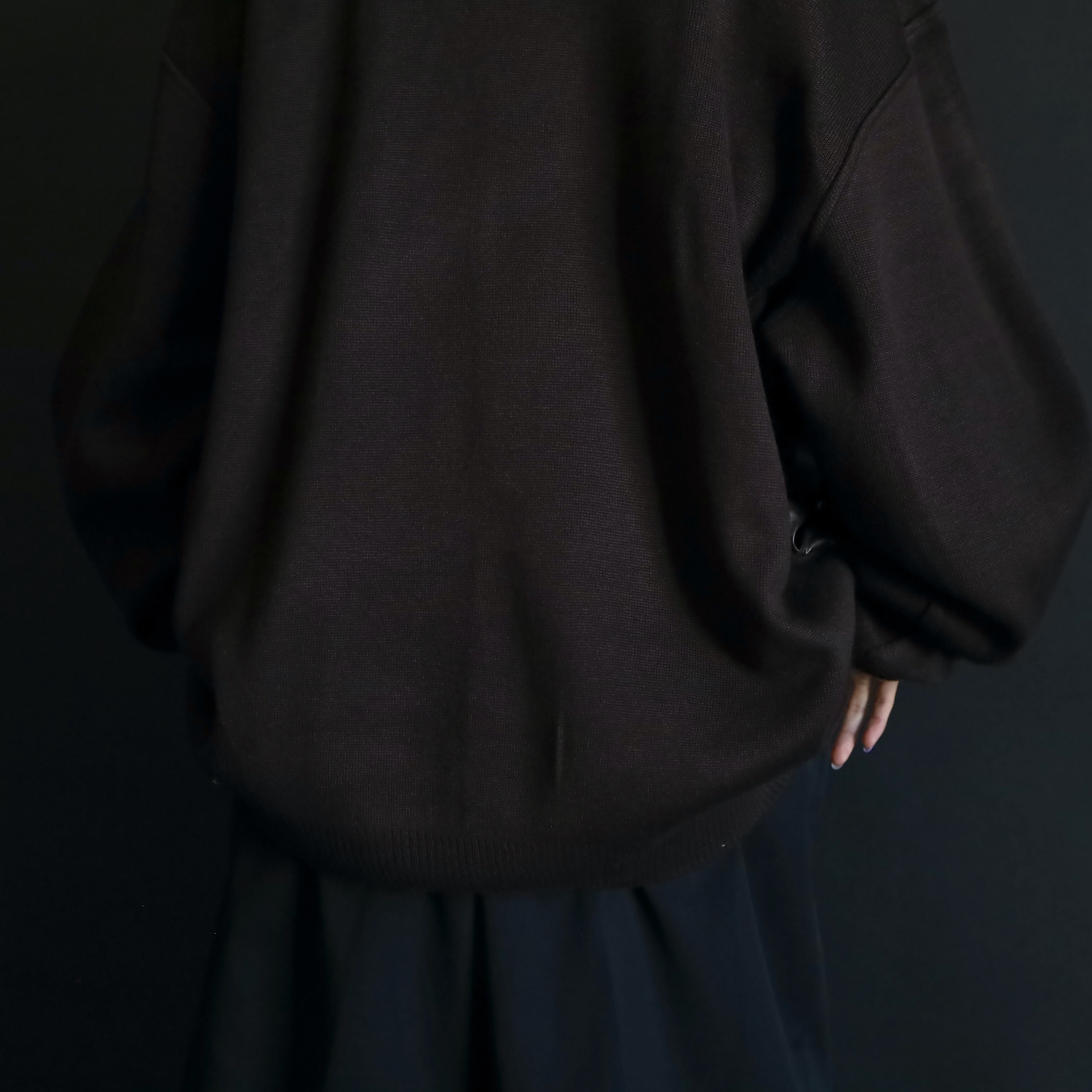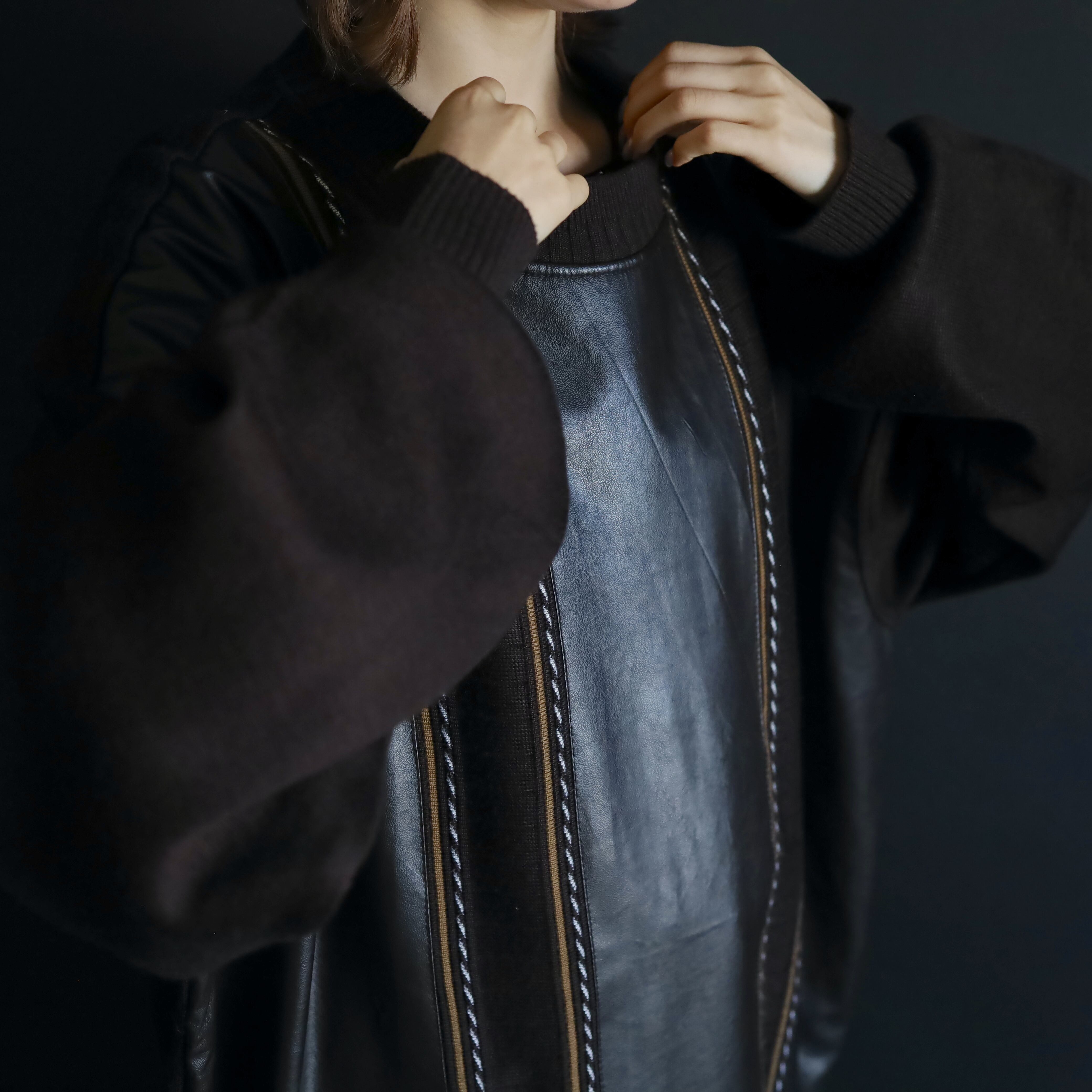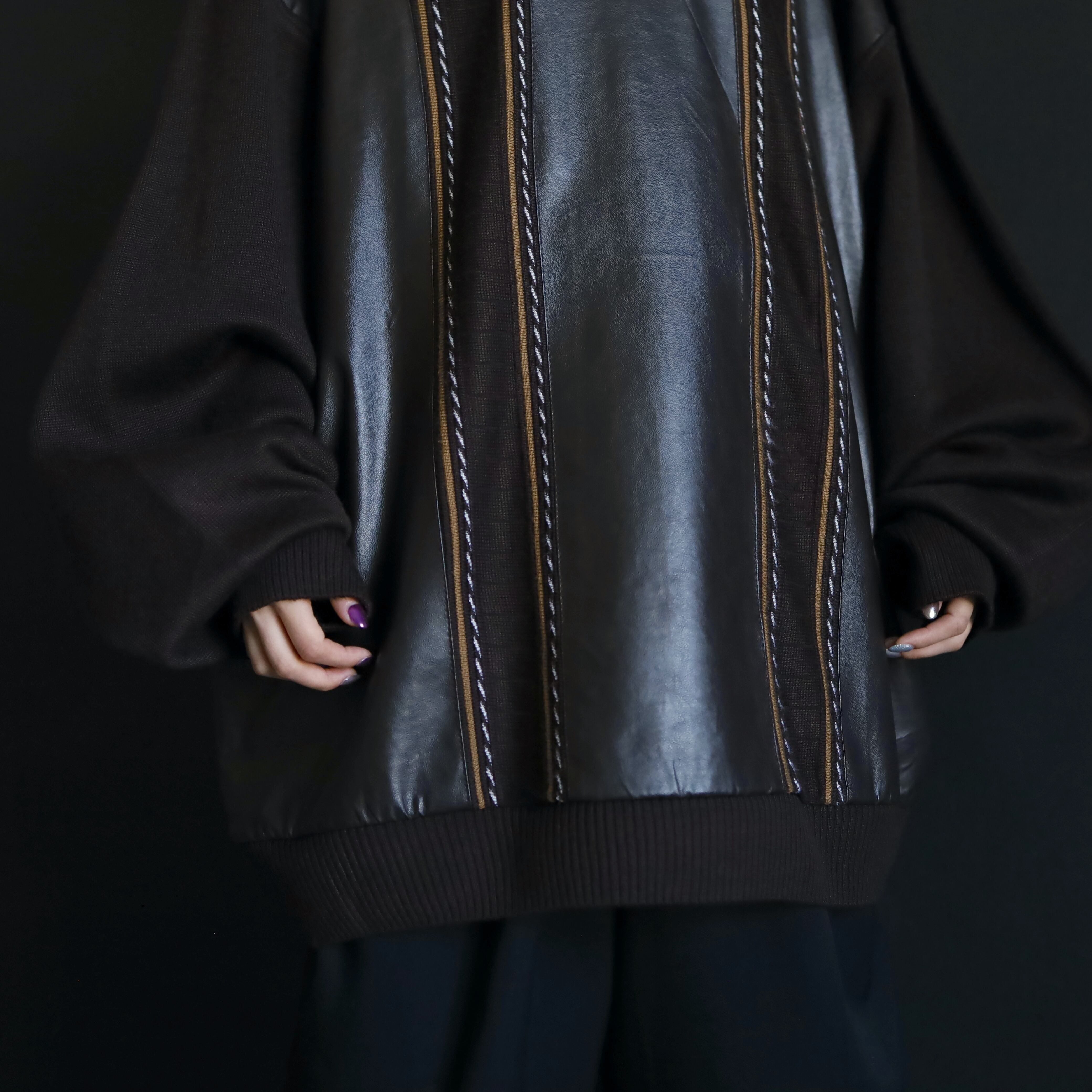 チョコレートブラウンのハイゲージニットをベースに,フロントもチョコレートブラウンのフェイクレザー切替.