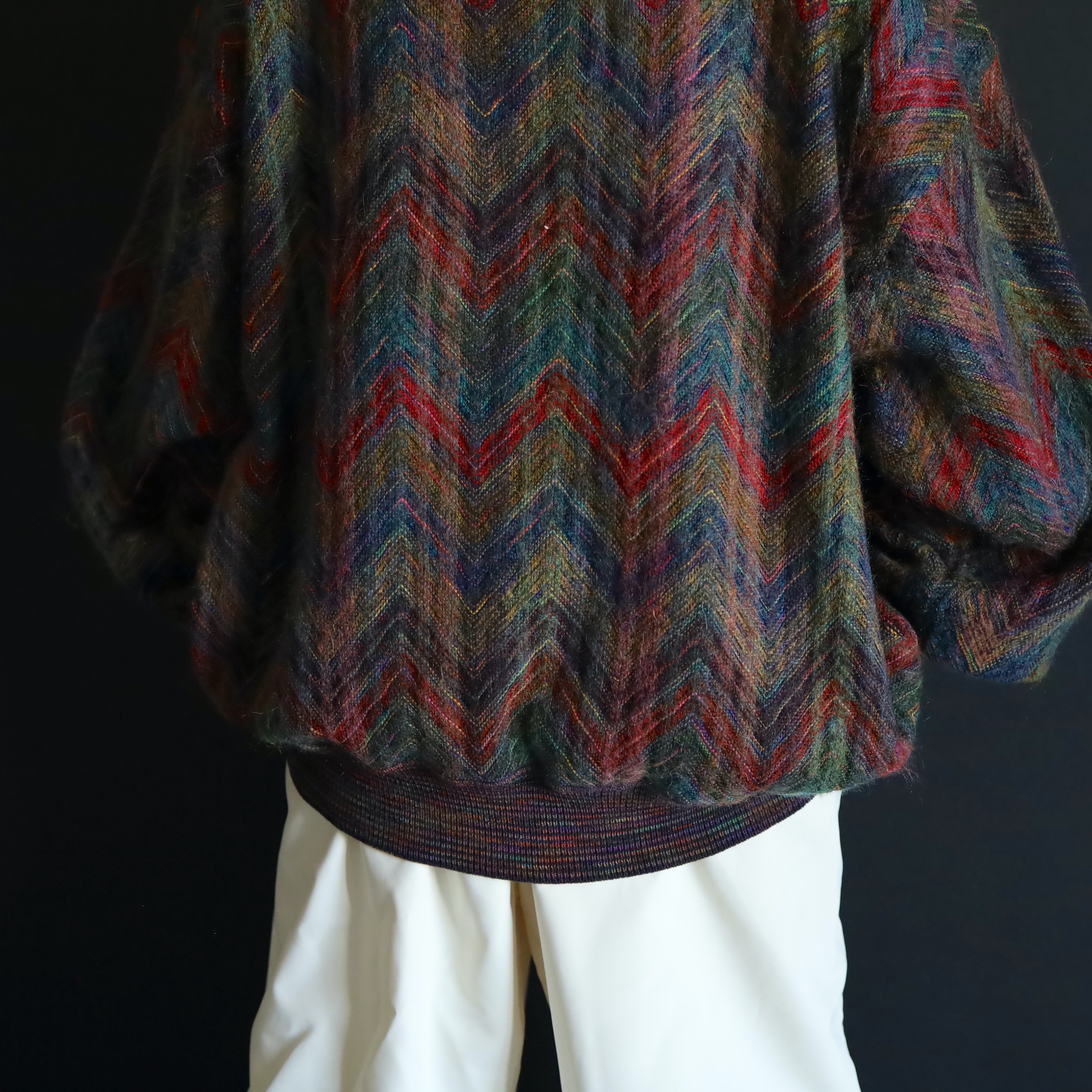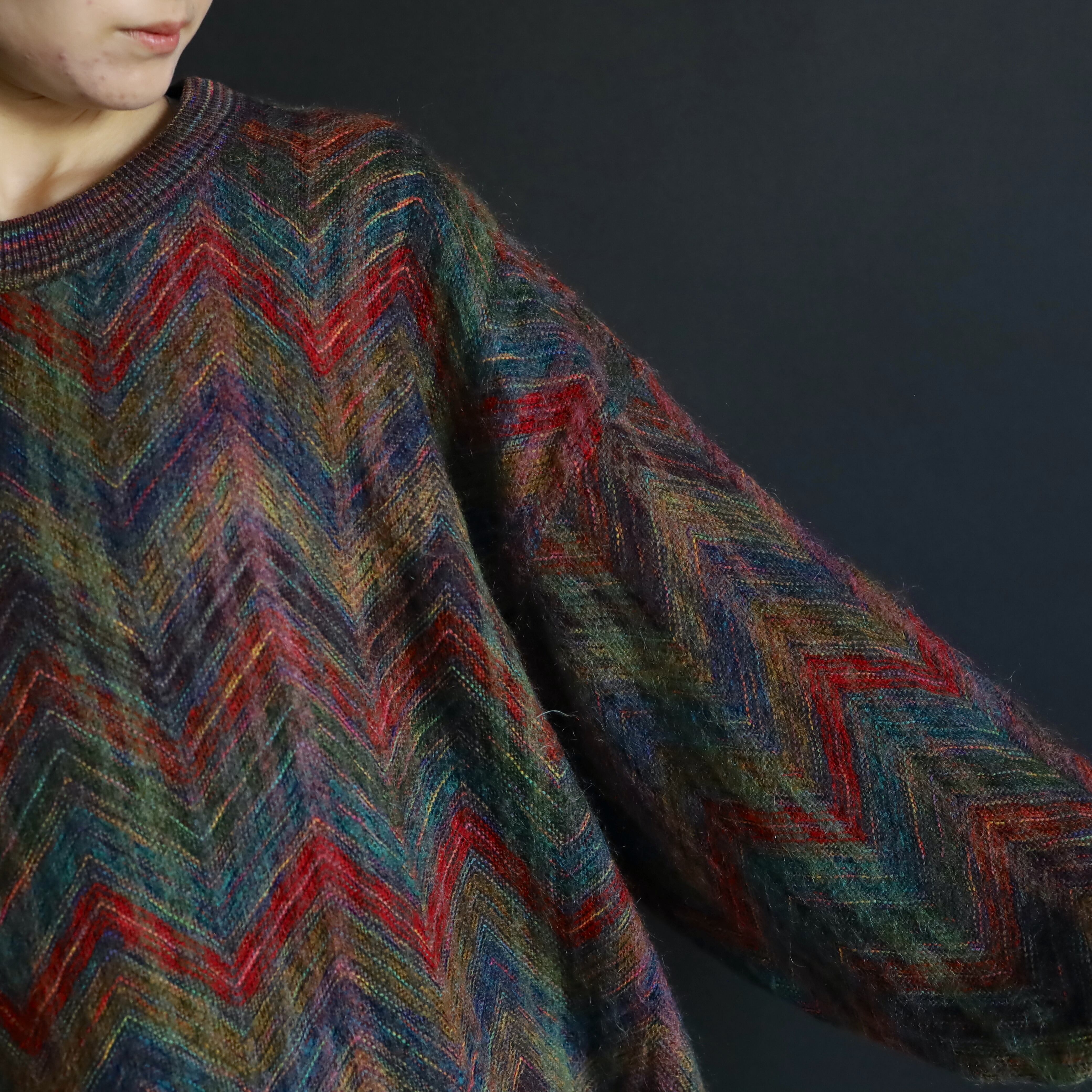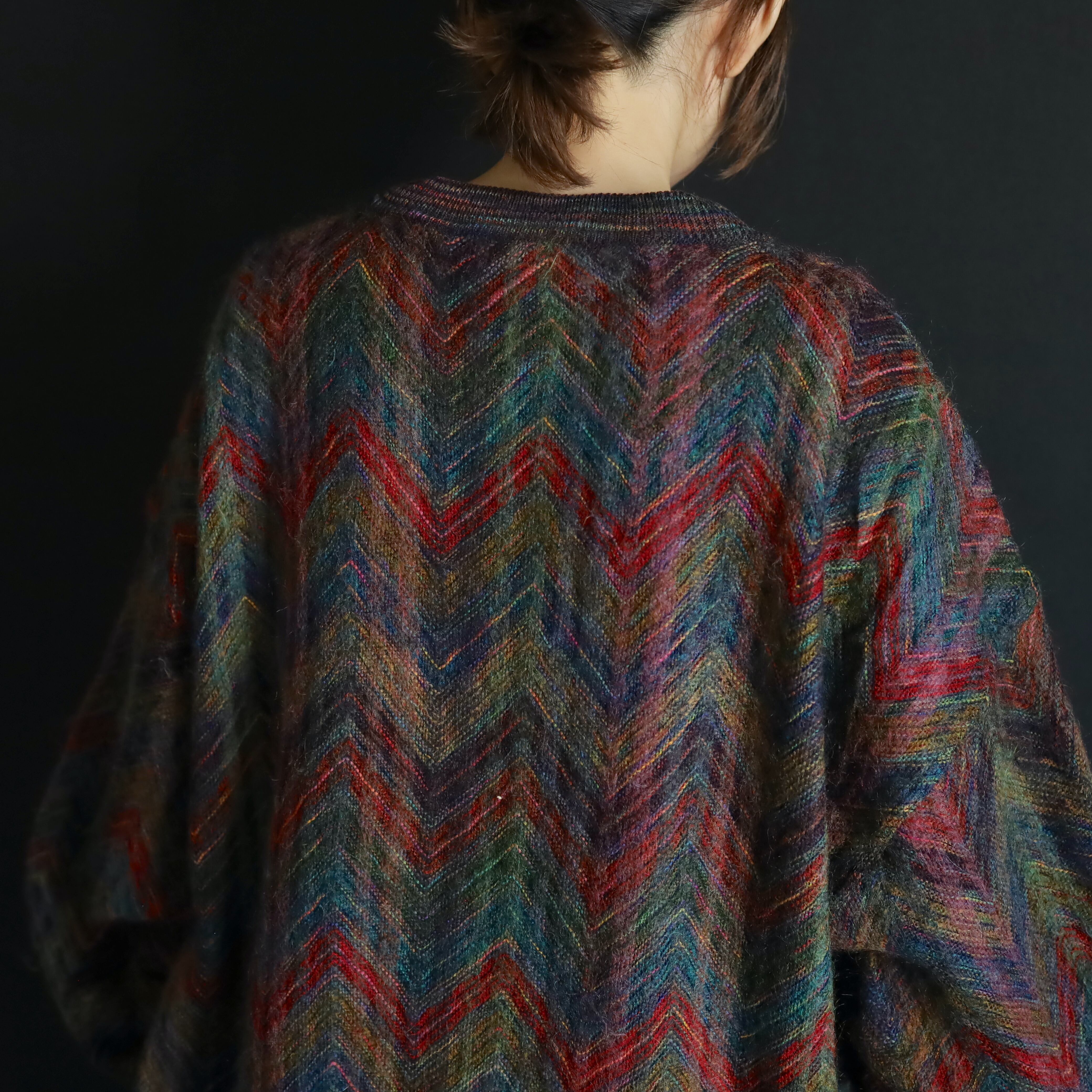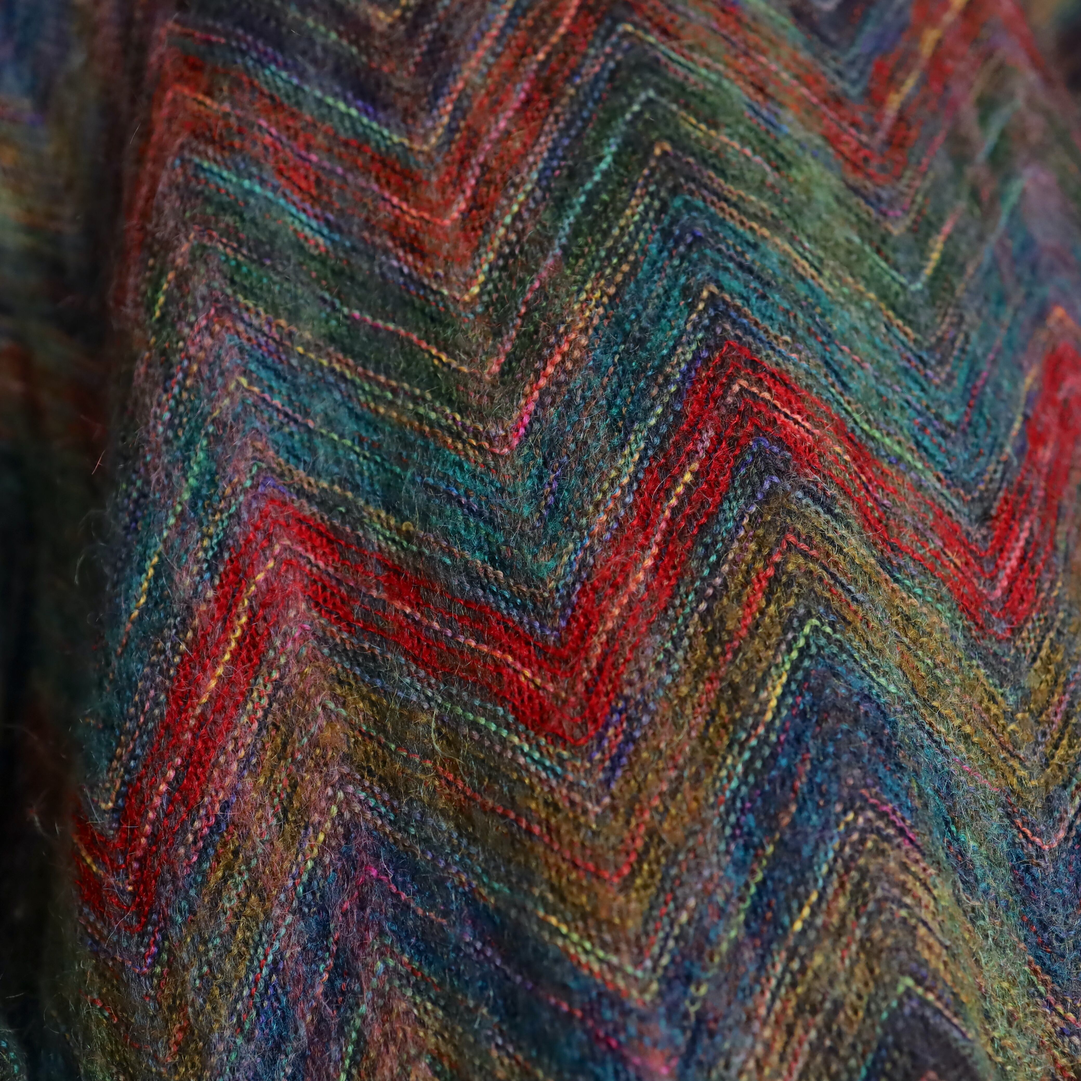 レッド,ブルー,ネイビー,ターコイズ,エメラルドなど,多くの鮮やかな色をグラデーション風に,そしてジグザグをモチーフの柄に編み込んだ一枚.