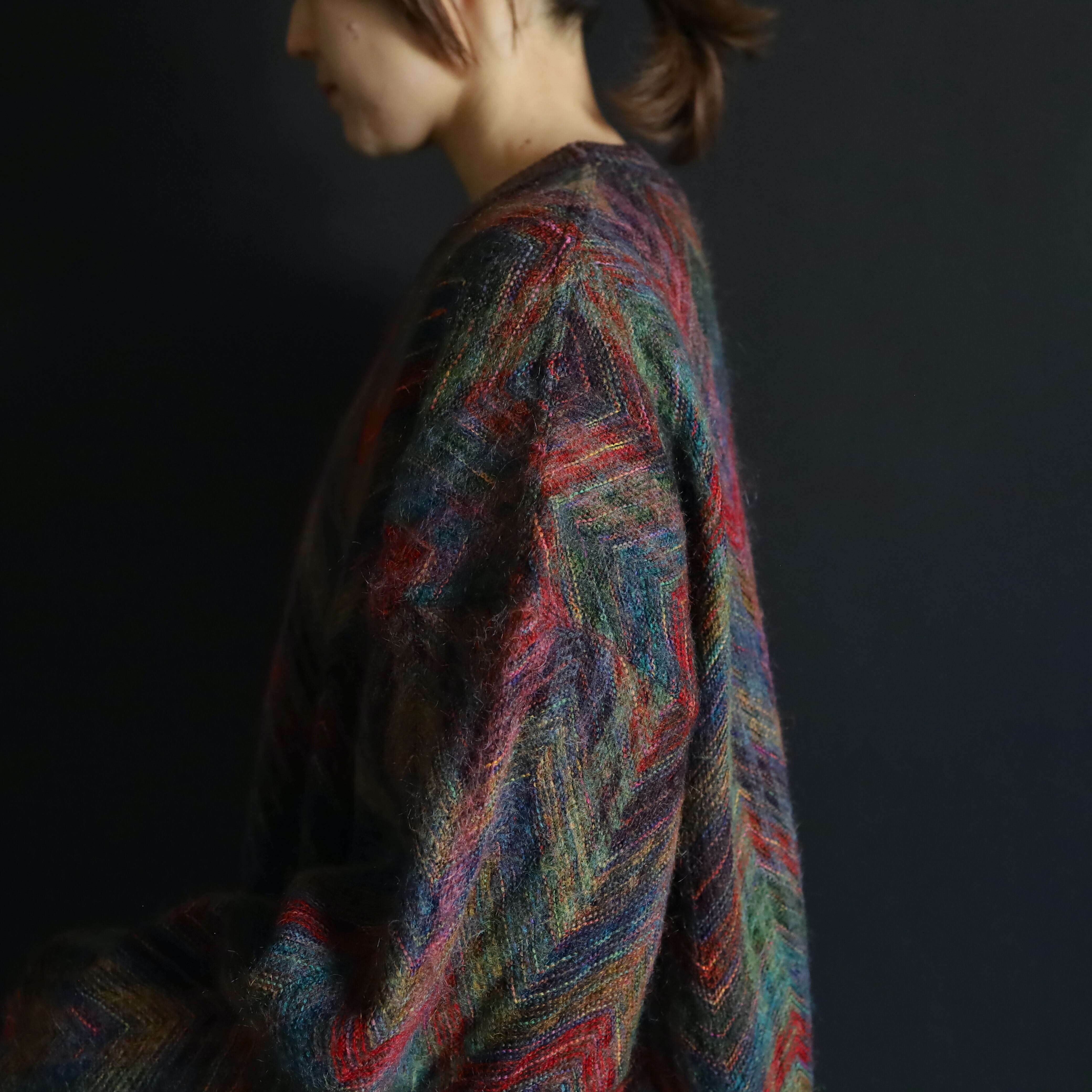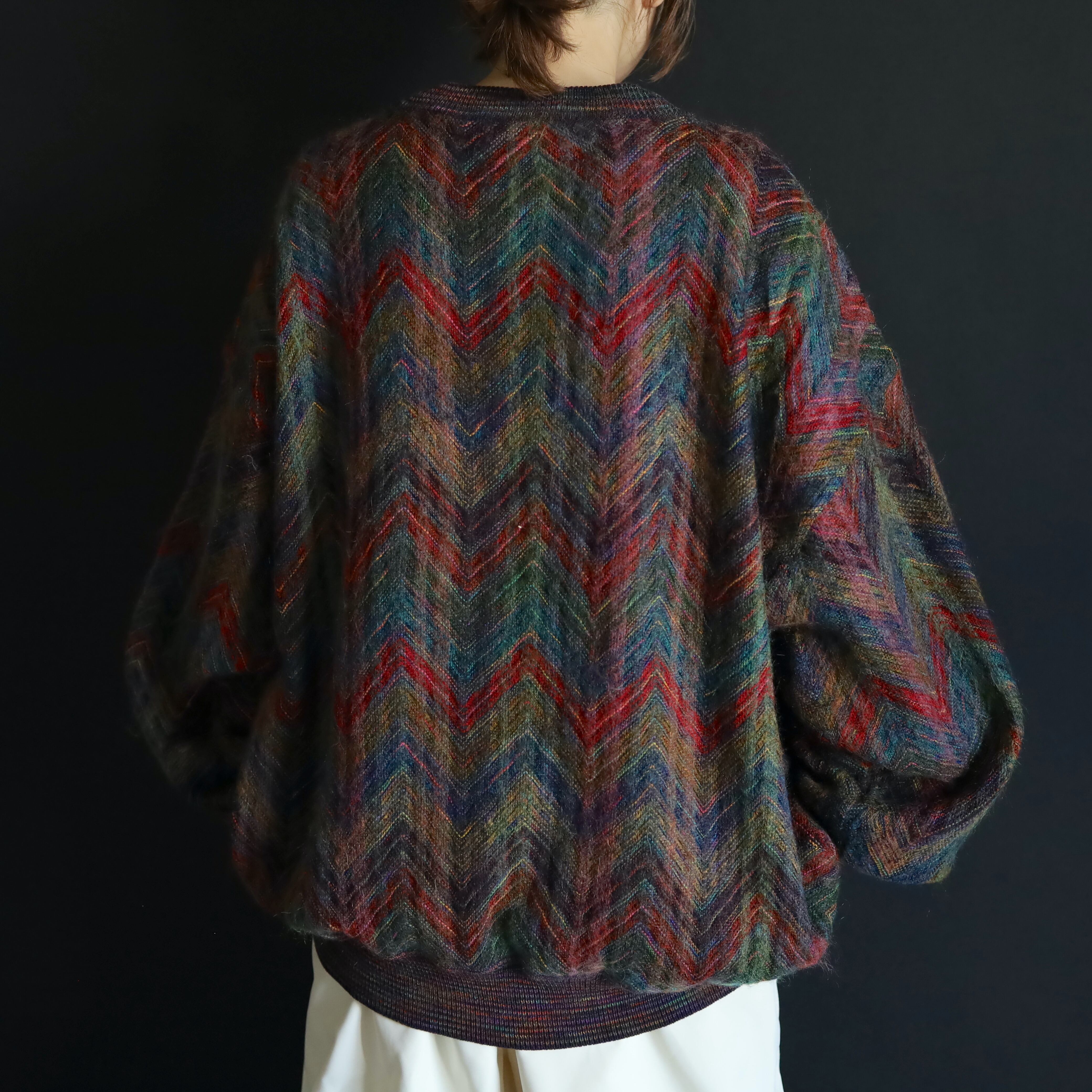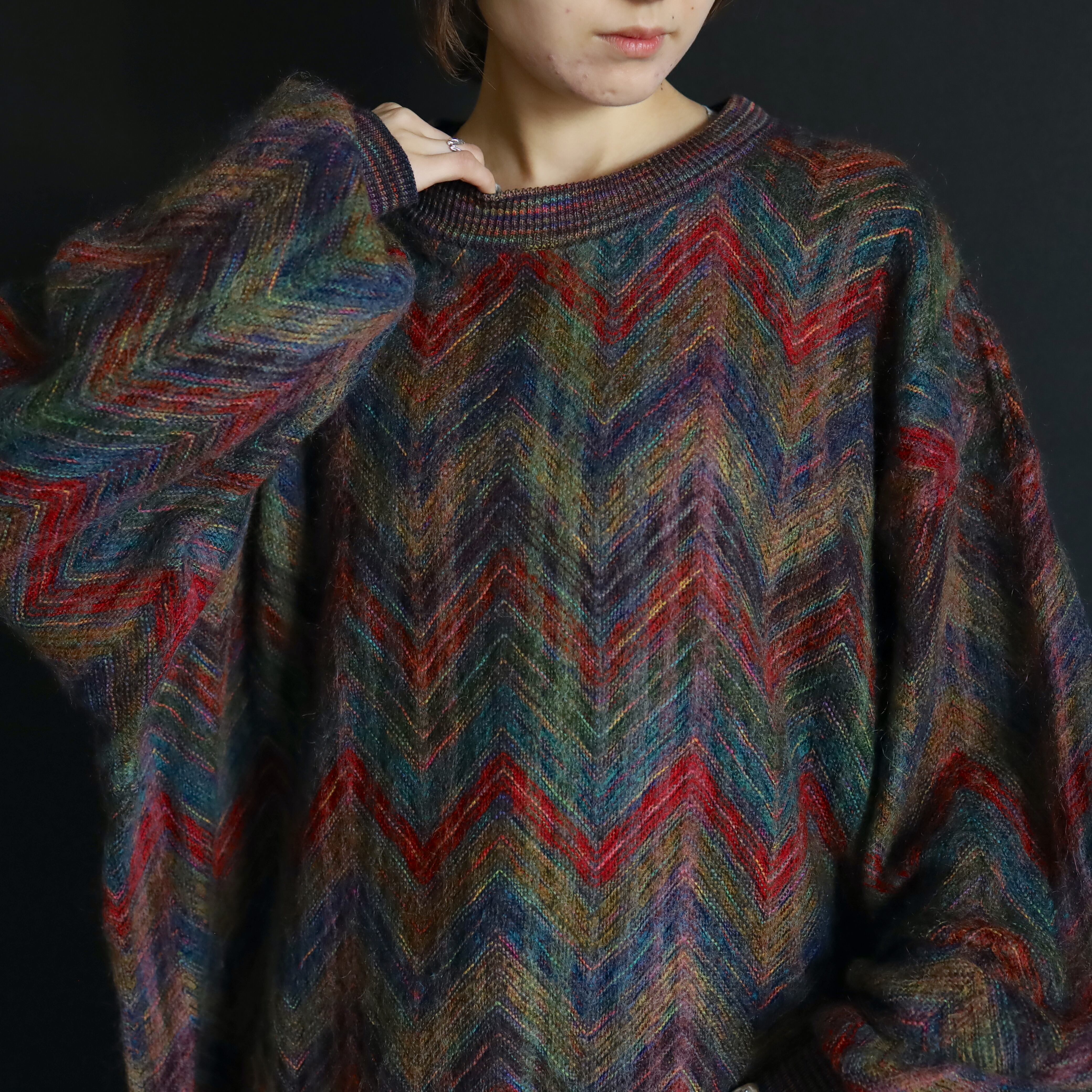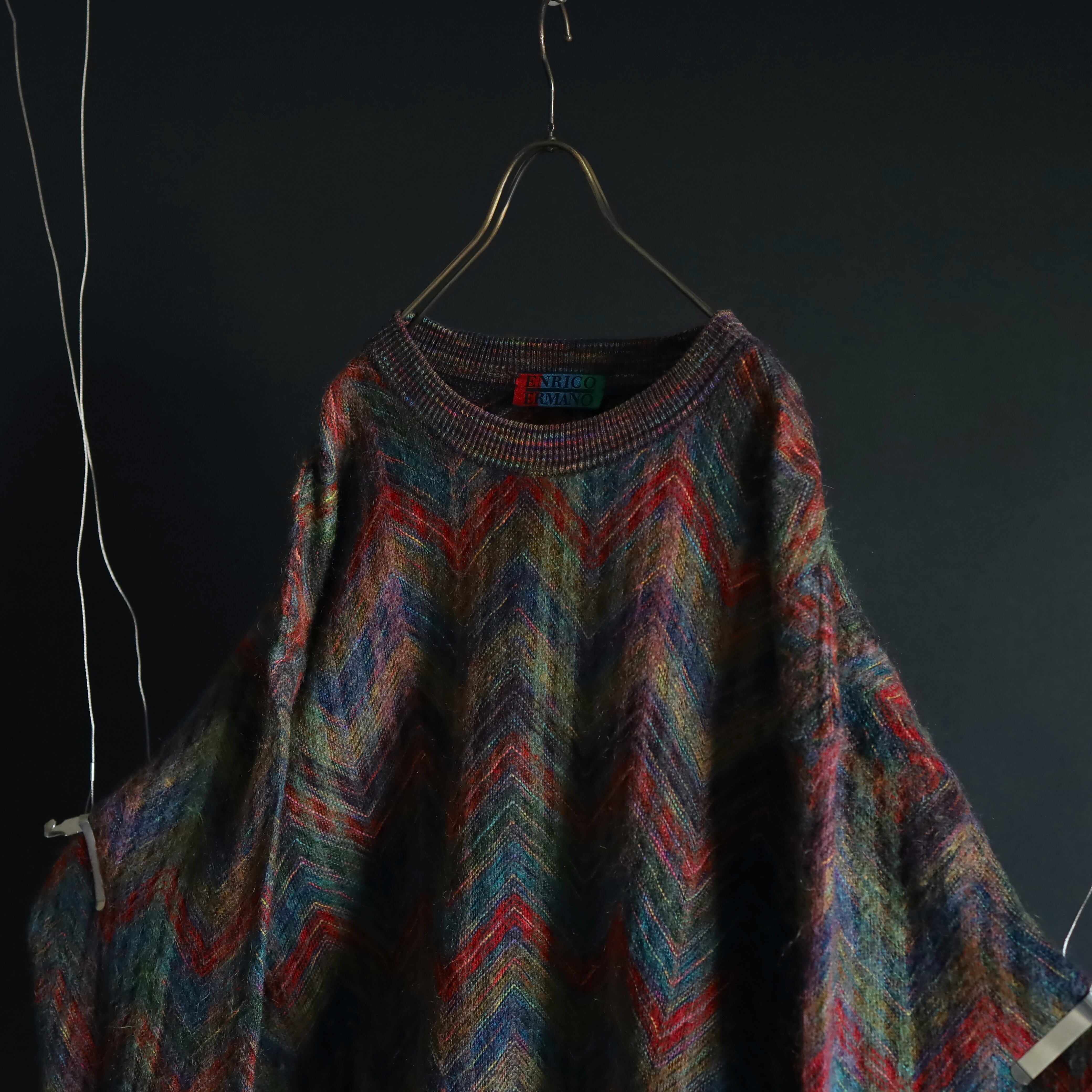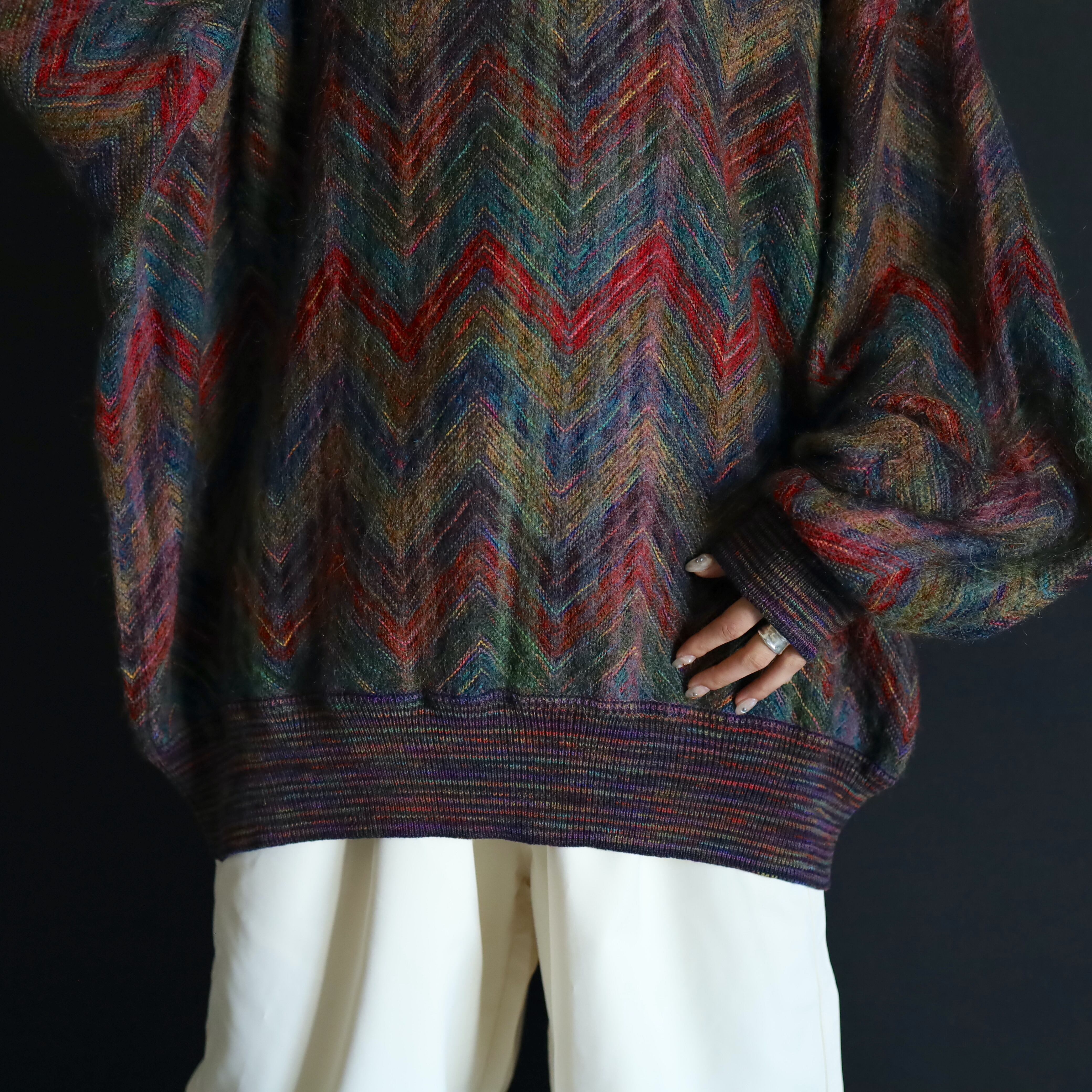 レッド,ブルー,ネイビー,ターコイズ,エメラルドなど,多くの鮮やかな色をグラデーション風に,そしてジグザグをモチーフの柄に編み込んだ一枚.