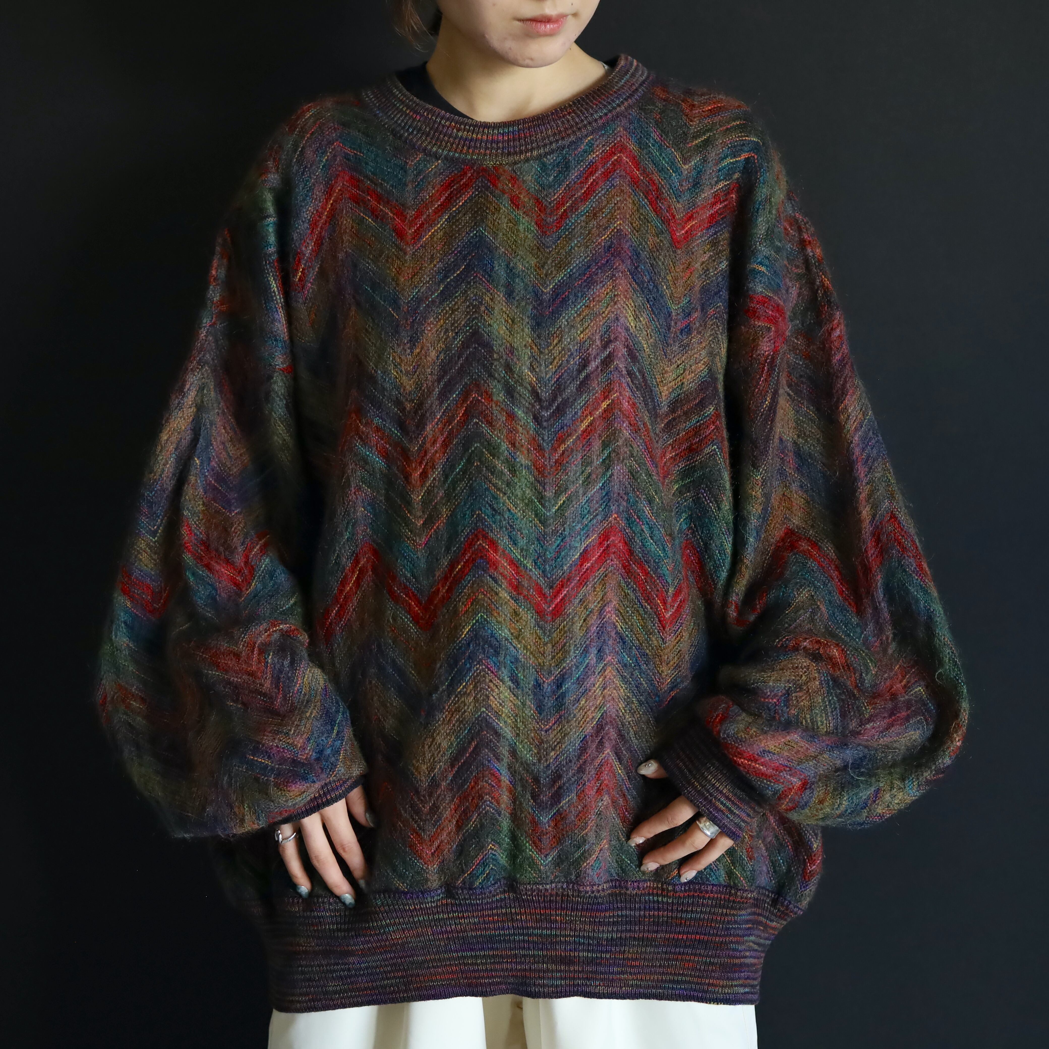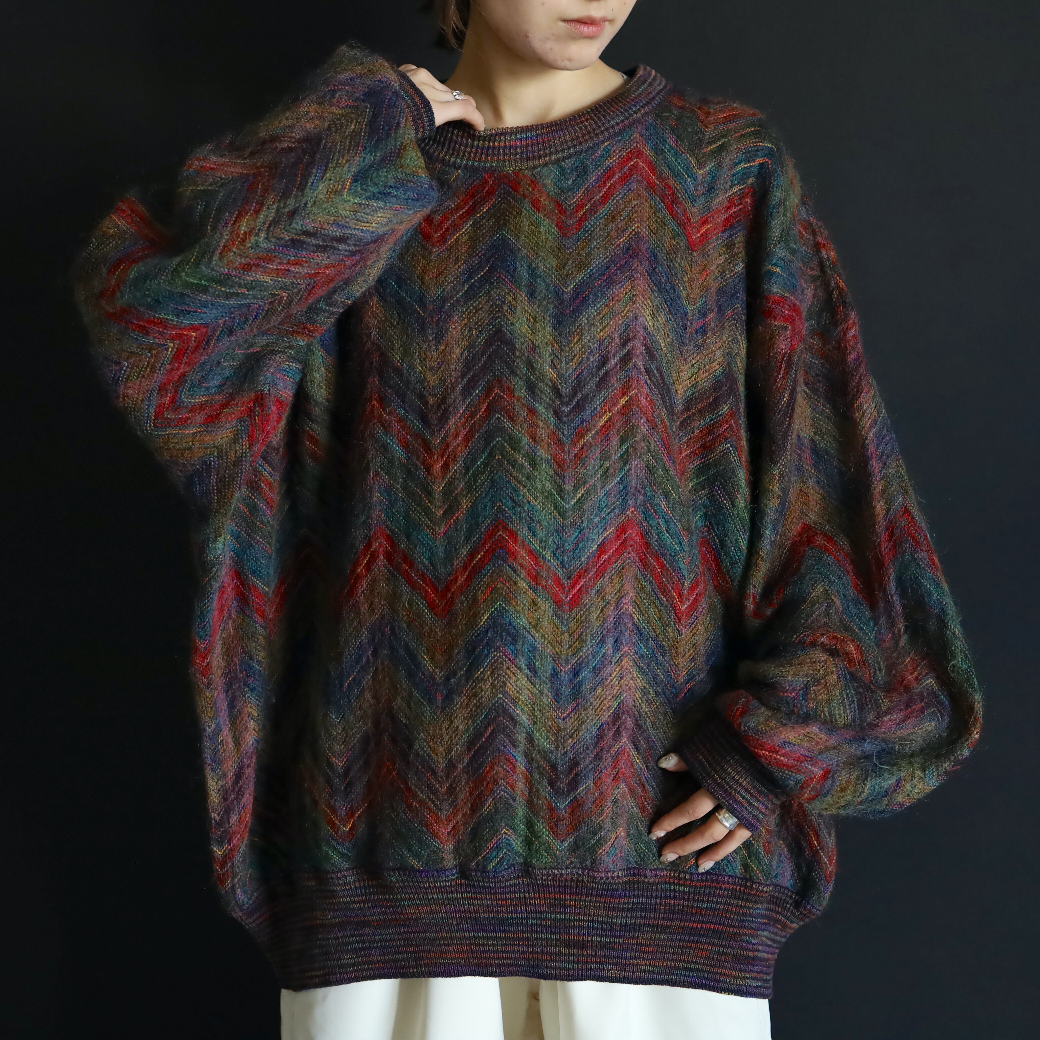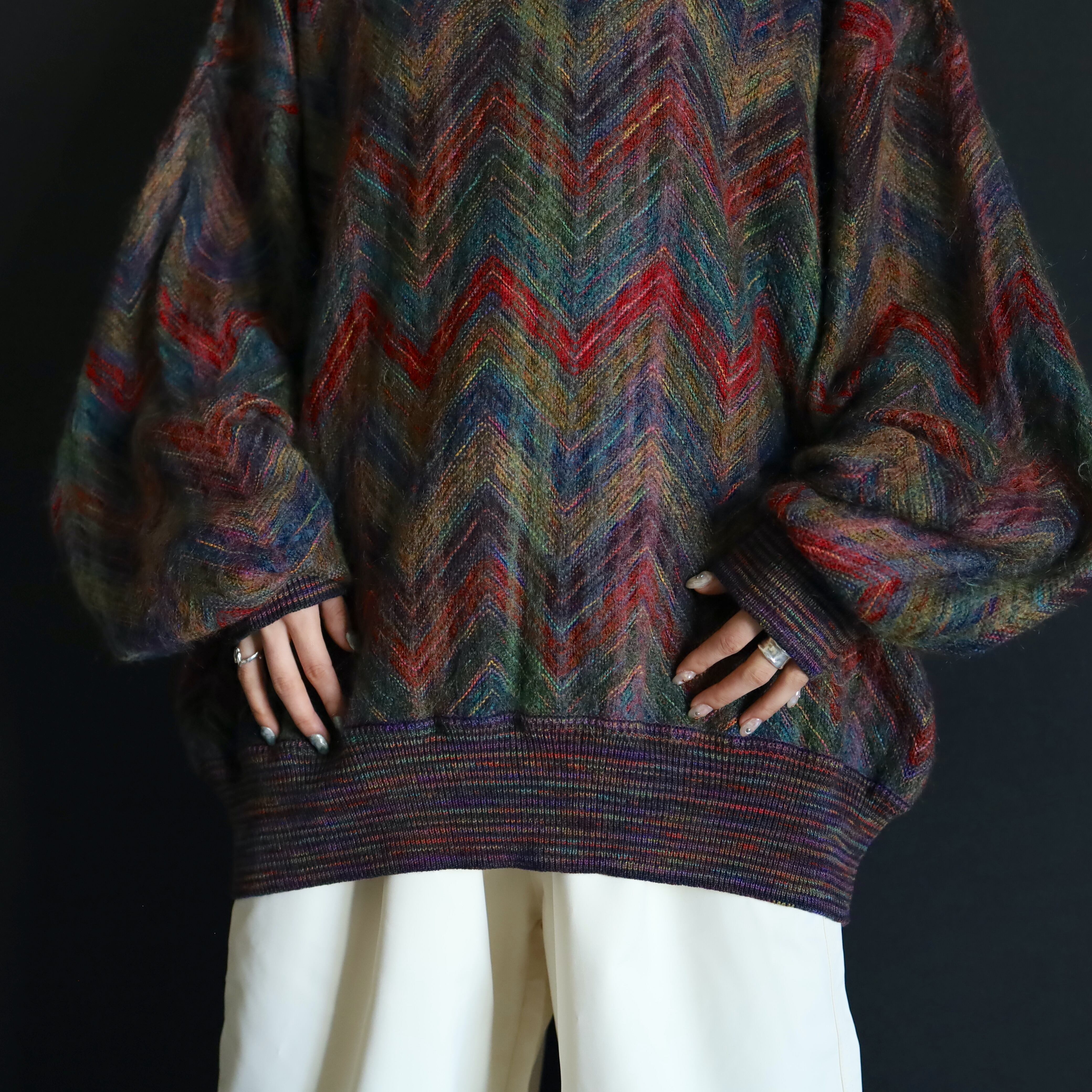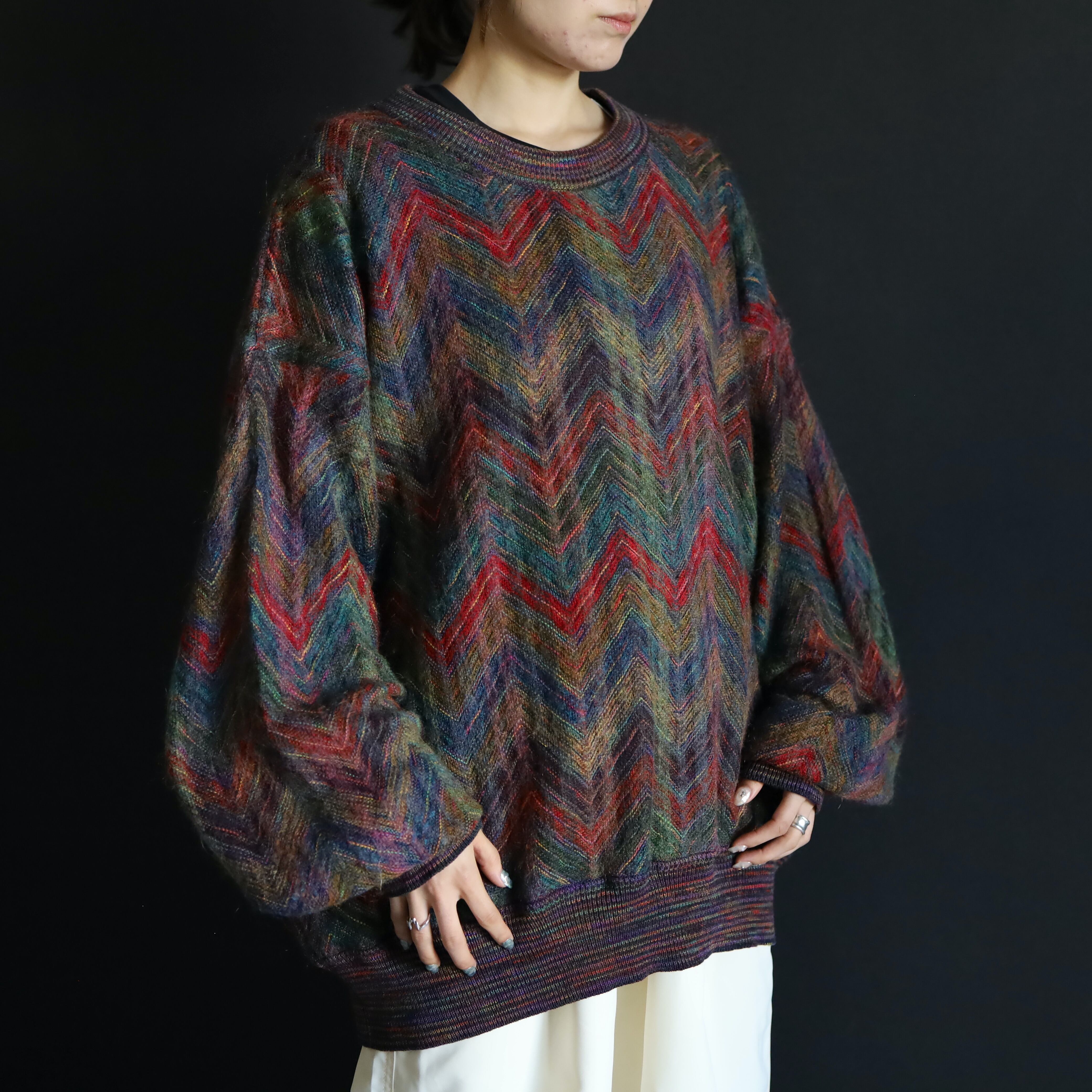 レッド,ブルー,ネイビー,ターコイズ,エメラルドなど,多くの鮮やかな色をグラデーション風に,そしてジグザグをモチーフの柄に編み込んだ一枚.