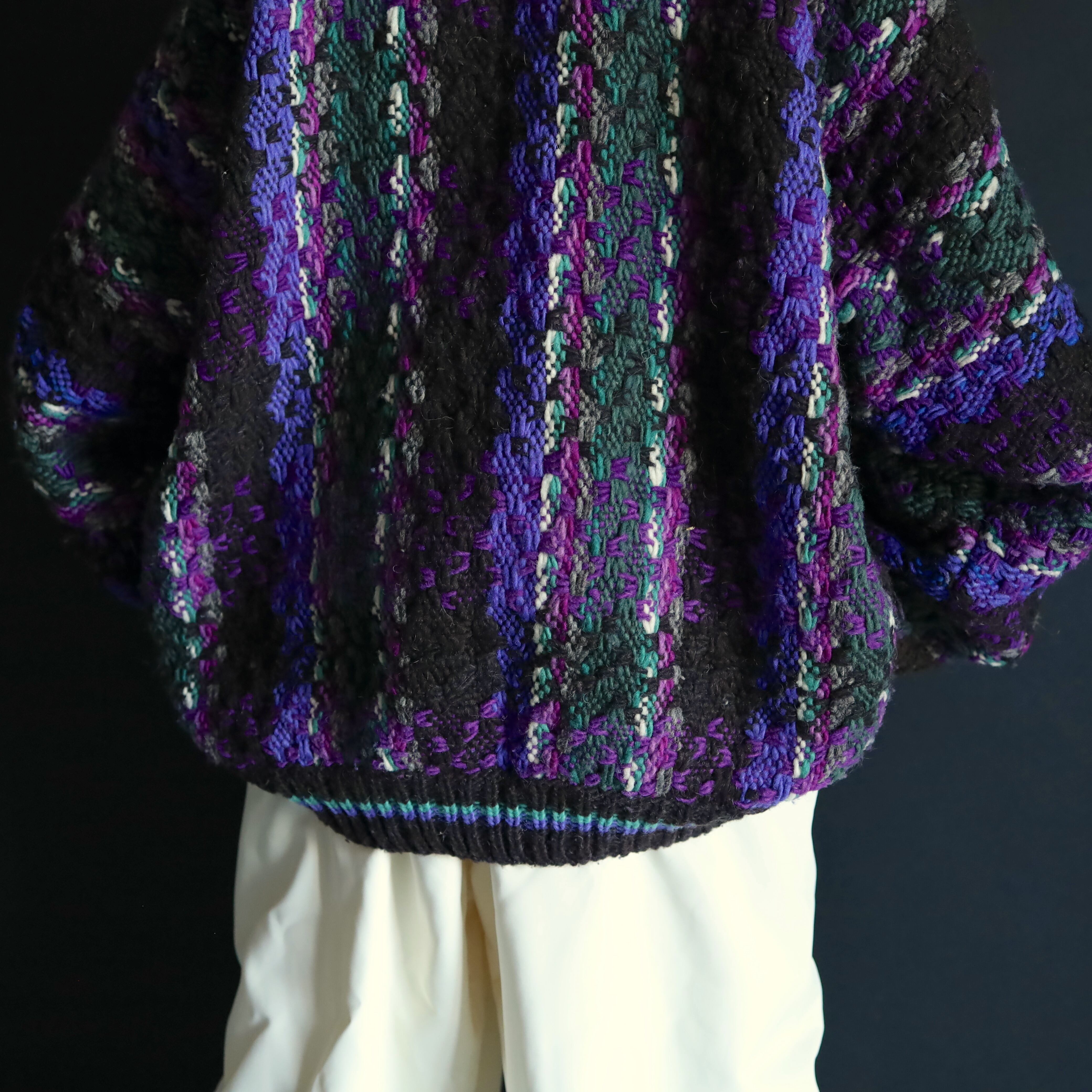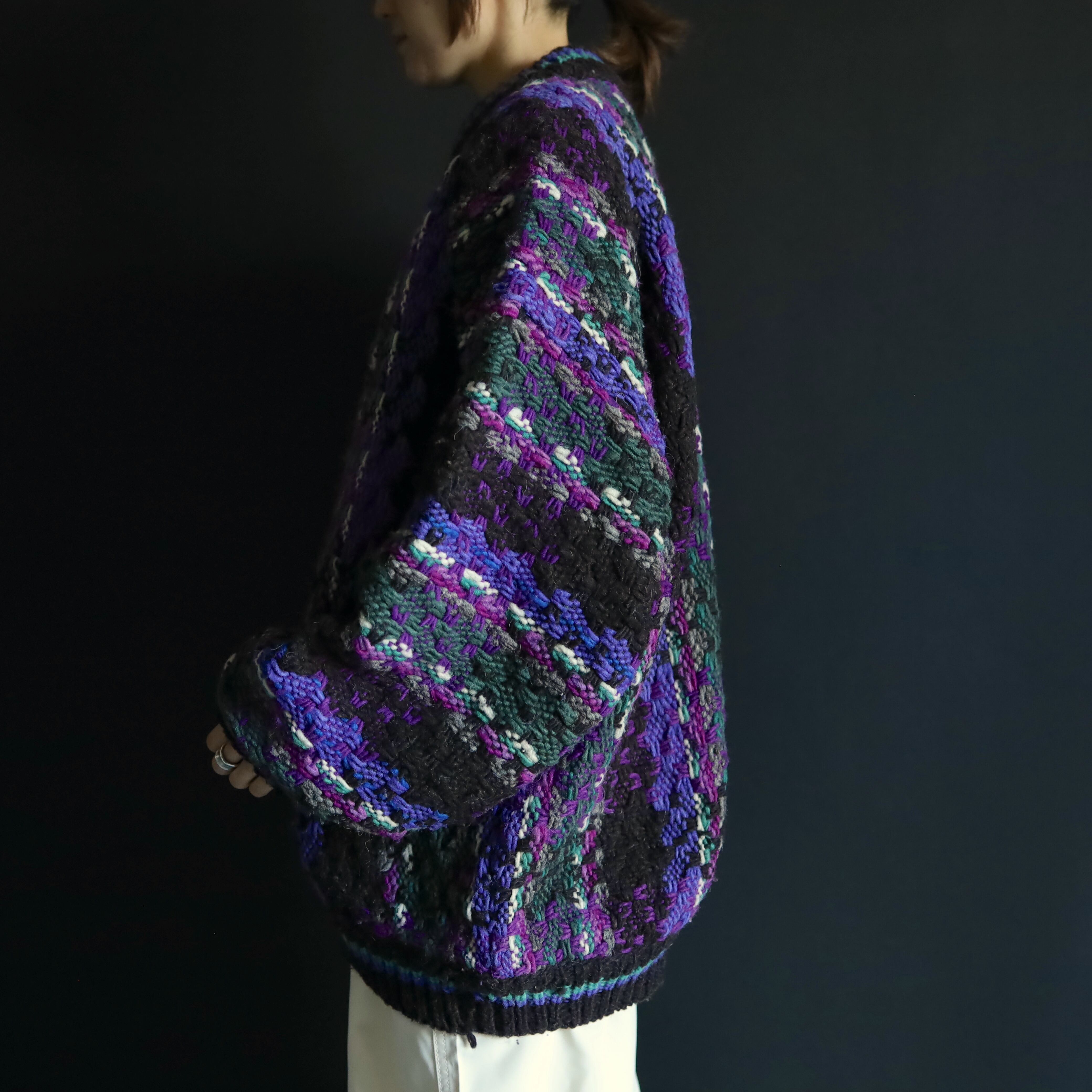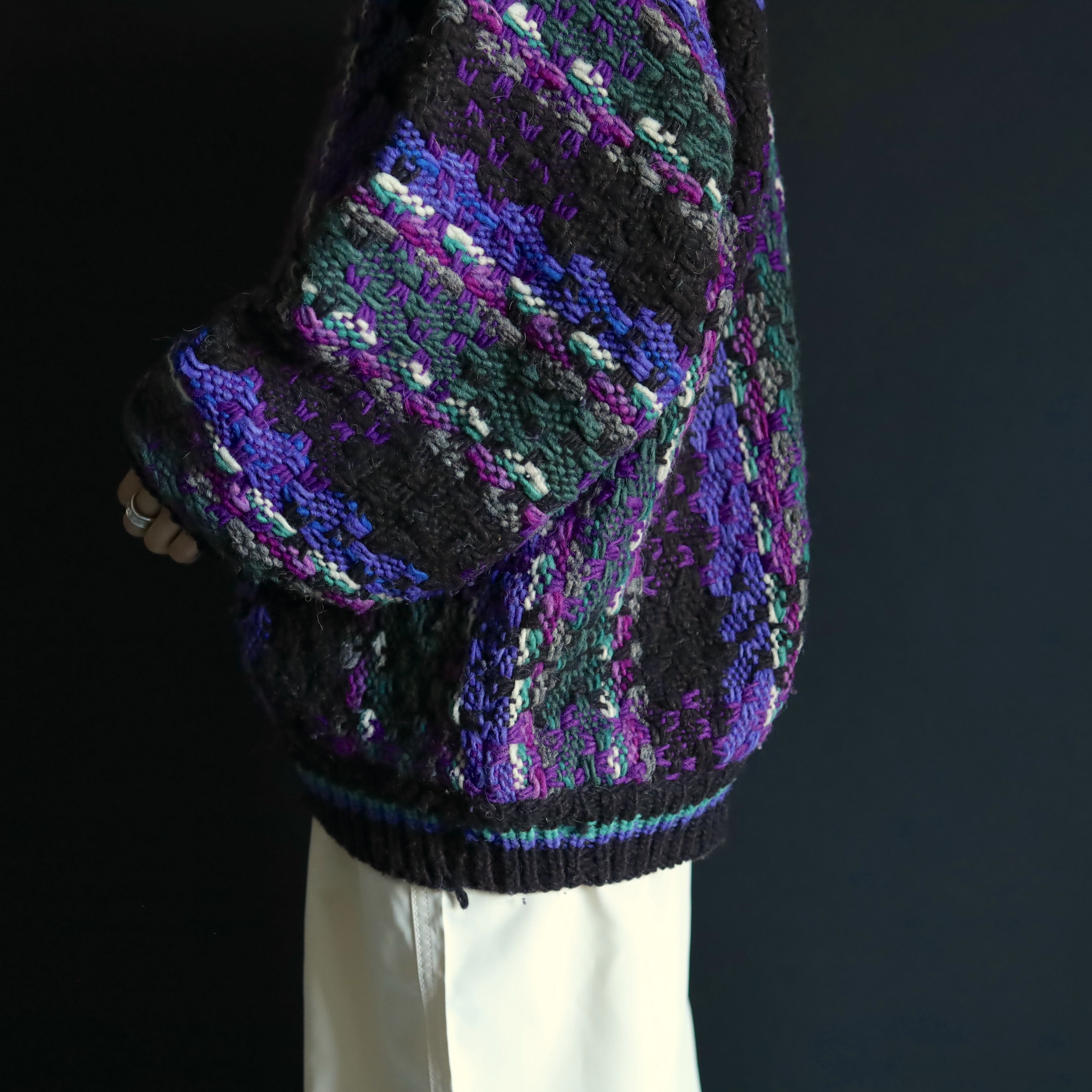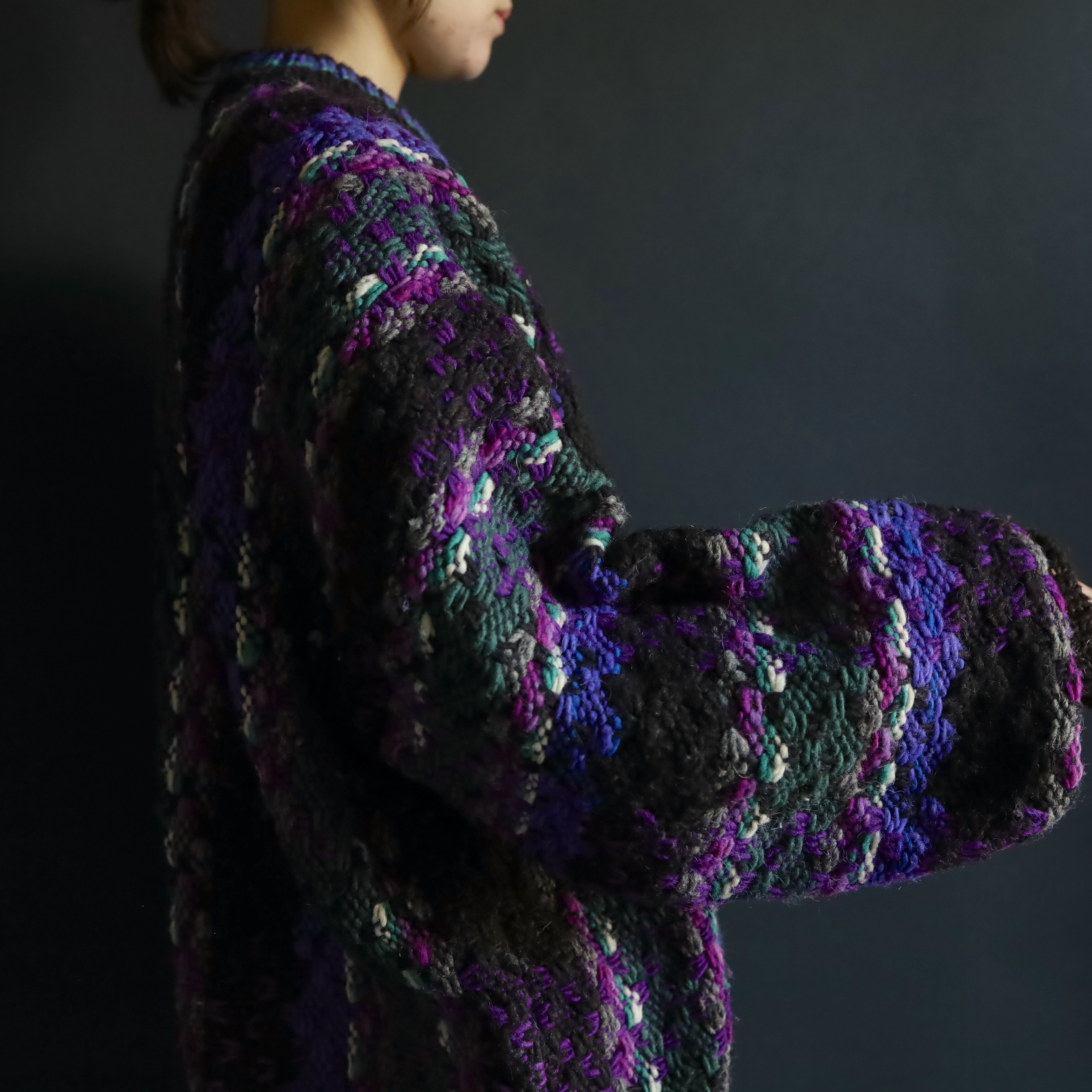 パープル,グリーン,ダークブラウン,グレー,ホワイトなど,多色の太い毛糸をざっくり編み込んだローゲージニット.
