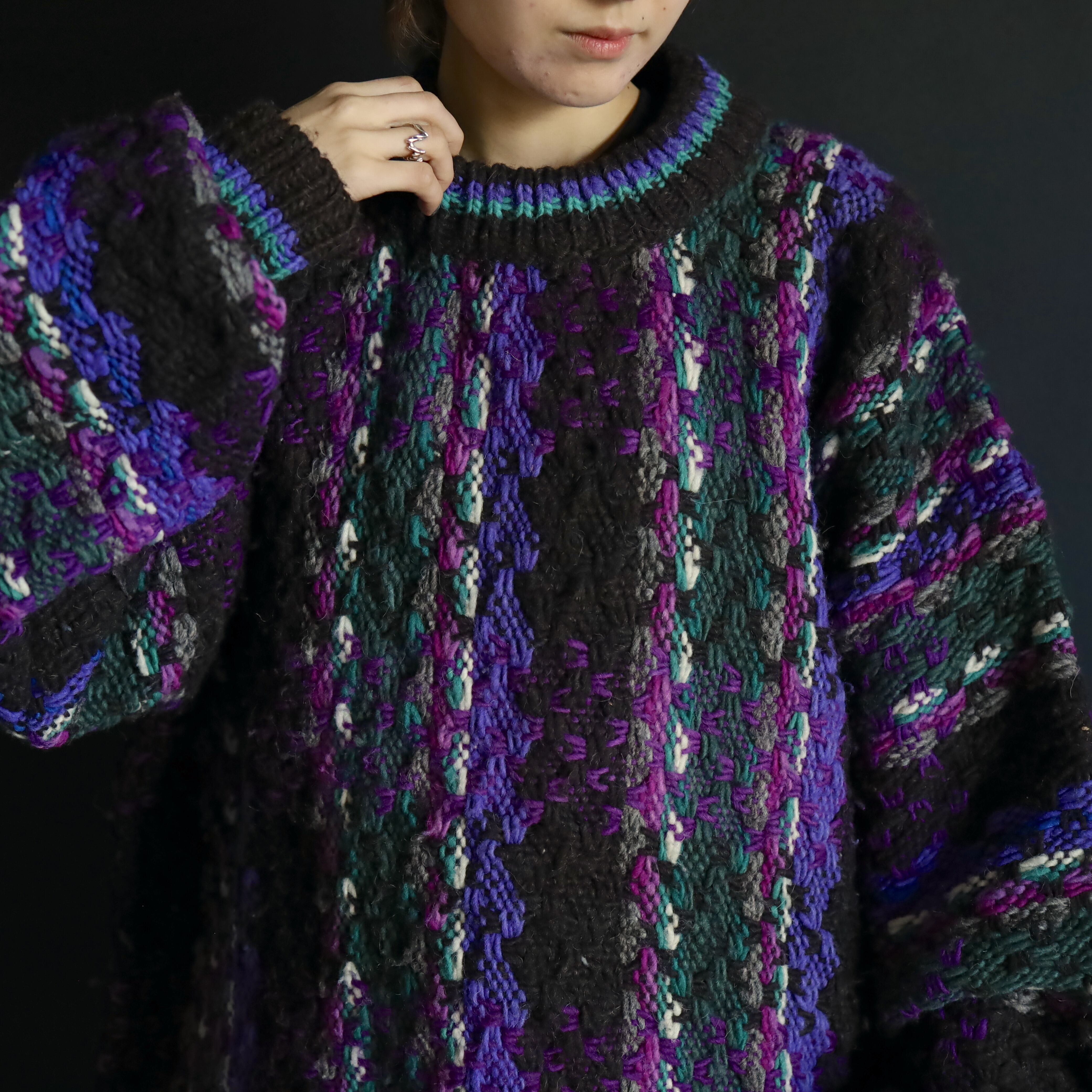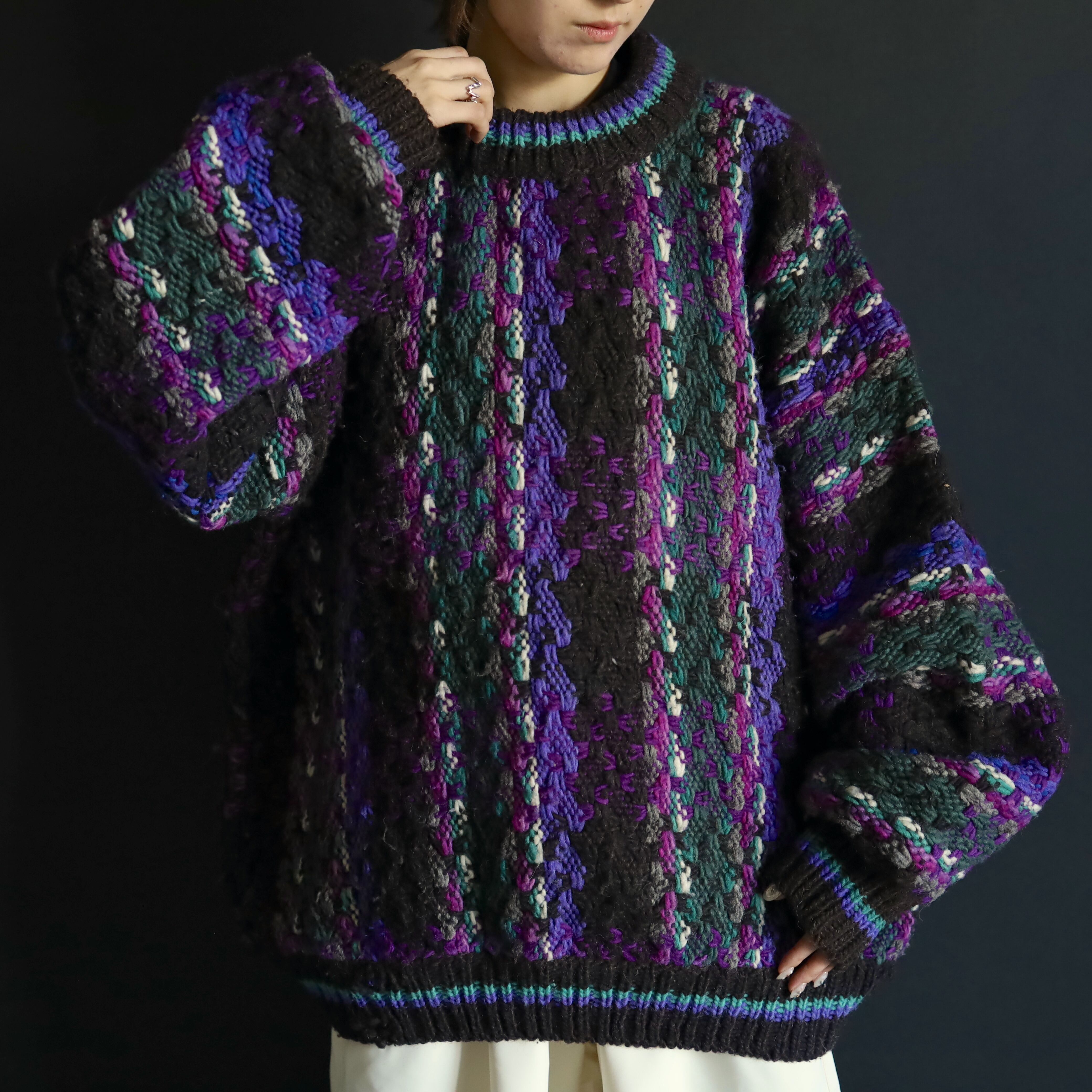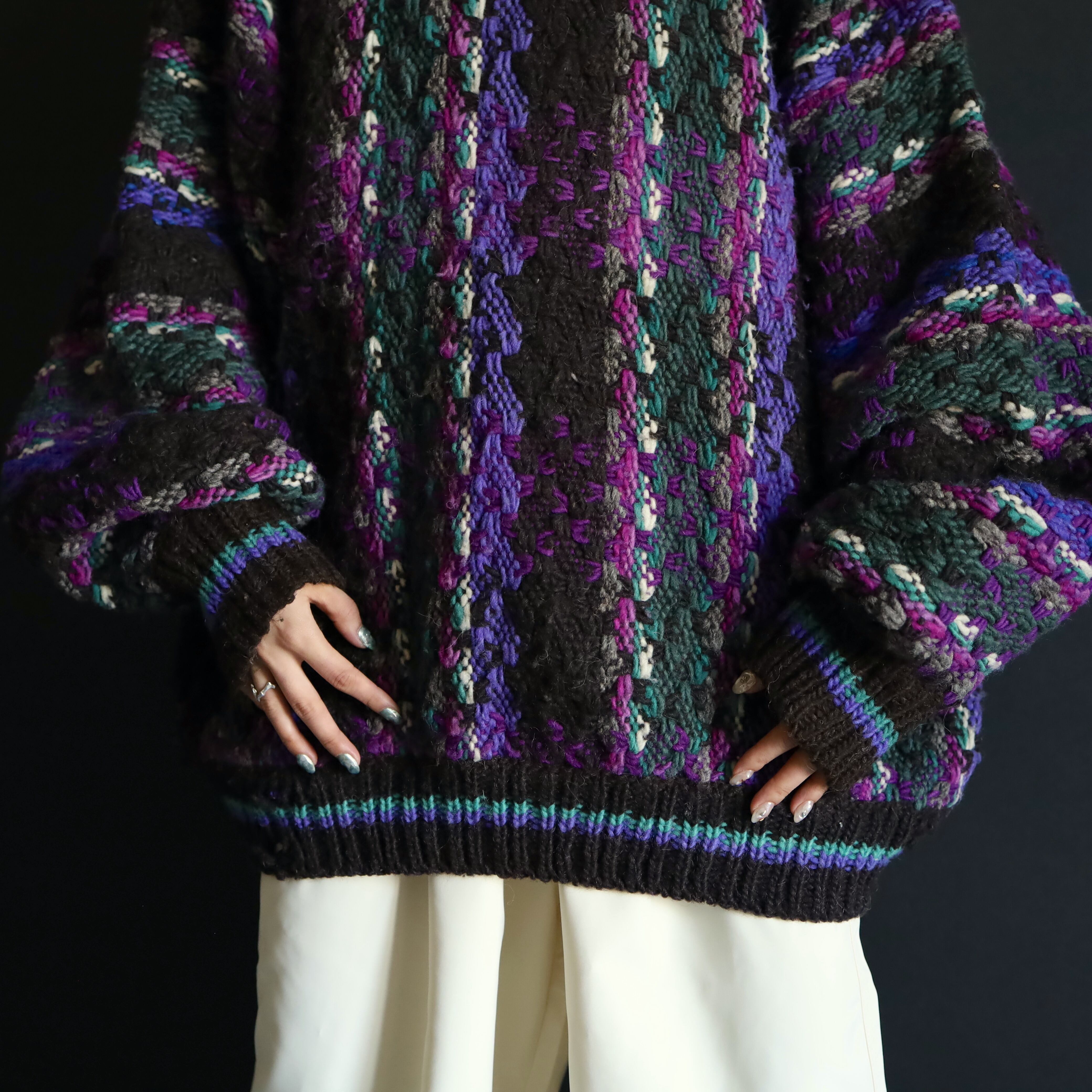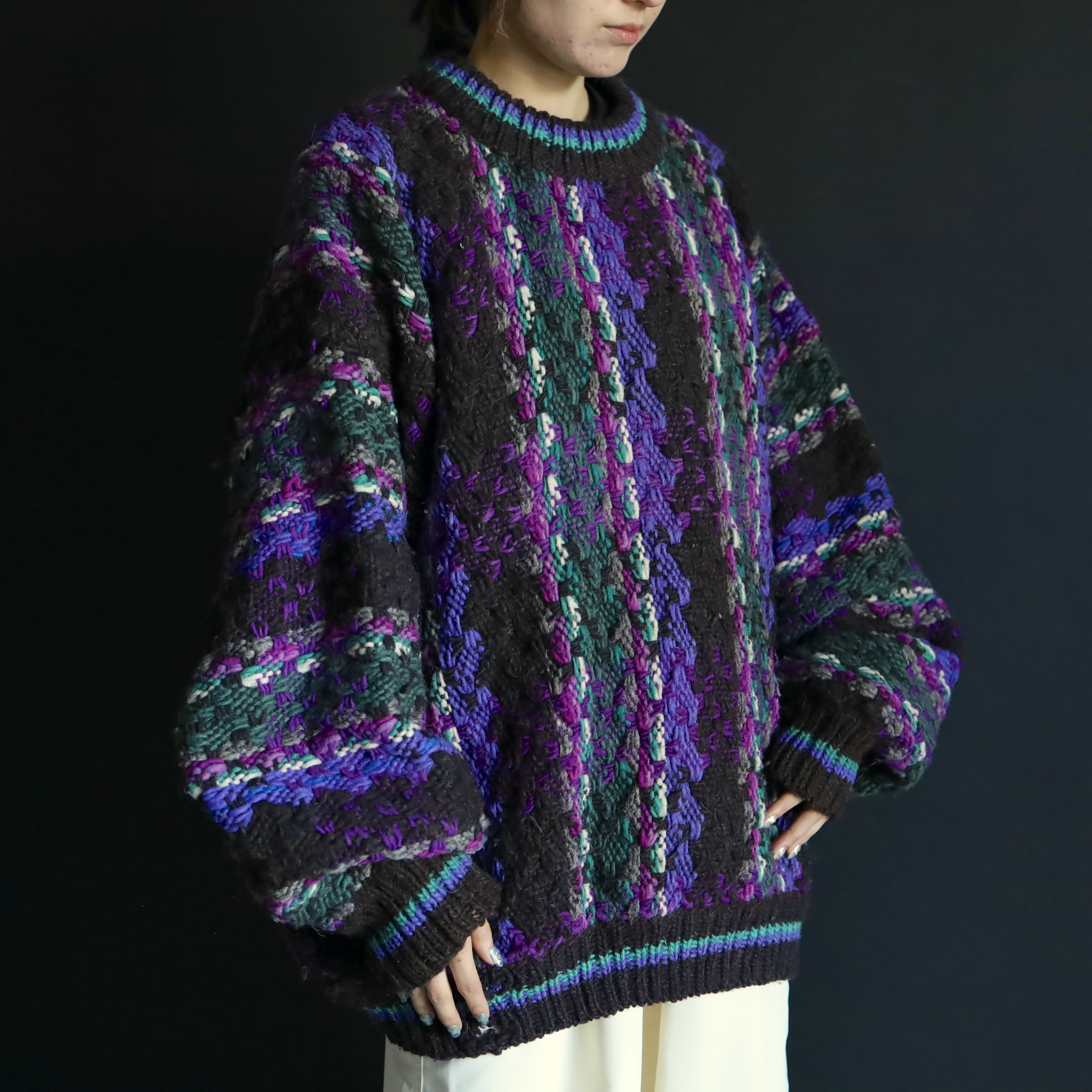 パープル,グリーン,ダークブラウン,グレー,ホワイトなど,多色の太い毛糸をざっくり編み込んだローゲージニット.
