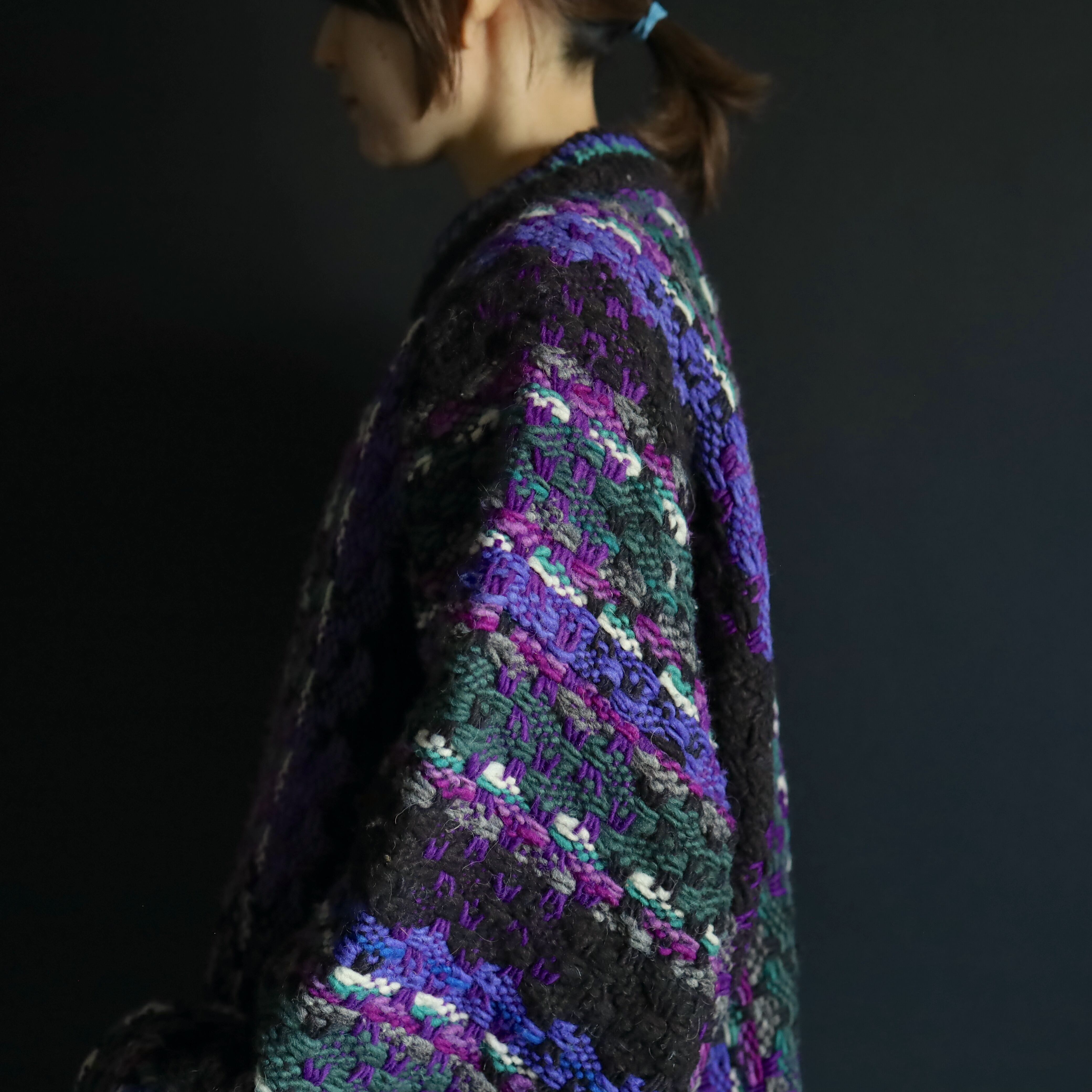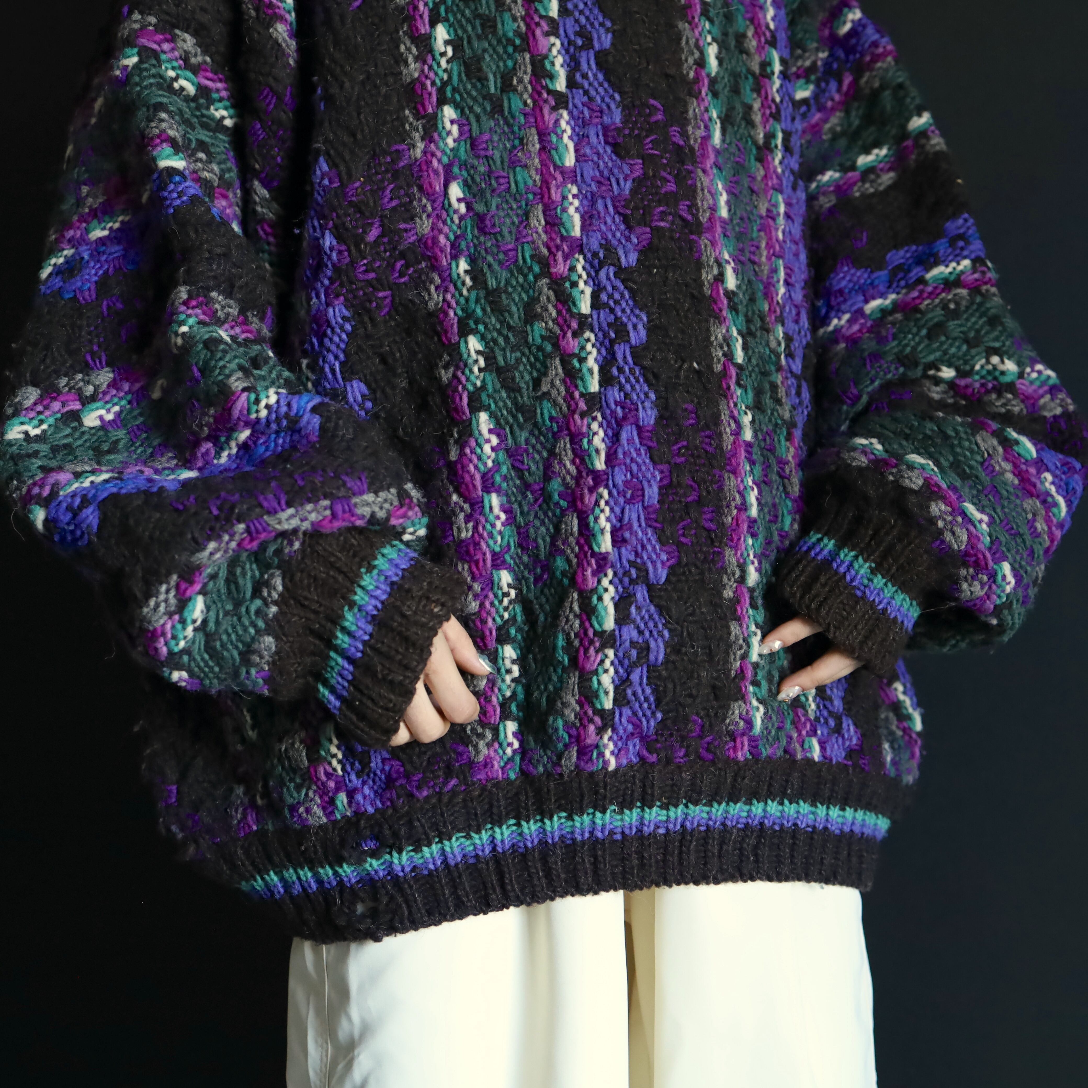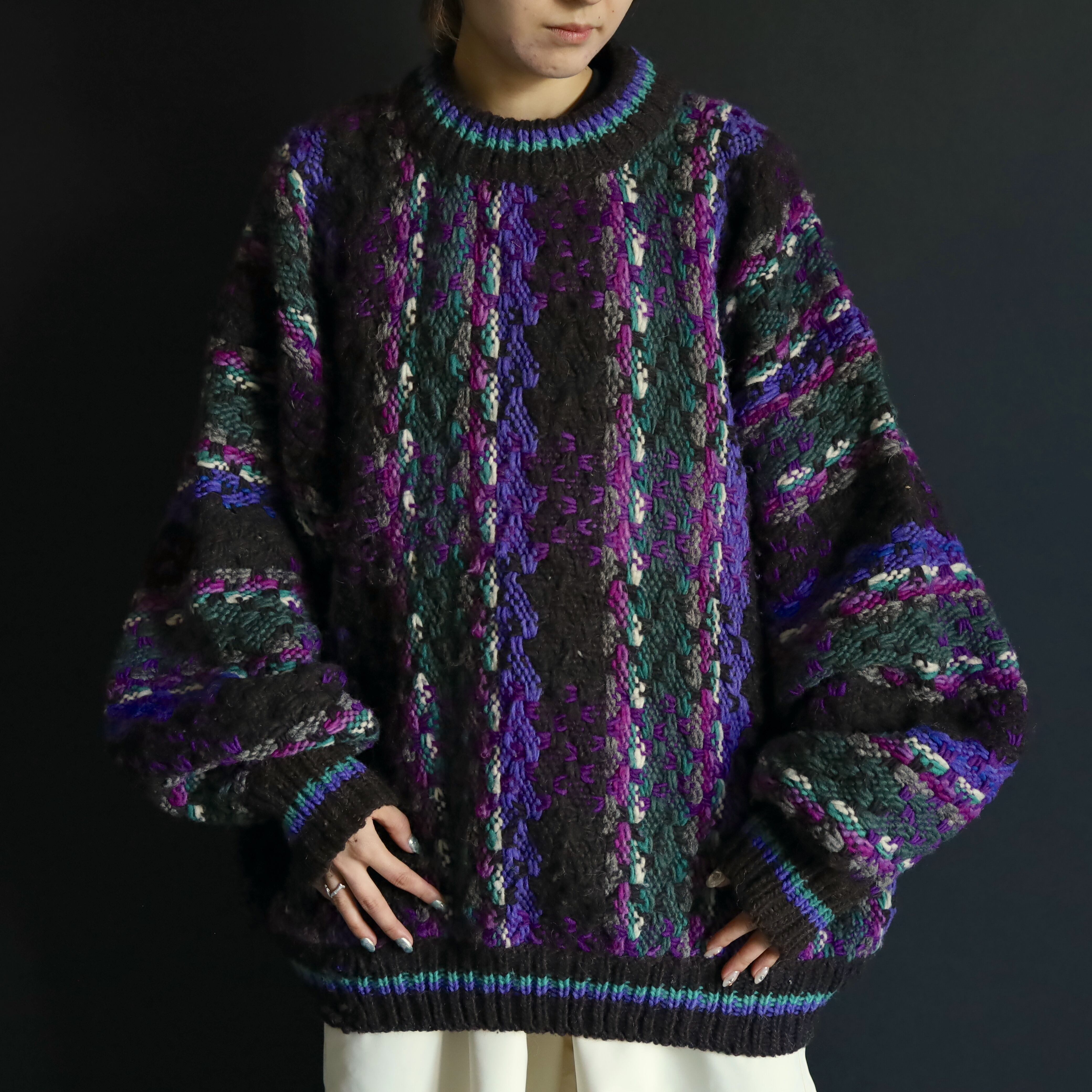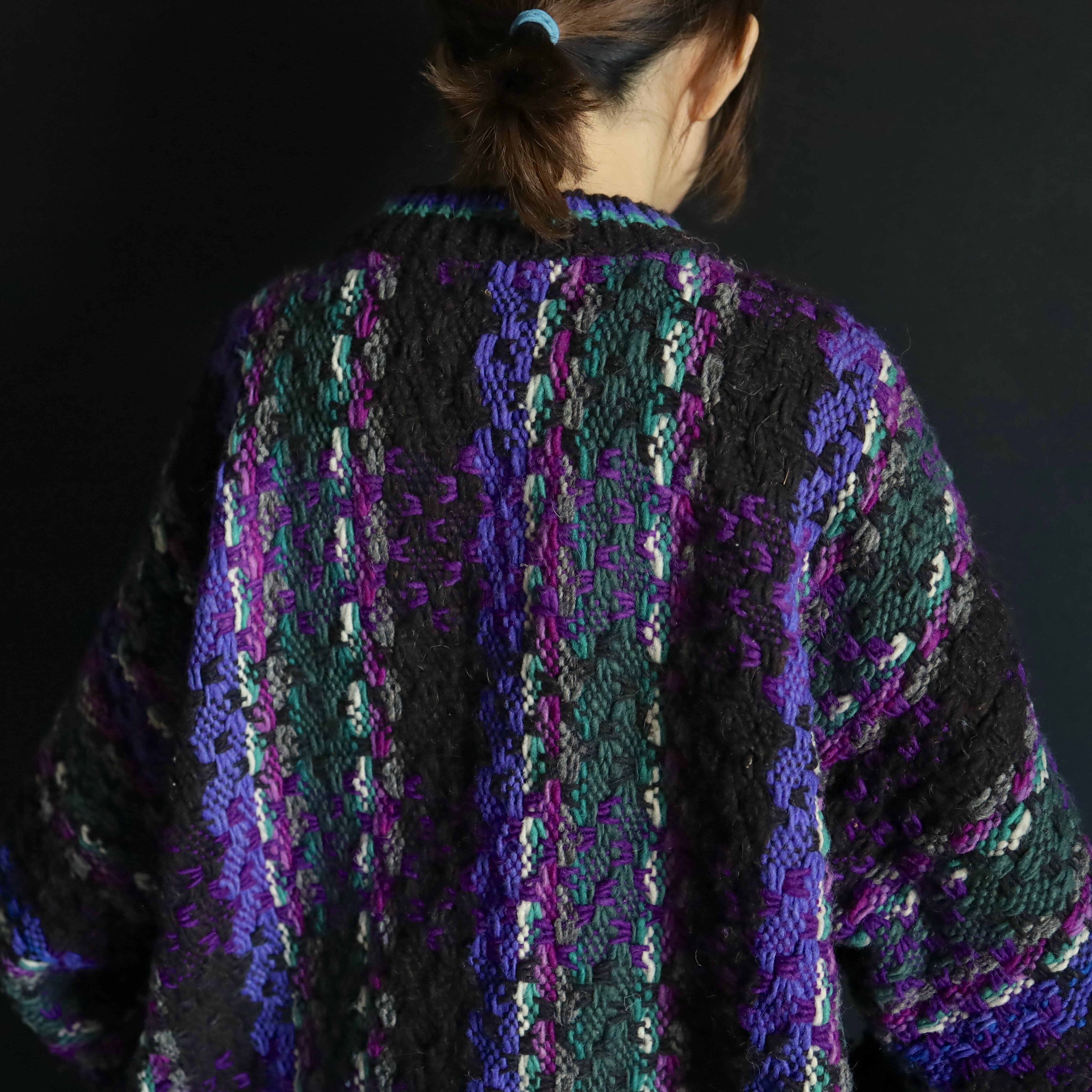 パープル,グリーン,ダークブラウン,グレー,ホワイトなど,多色の太い毛糸をざっくり編み込んだローゲージニット.