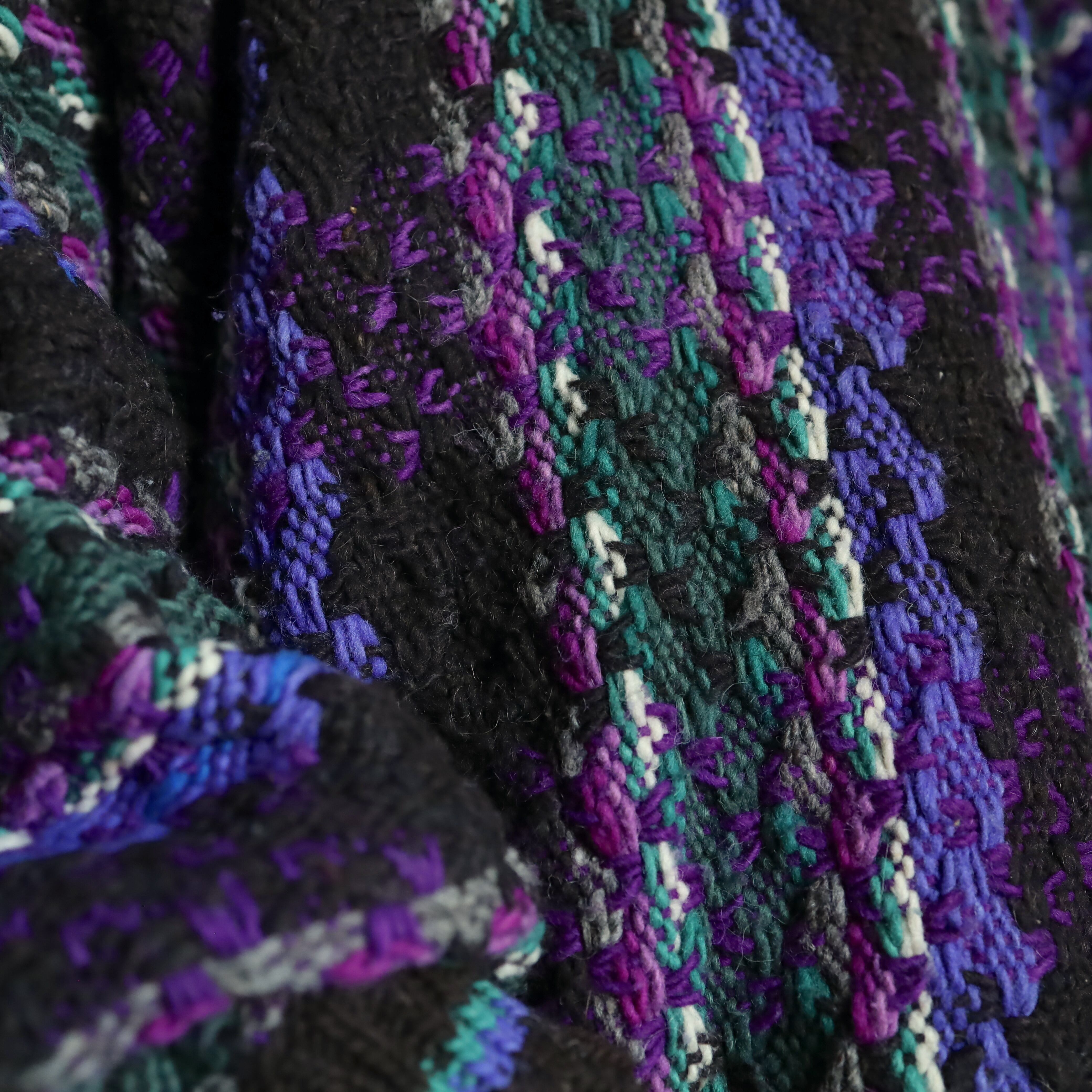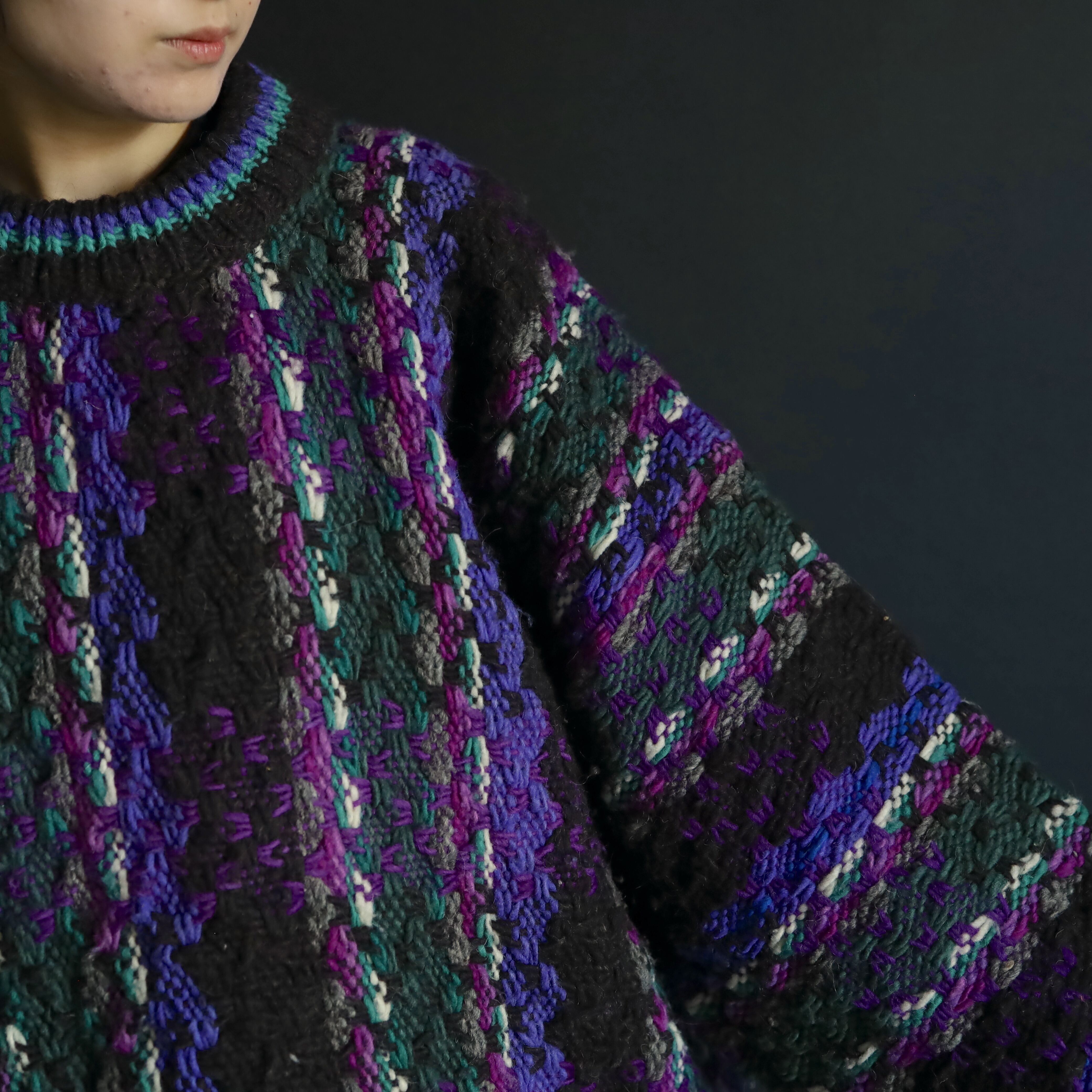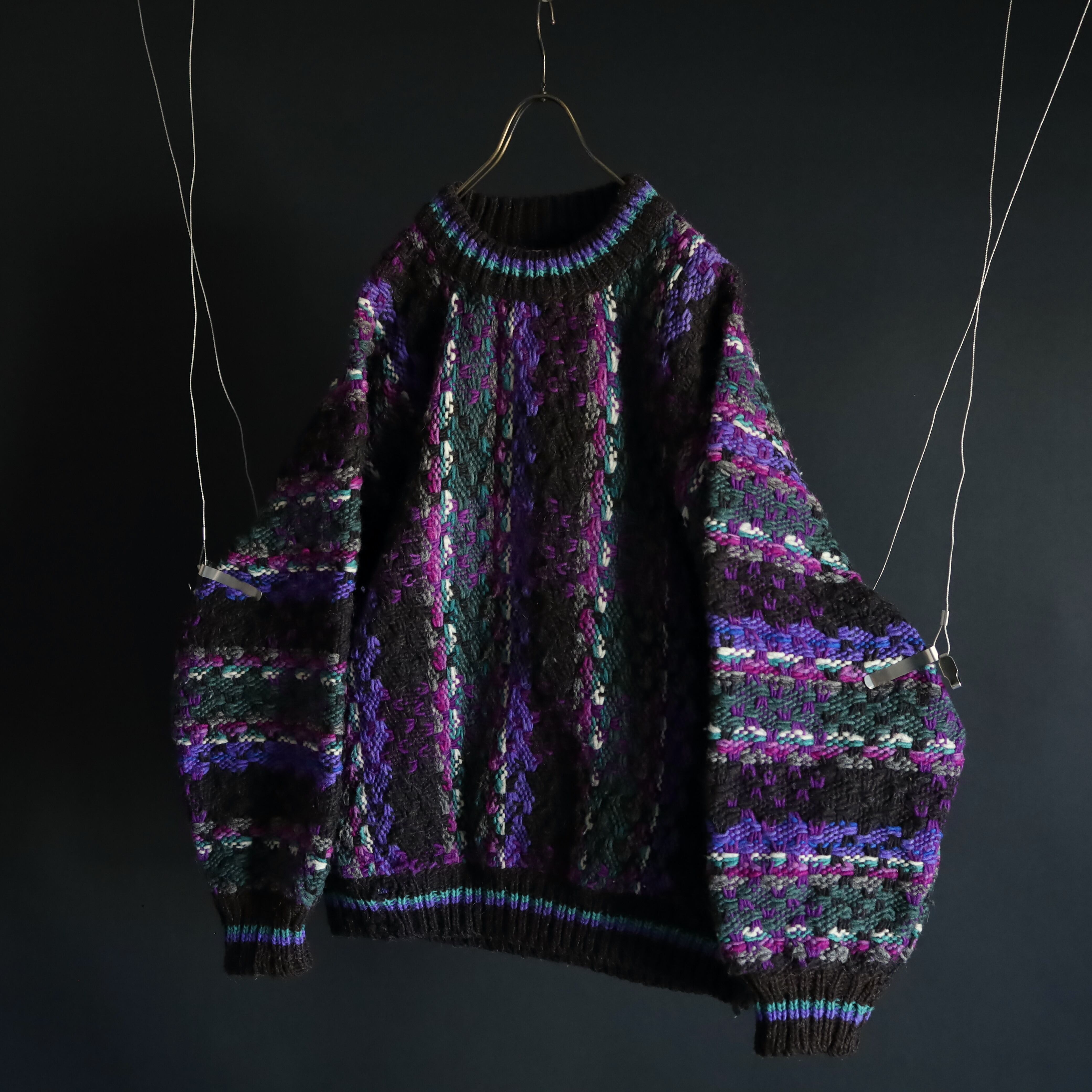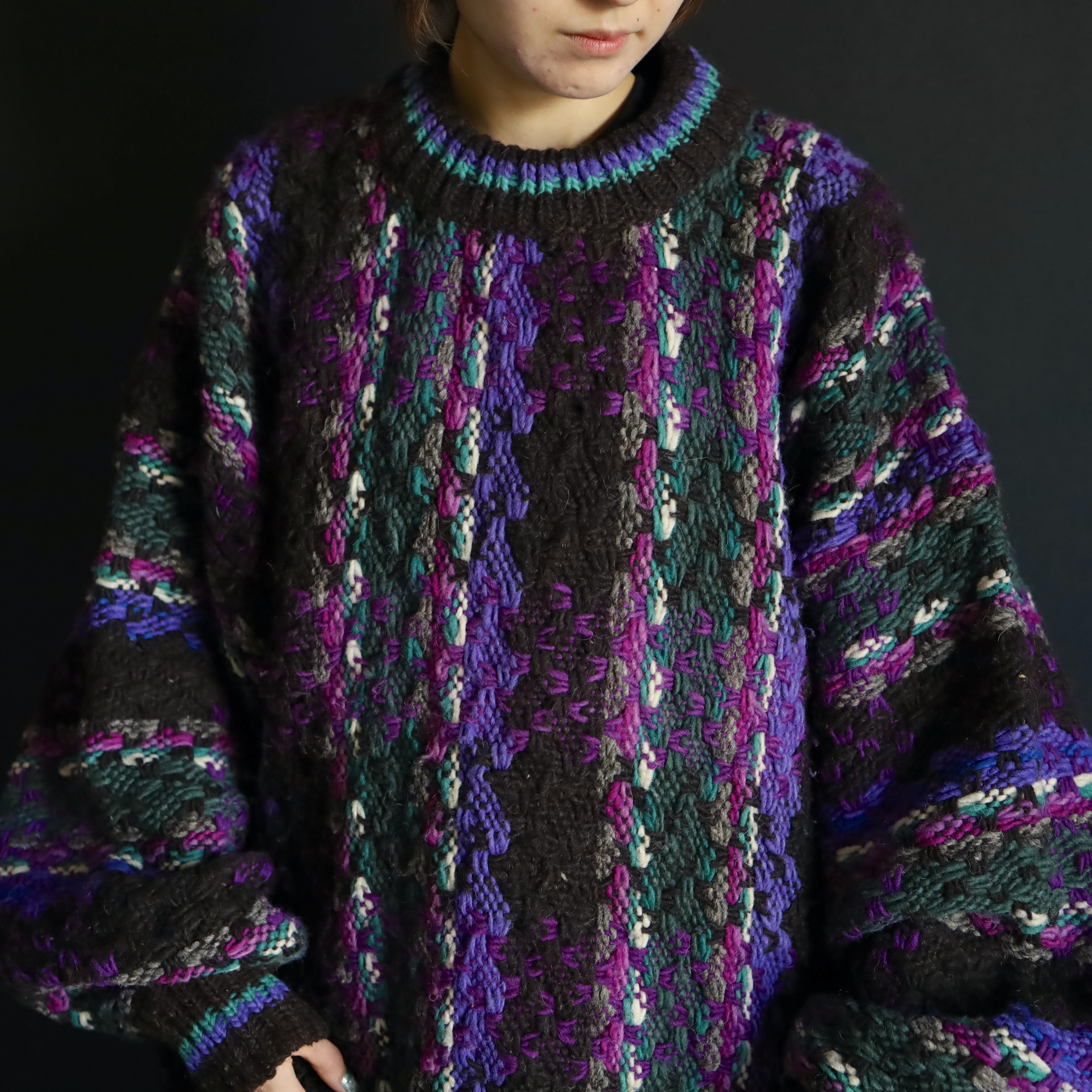 パープル,グリーン,ダークブラウン,グレー,ホワイトなど,多色の太い毛糸をざっくり編み込んだローゲージニット.