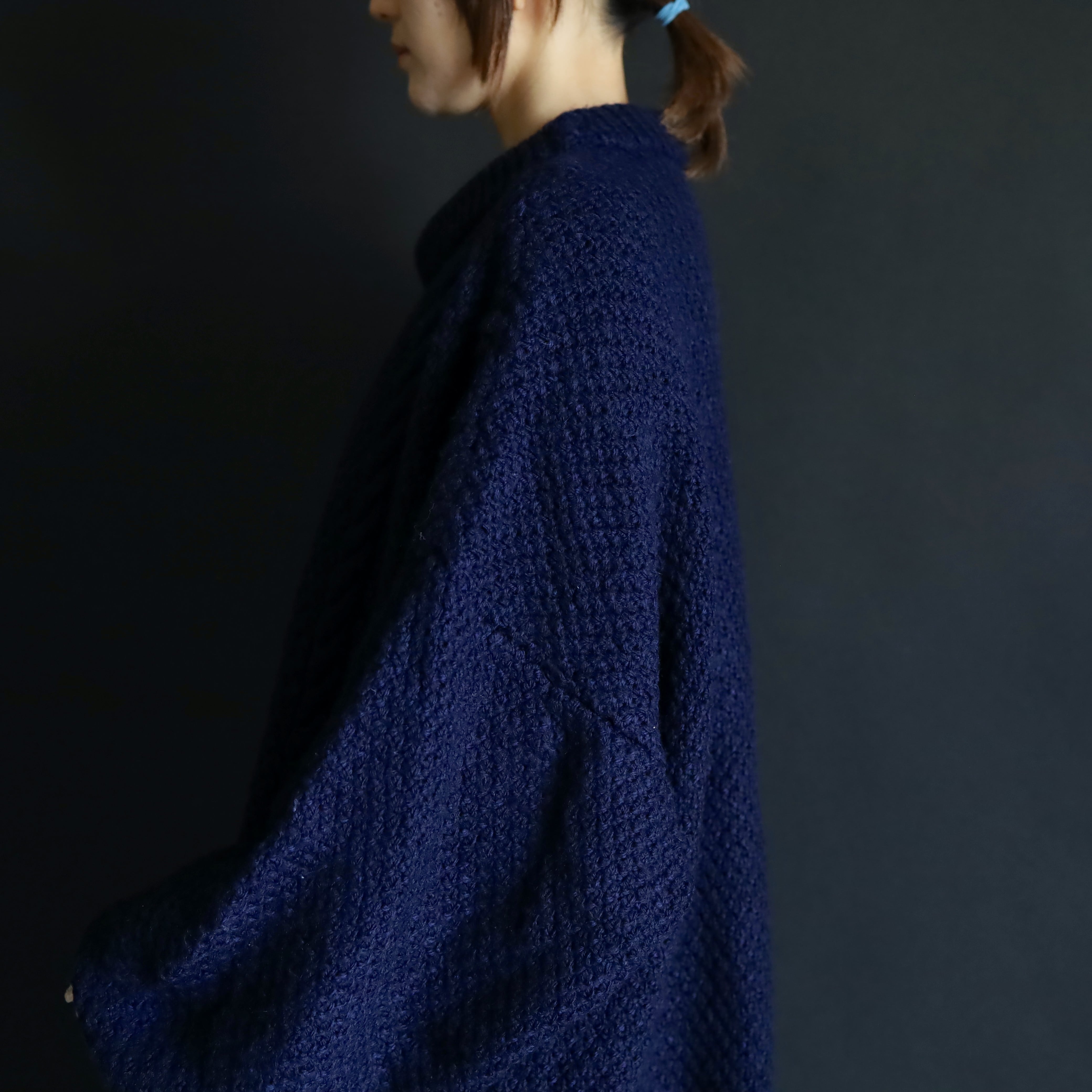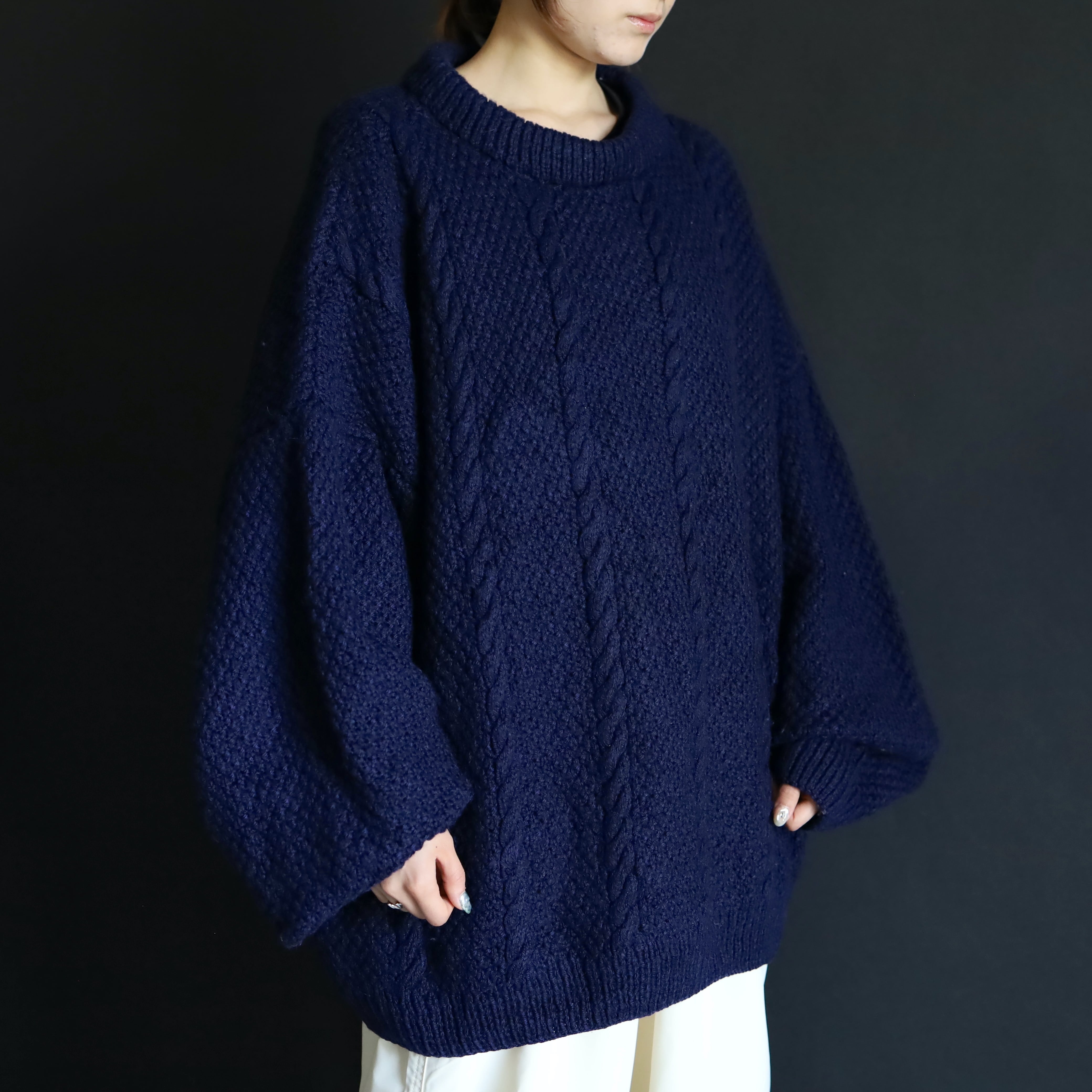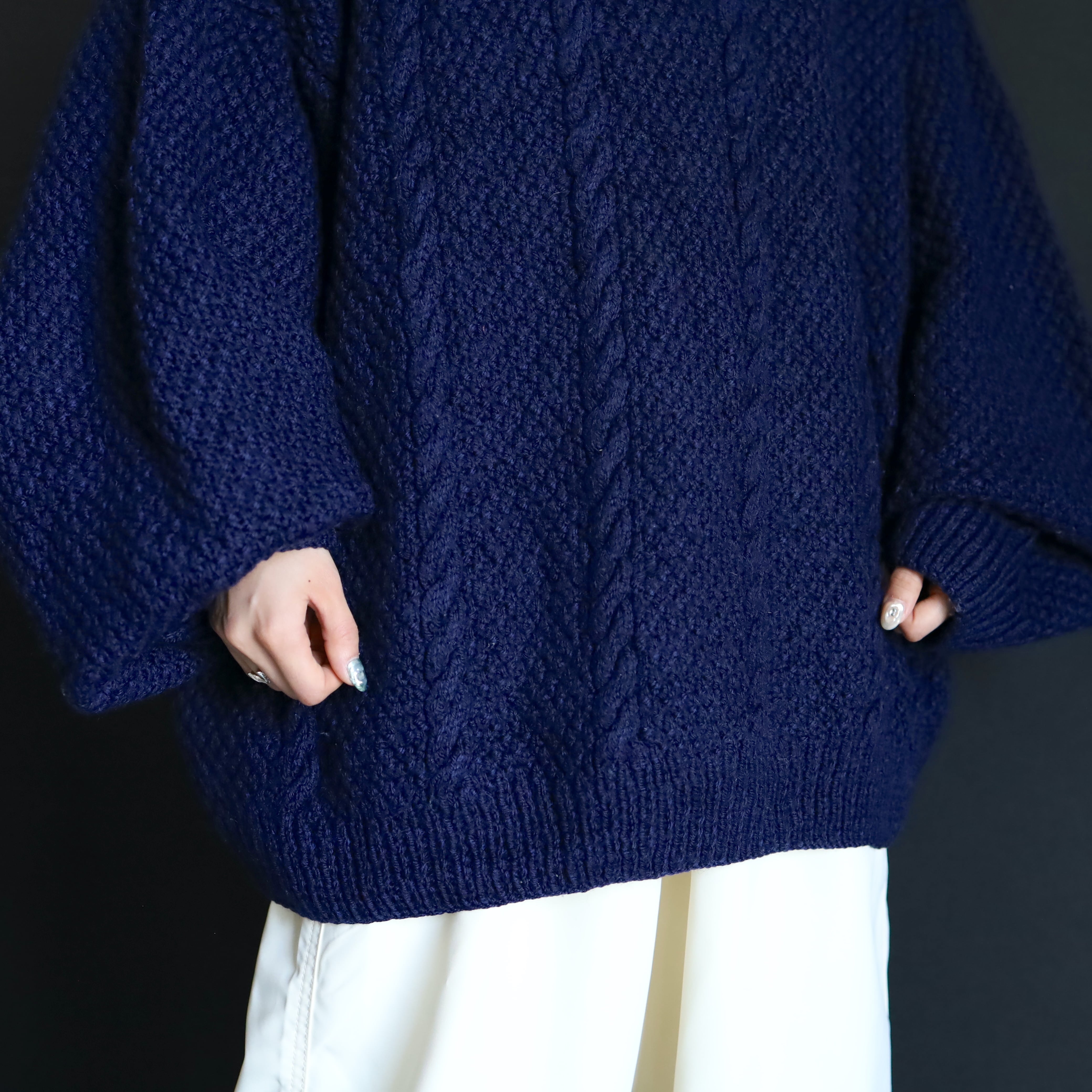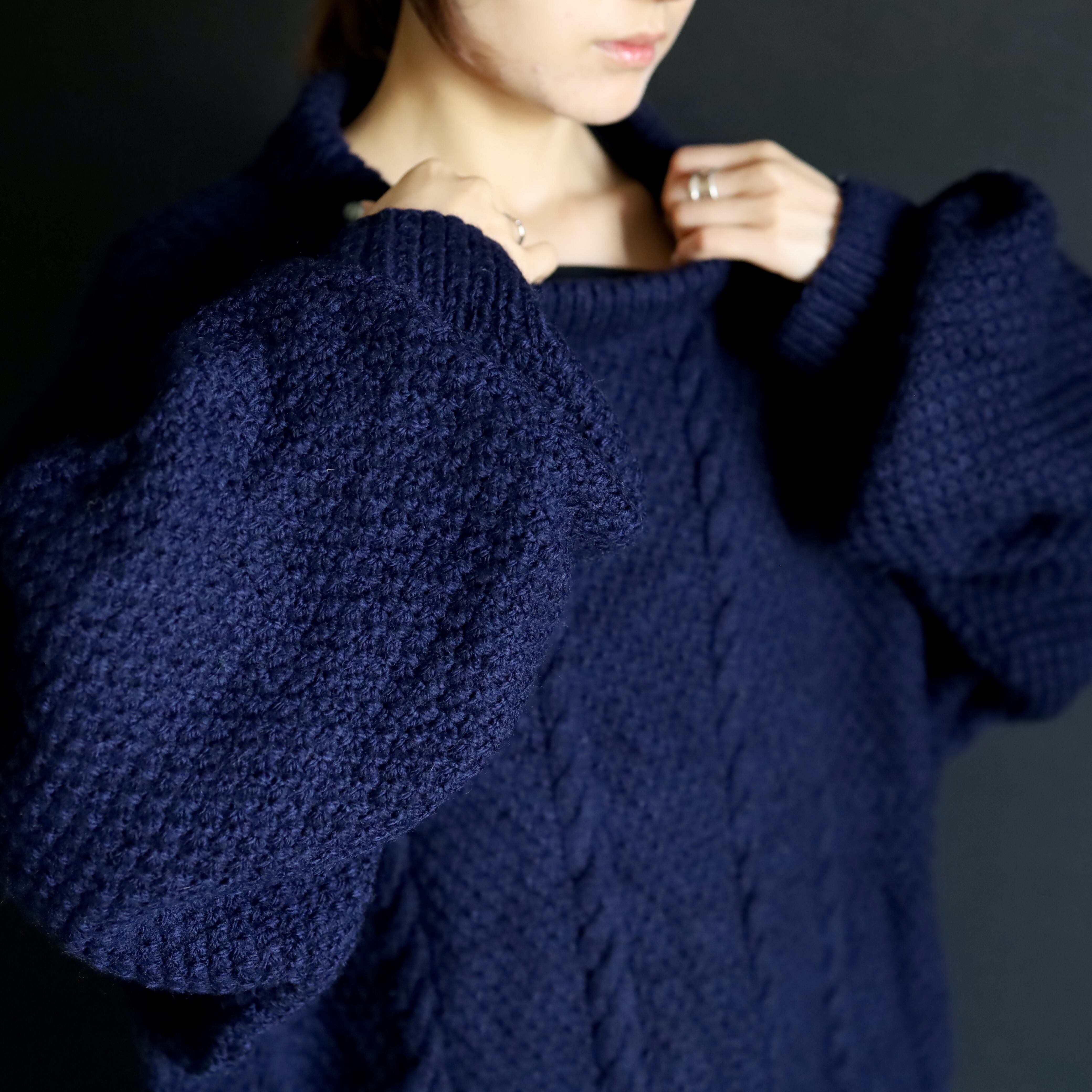 ざっくりと編み込んだローゲージニットで,ボリューム感はあるもののふんわりと軽い着心地.