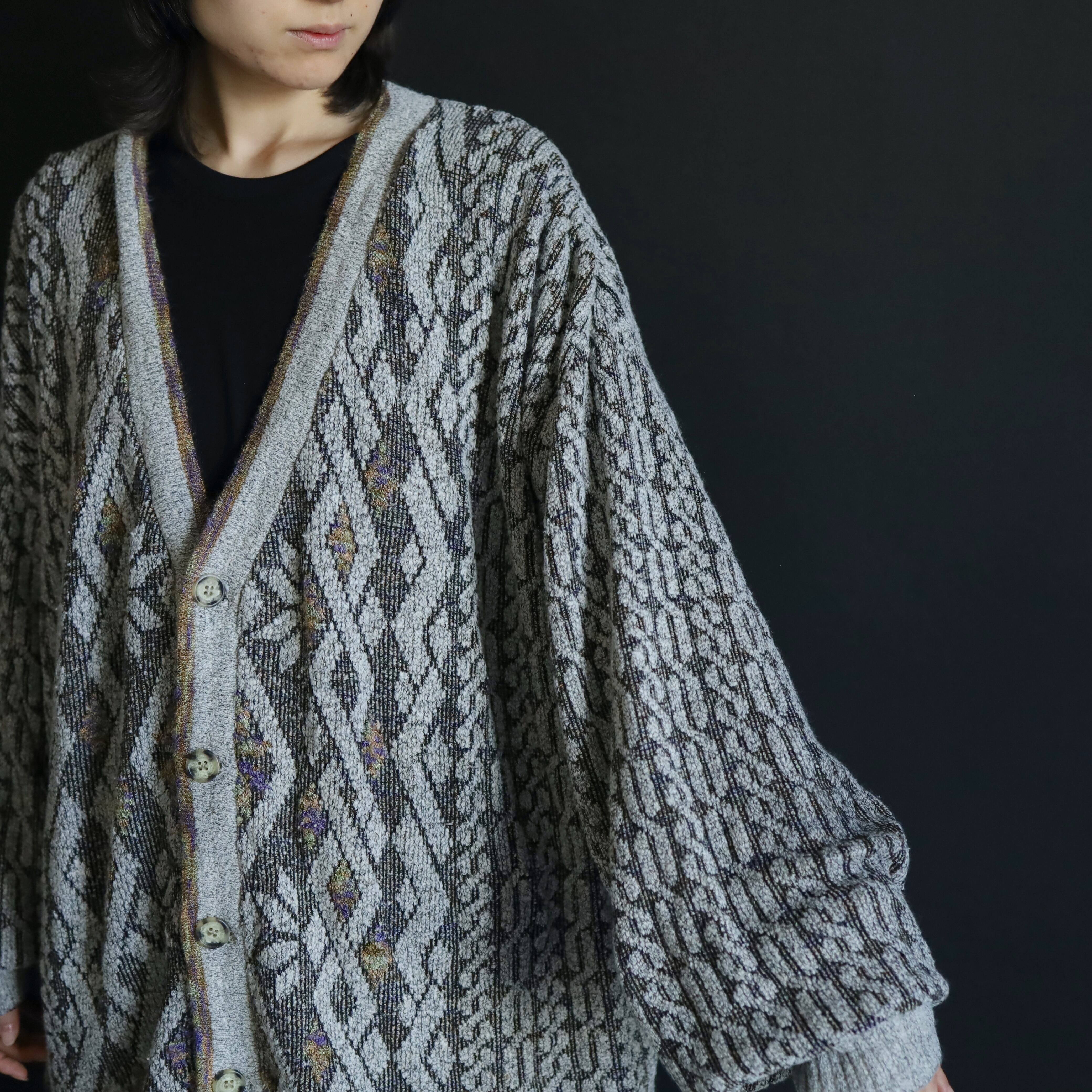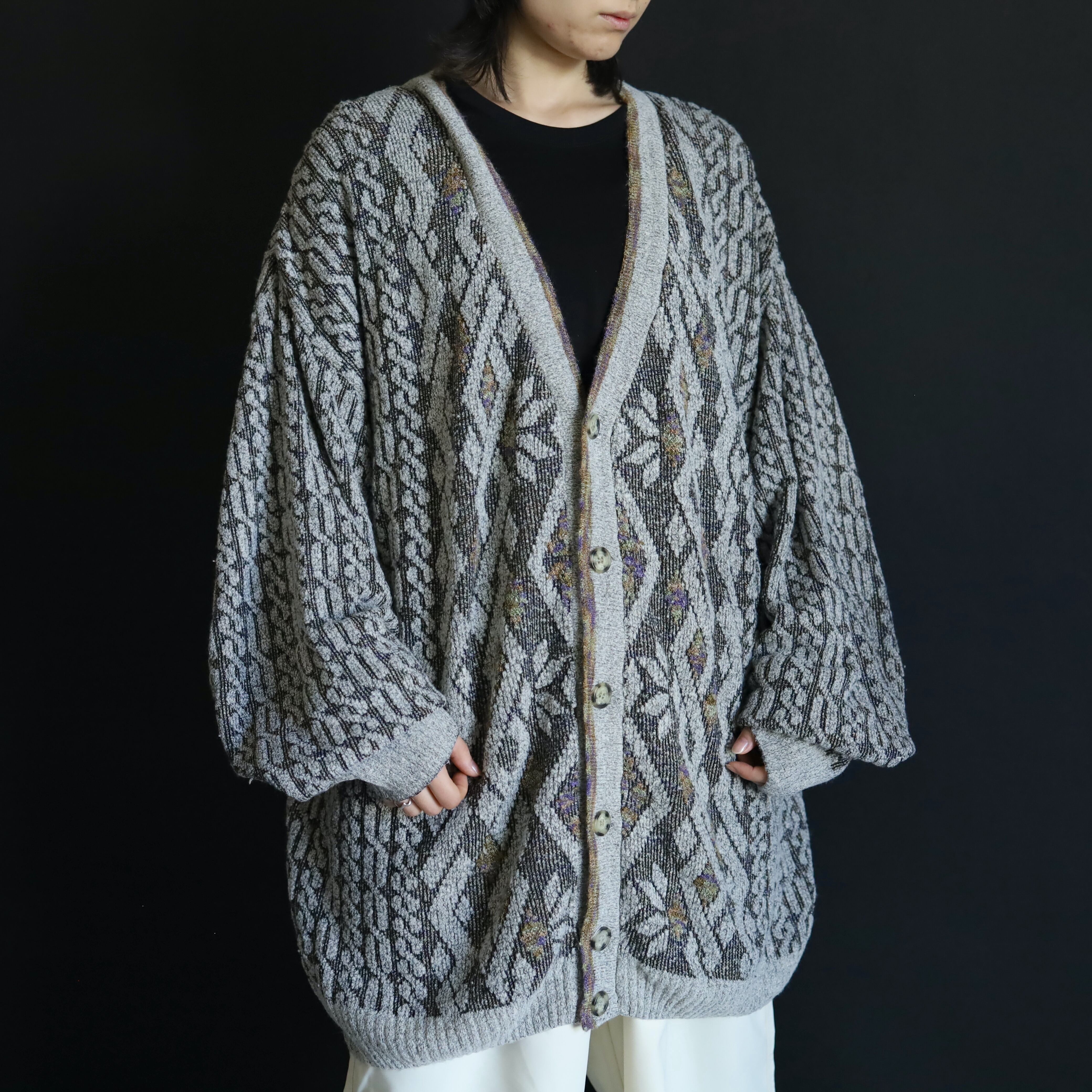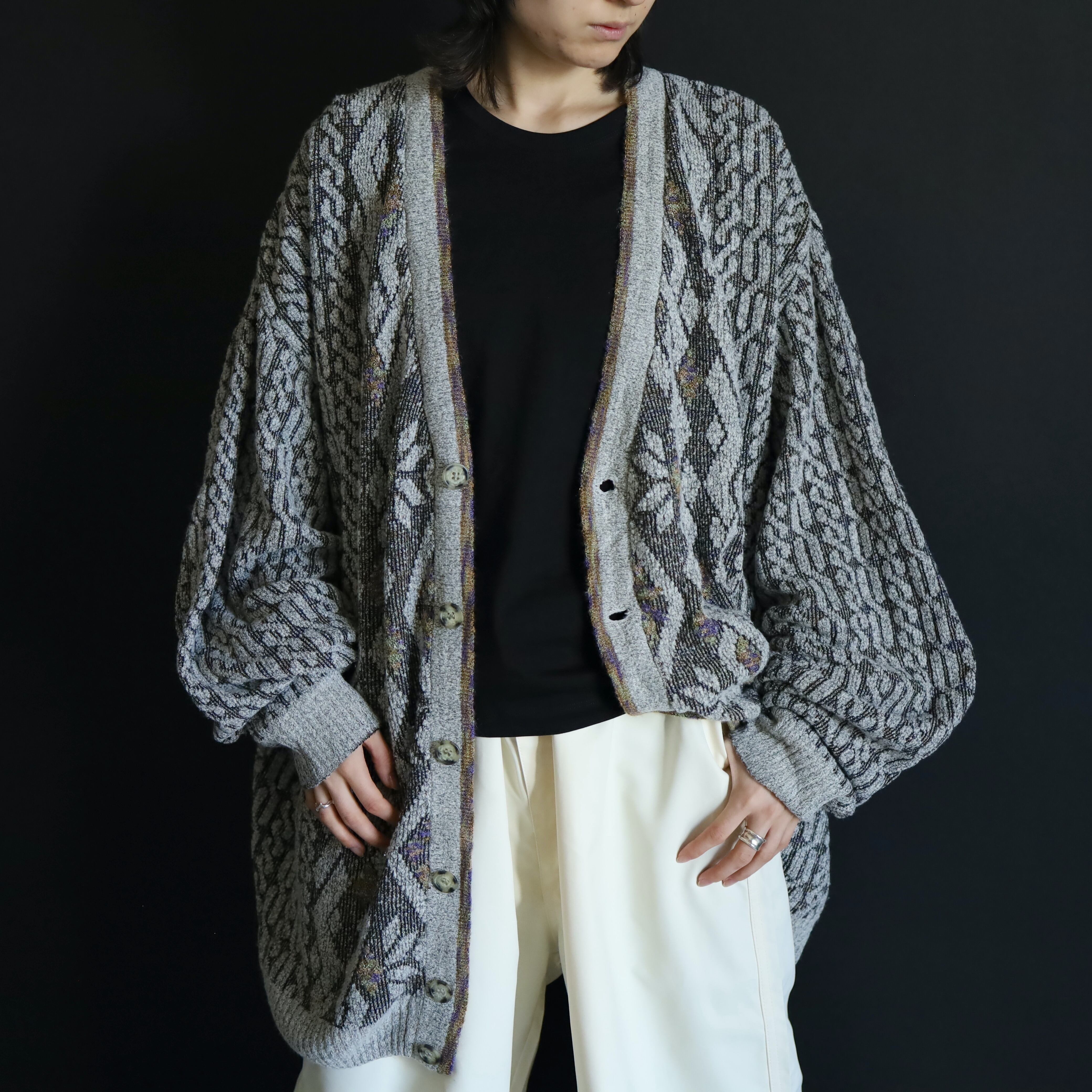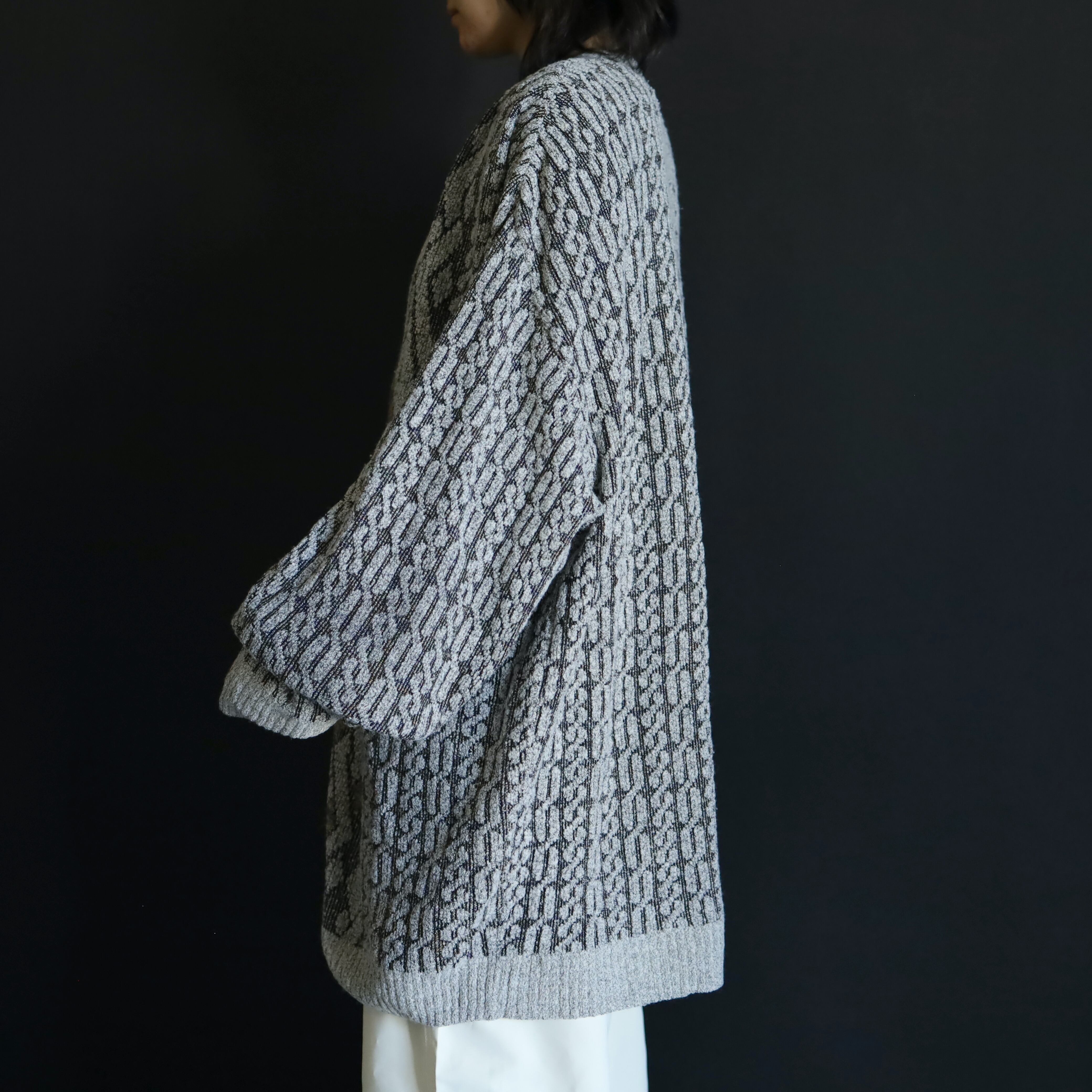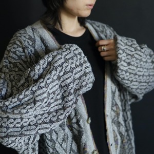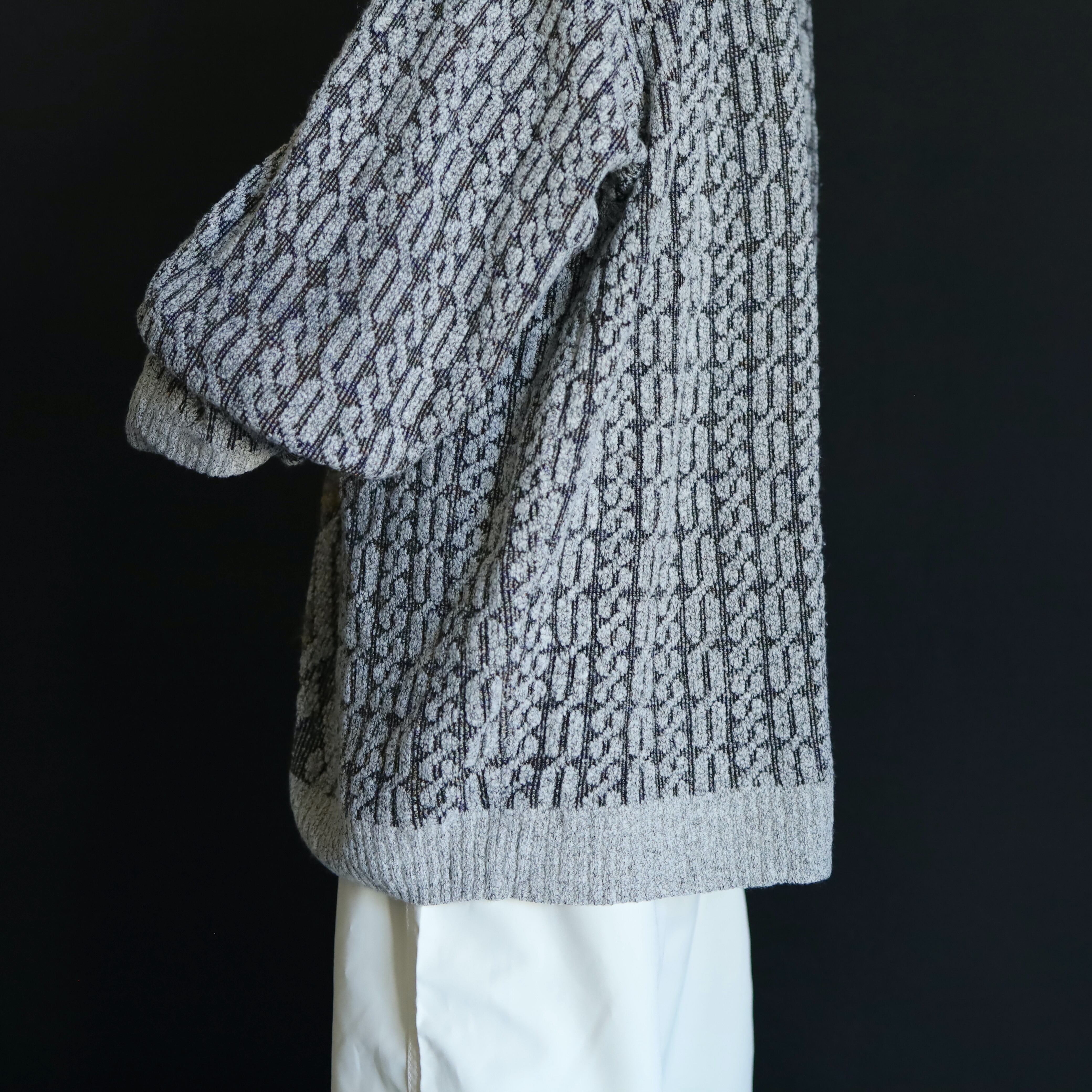ヘザーグレーニットボディをベースに,ブラックやパープル,カーキなどをミックスした総柄.