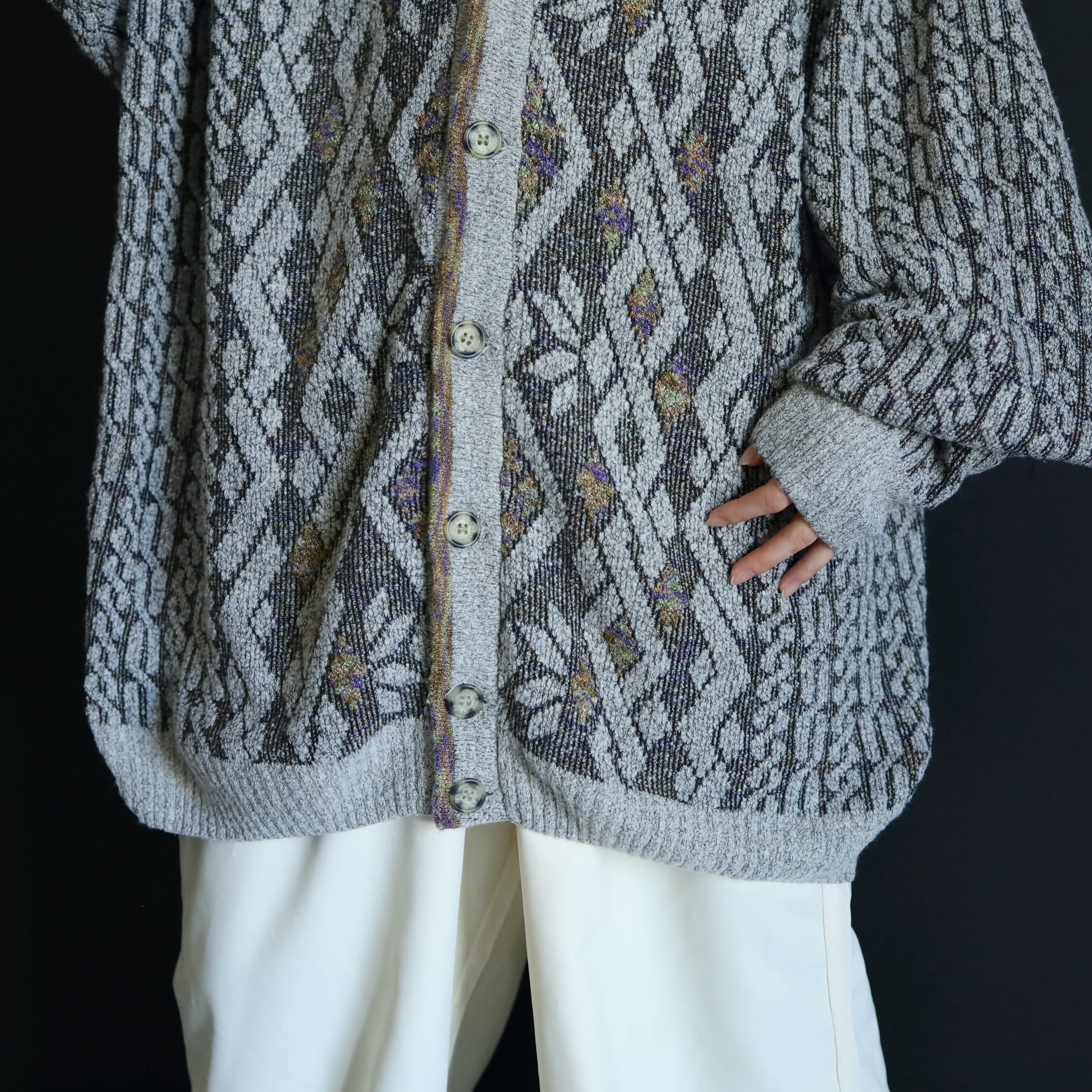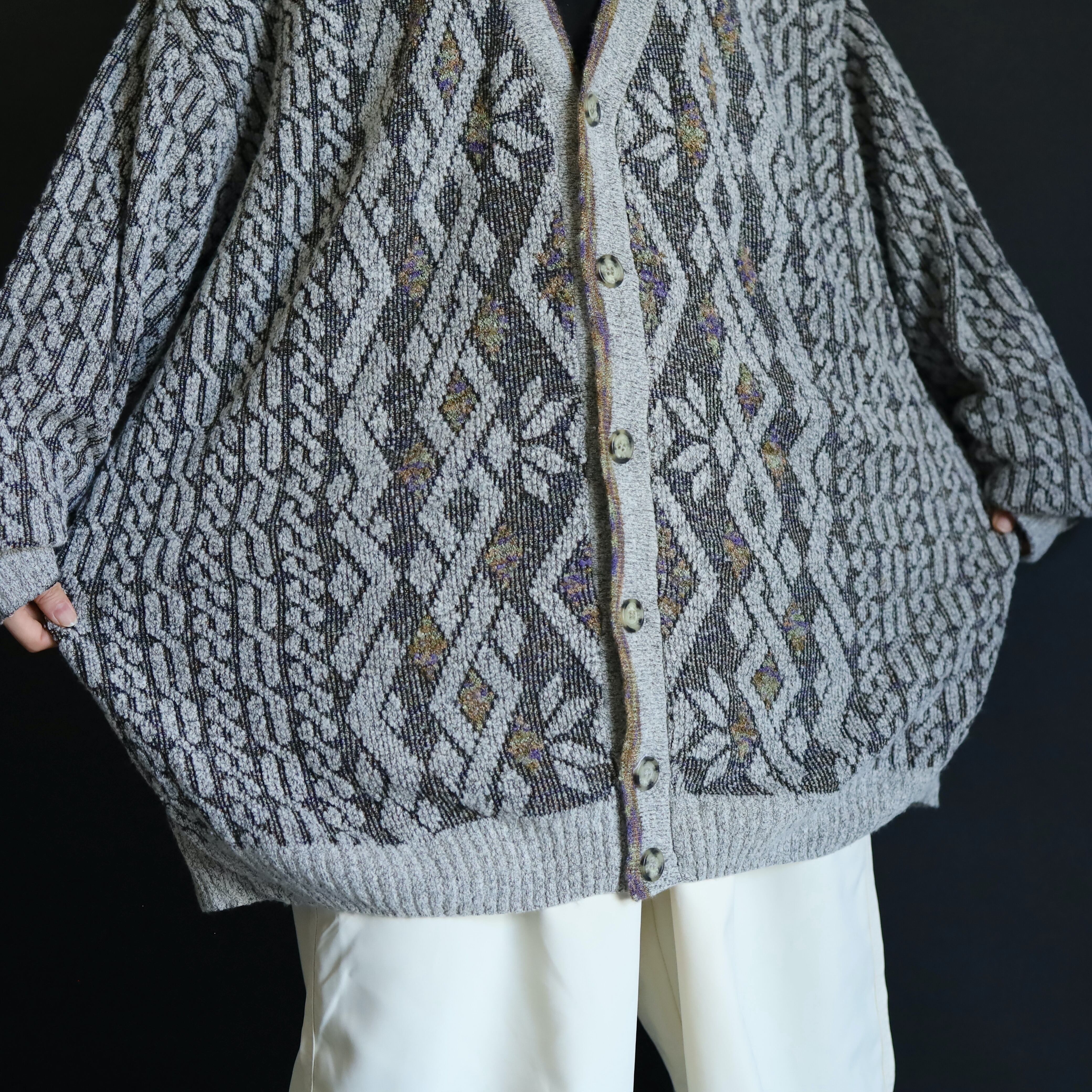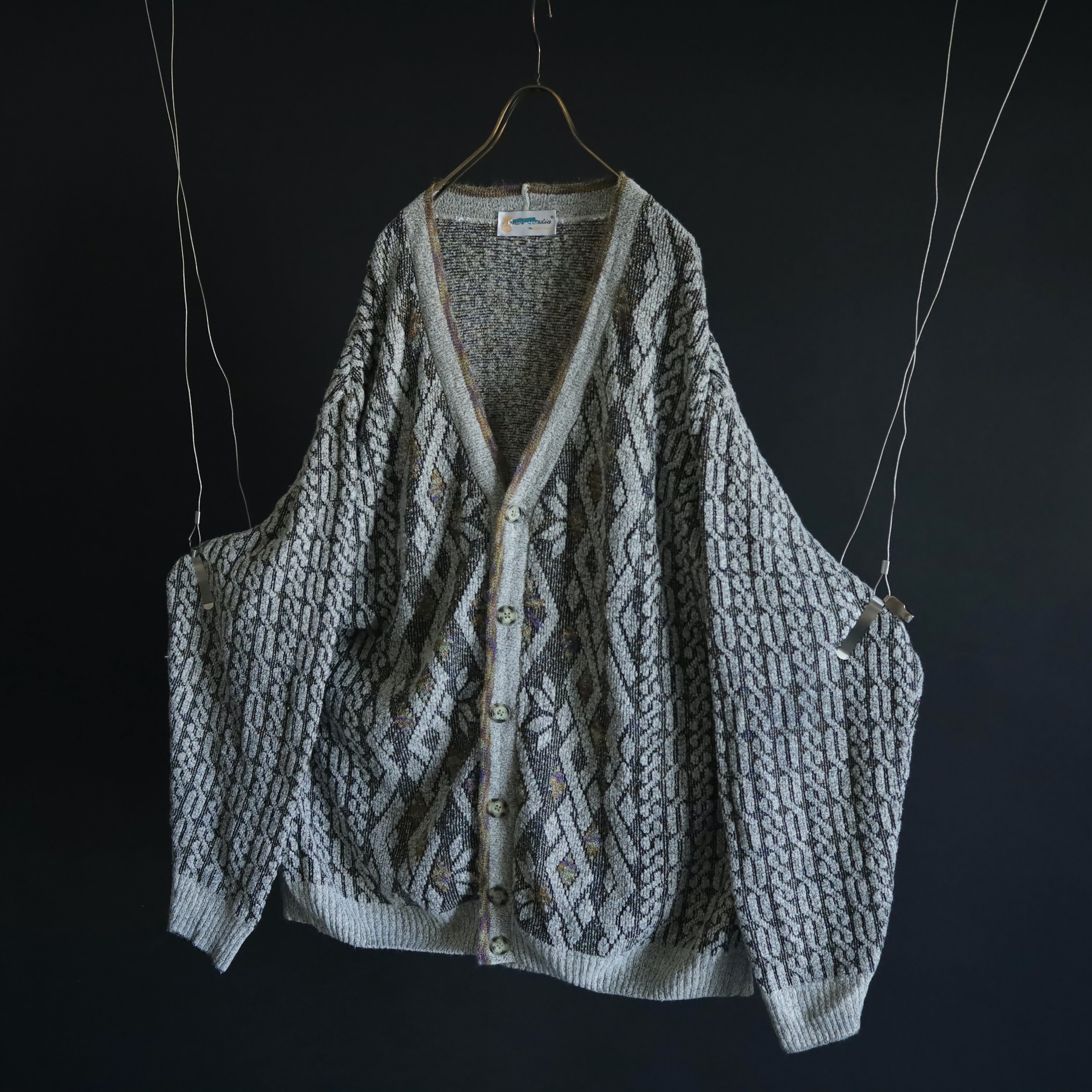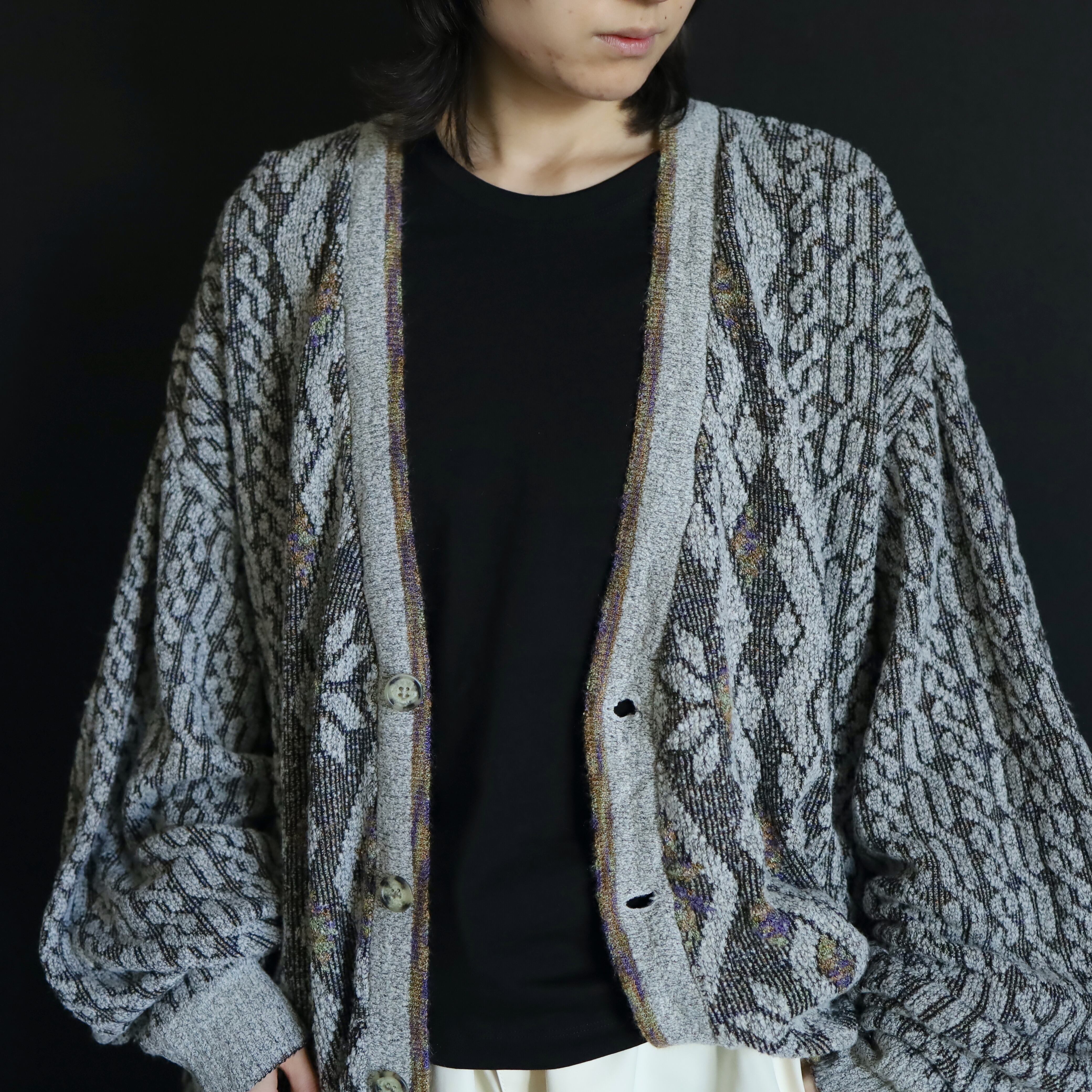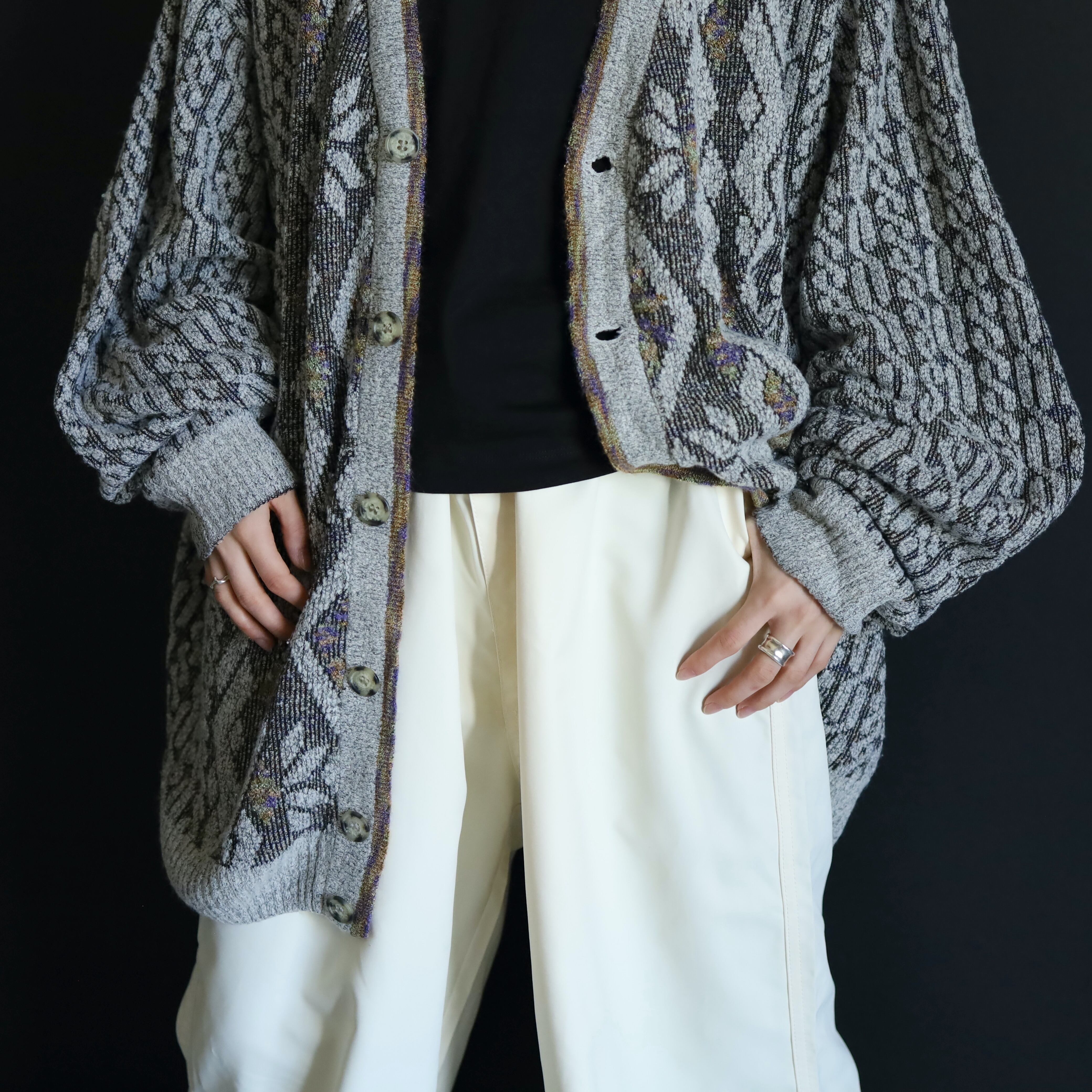 ヘザーグレーニットボディをベースに,ブラックやパープル,カーキなどをミックスした総柄.