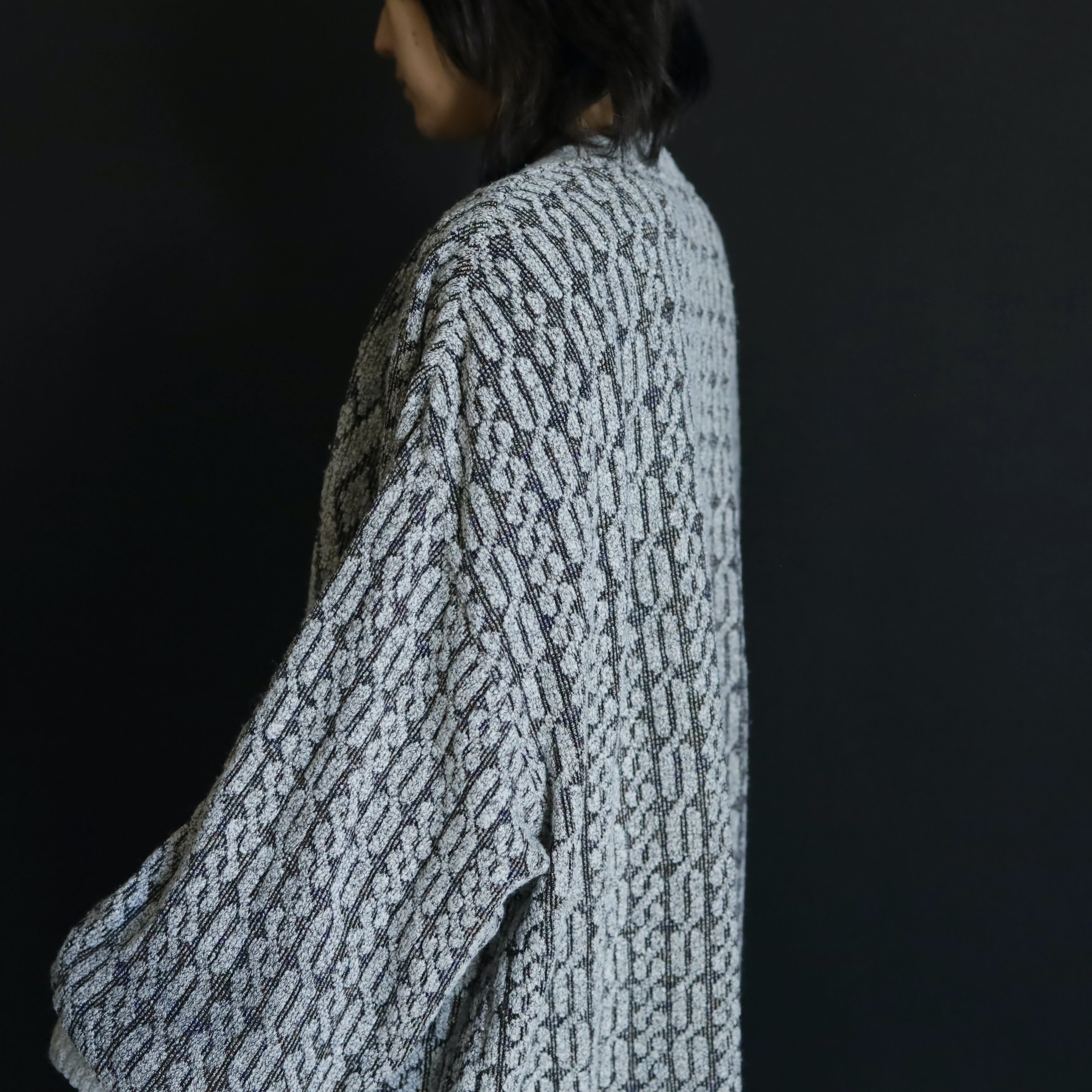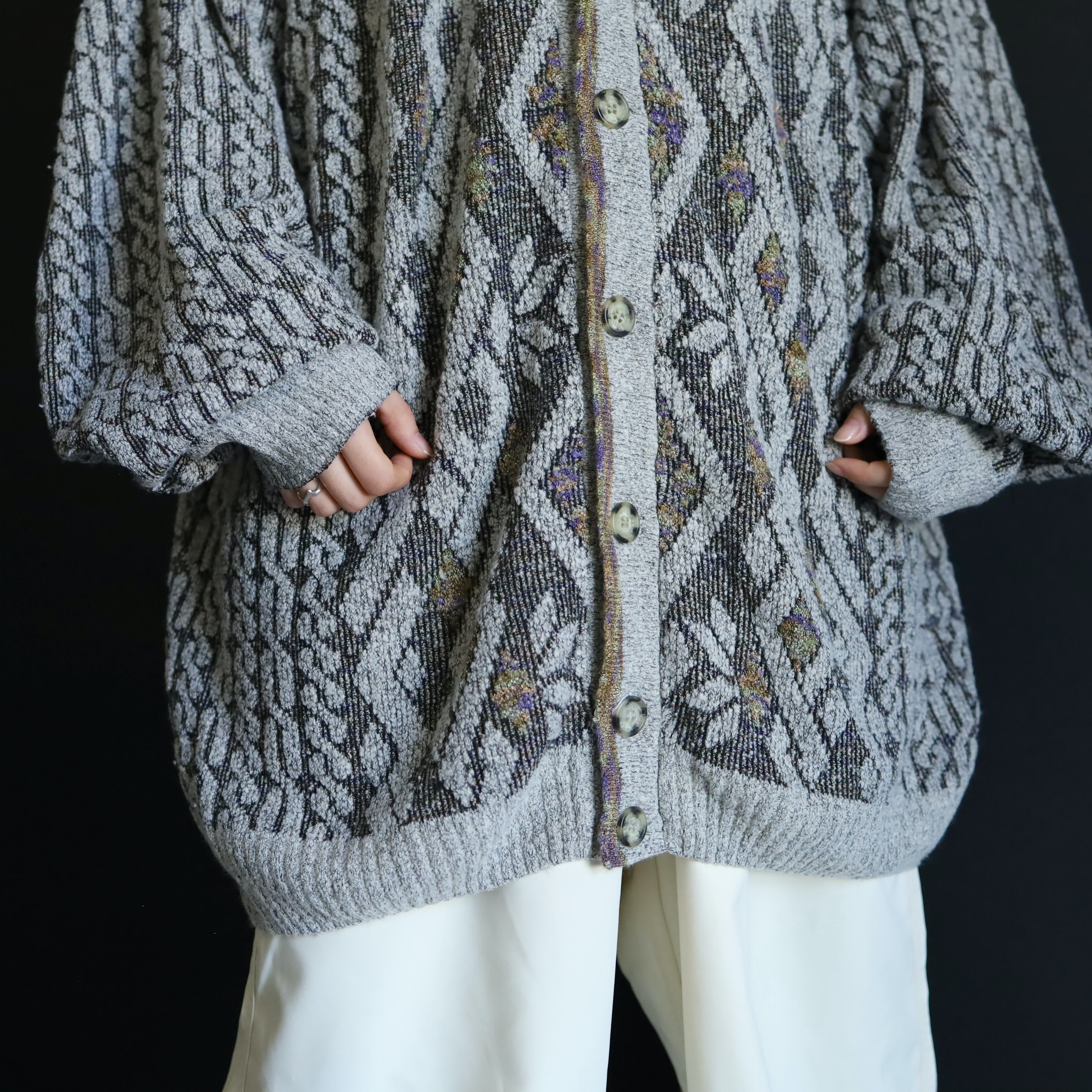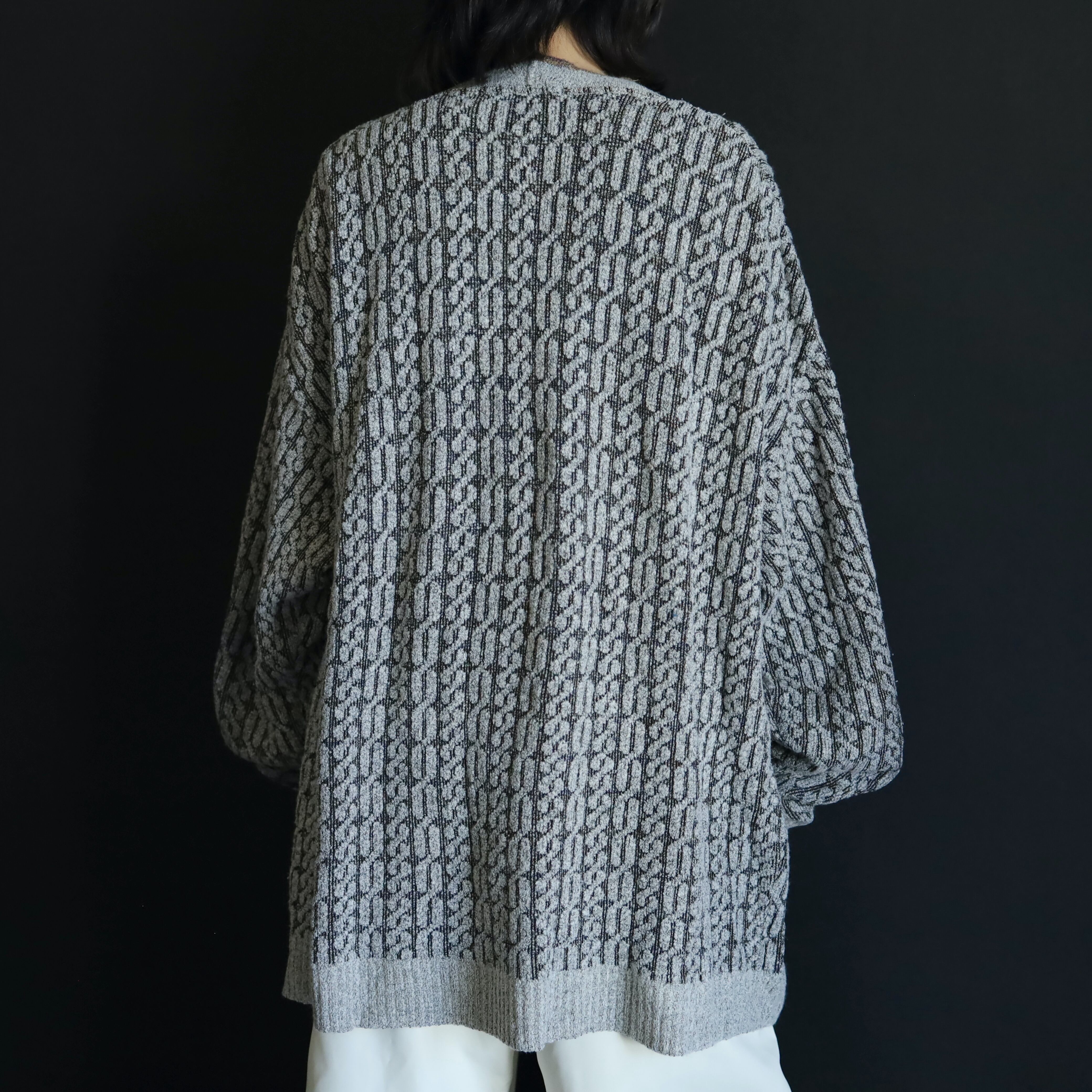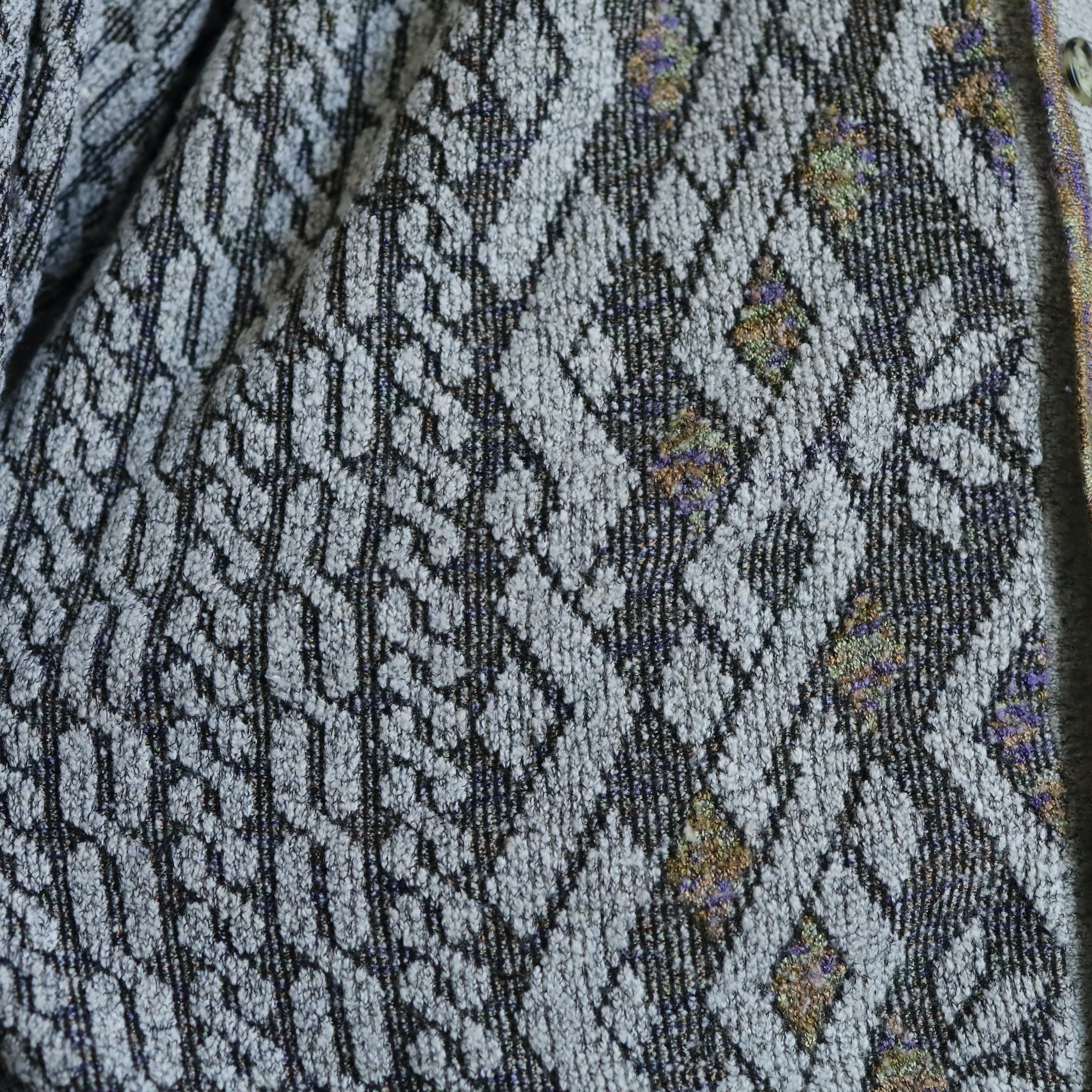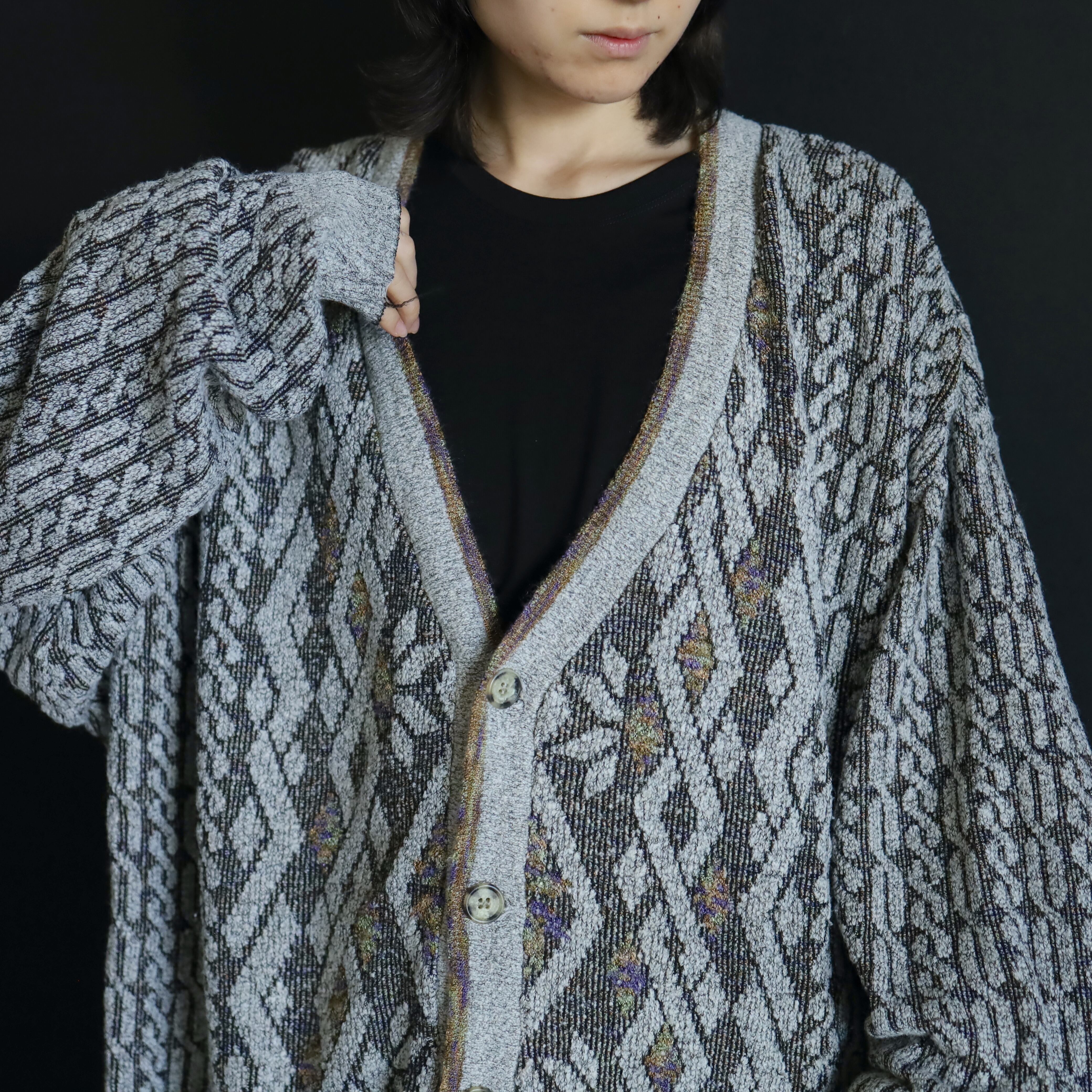 ヘザーグレーニットボディをベースに,ブラックやパープル,カーキなどをミックスした総柄.