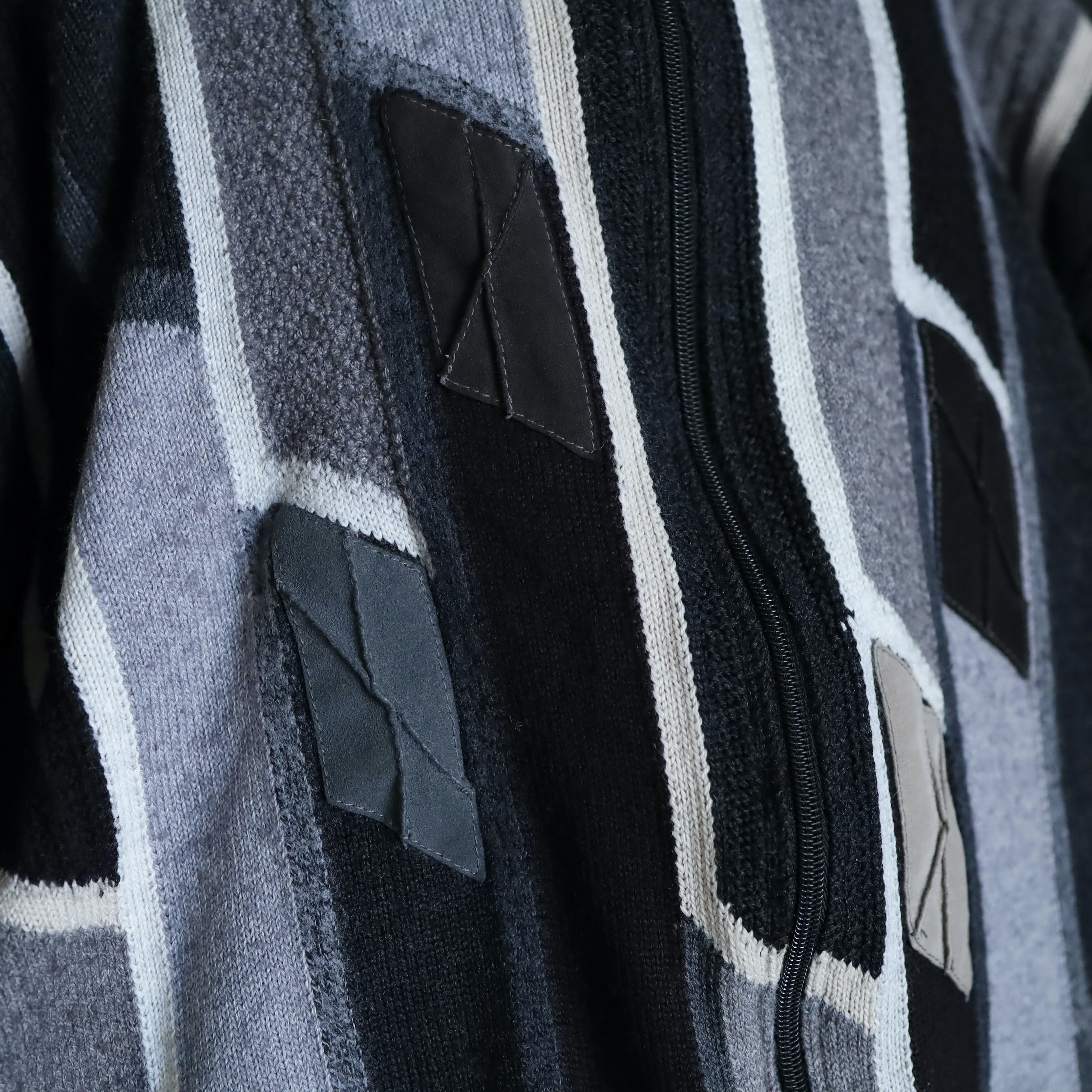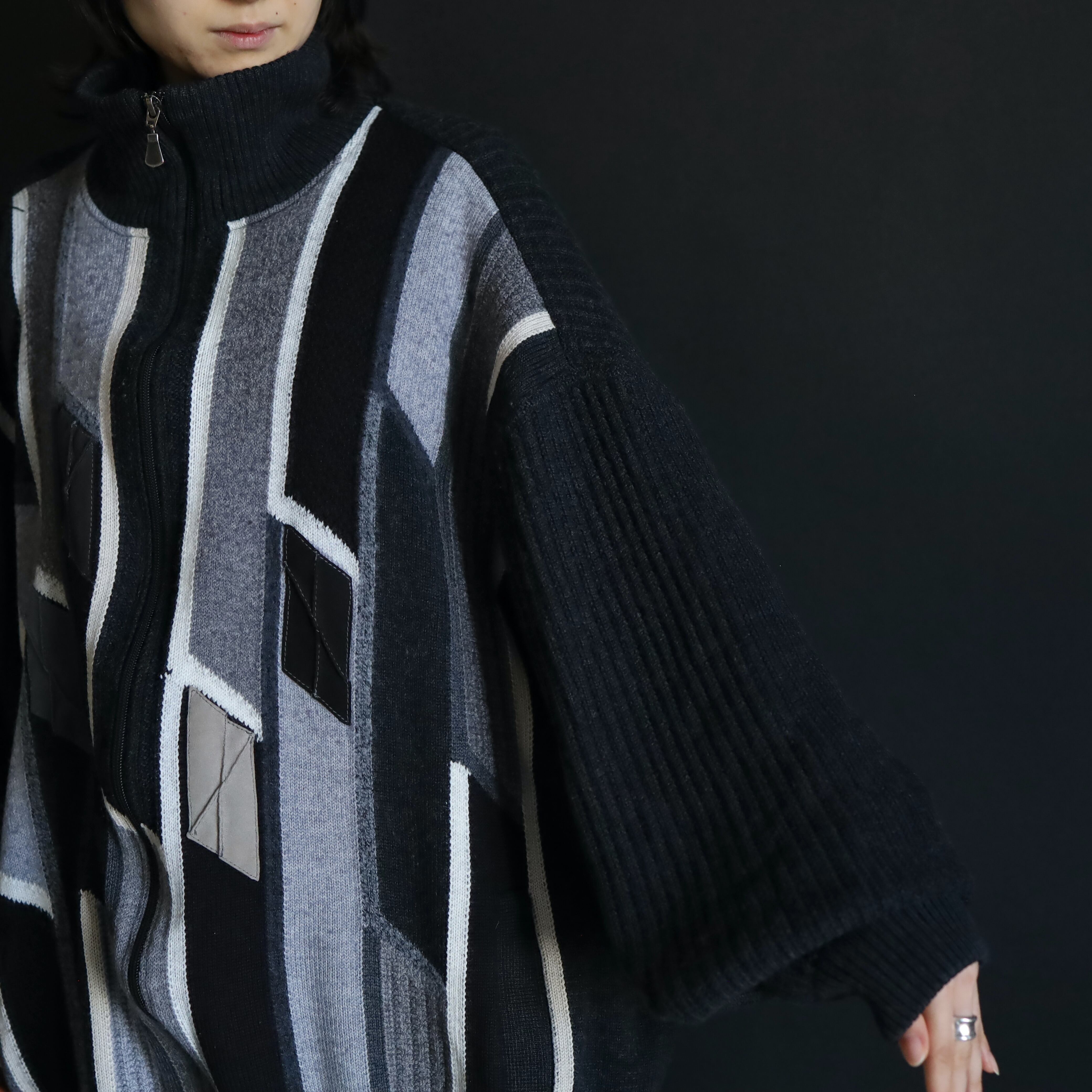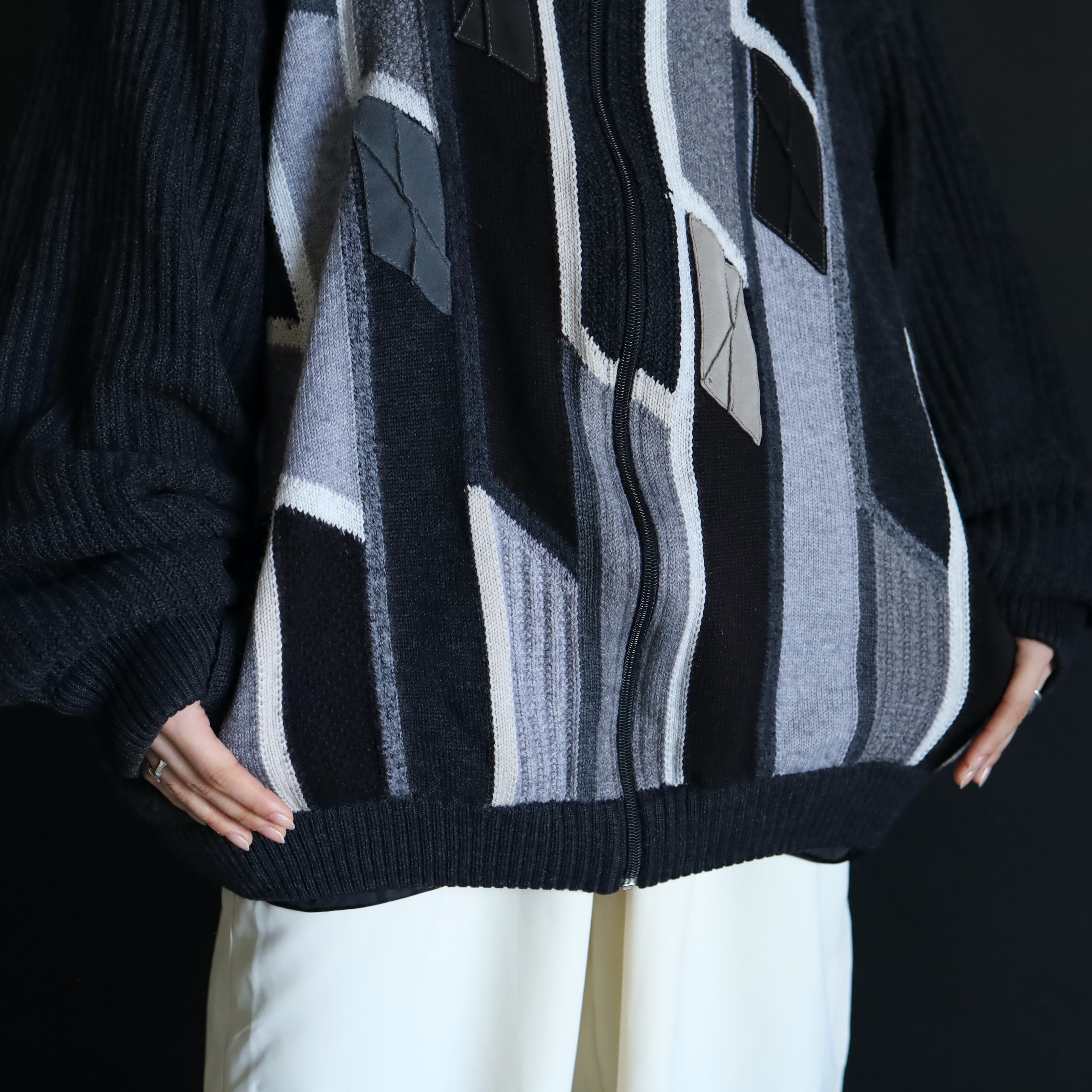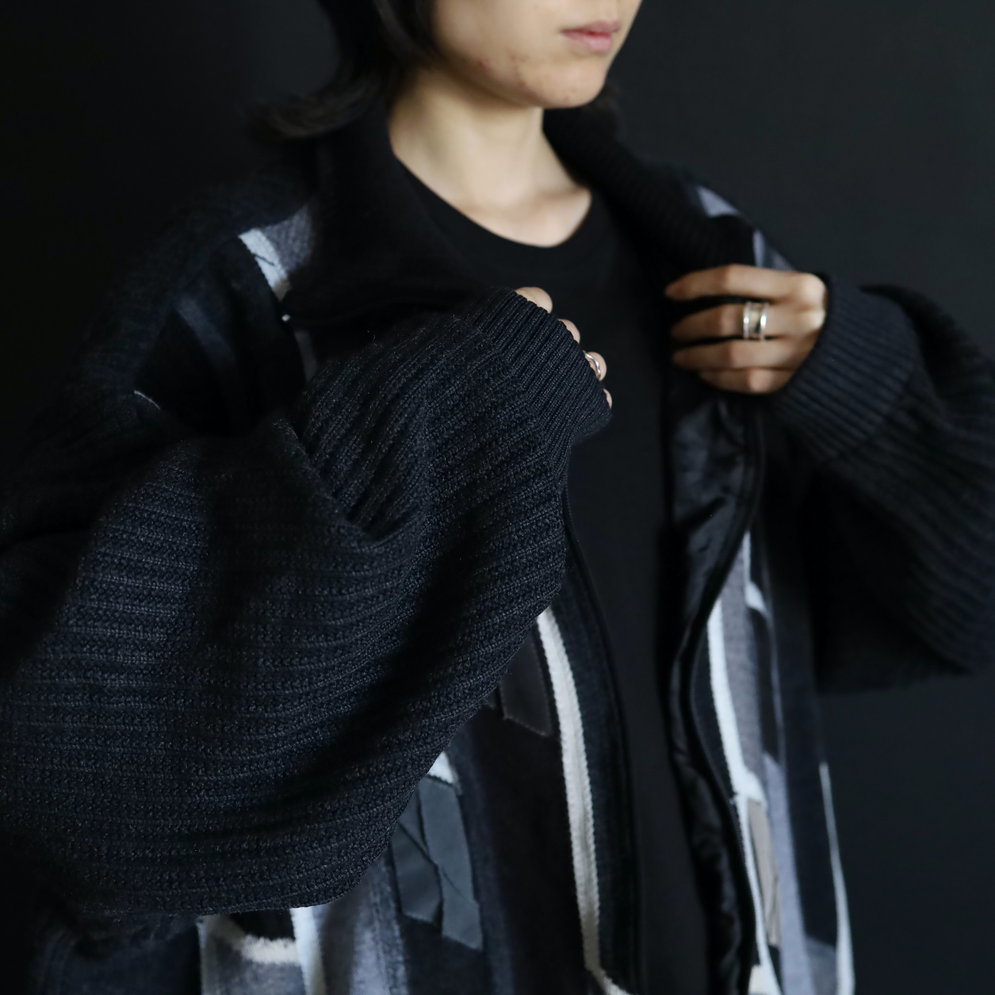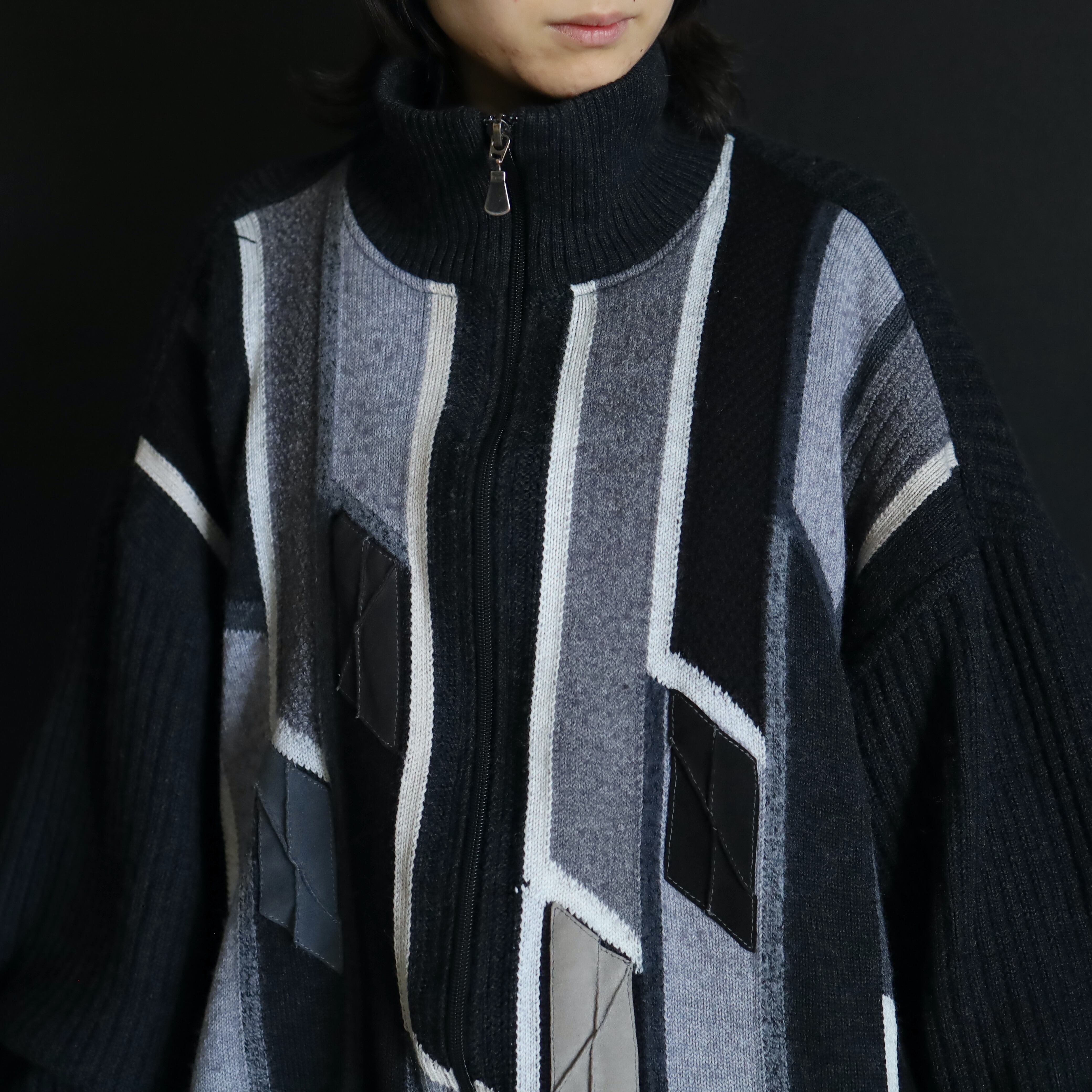 ブラックカラーニットボディを基調として,前身頃にモノクロのパネル切替に加え,フェイクスエード生地を当てがったデザイン.