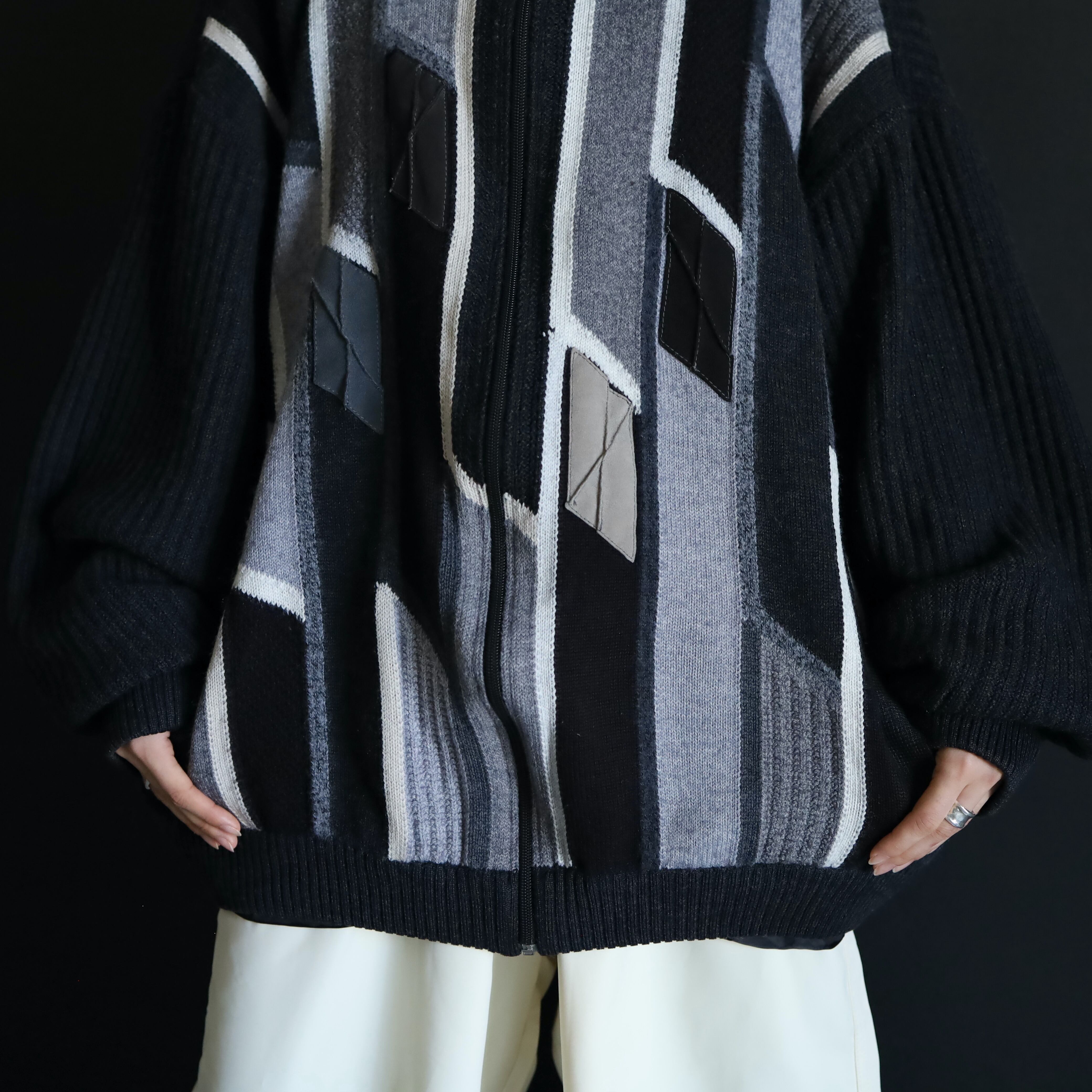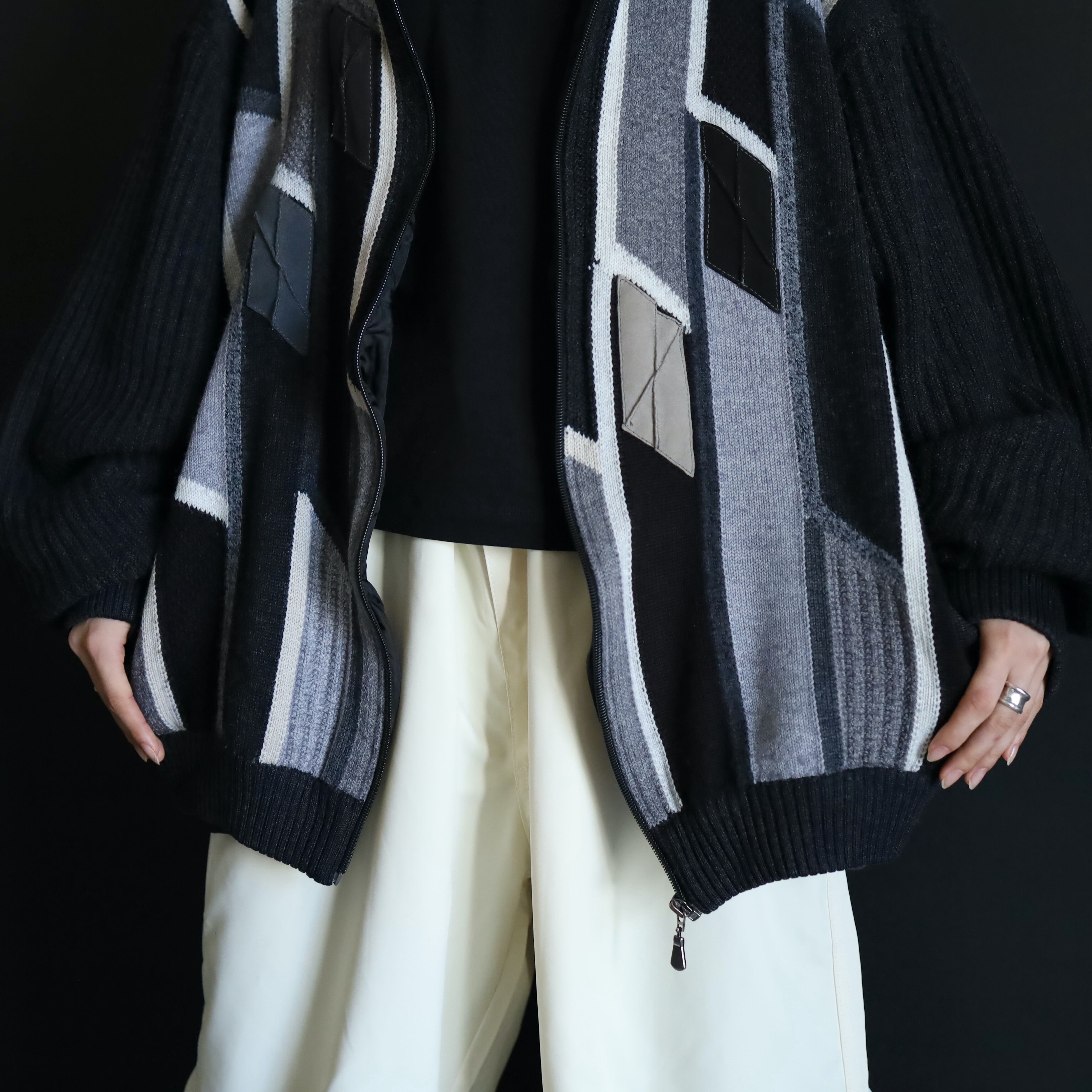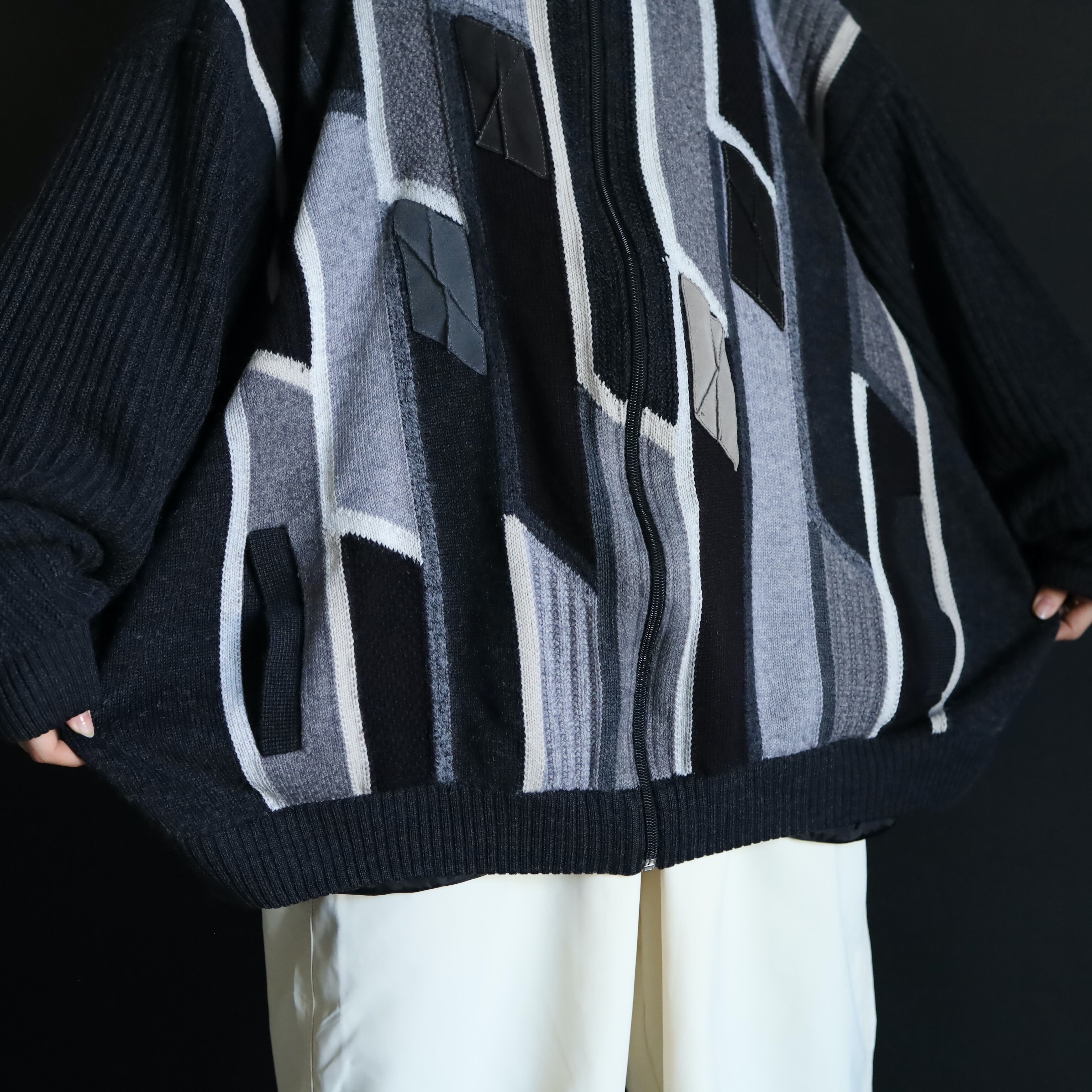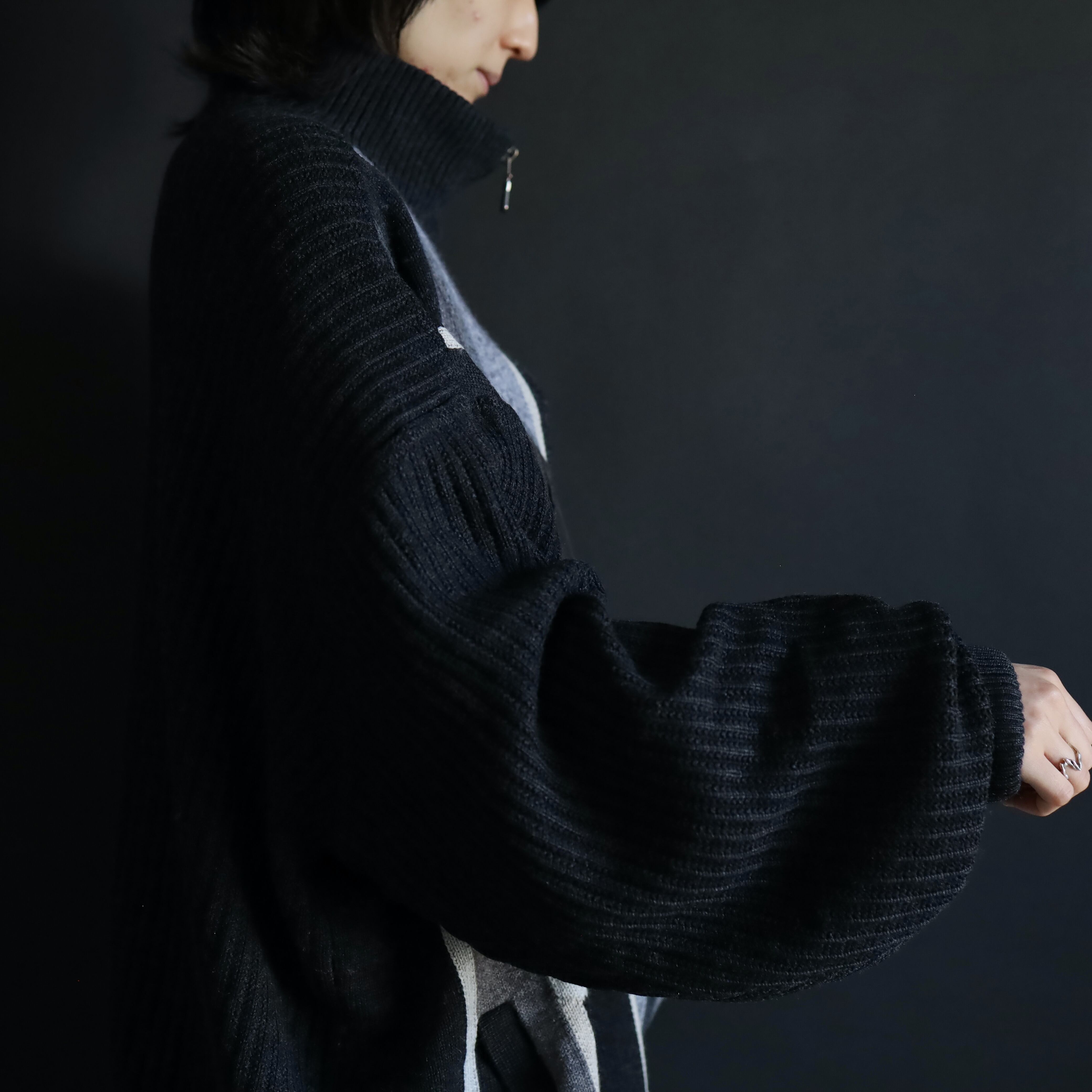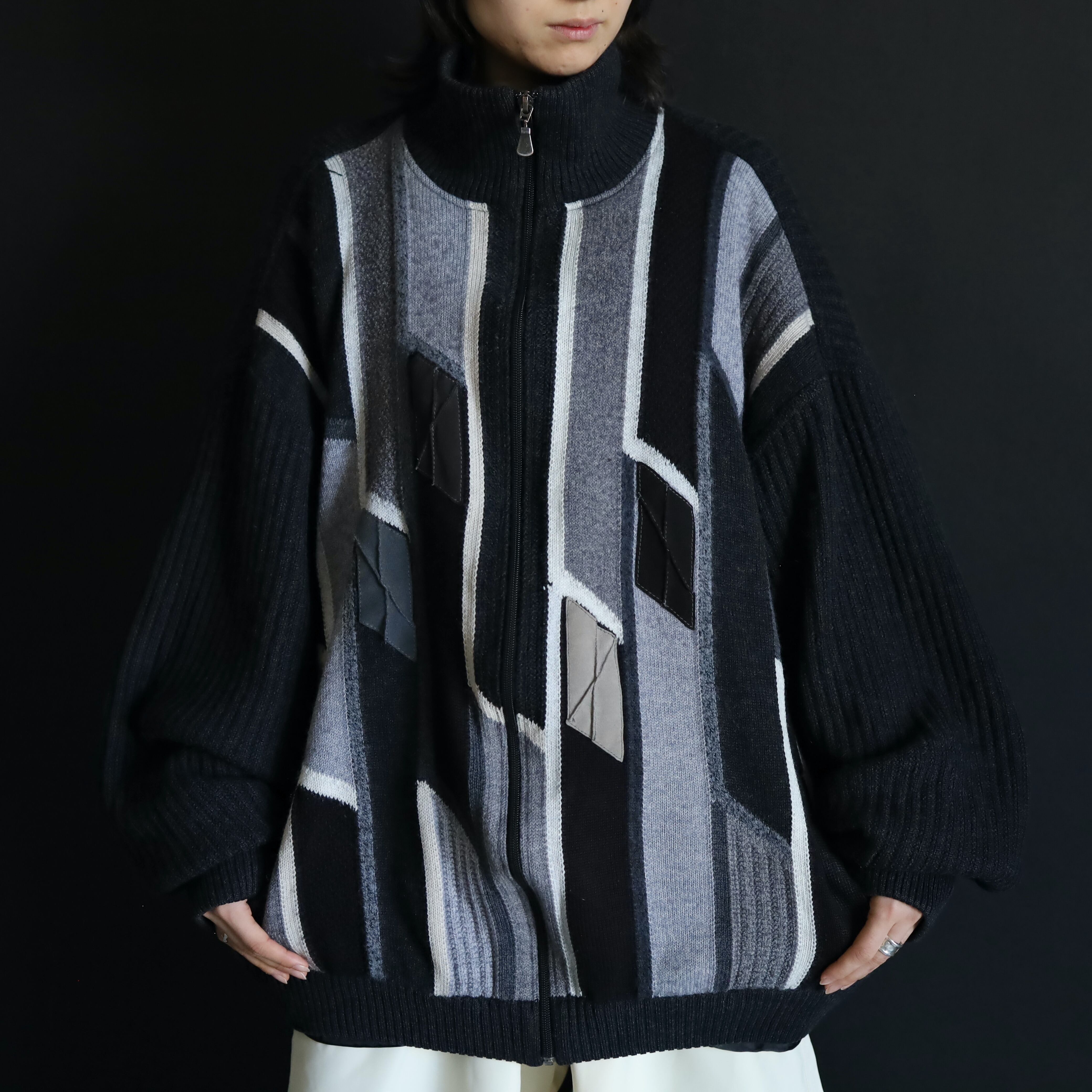 ブラックカラーニットボディを基調として,前身頃にモノクロのパネル切替に加え,フェイクスエード生地を当てがったデザイン.