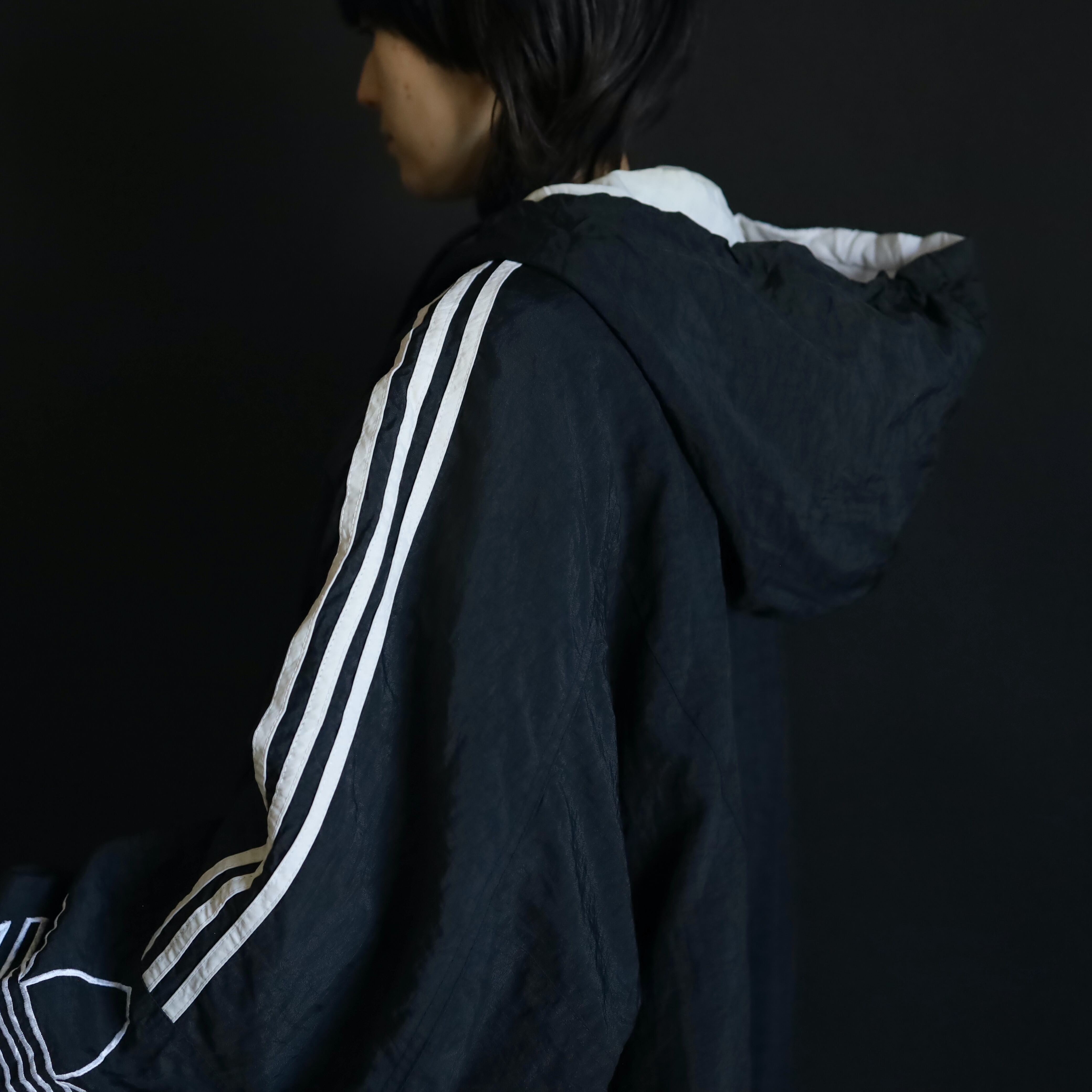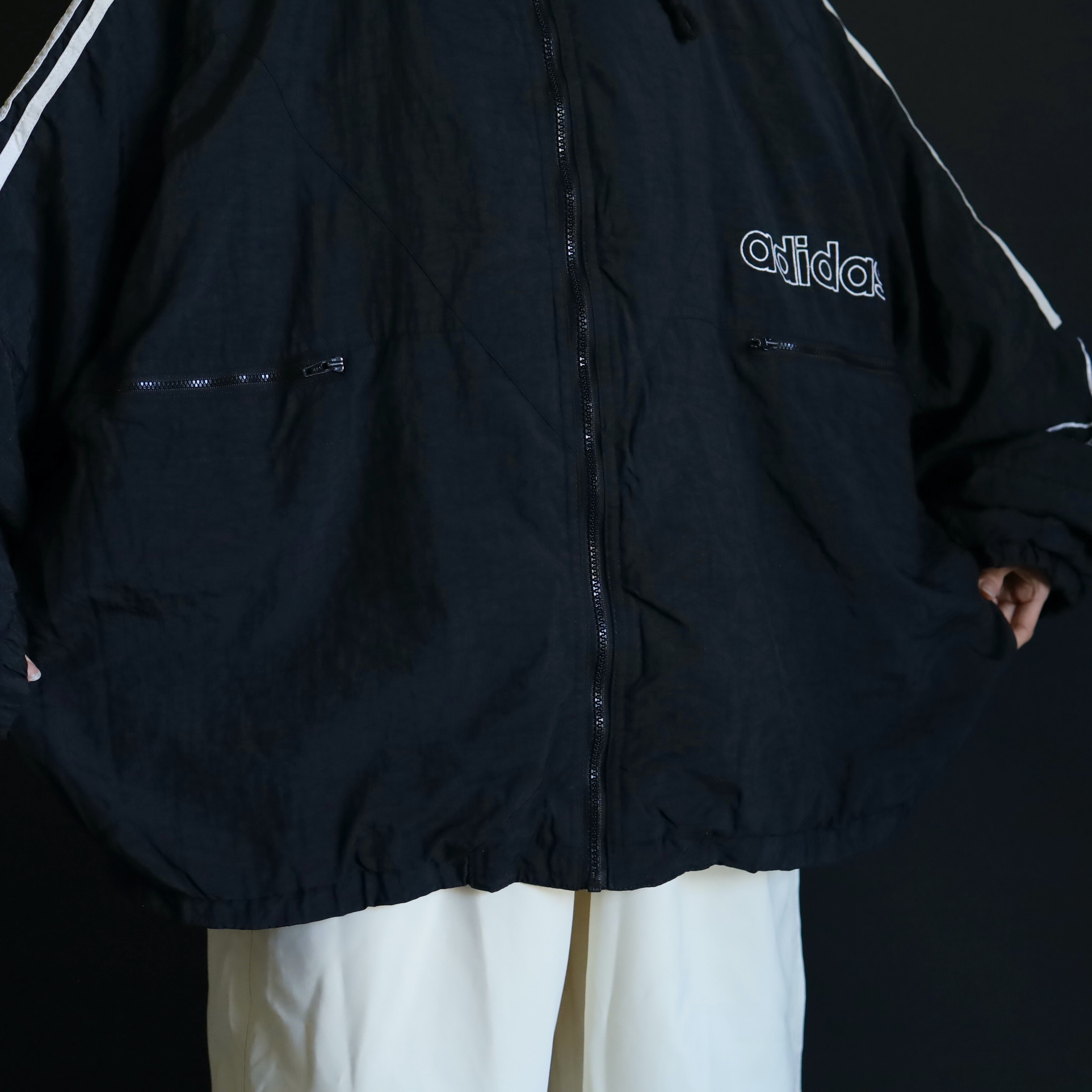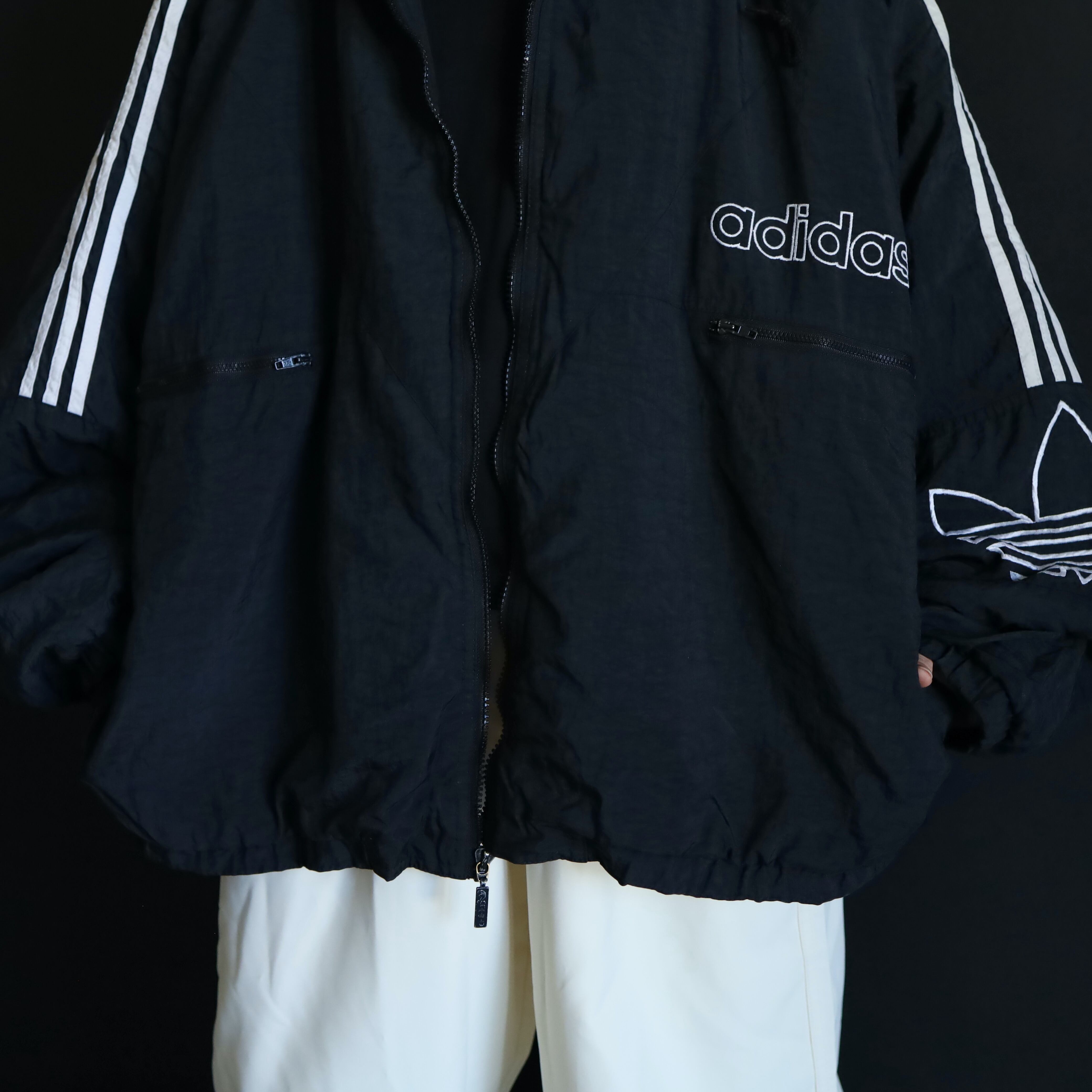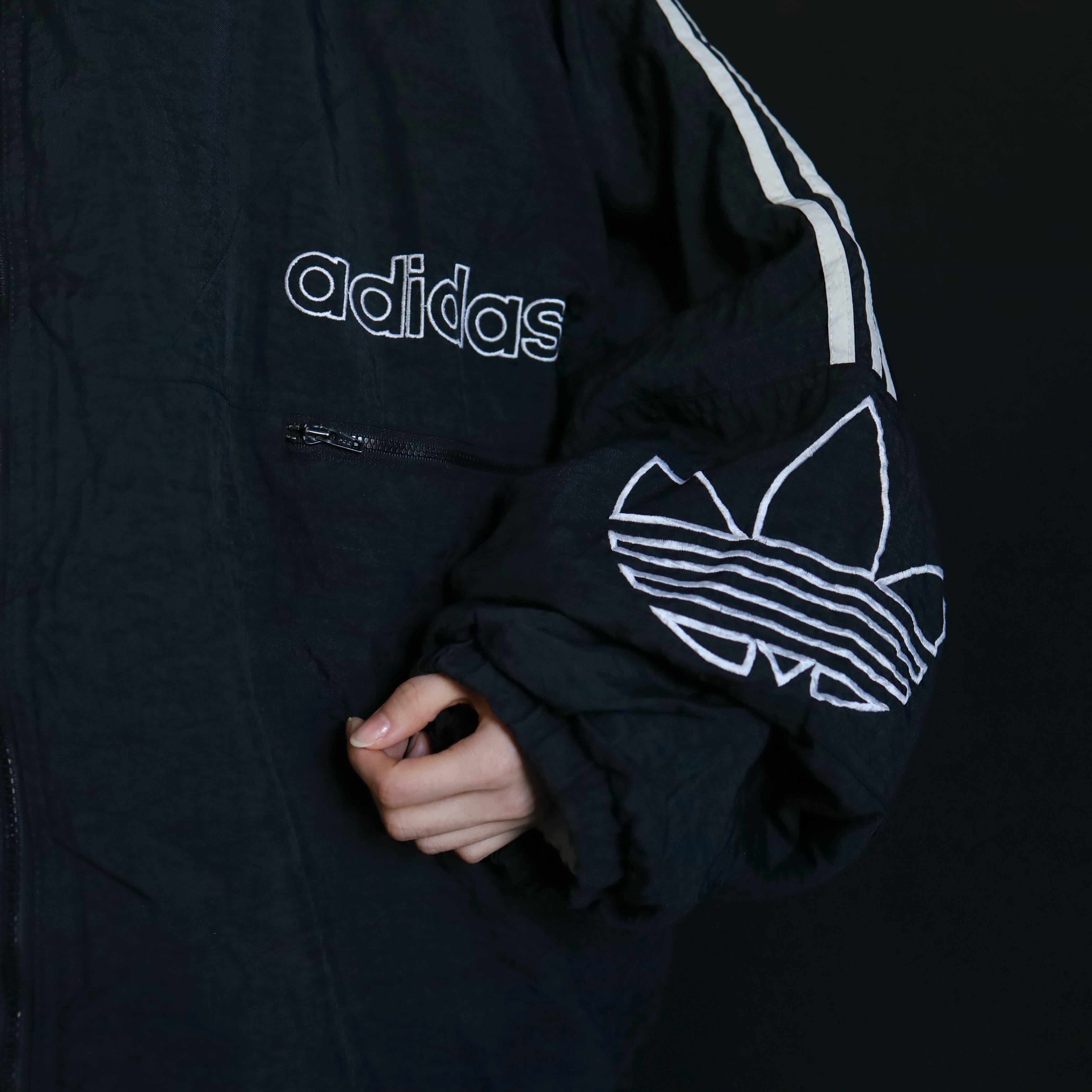 肩から袖中腹にかけてはお馴染みのライン切替,左胸下にadidasのネーム刺繍,左袖にはトレフォイル刺繍.
