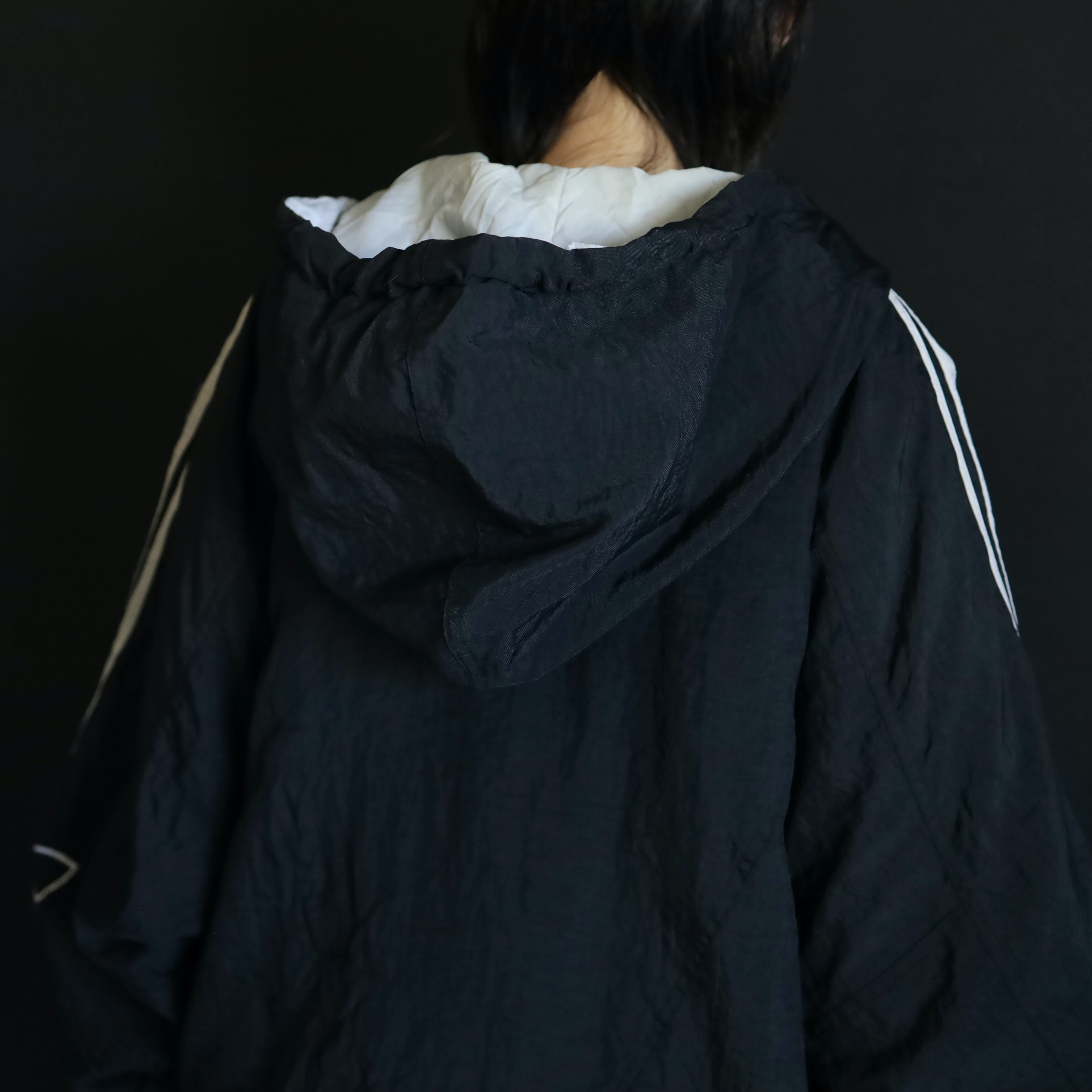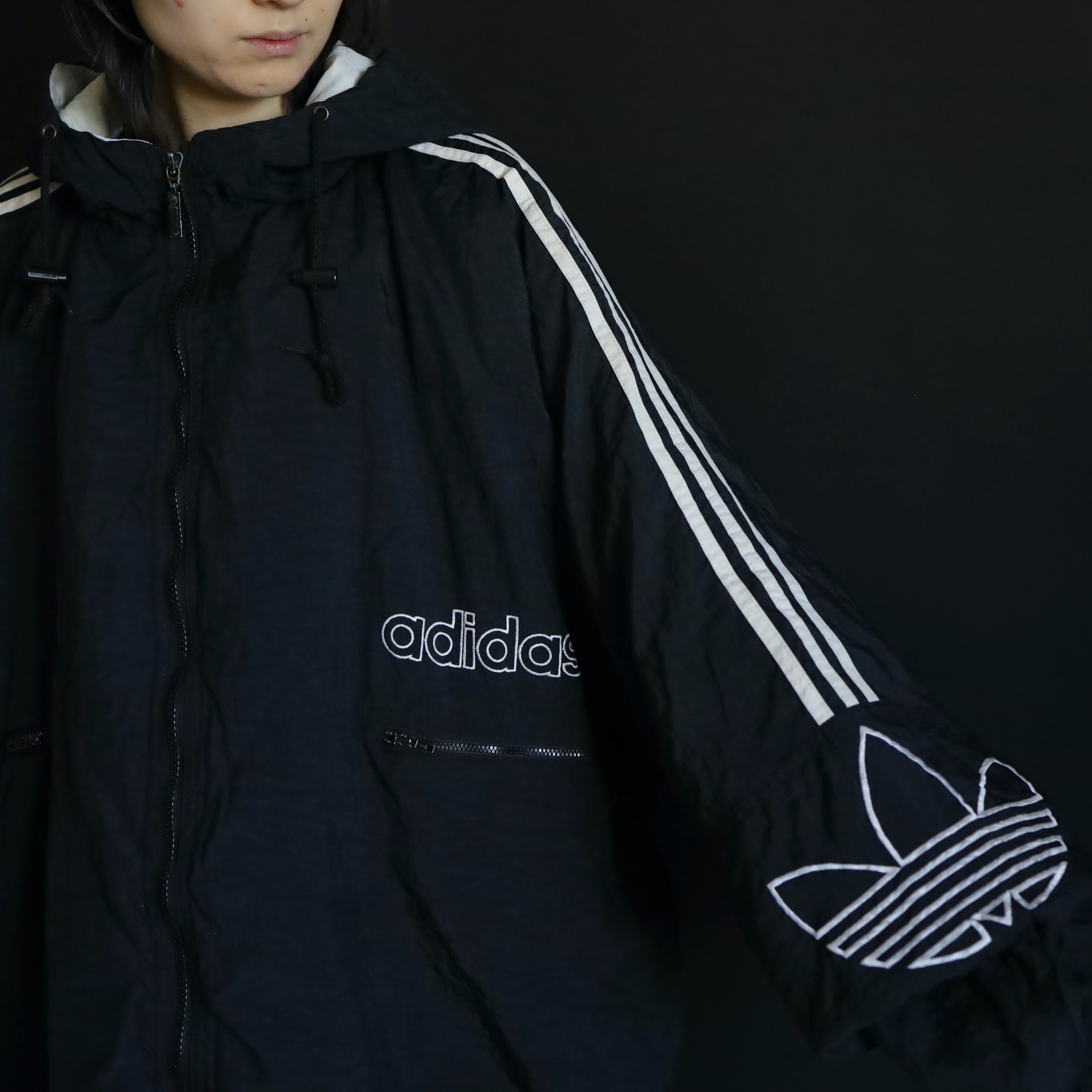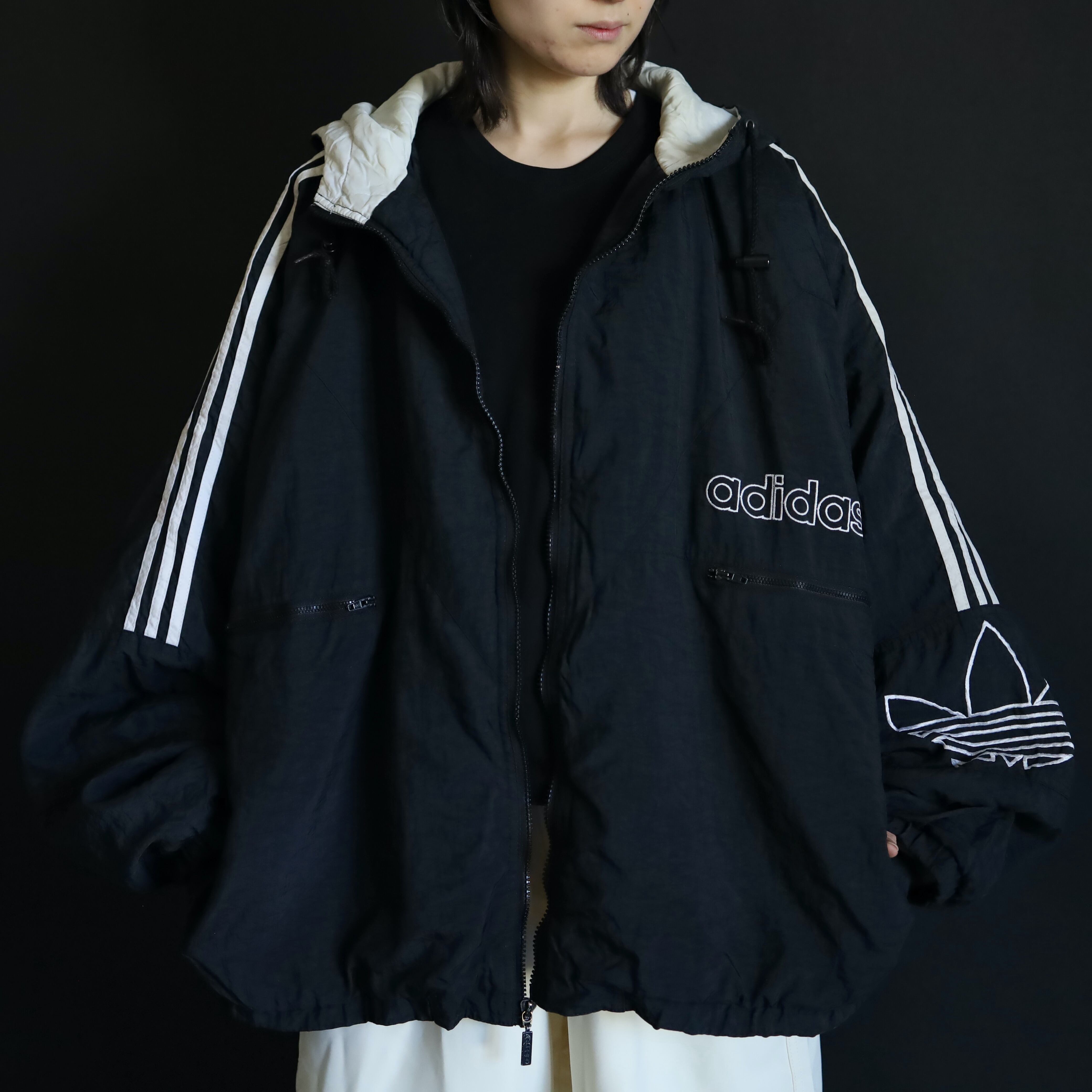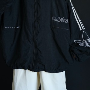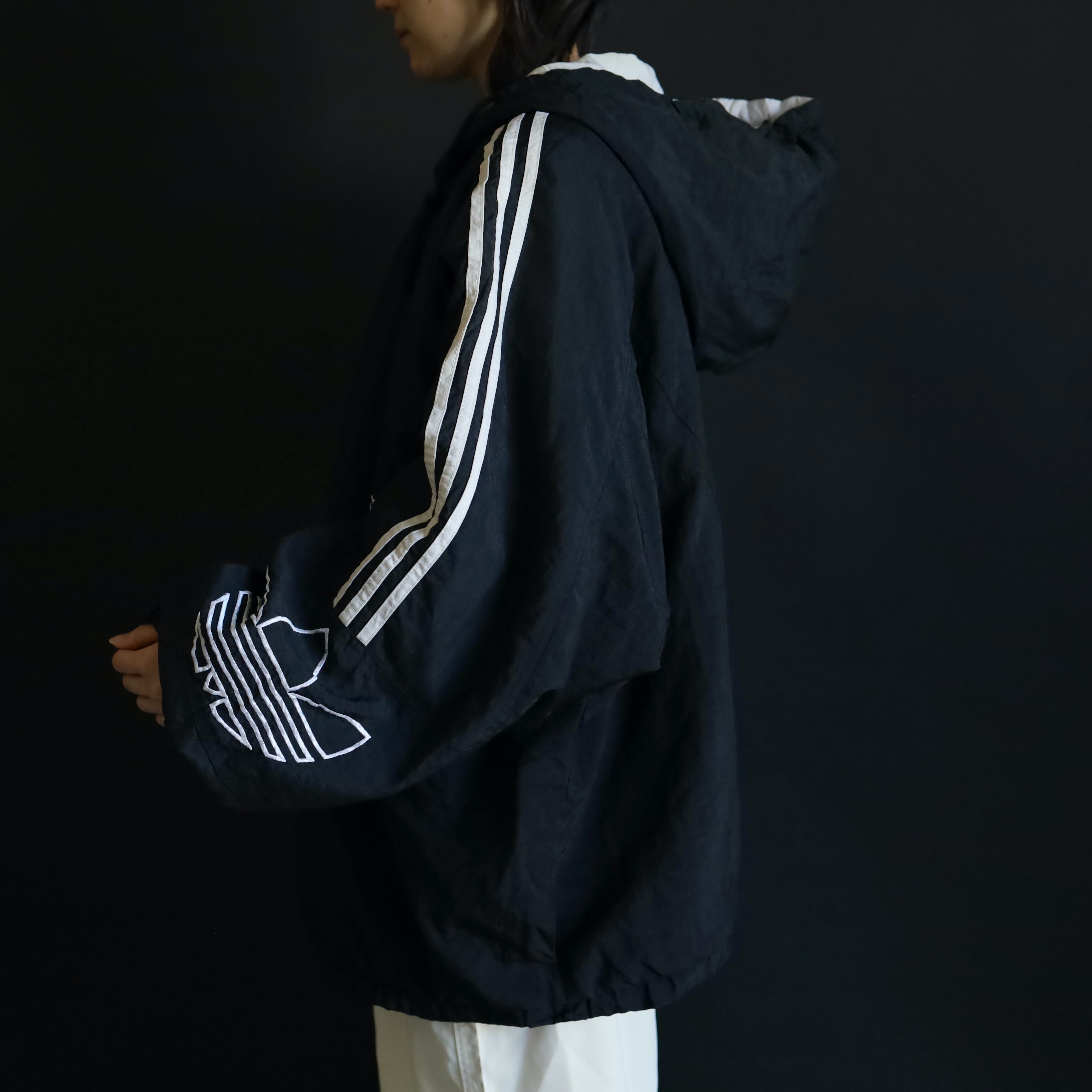 肩から袖中腹にかけてはお馴染みのライン切替,左胸下にadidasのネーム刺繍,左袖にはトレフォイル刺繍.