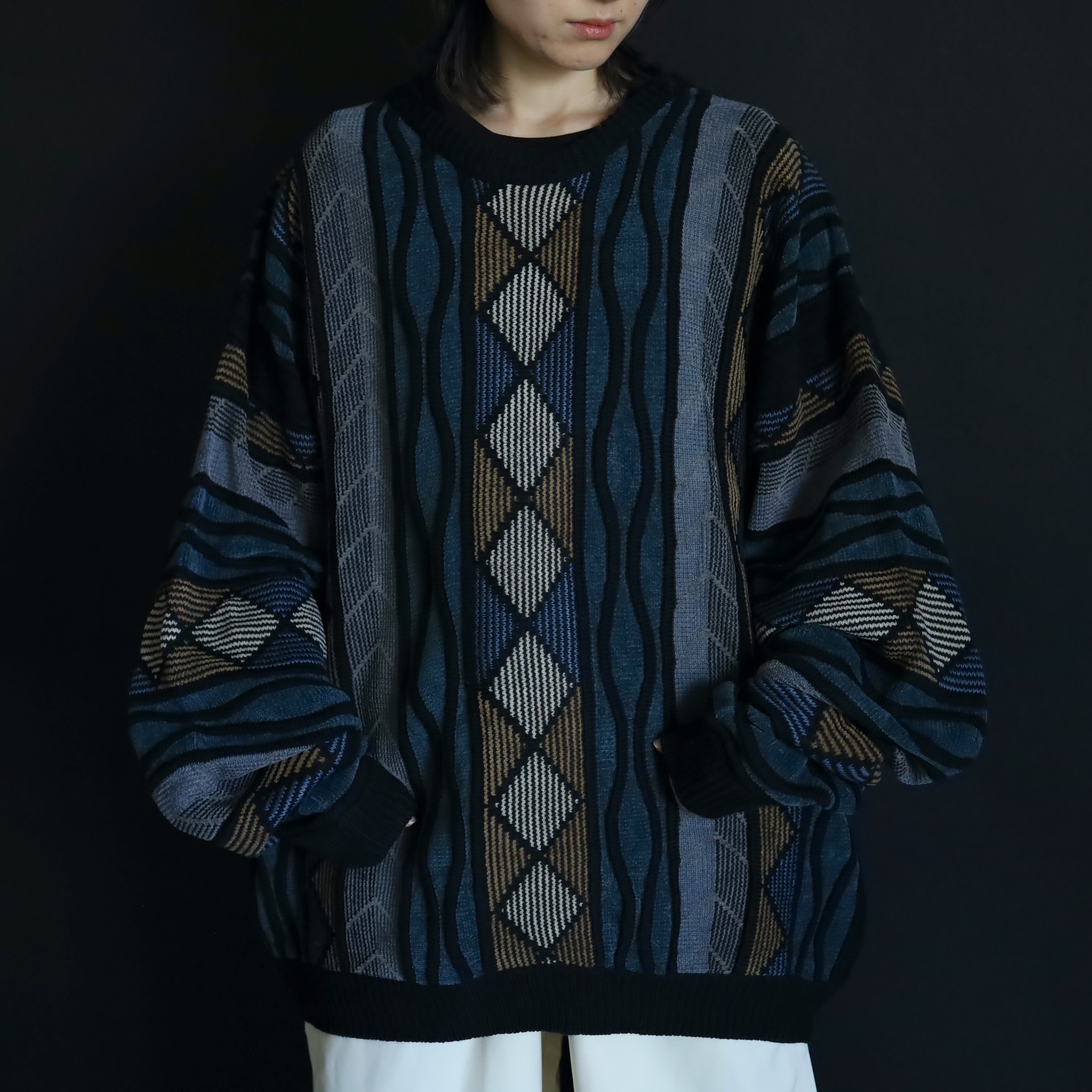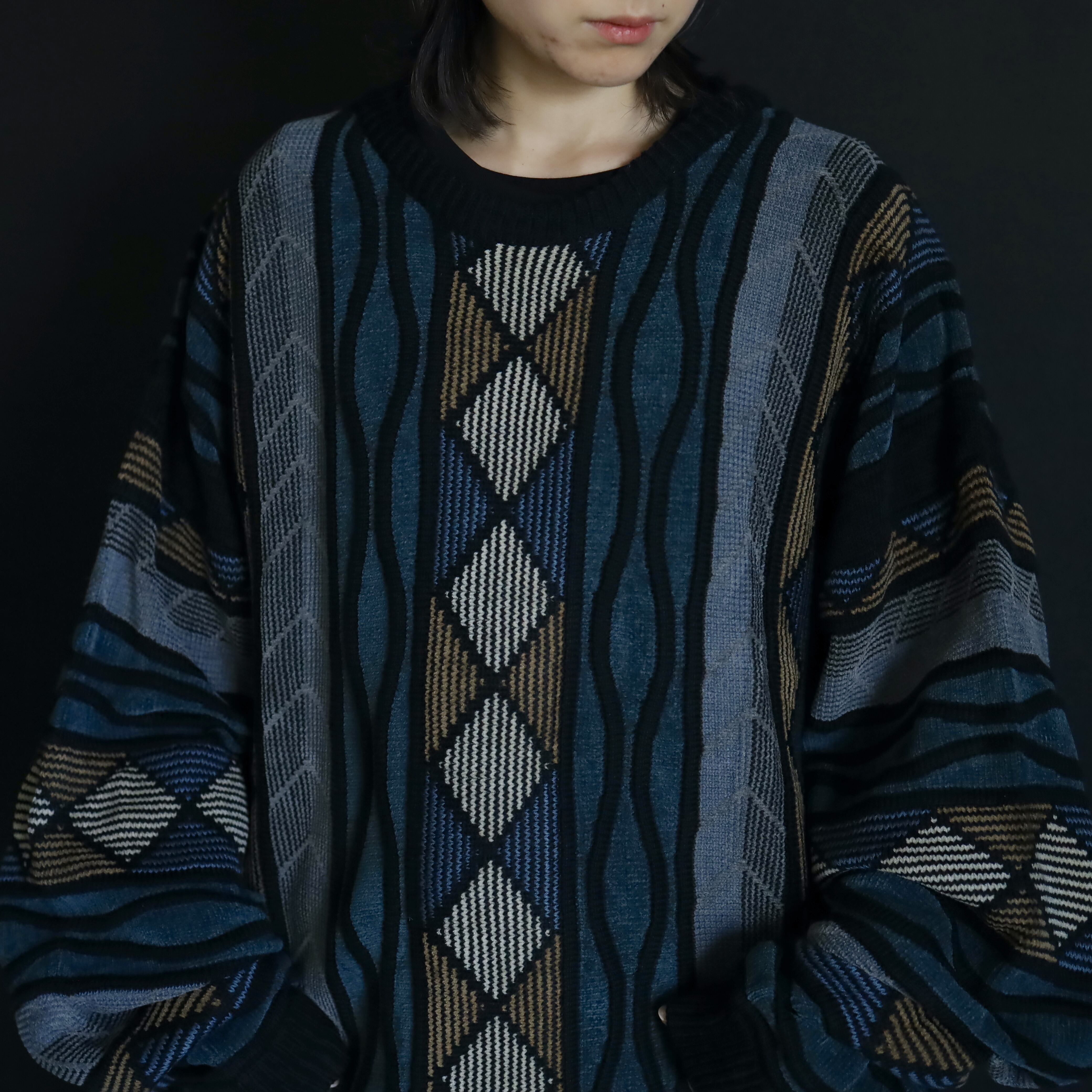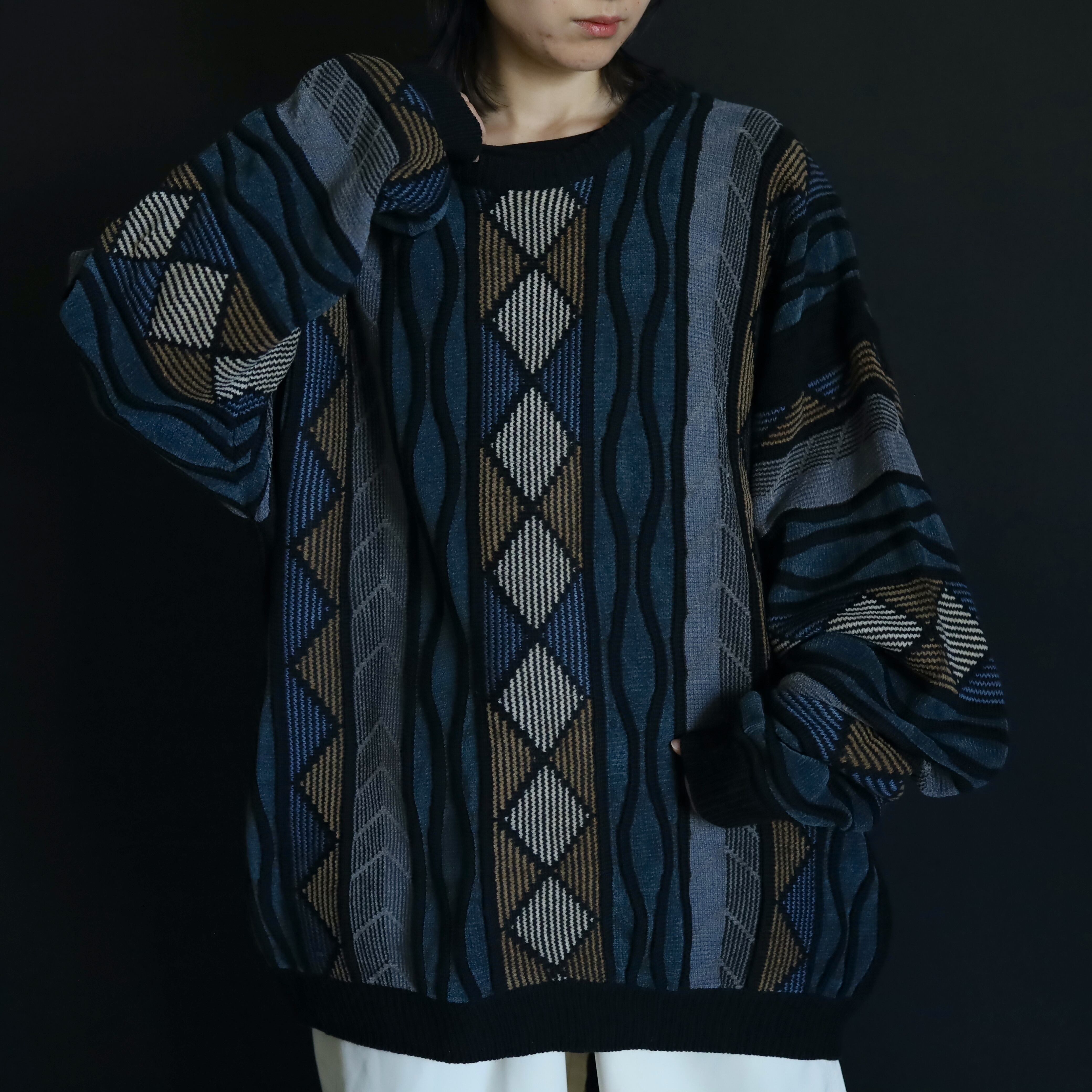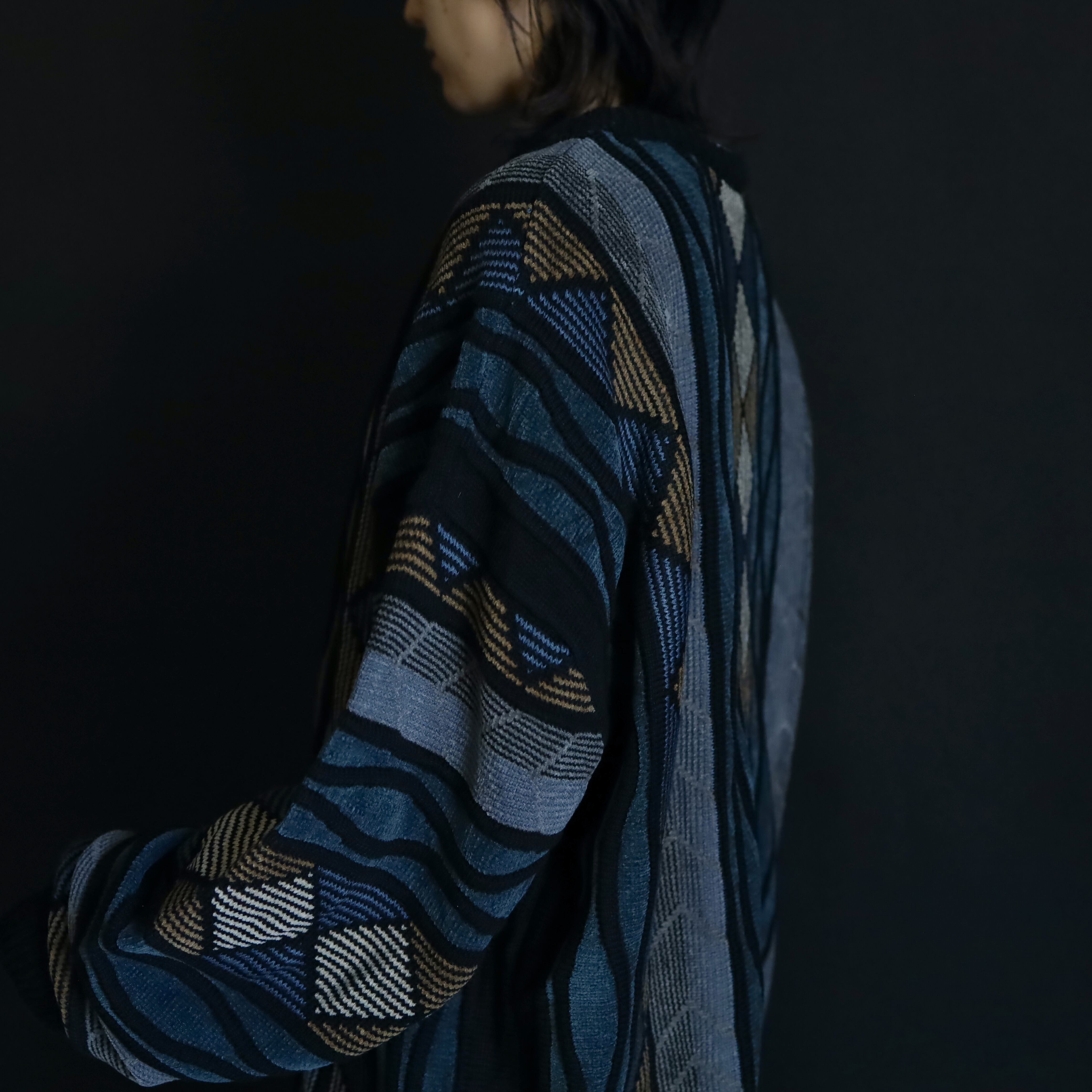 くすんだ風合いが特徴的なデザインニットセーター.