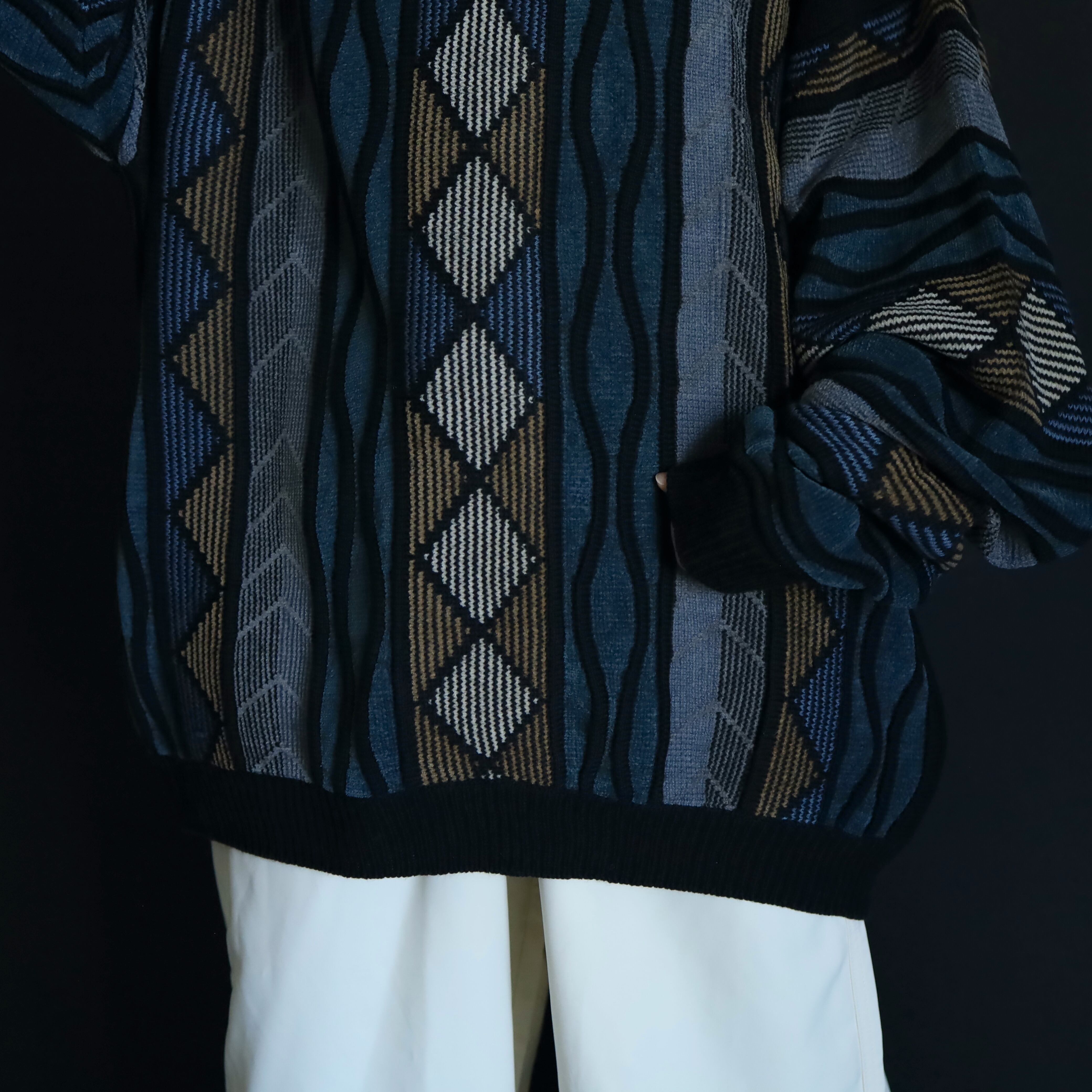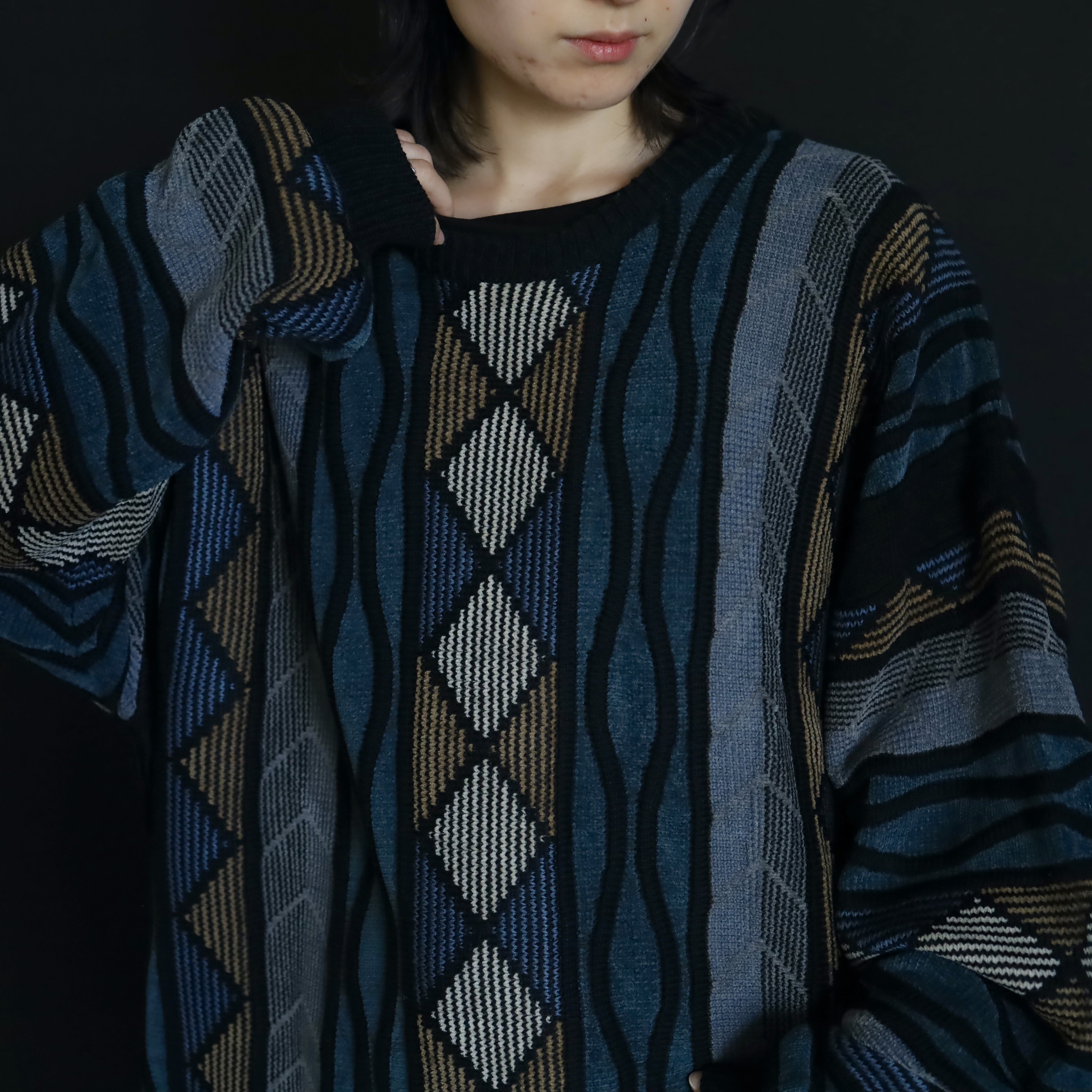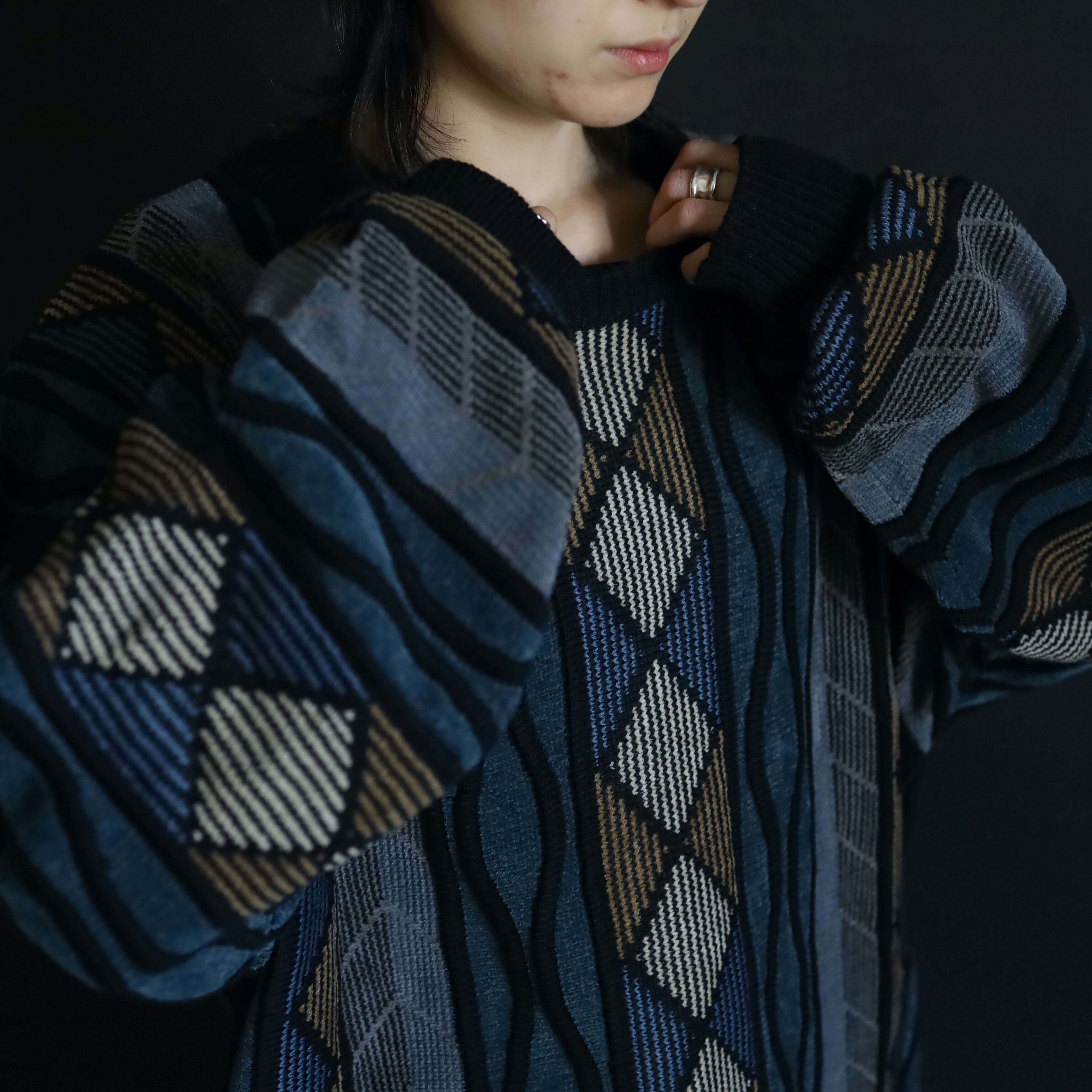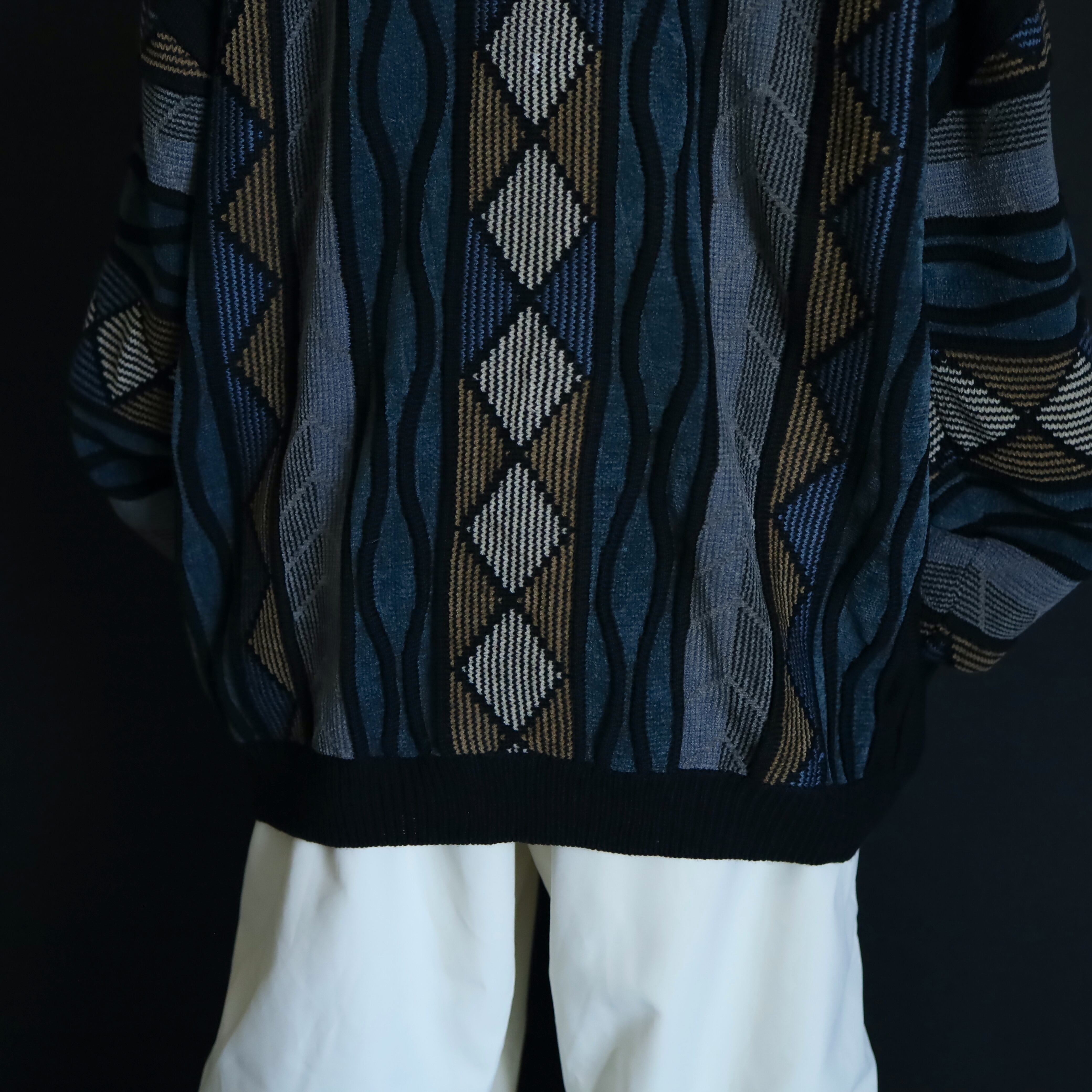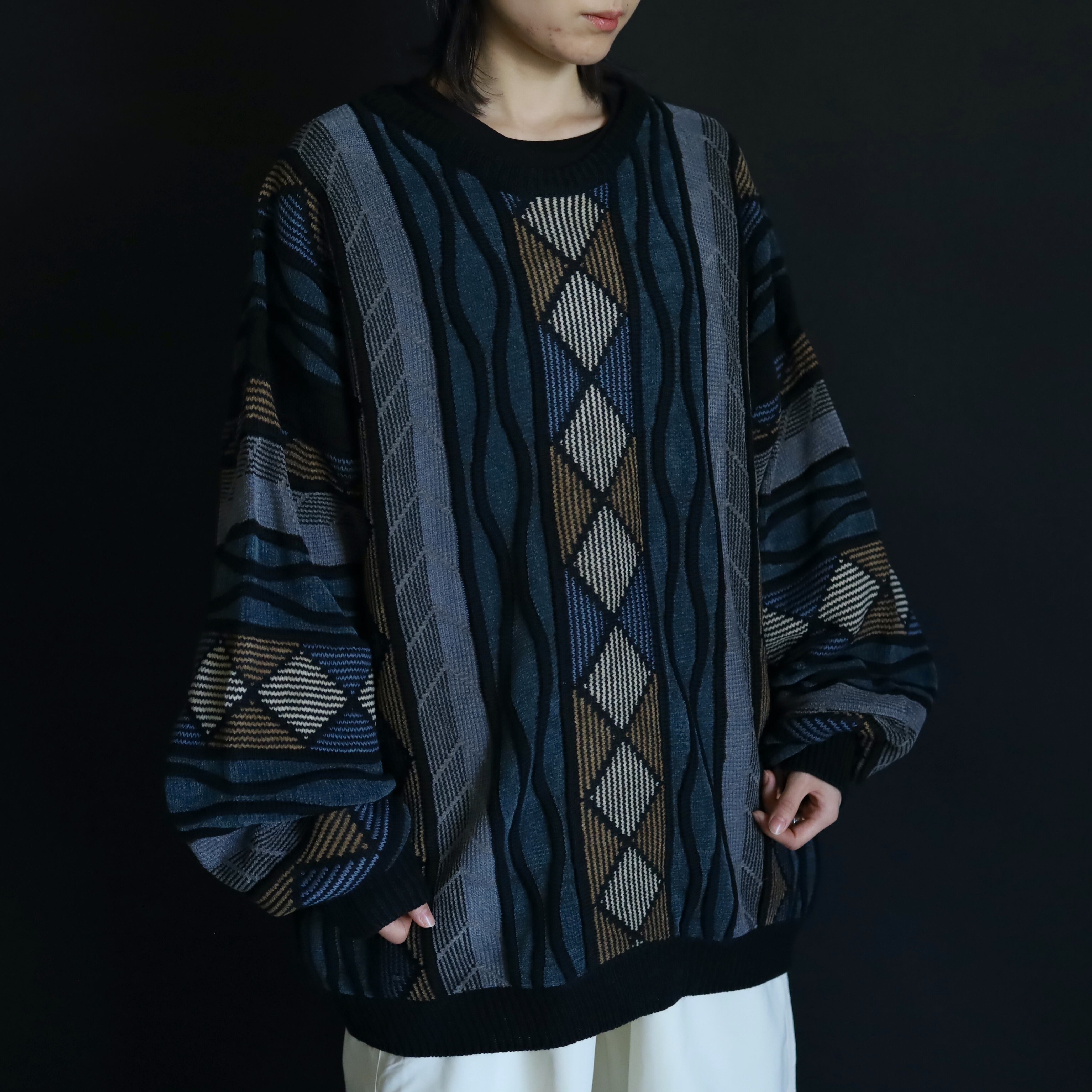 くすんだ風合いが特徴的なデザインニットセーター.