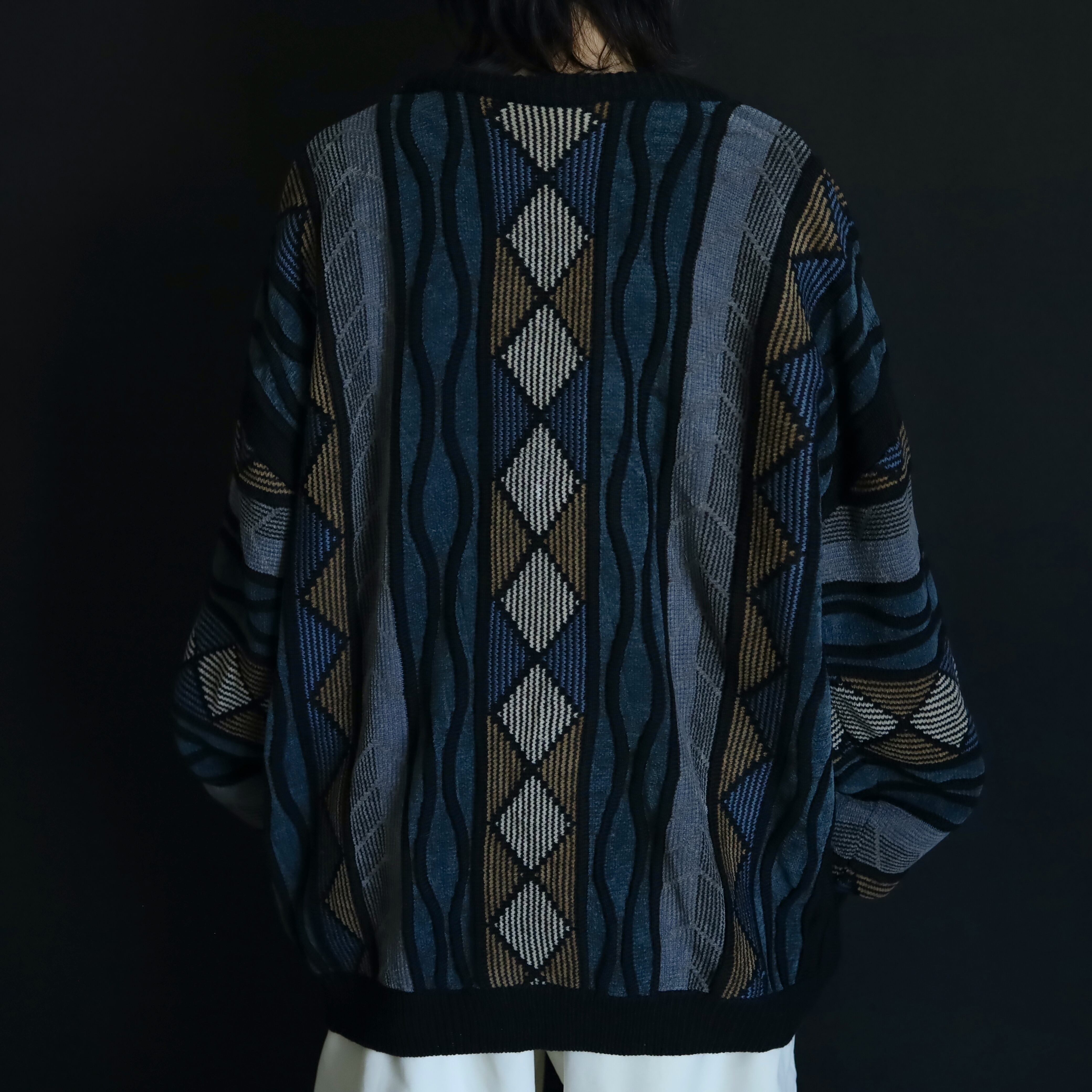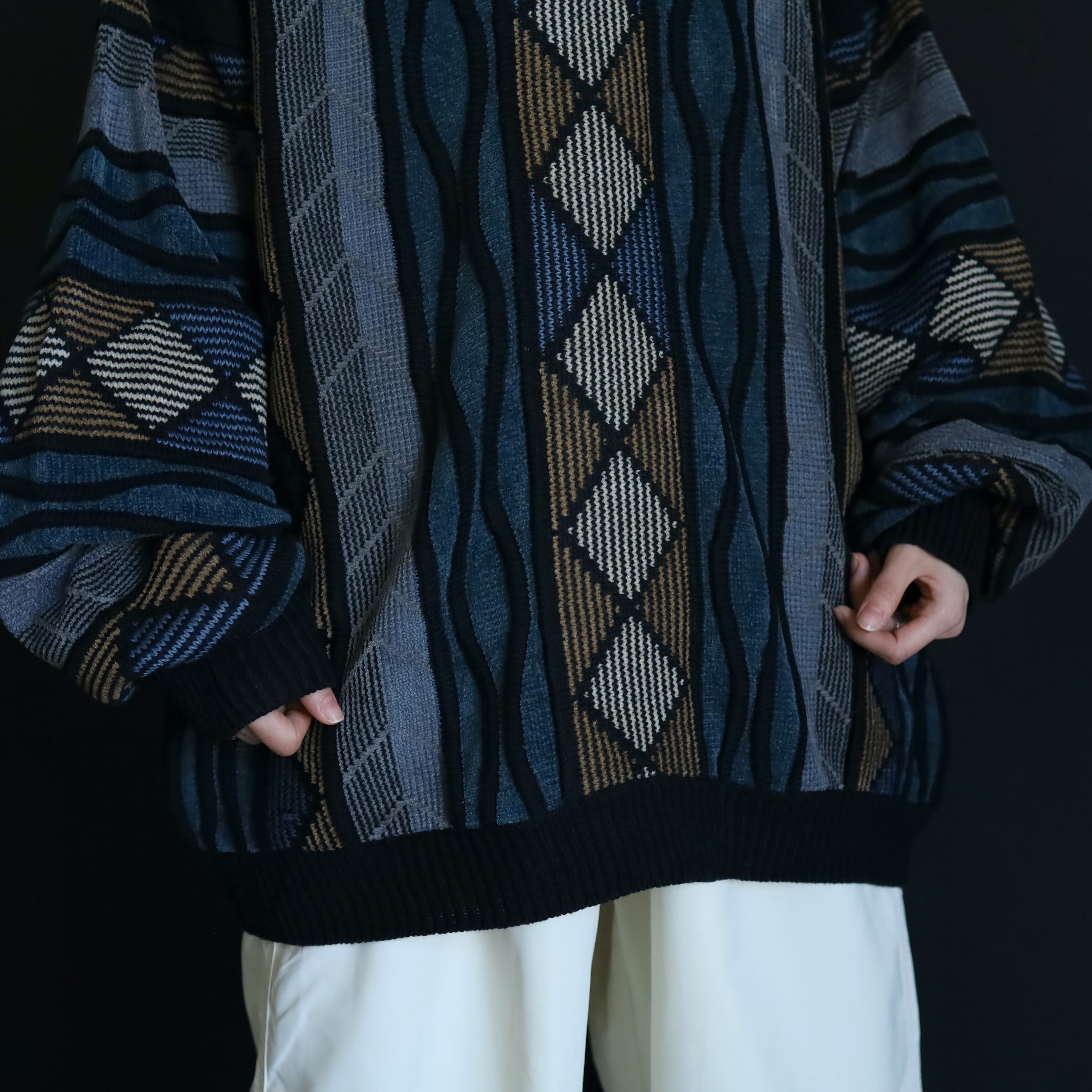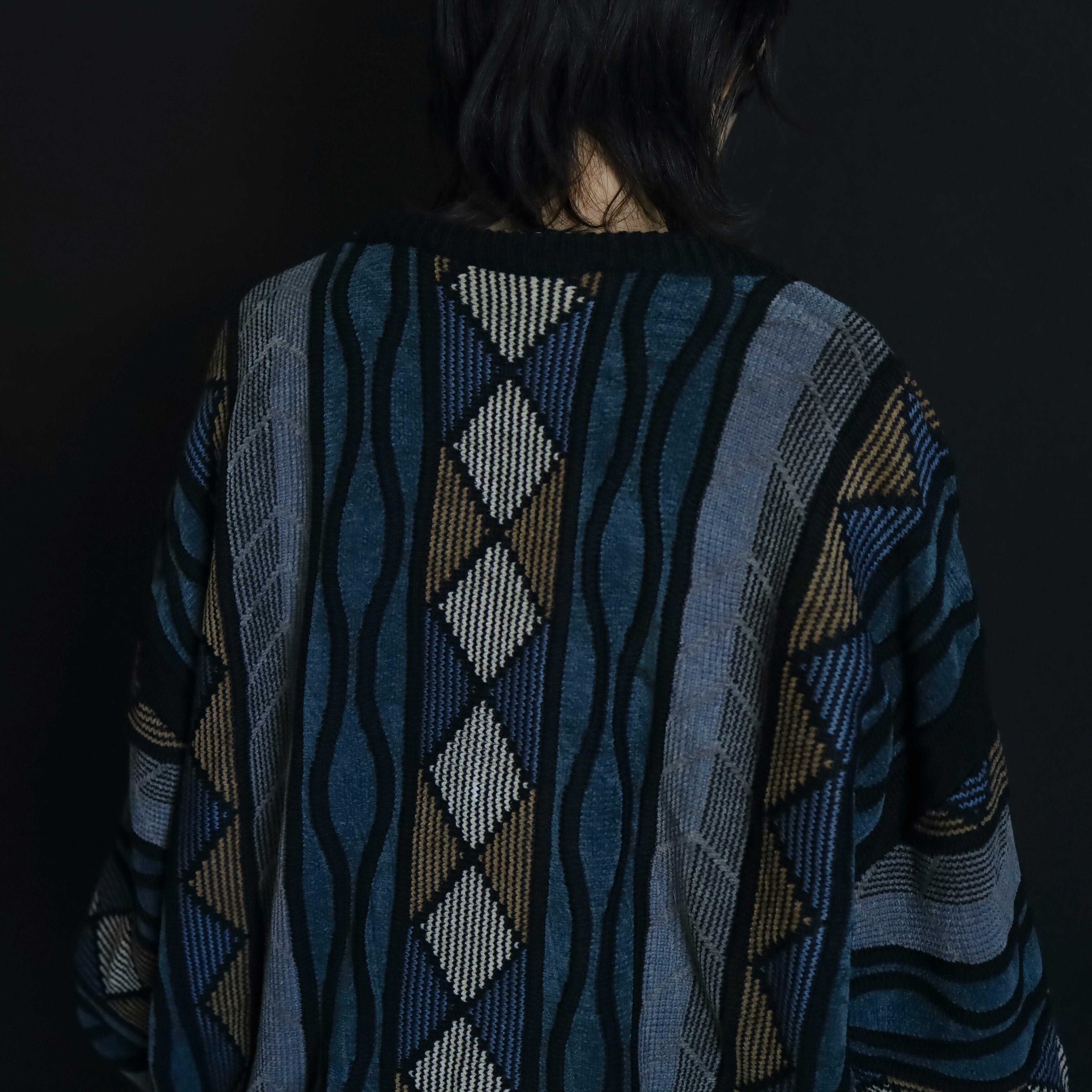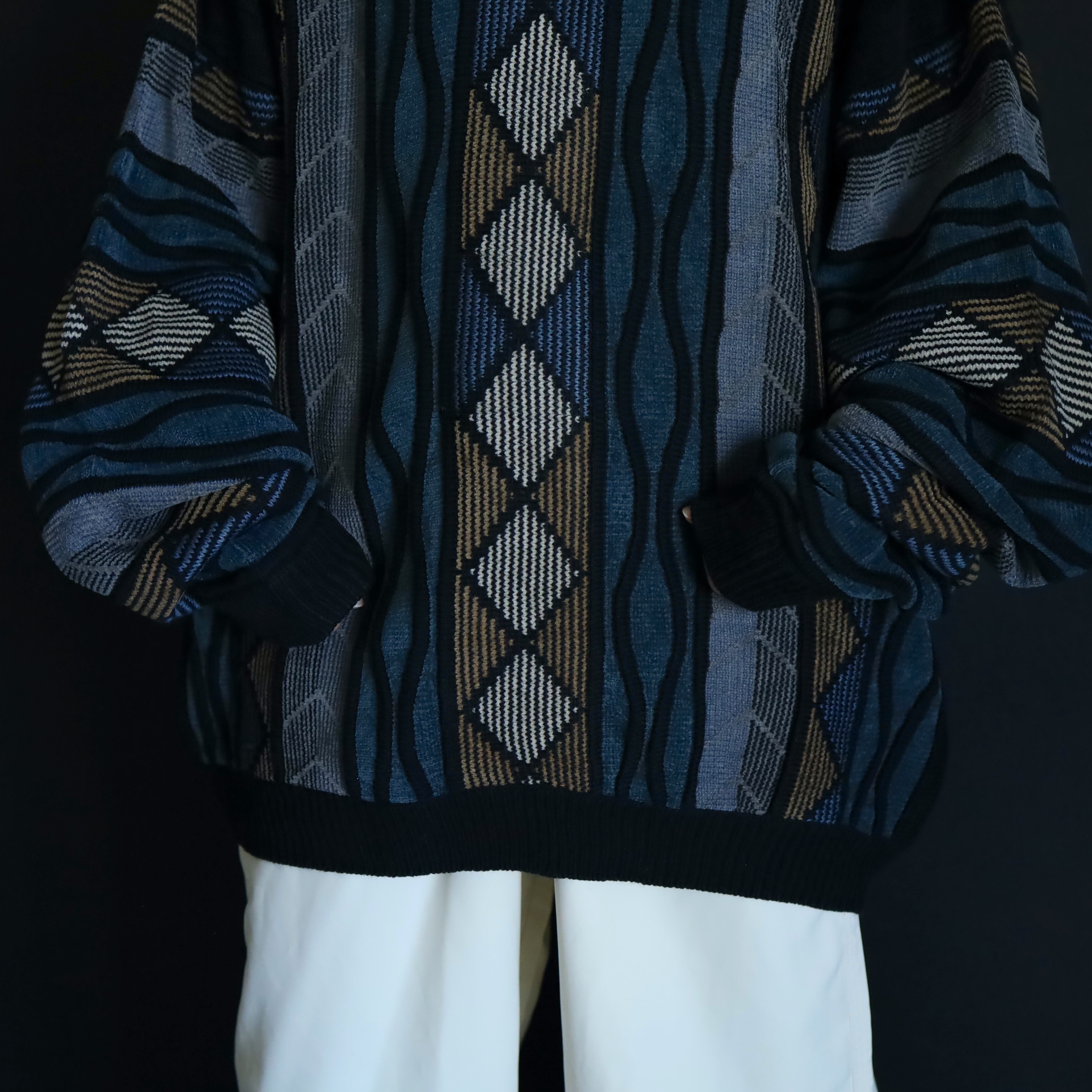 くすんだ風合いが特徴的なデザインニットセーター.