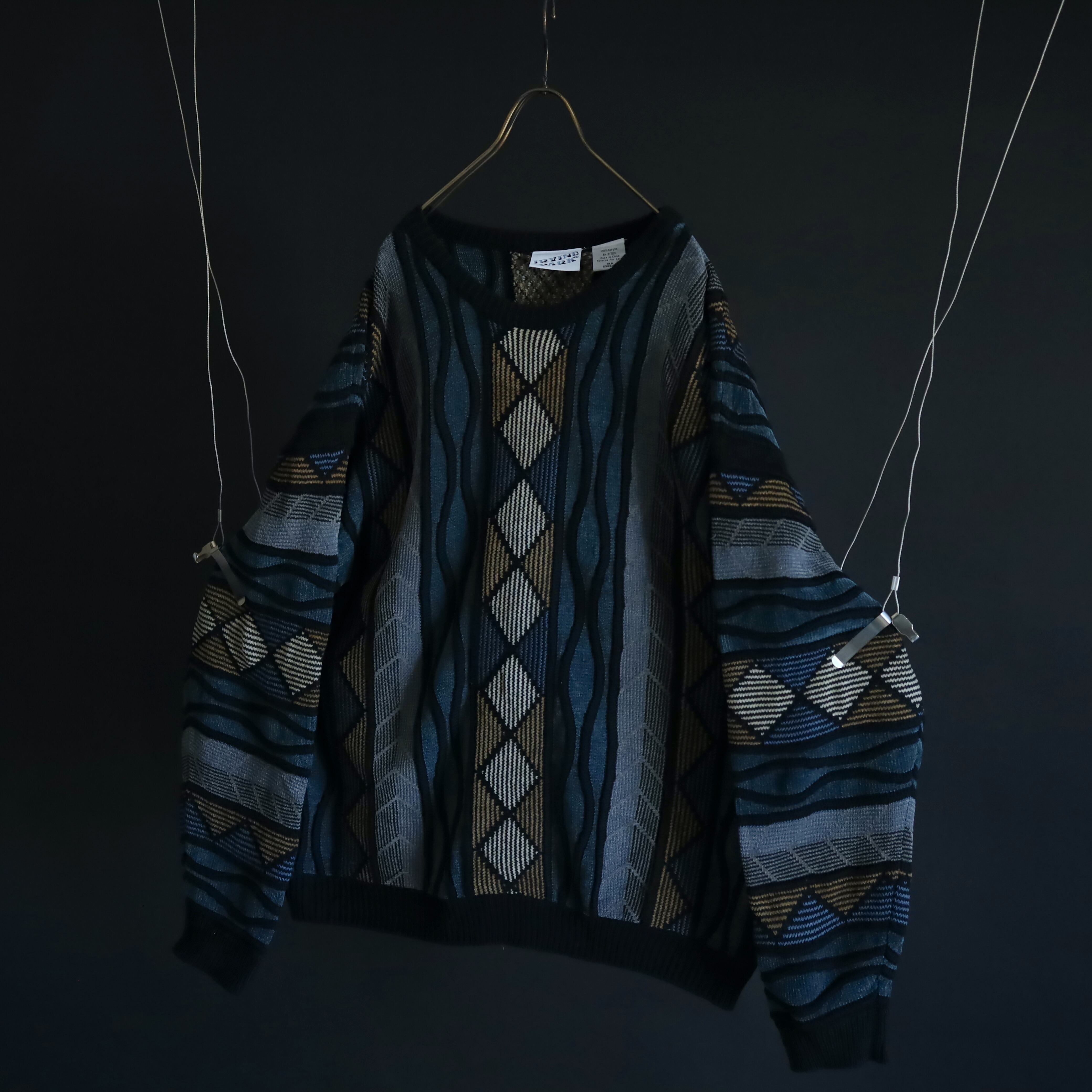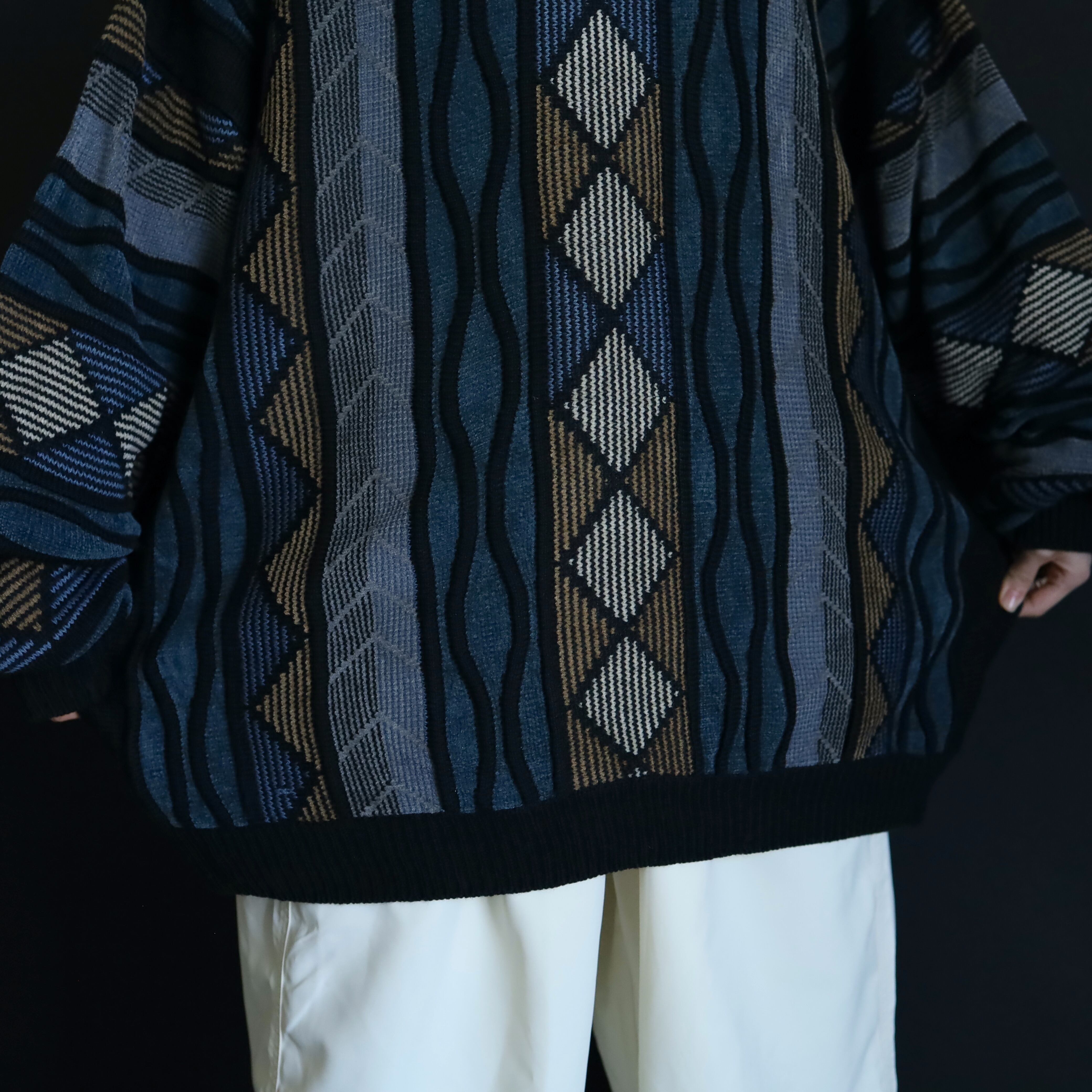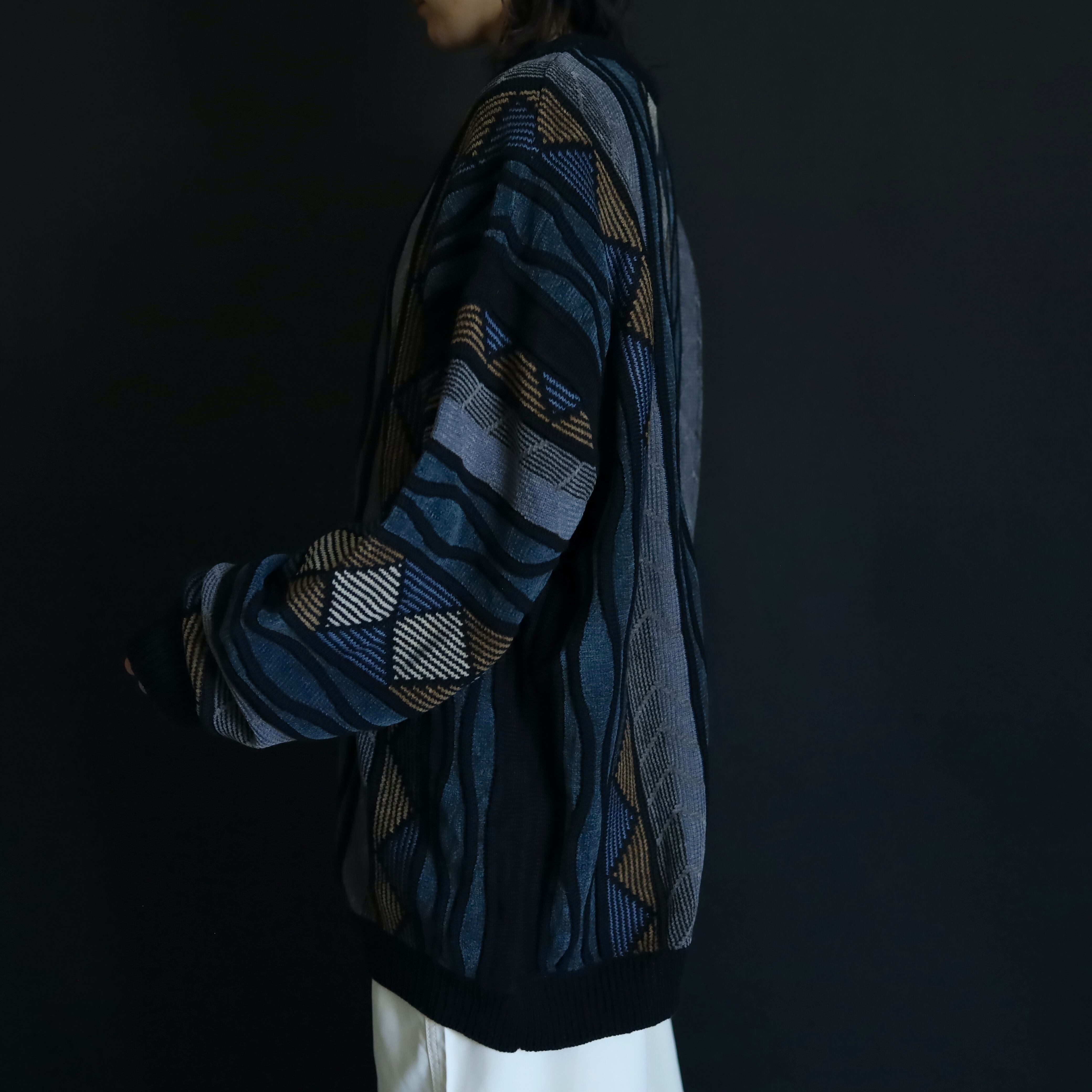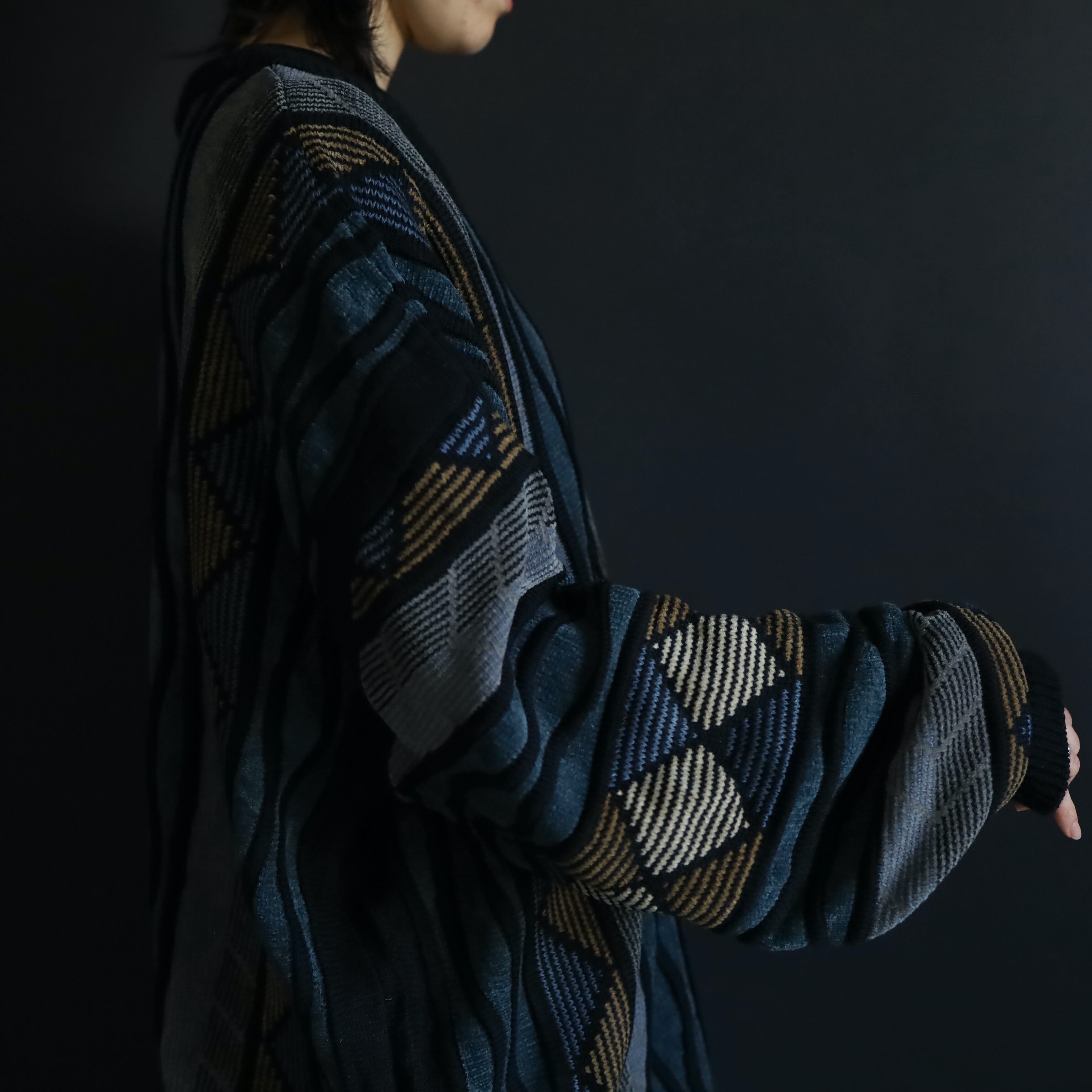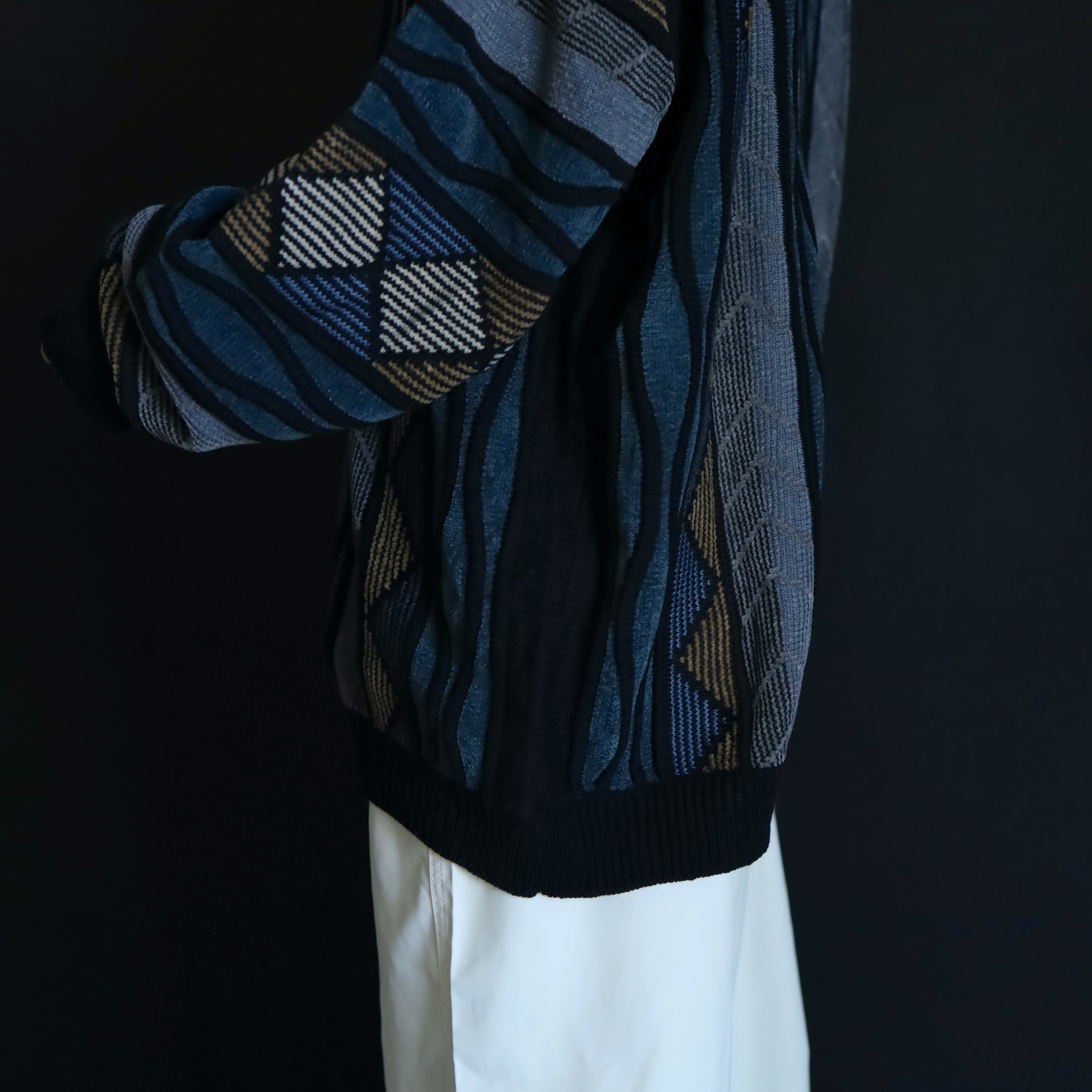 くすんだ風合いが特徴的なデザインニットセーター.