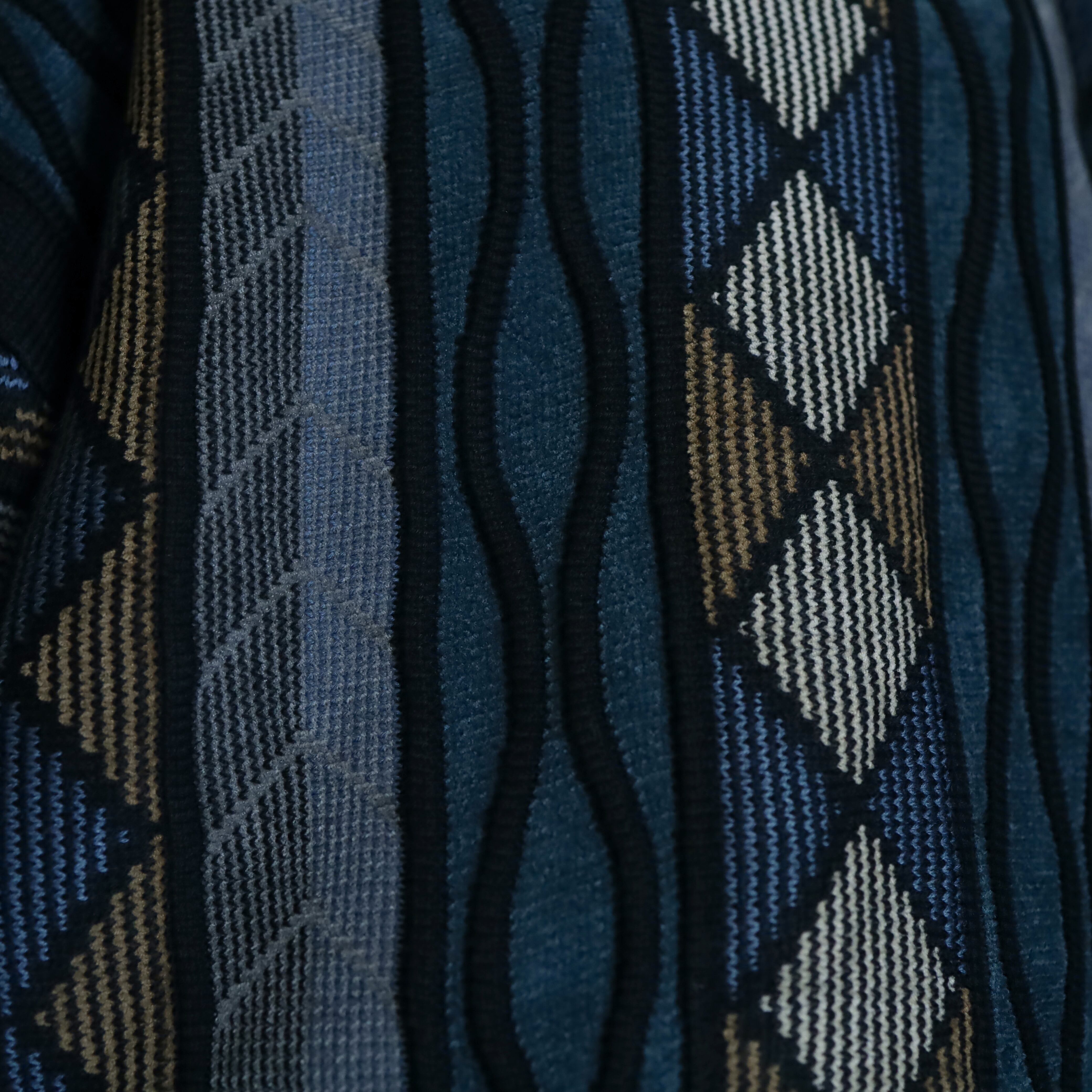 ネイビーやブルーグレー,グレーやマスタード構成の,ダイヤや畝りのあるマルチアートデザイン.
