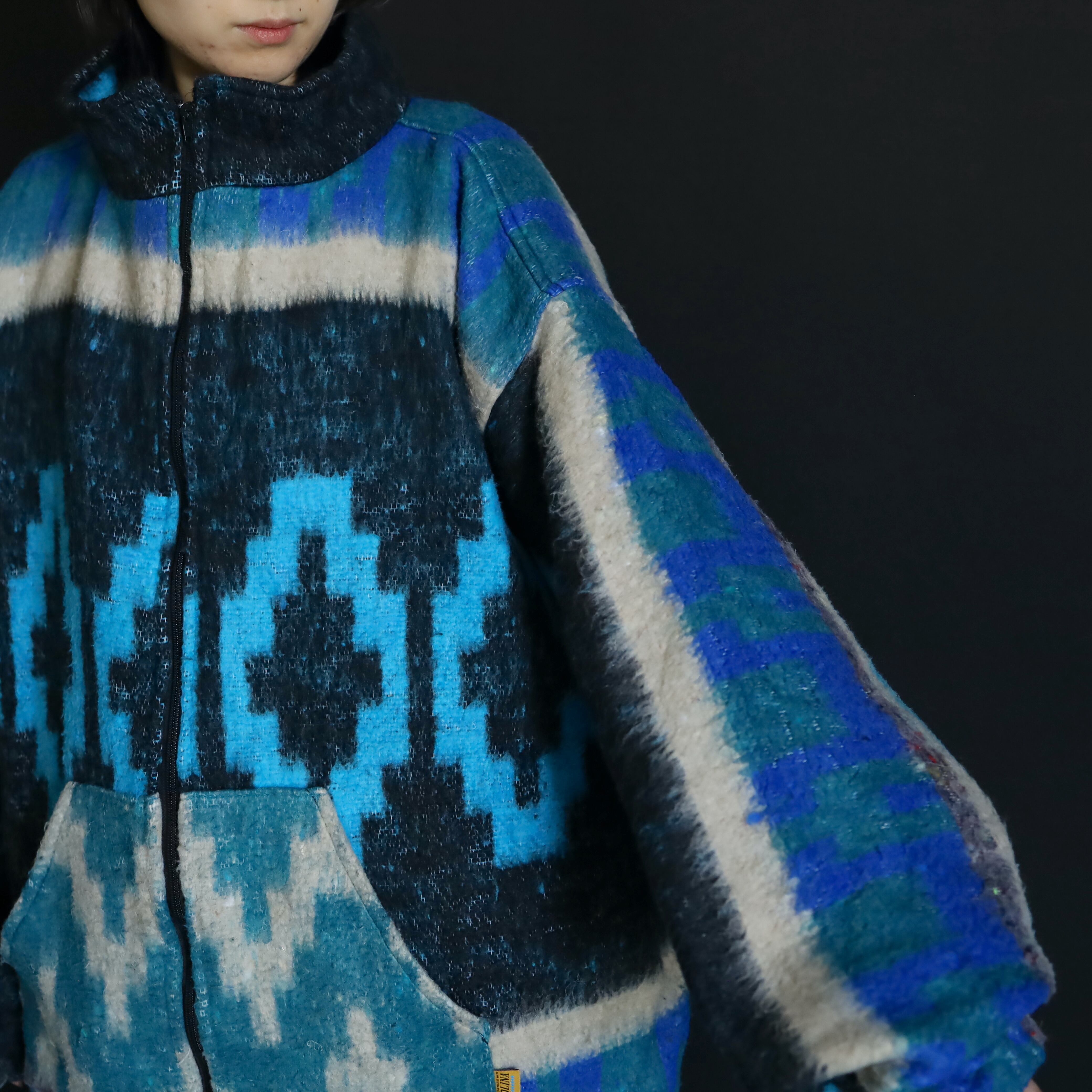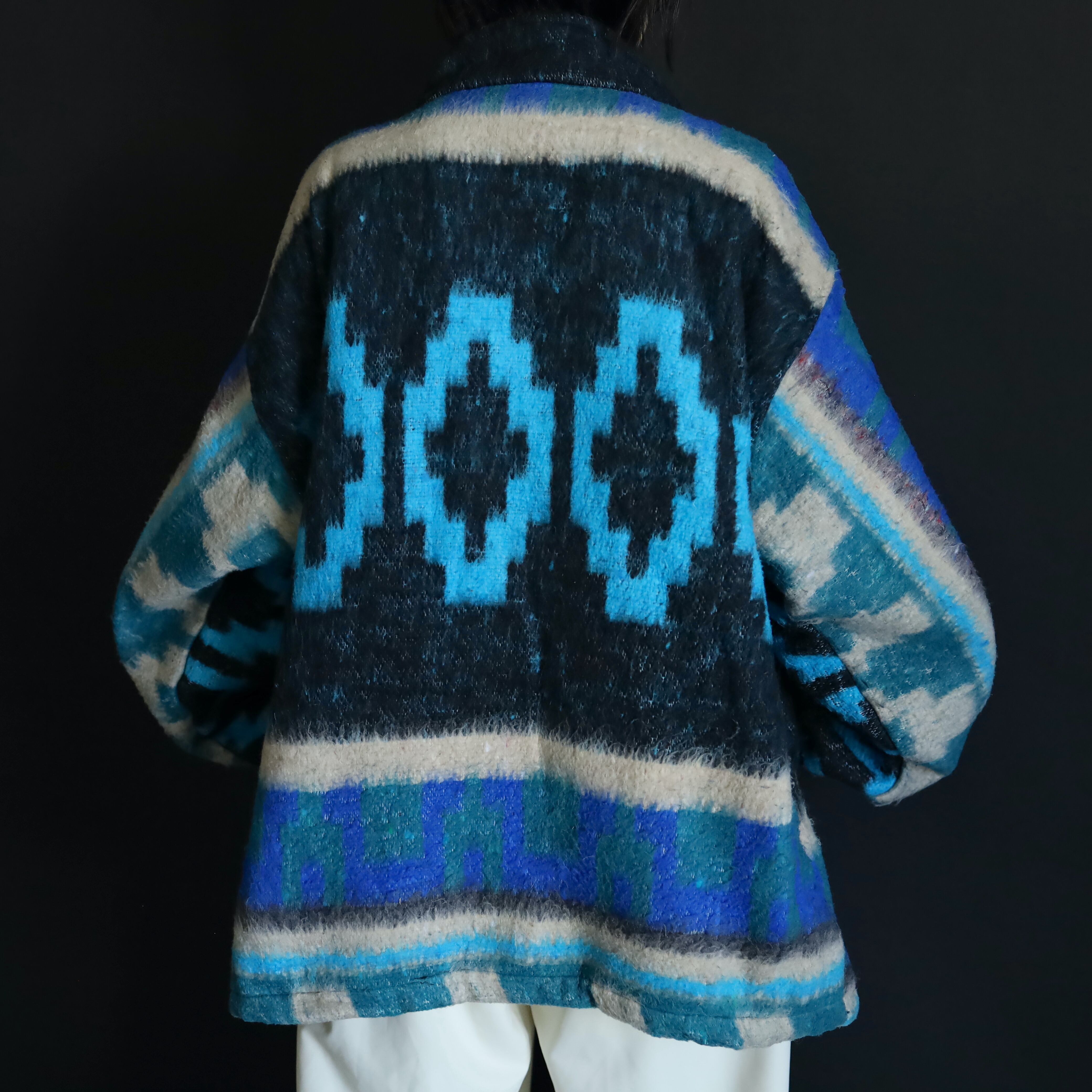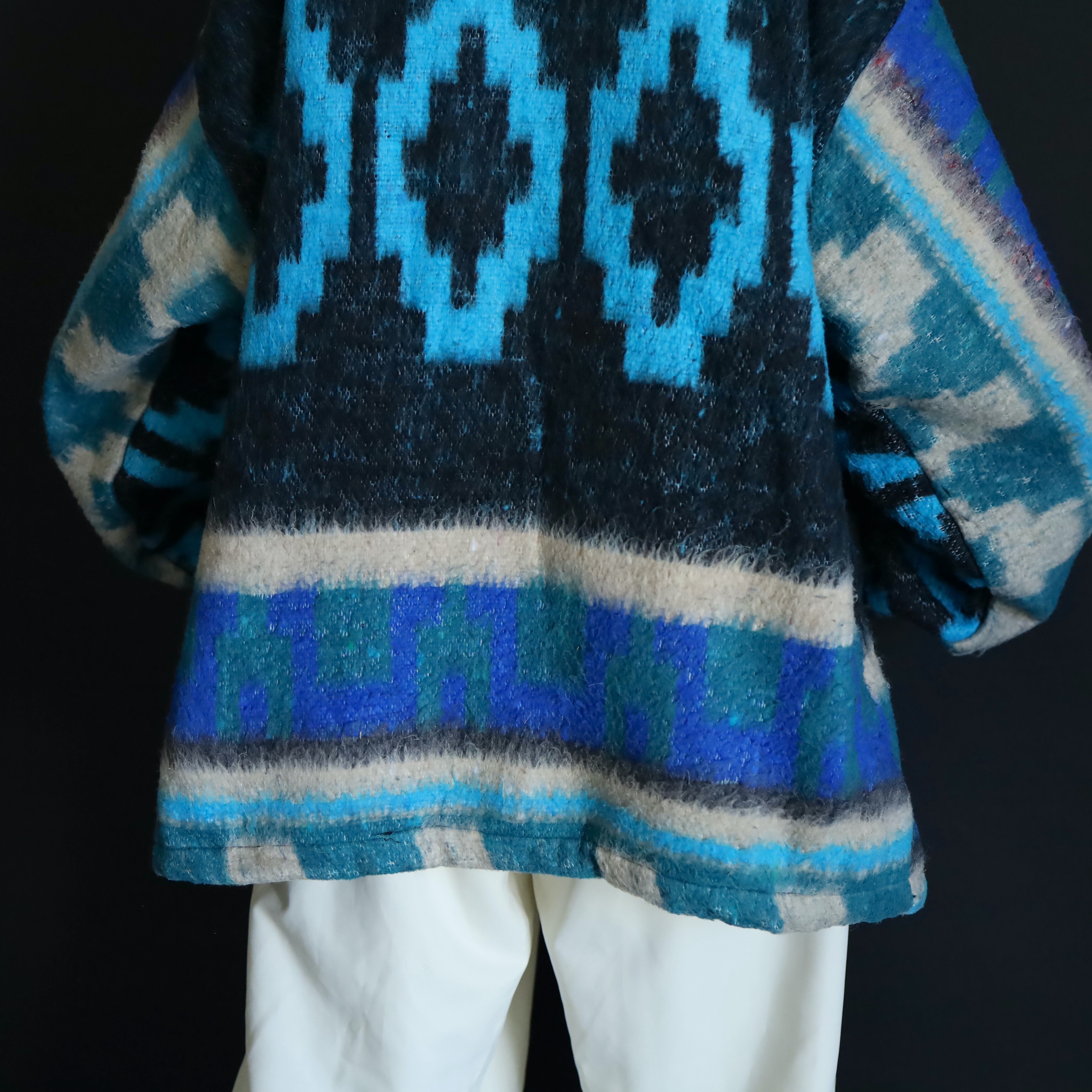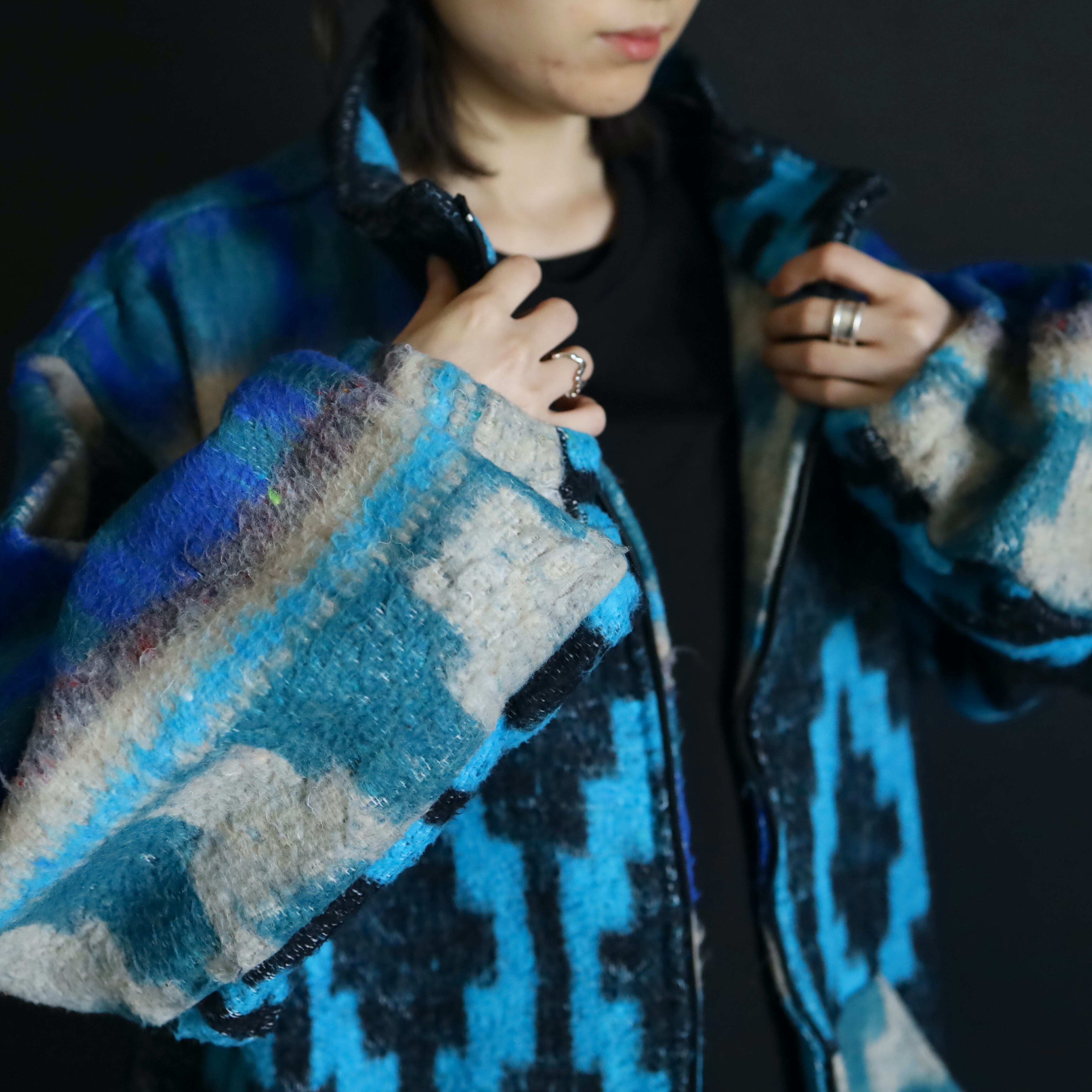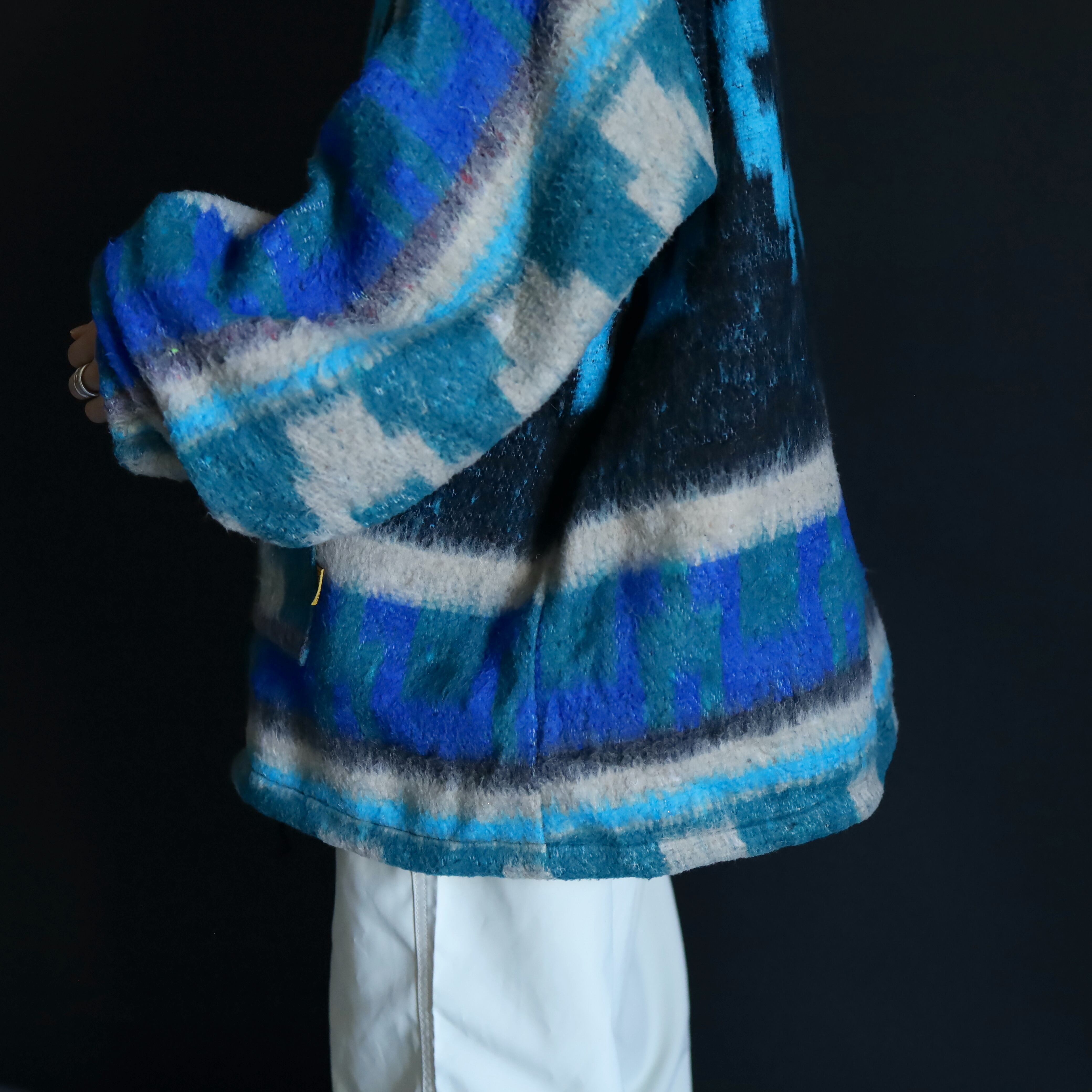 モノクロのほか,ブルー,ターコイズ系の色味で構成された,清潔感のあるチマヨ柄が目を惹く一枚.