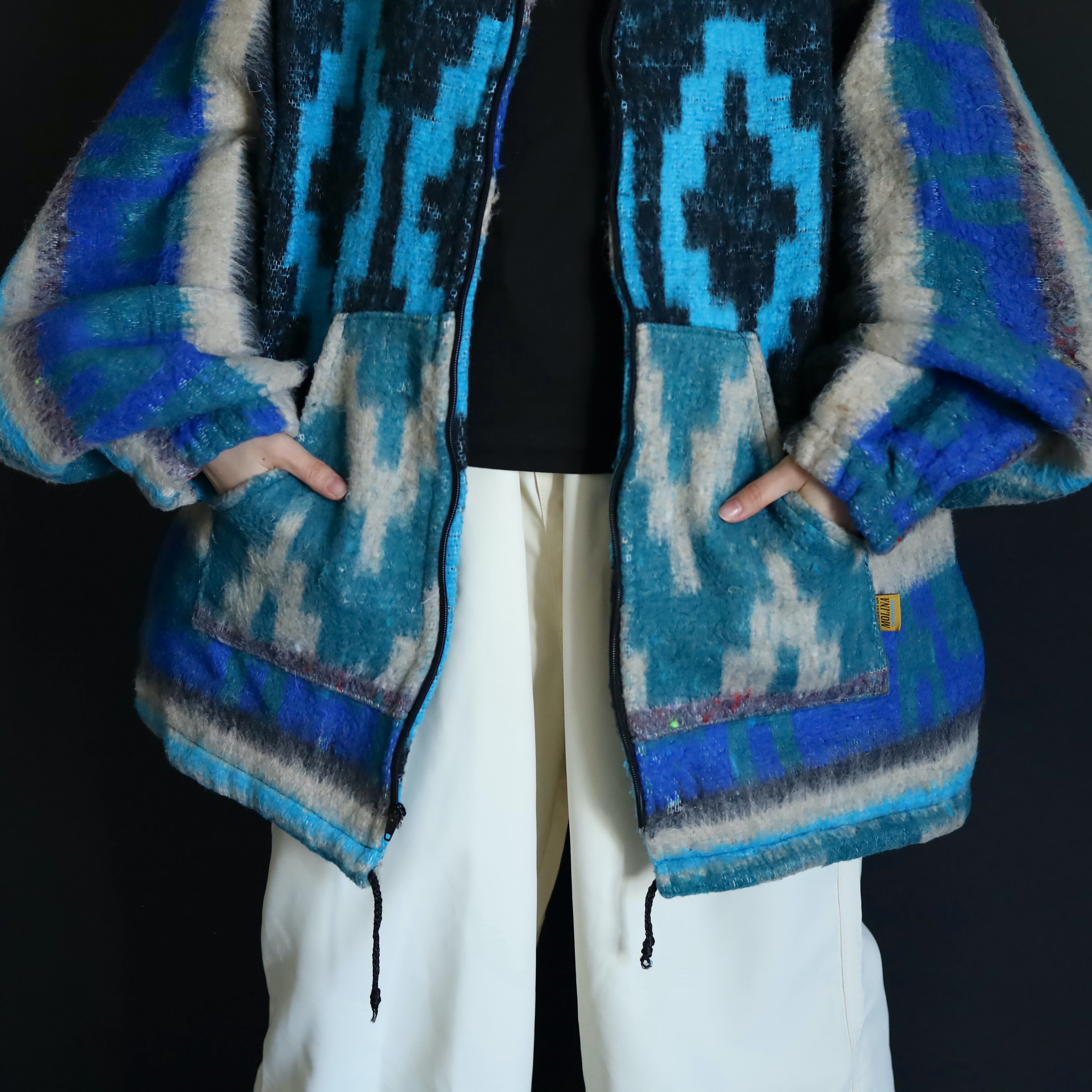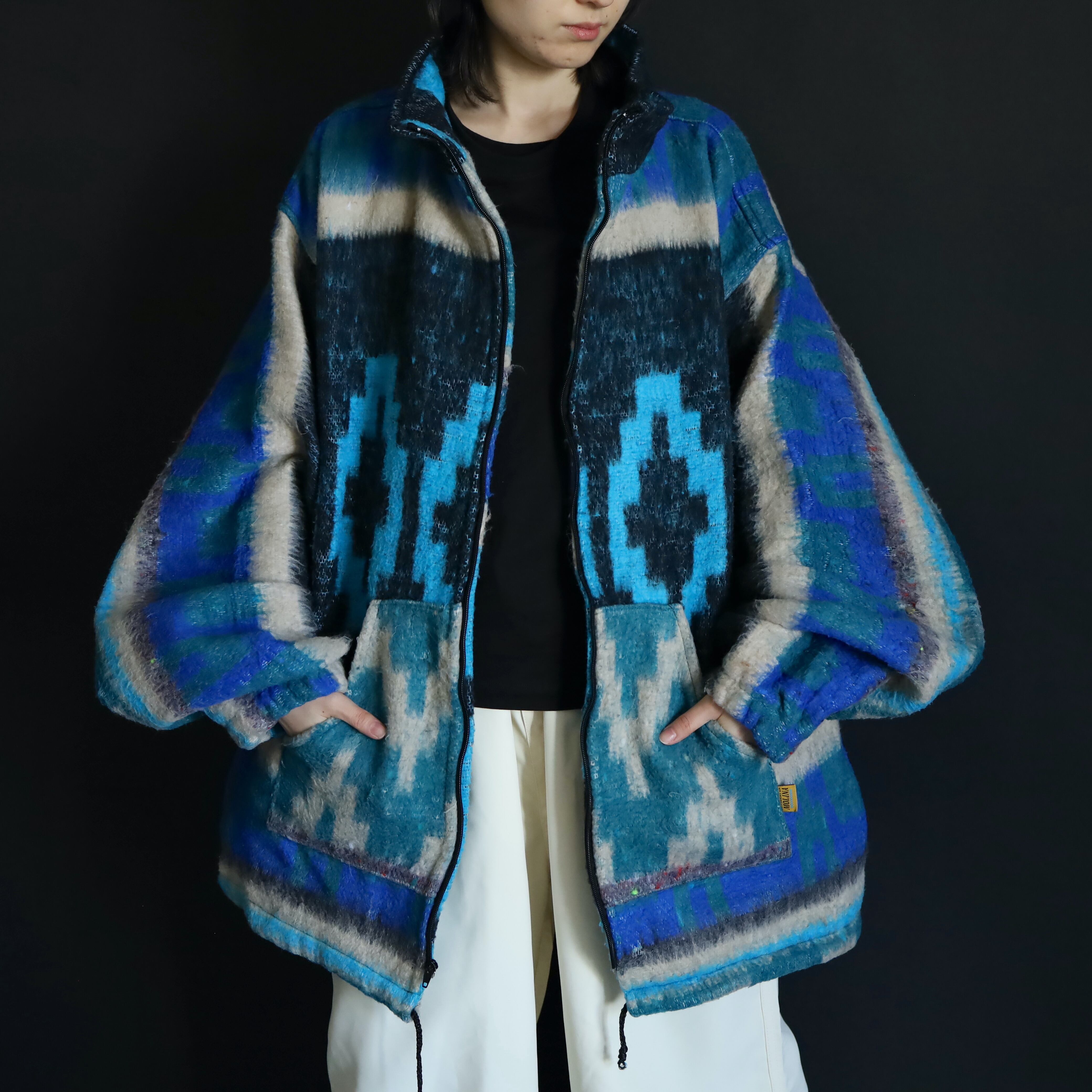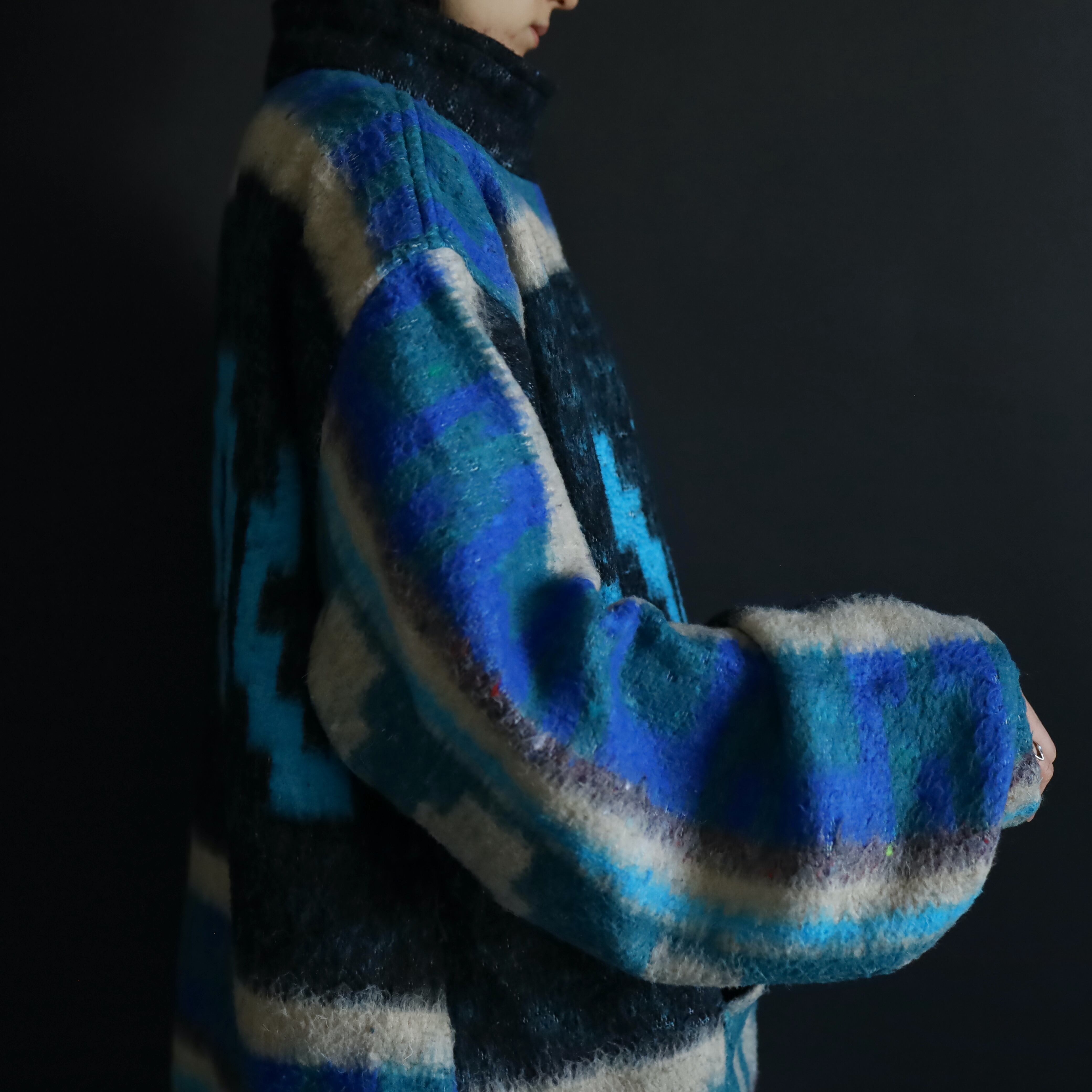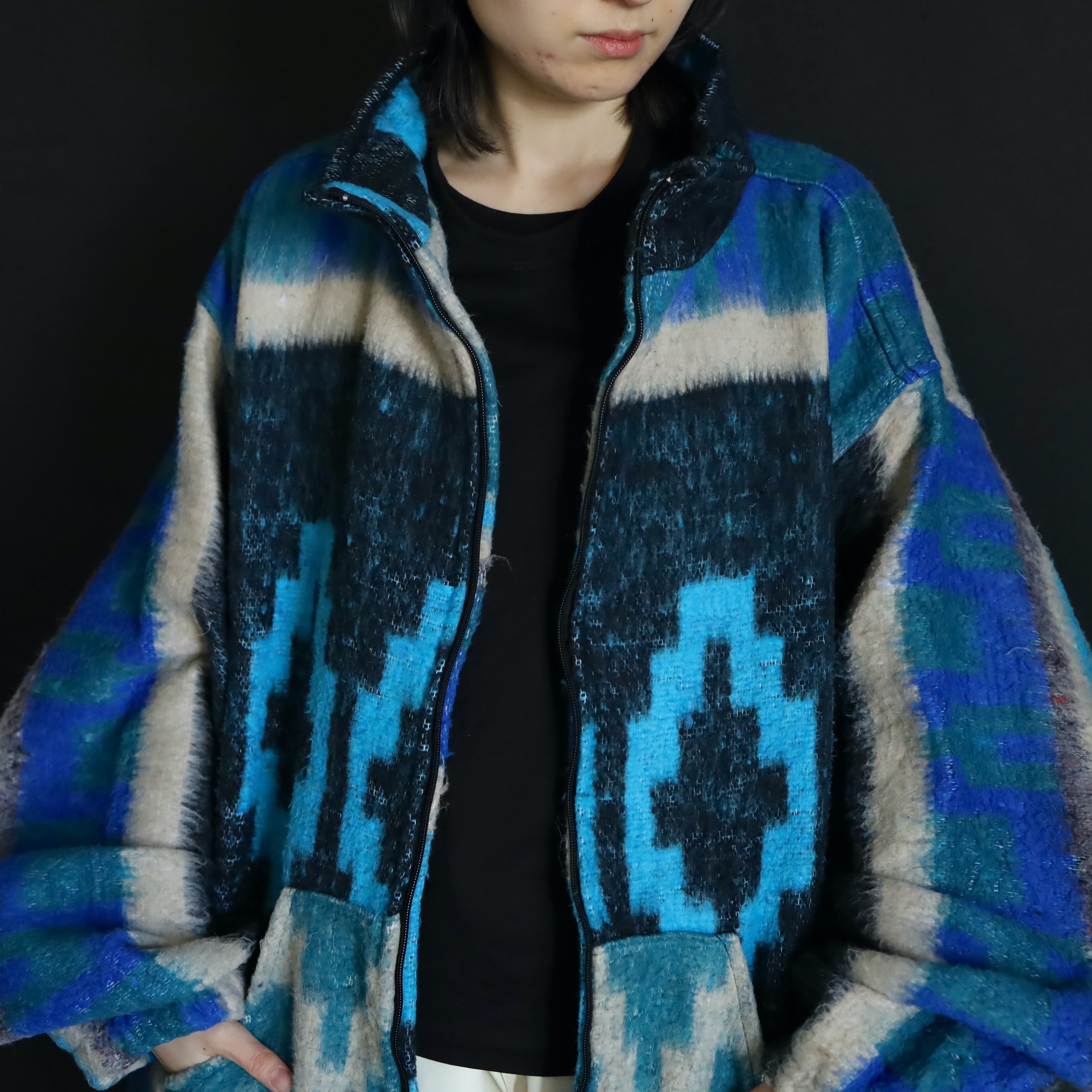 モノクロのほか,ブルー,ターコイズ系の色味で構成された,清潔感のあるチマヨ柄が目を惹く一枚.