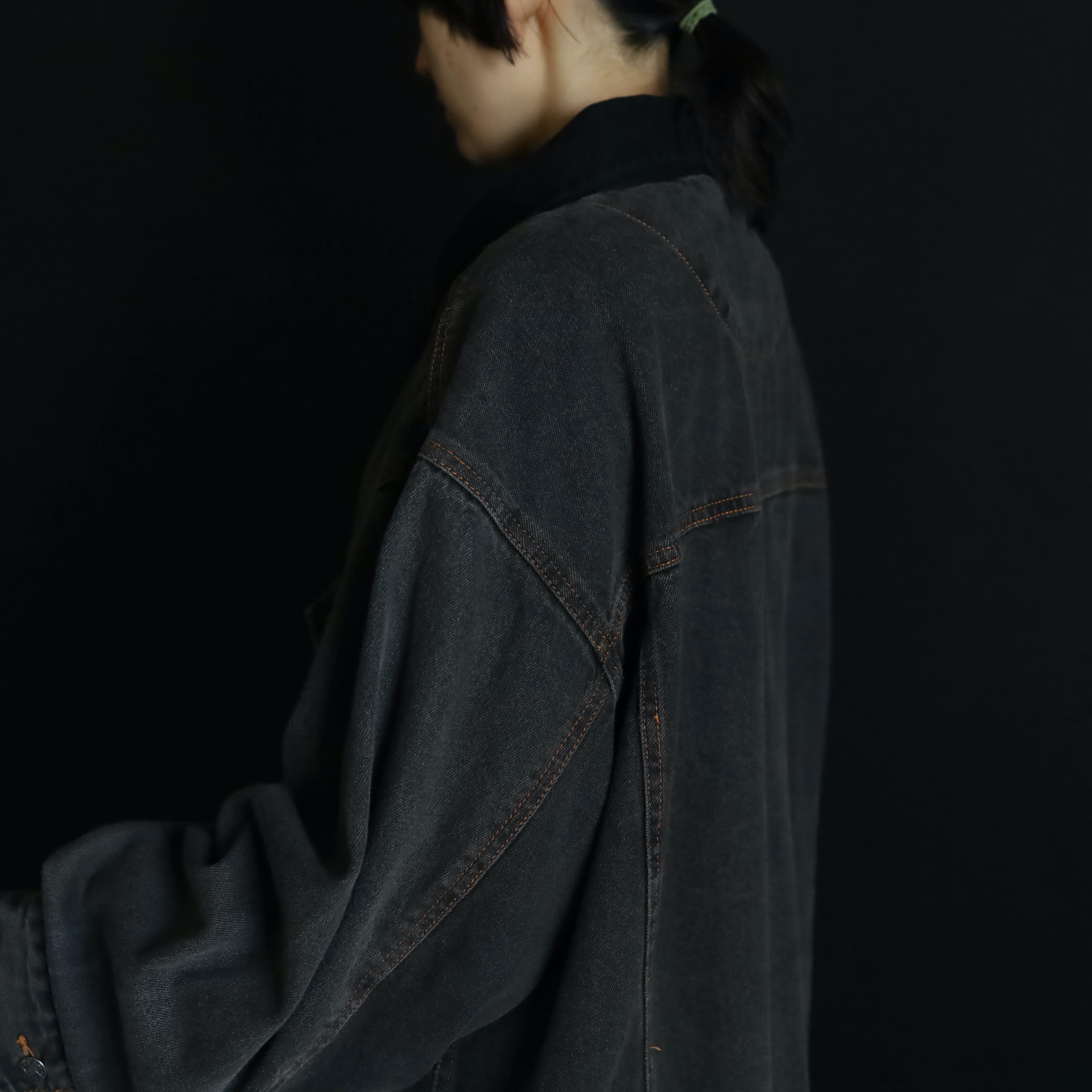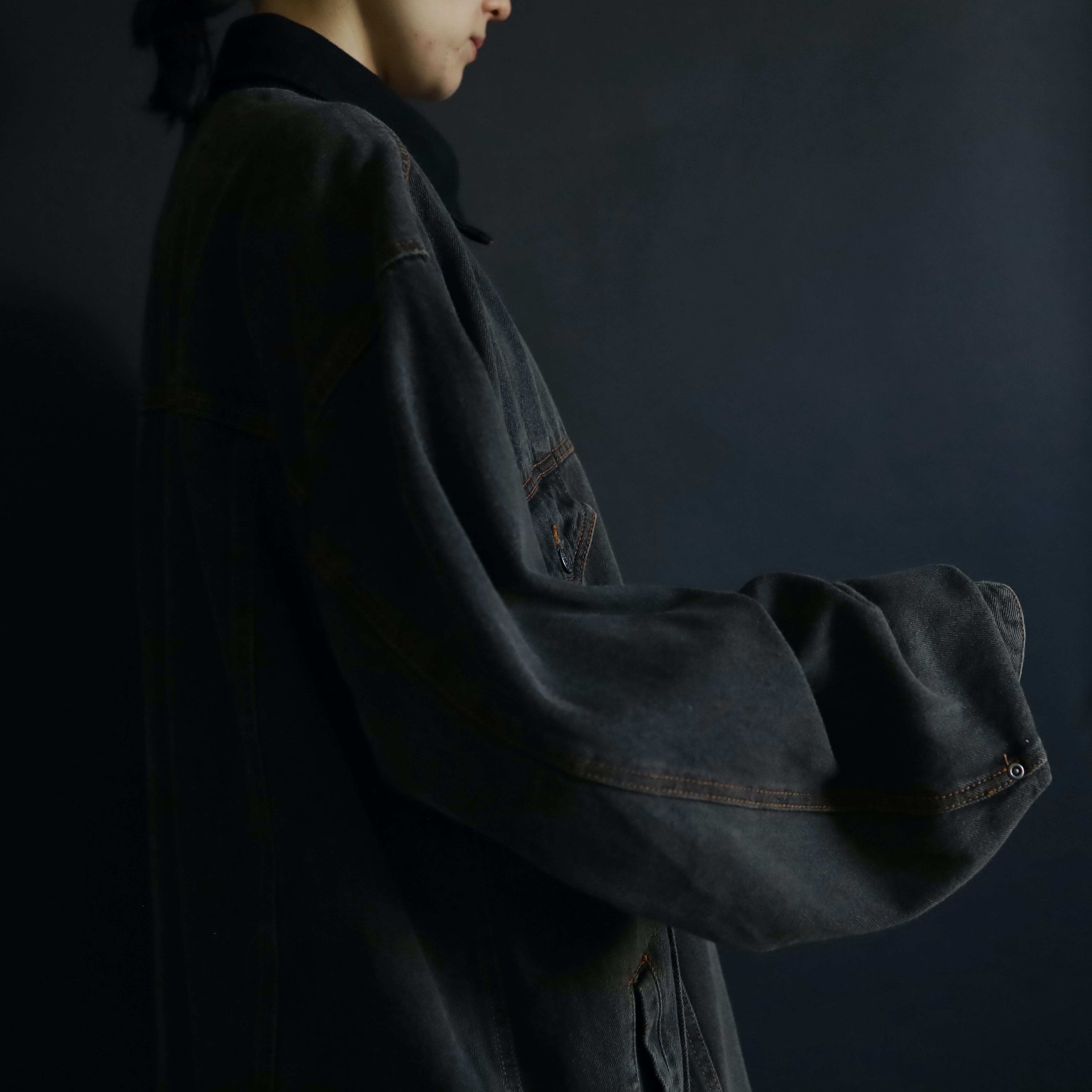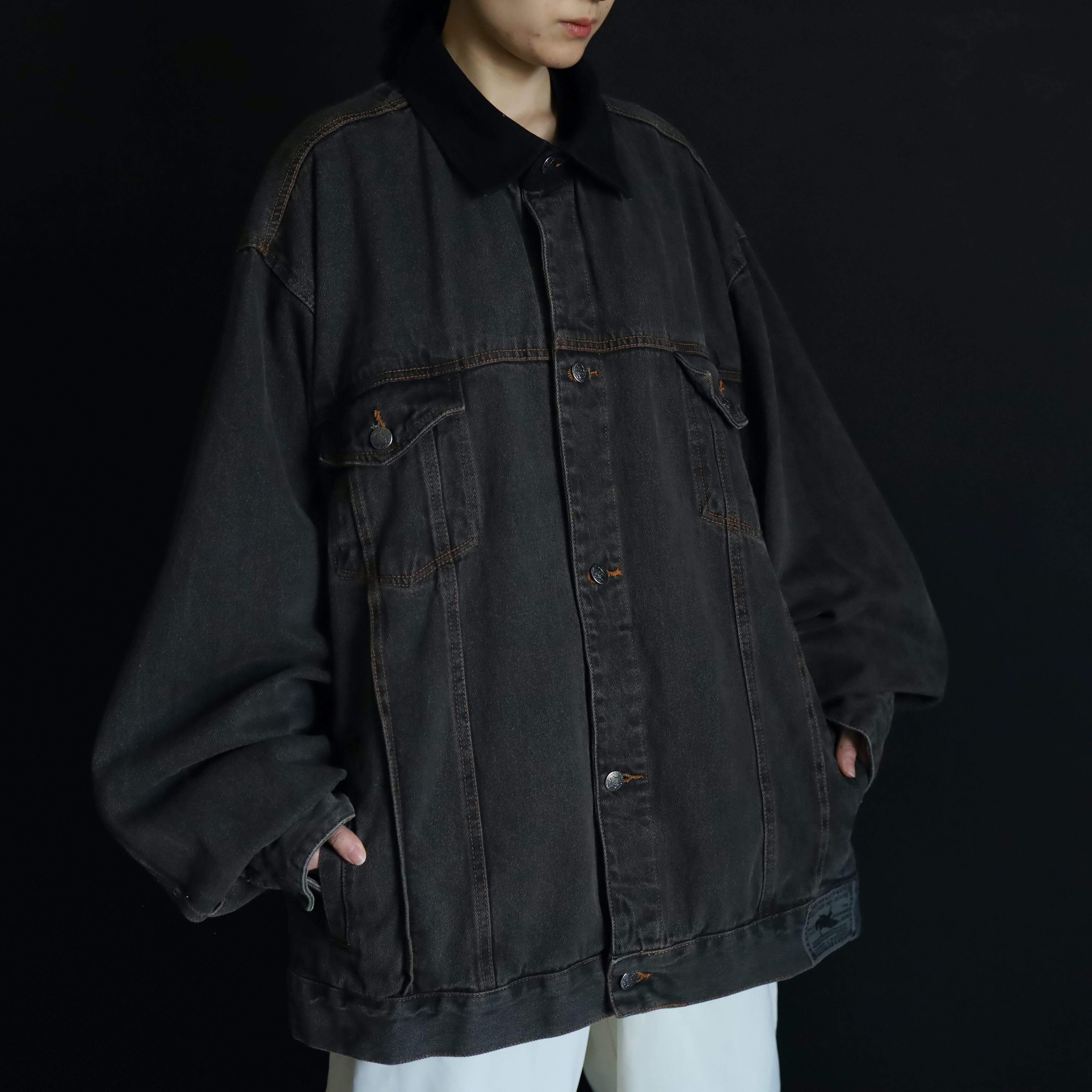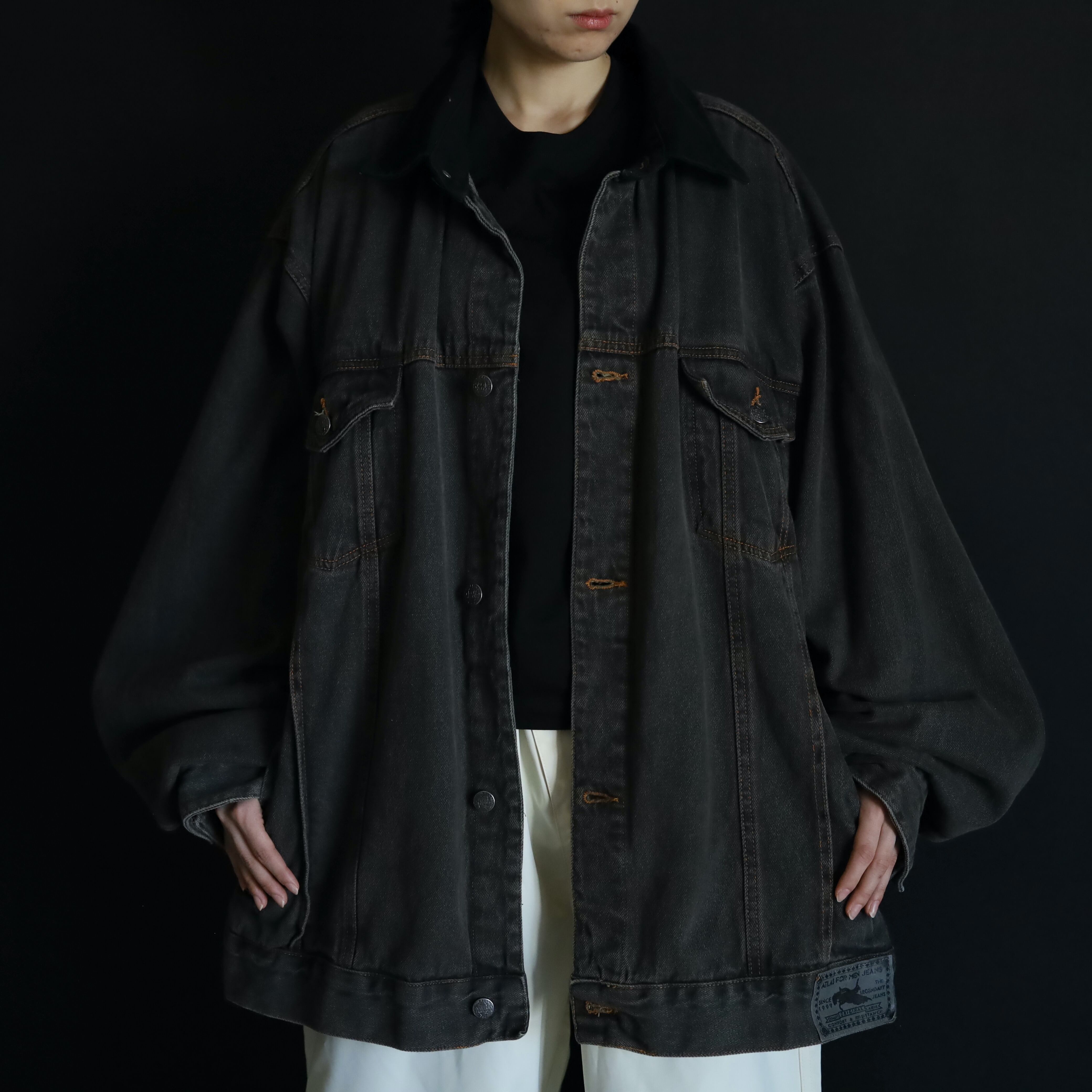 襟のみブラックデニムに切替わるバイカラー仕様で,くすみのあるボディを引き締めてくれています.