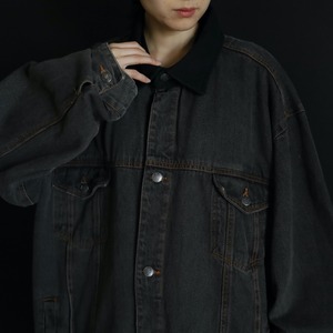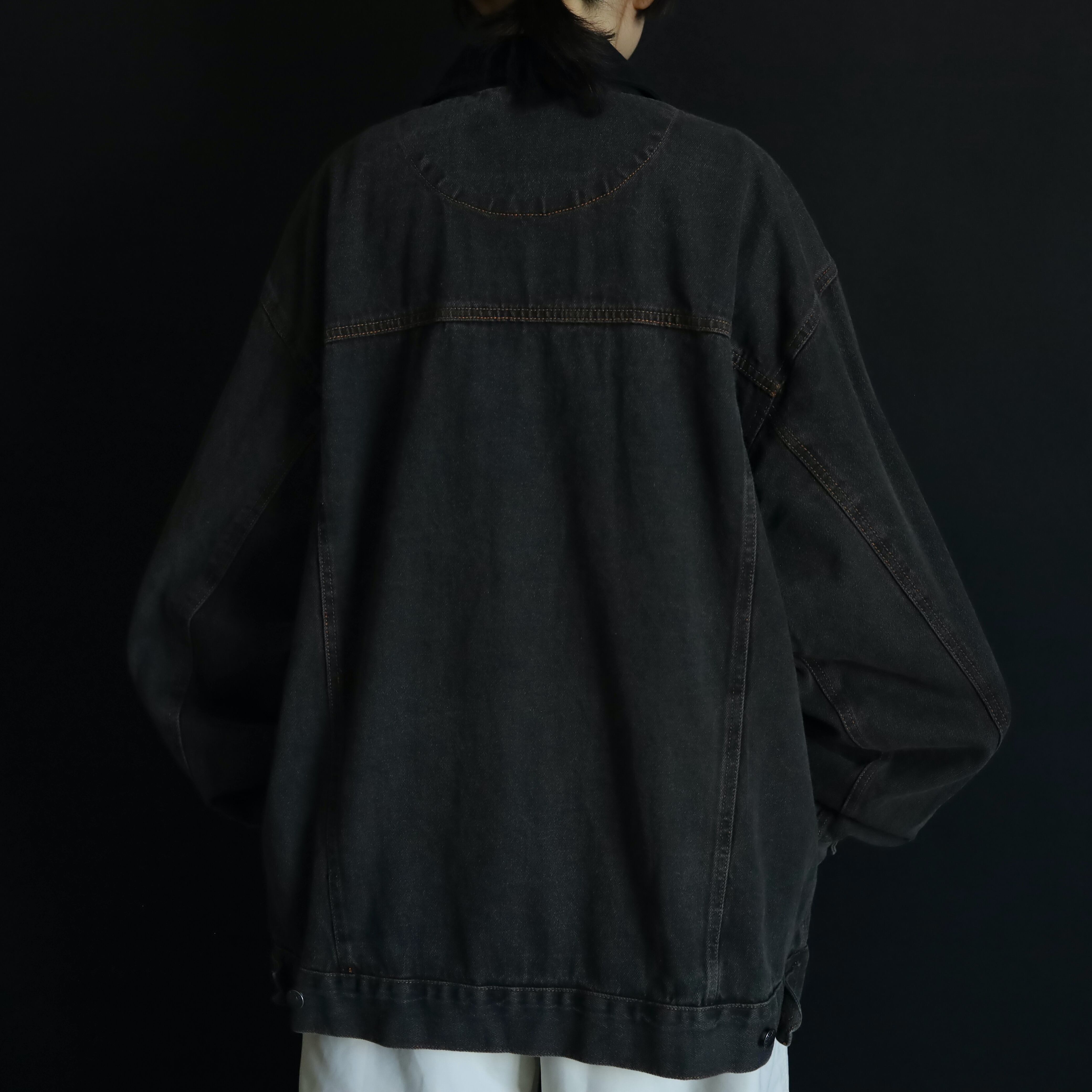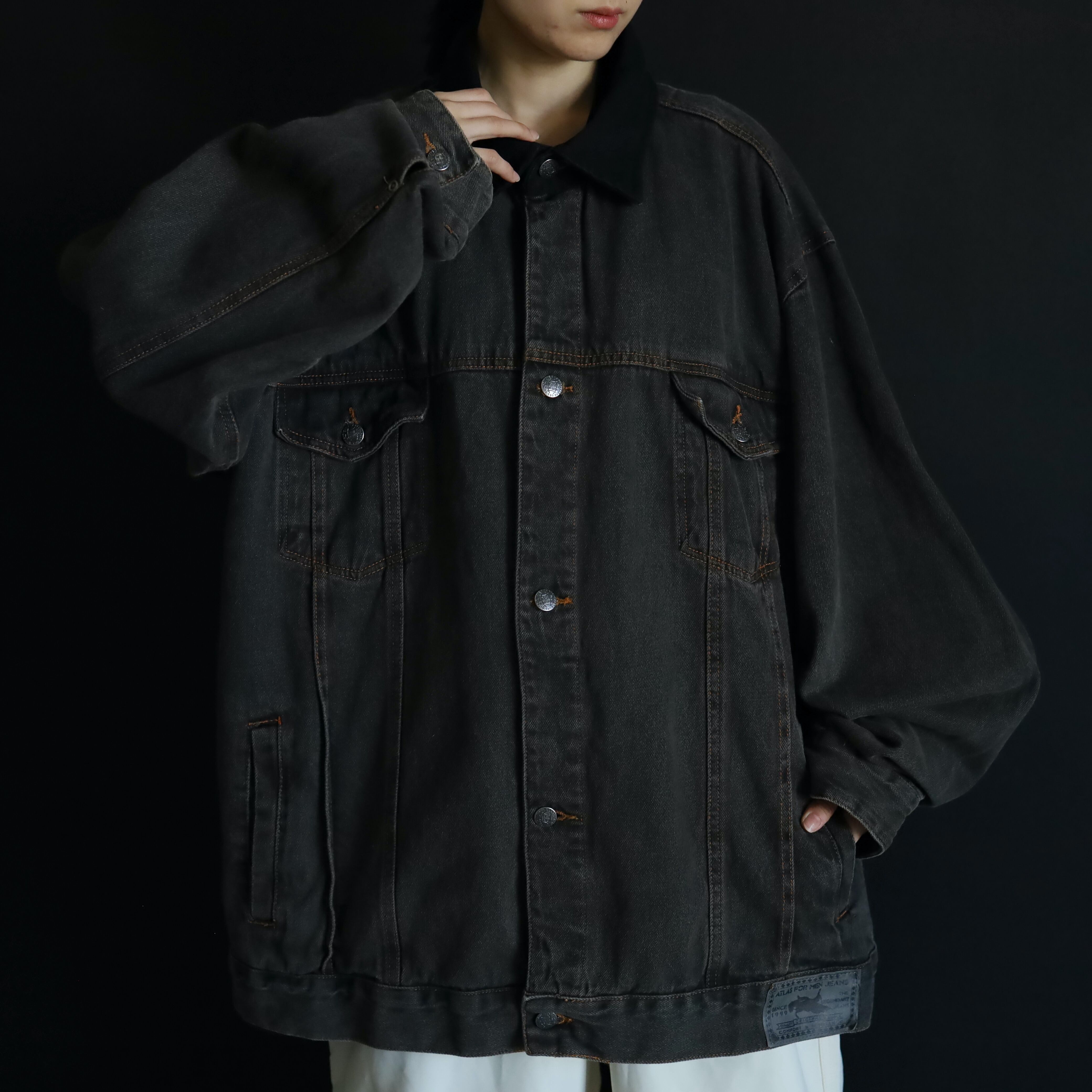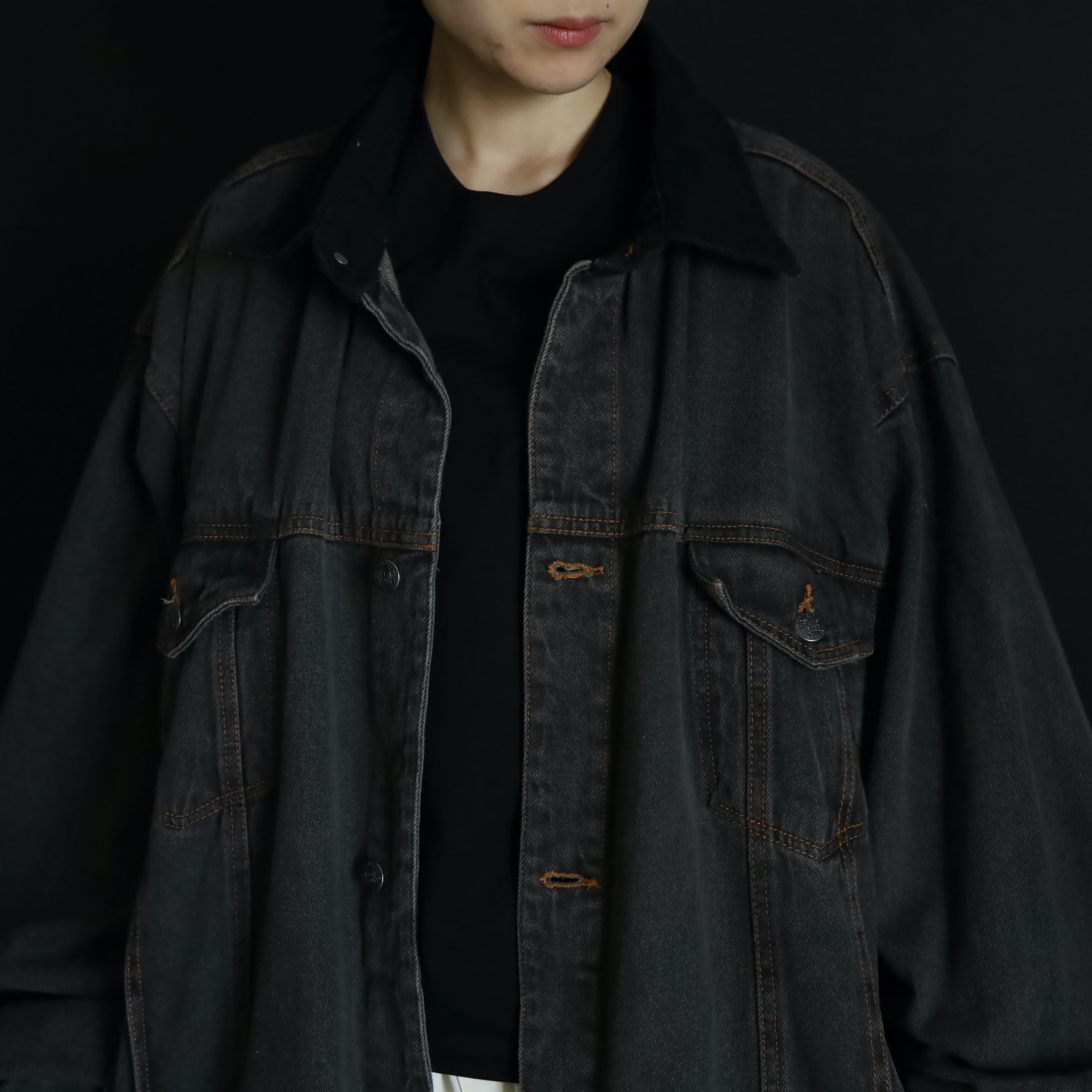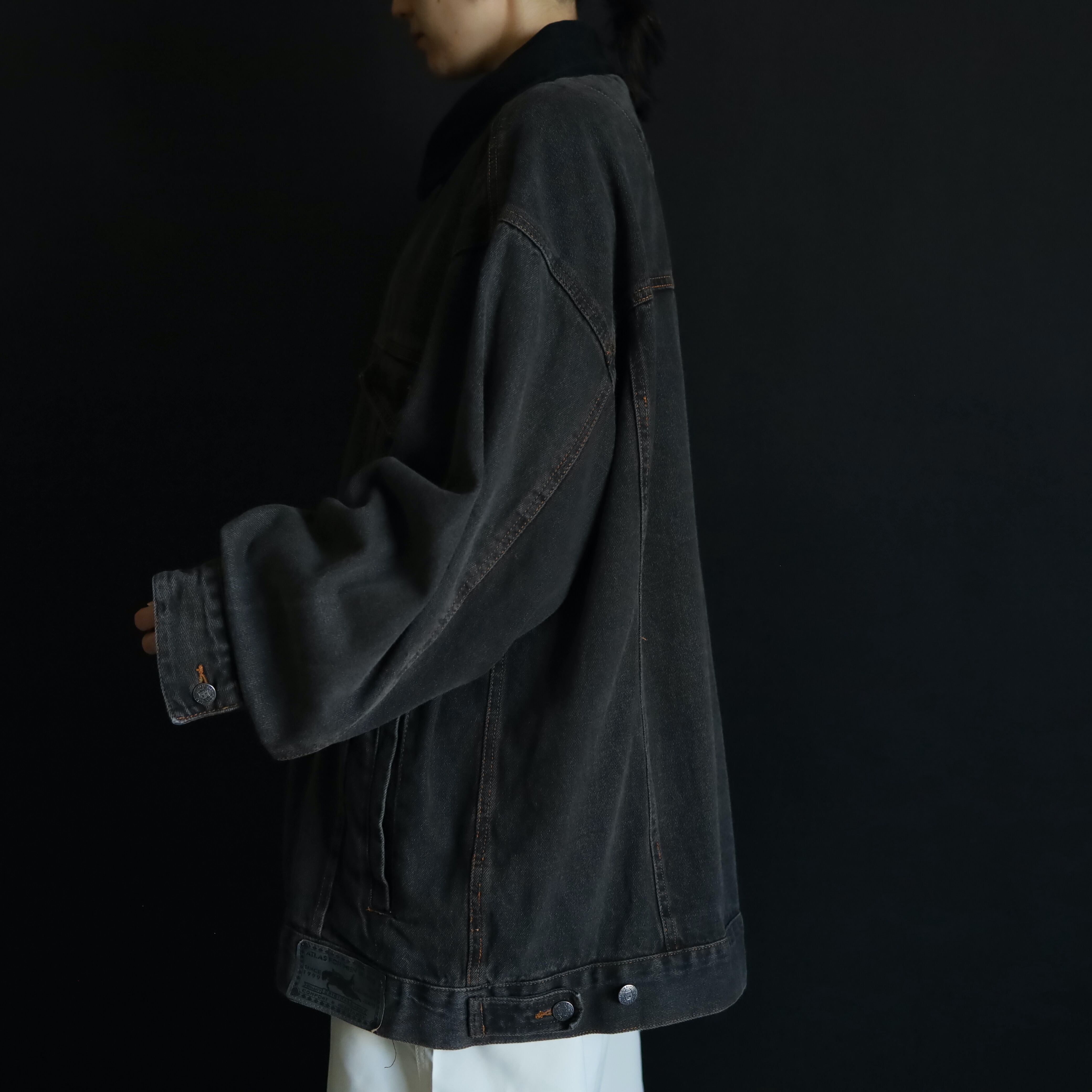 襟のみブラックデニムに切替わるバイカラー仕様で,くすみのあるボディを引き締めてくれています.