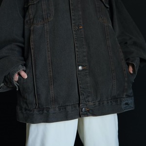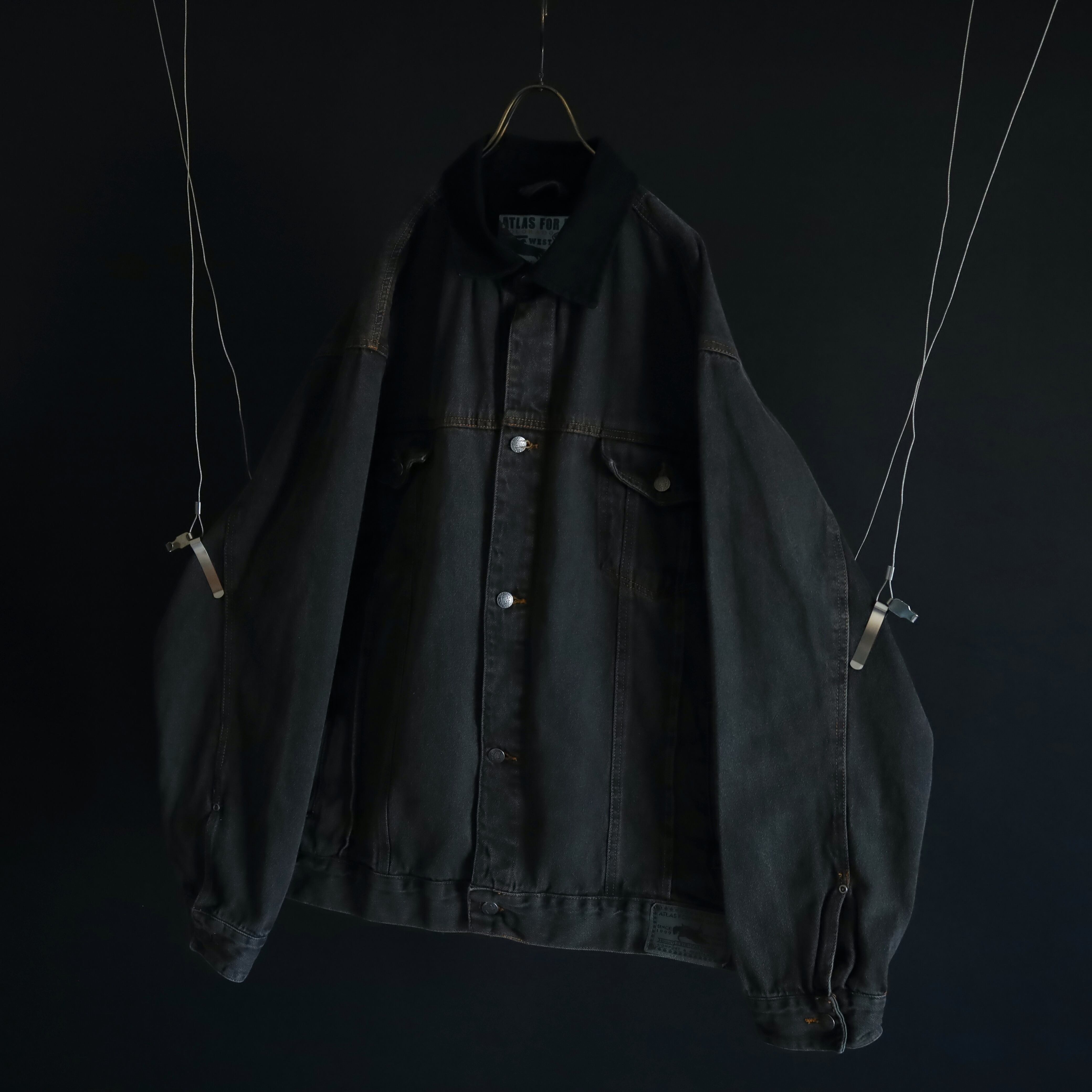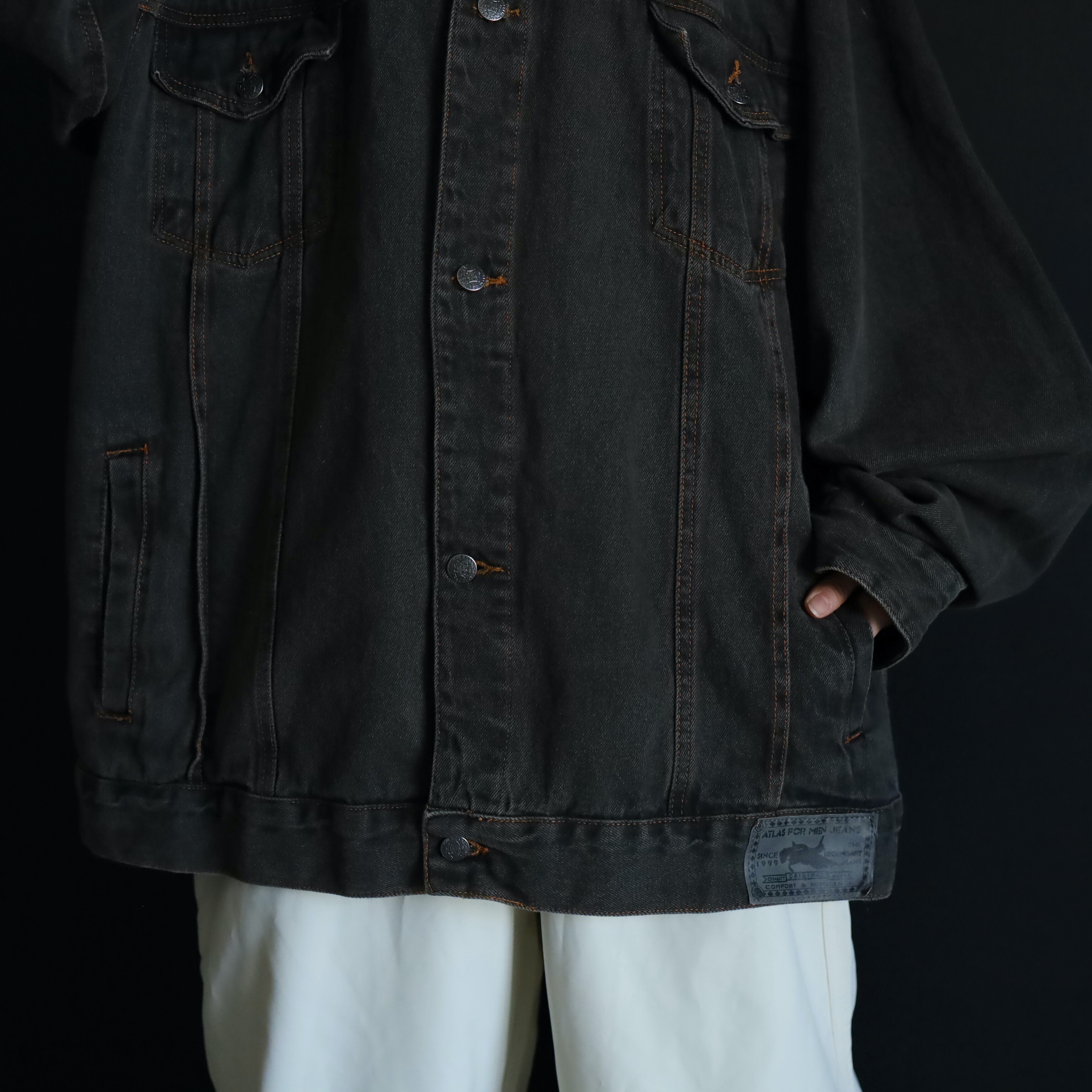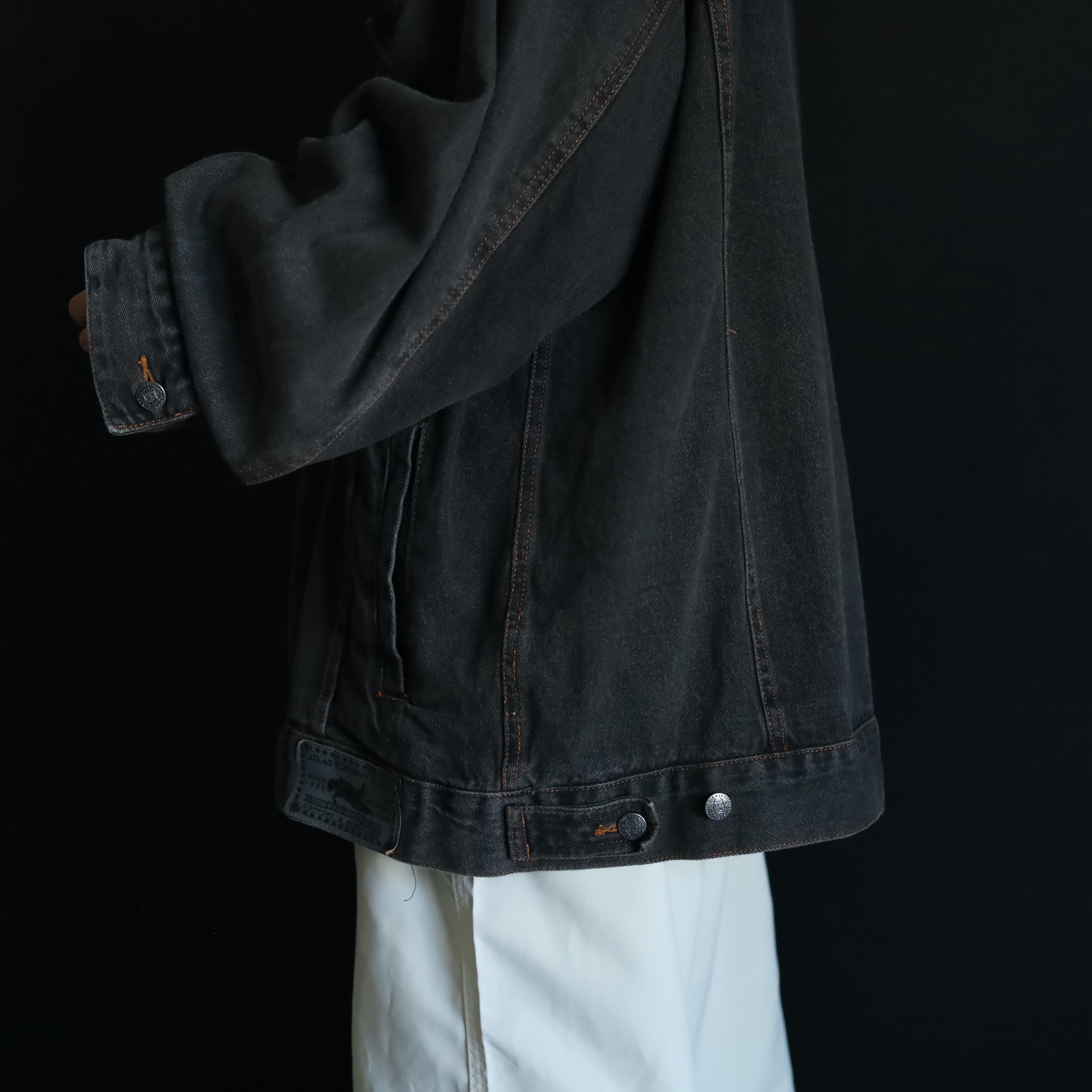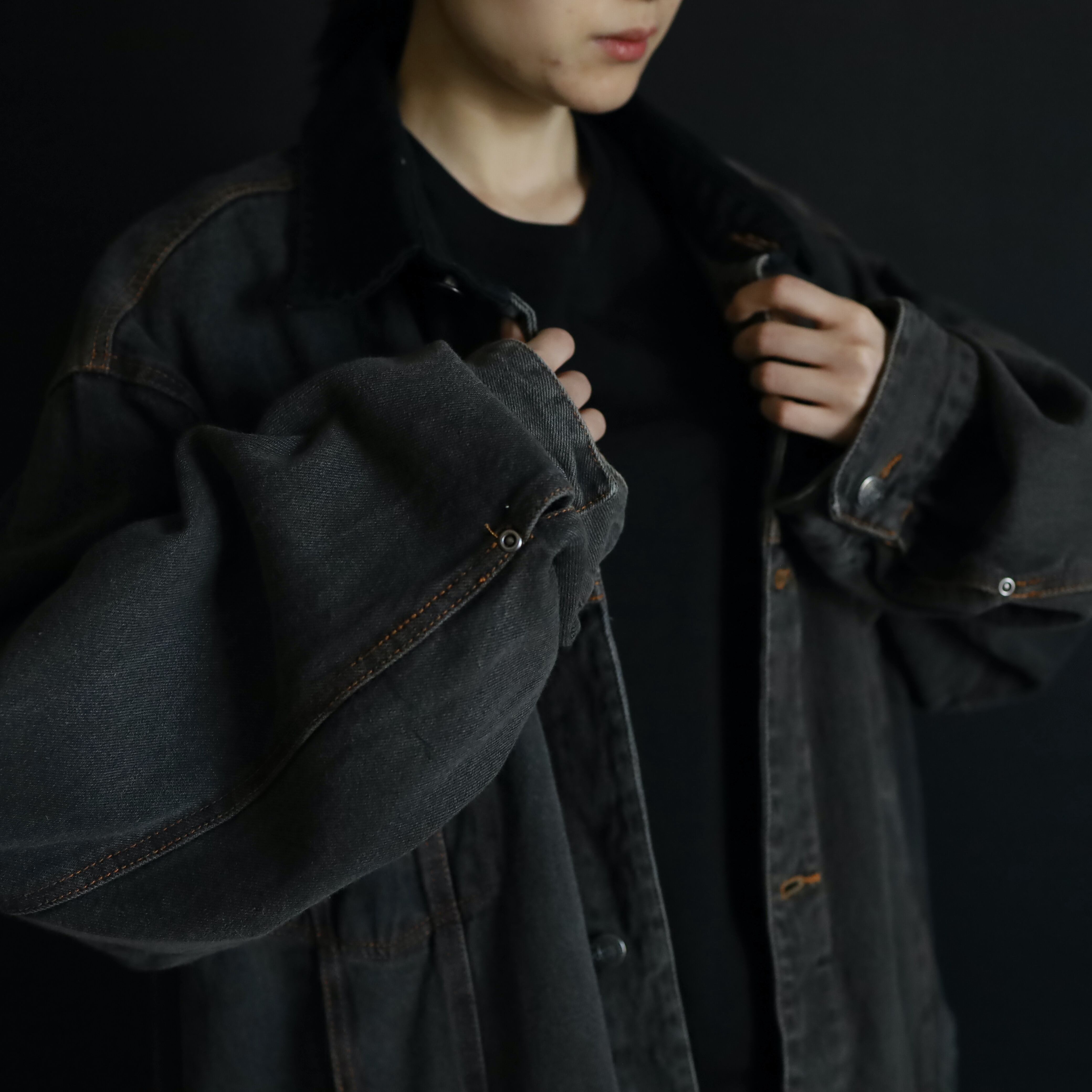 襟のみブラックデニムに切替わるバイカラー仕様で,くすみのあるボディを引き締めてくれています.