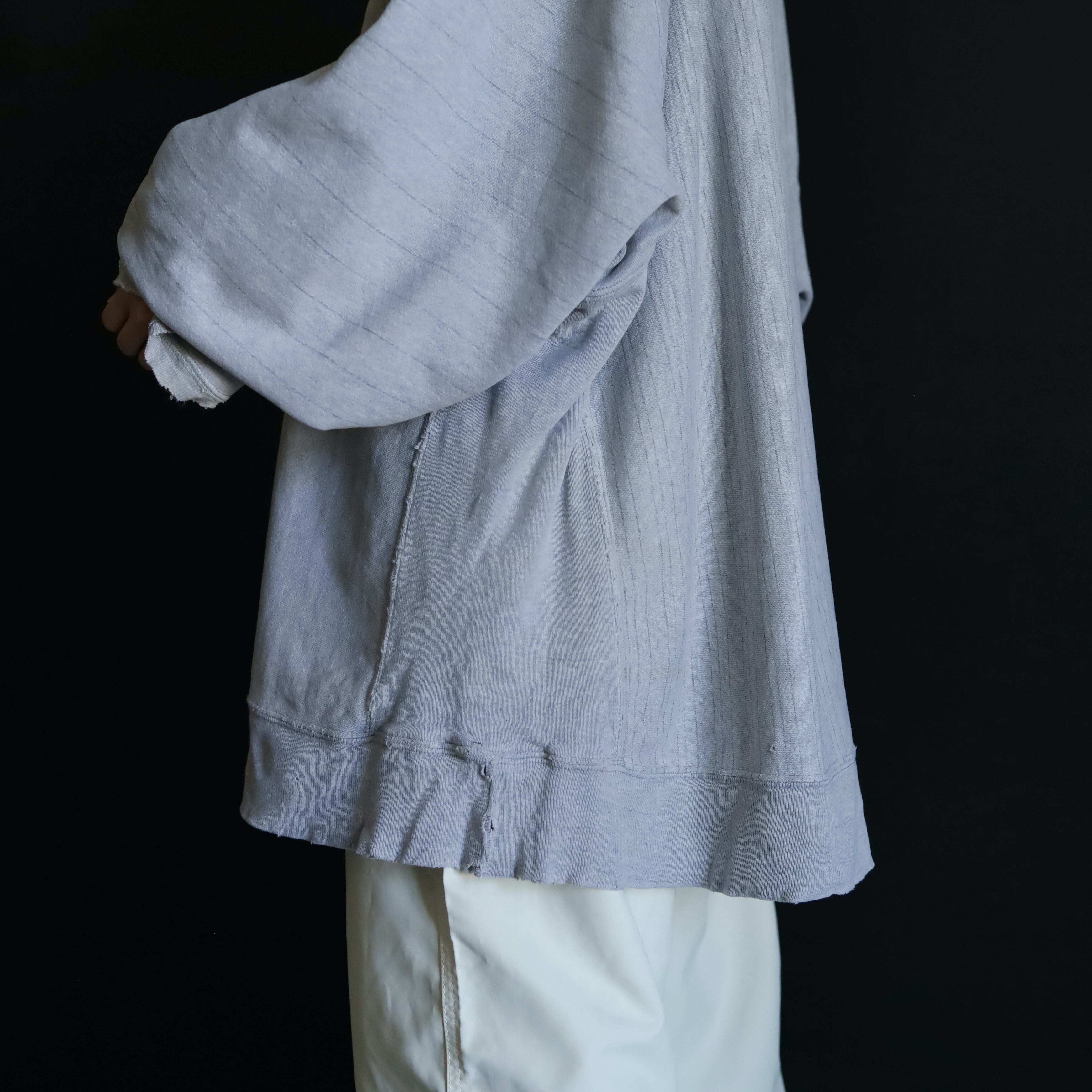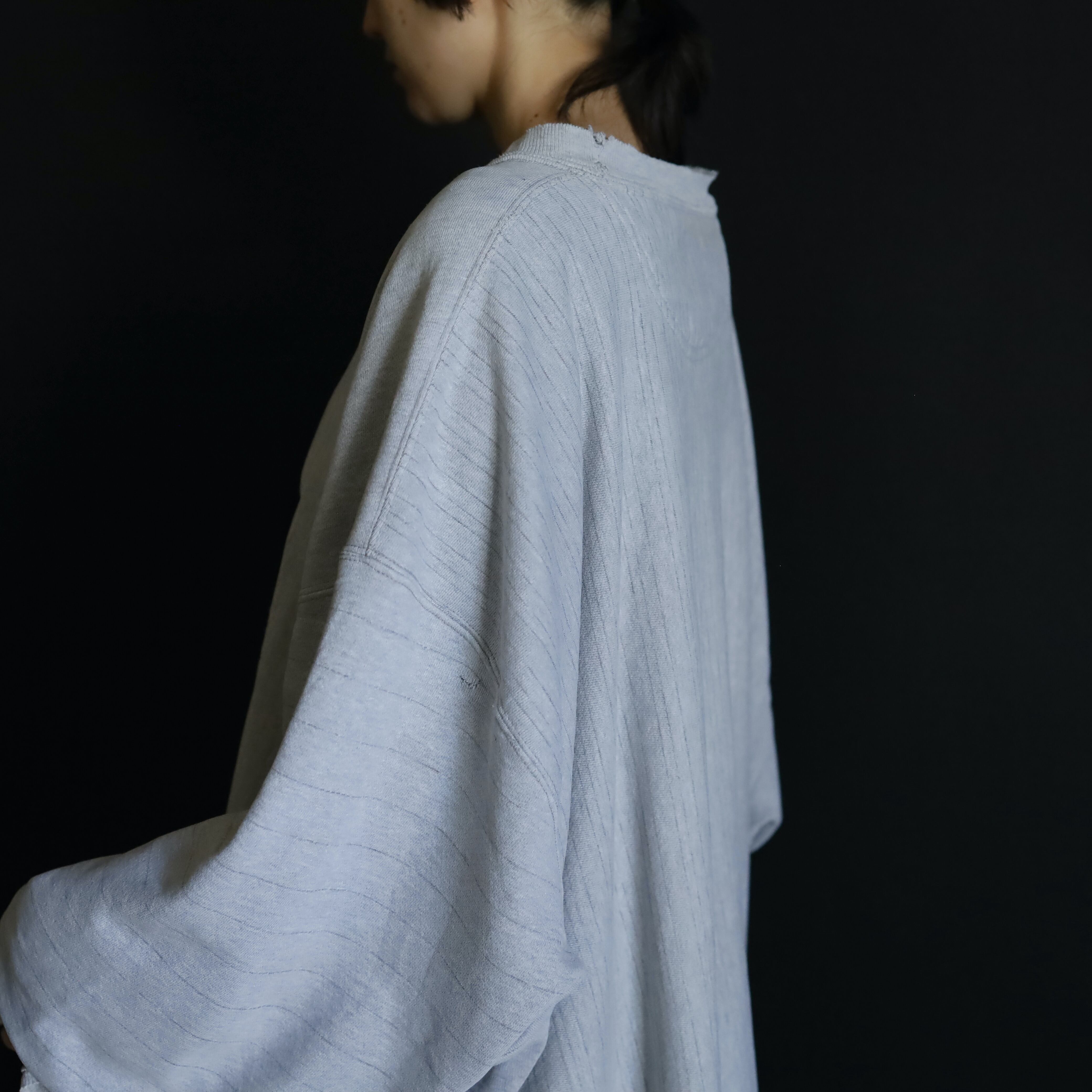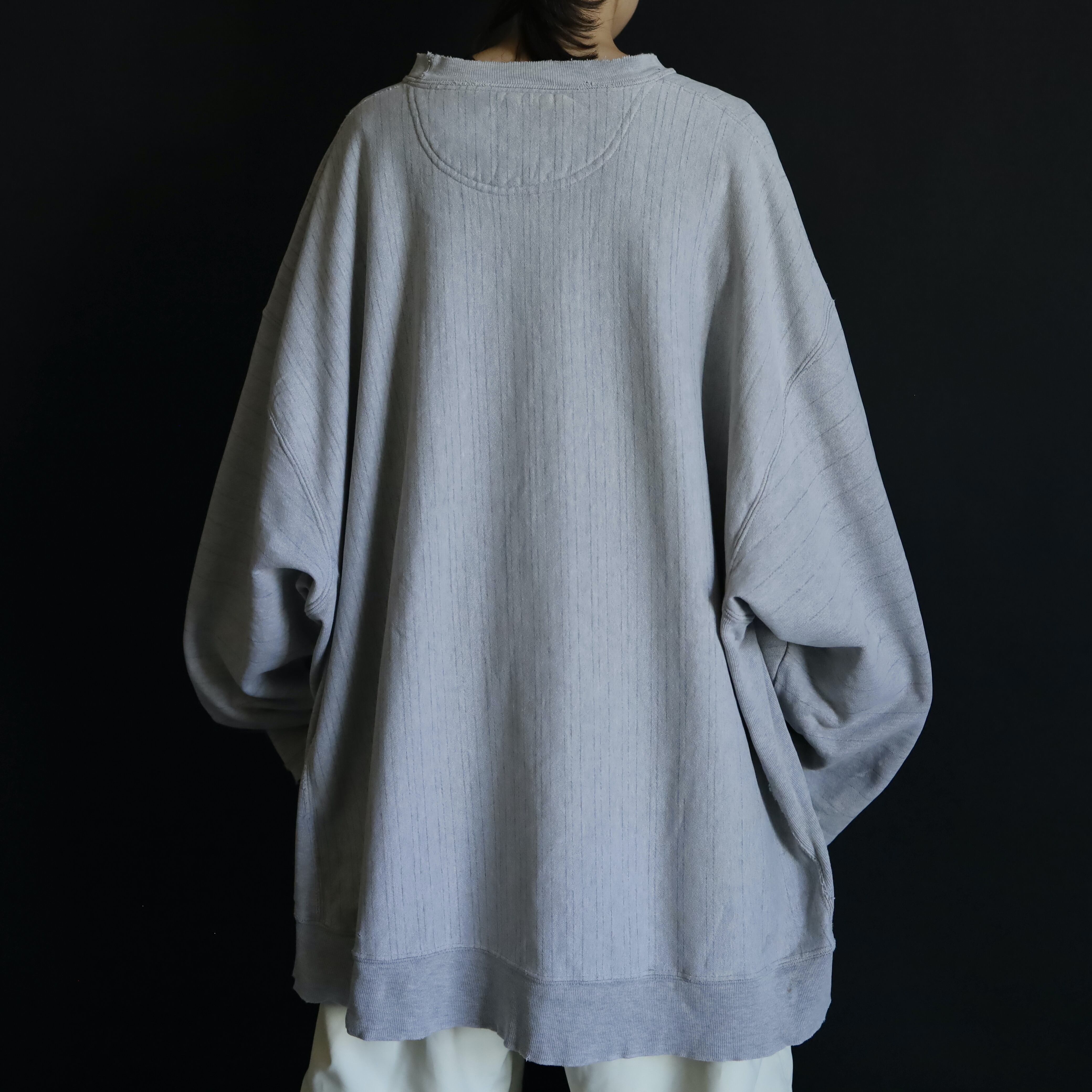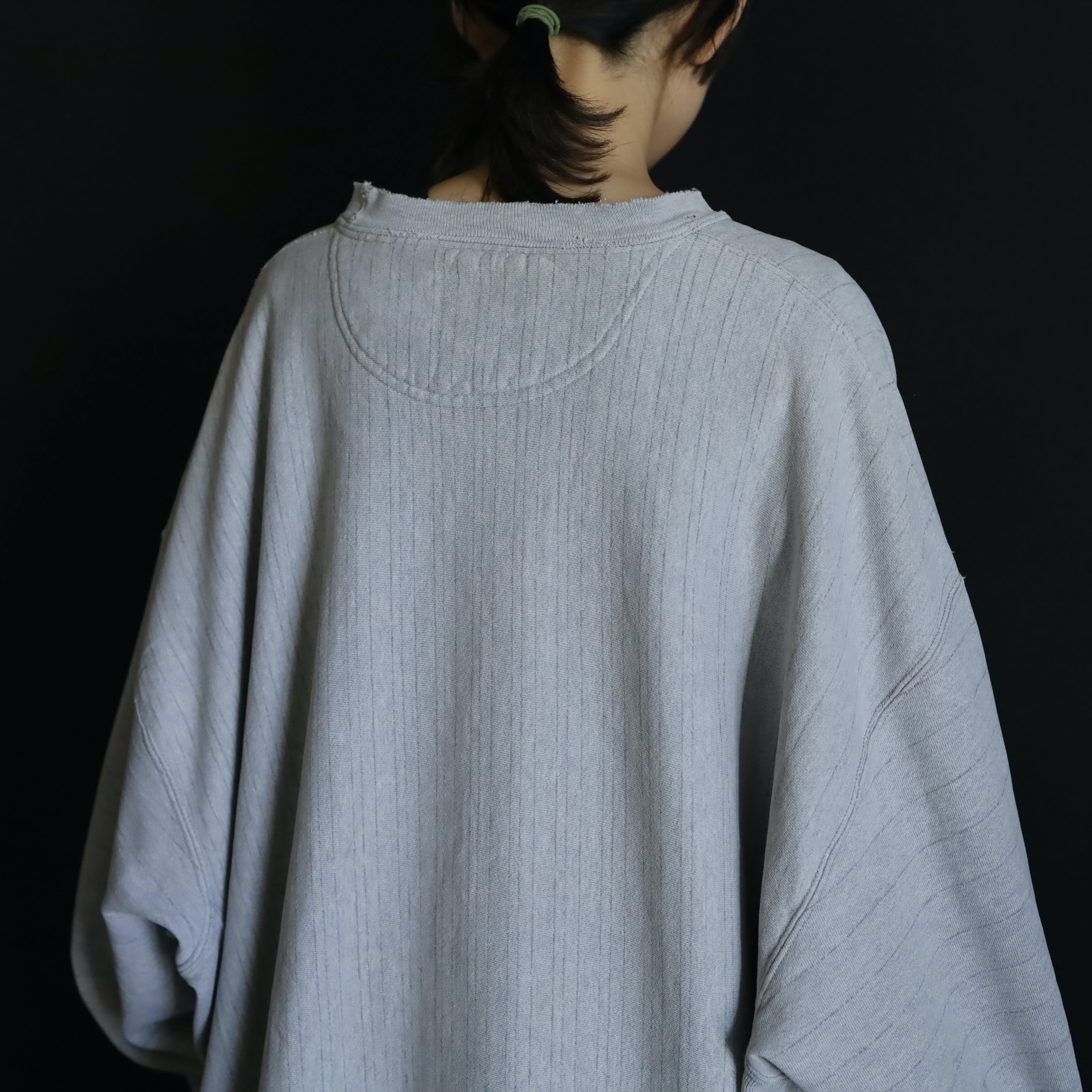 袖は袖先のリブ中間でぶった切られ,ネックリブや裾リブも擦れやほつれが強く,生地全体にグランジ感の表れた一枚になっています.